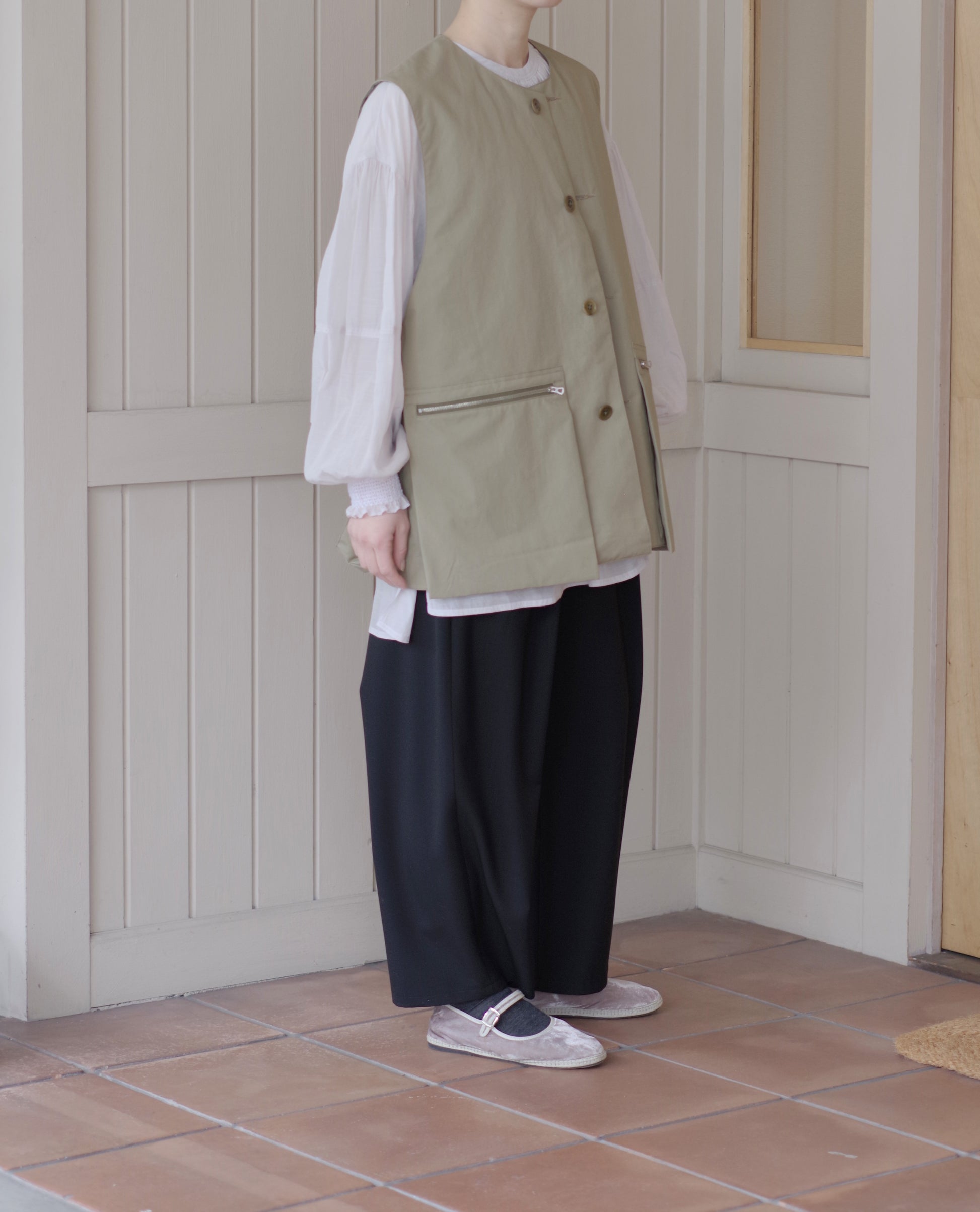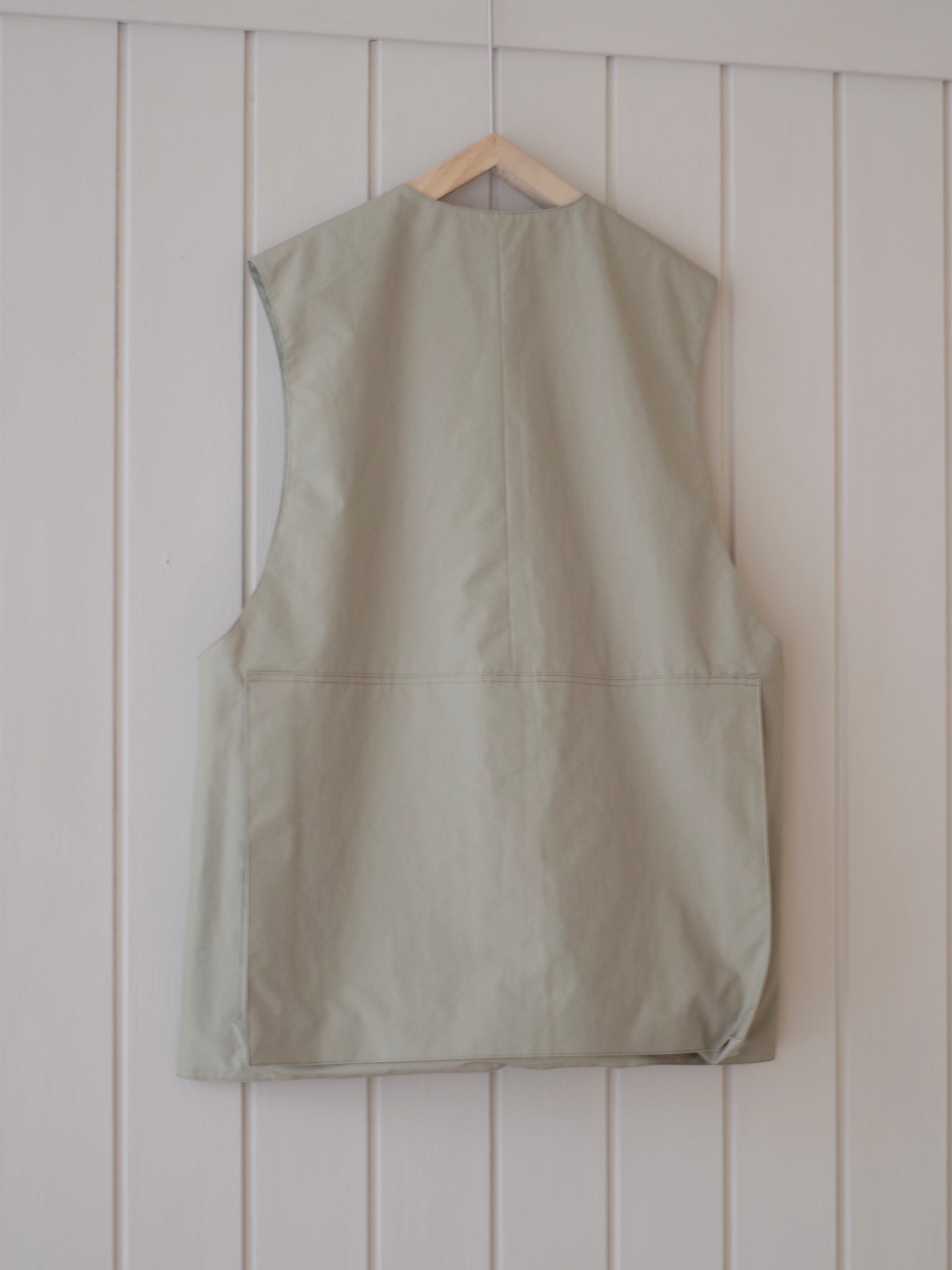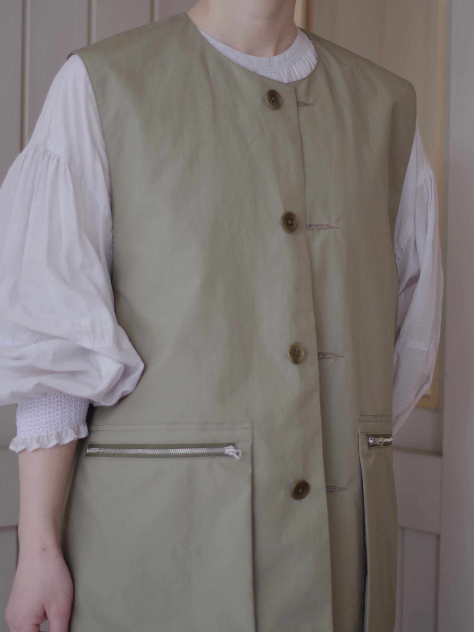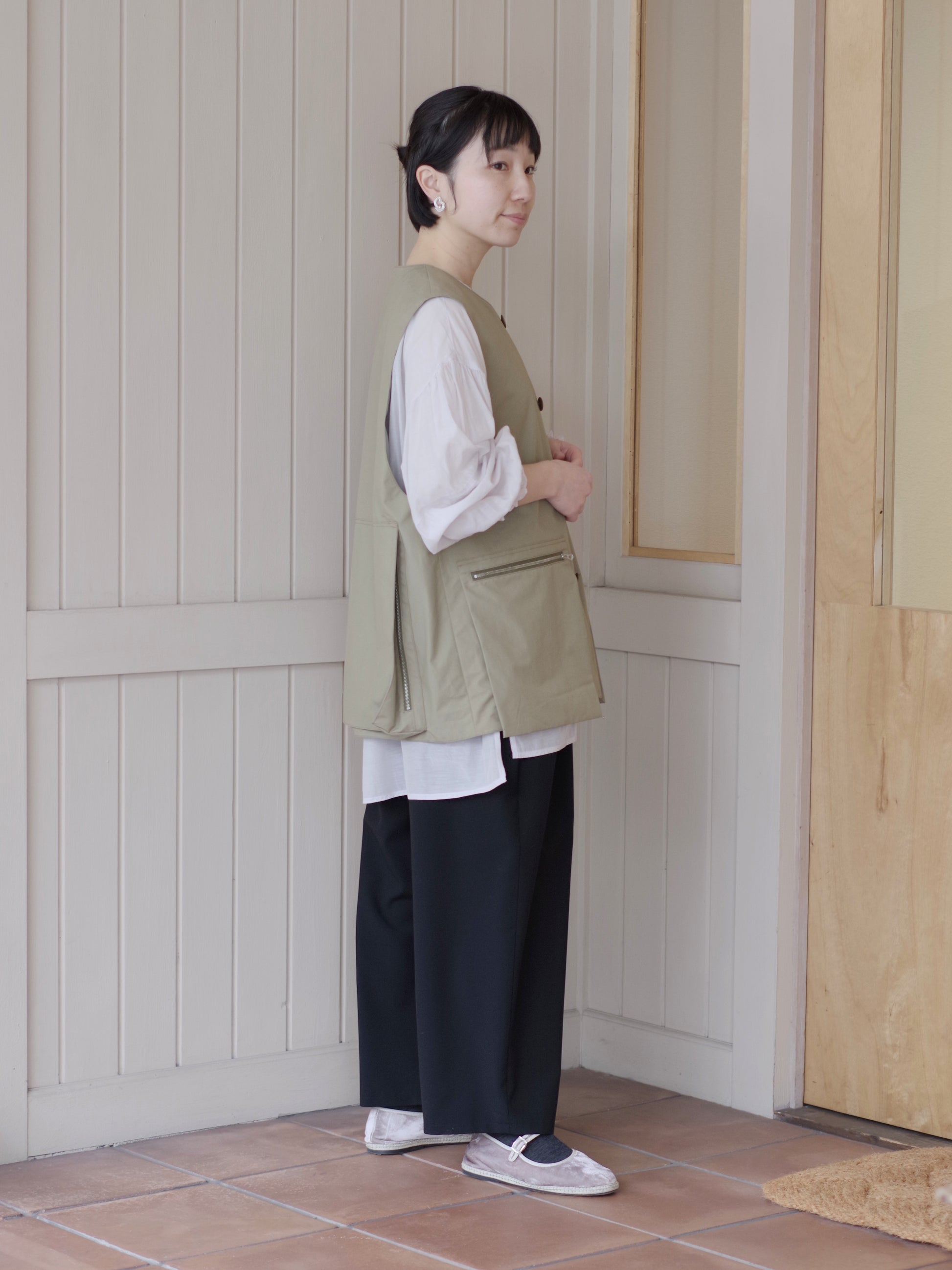 アウターの上から羽織れるようにアームホールを大きく仕上げ、ゆとりのある身頃と着丈の長いサイズ感が特徴のジャーキンベスト。