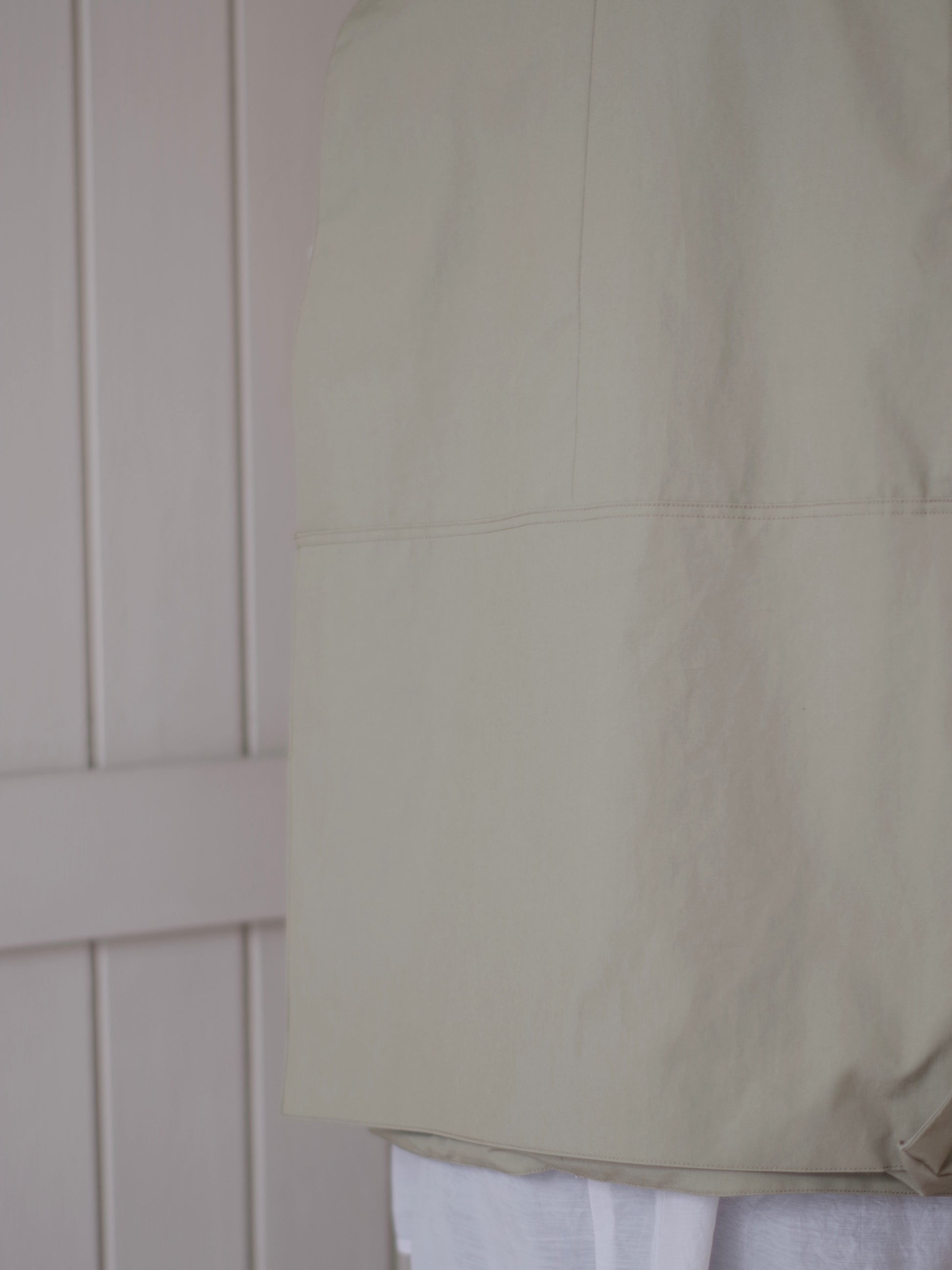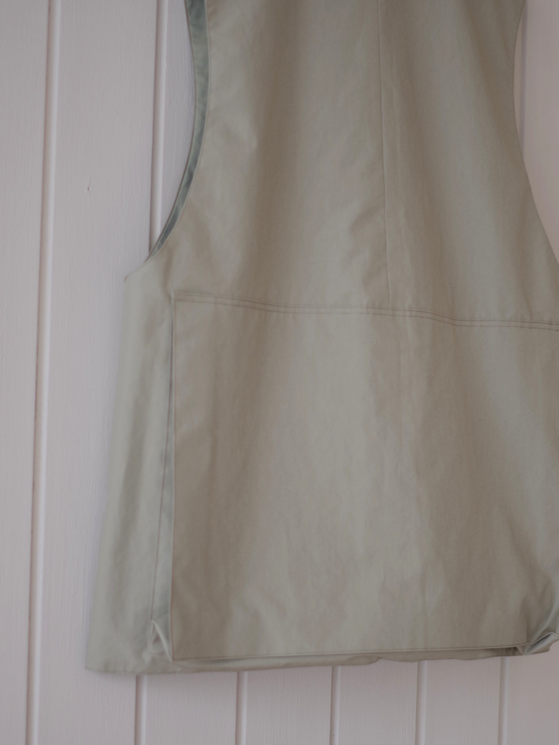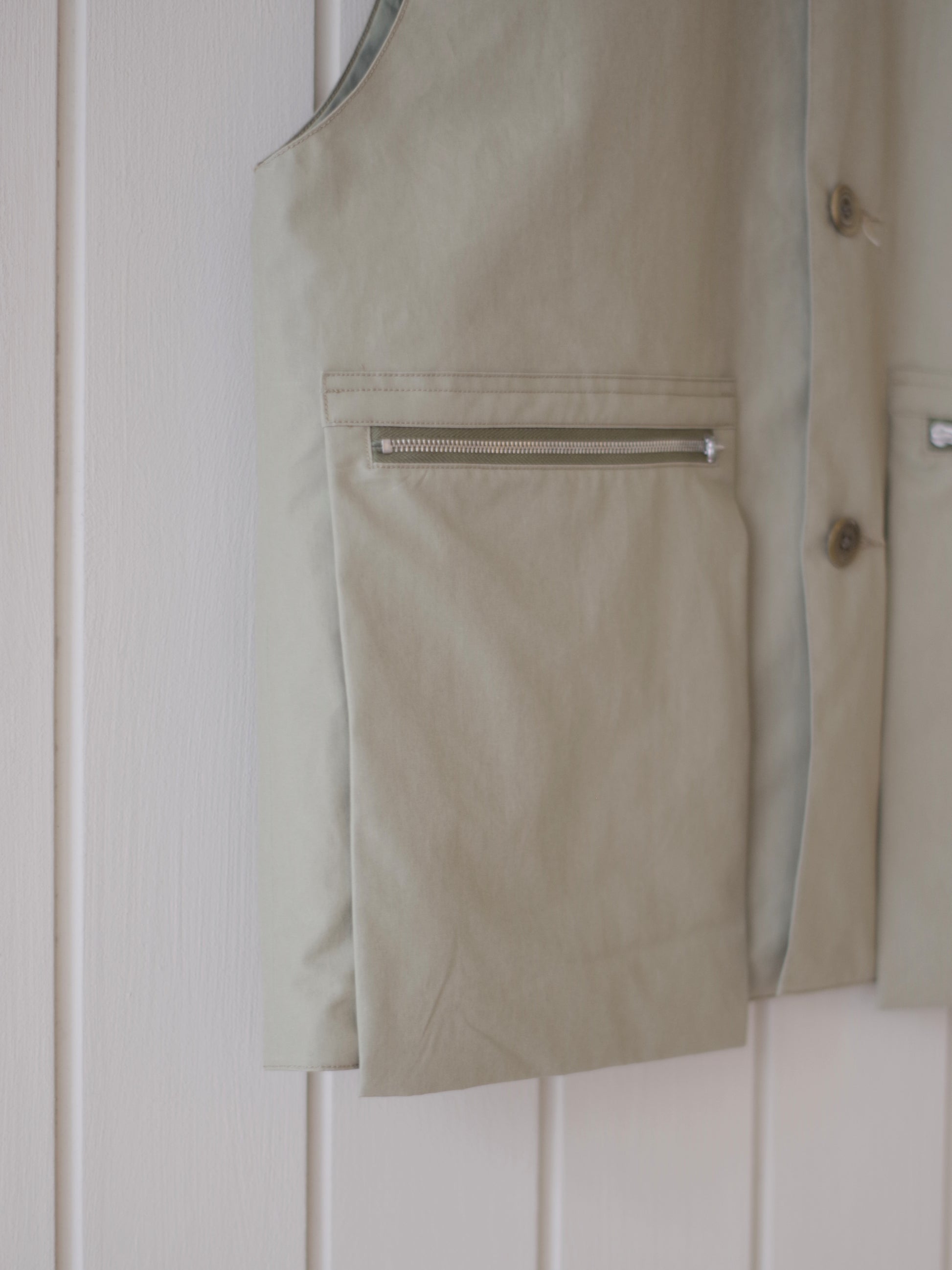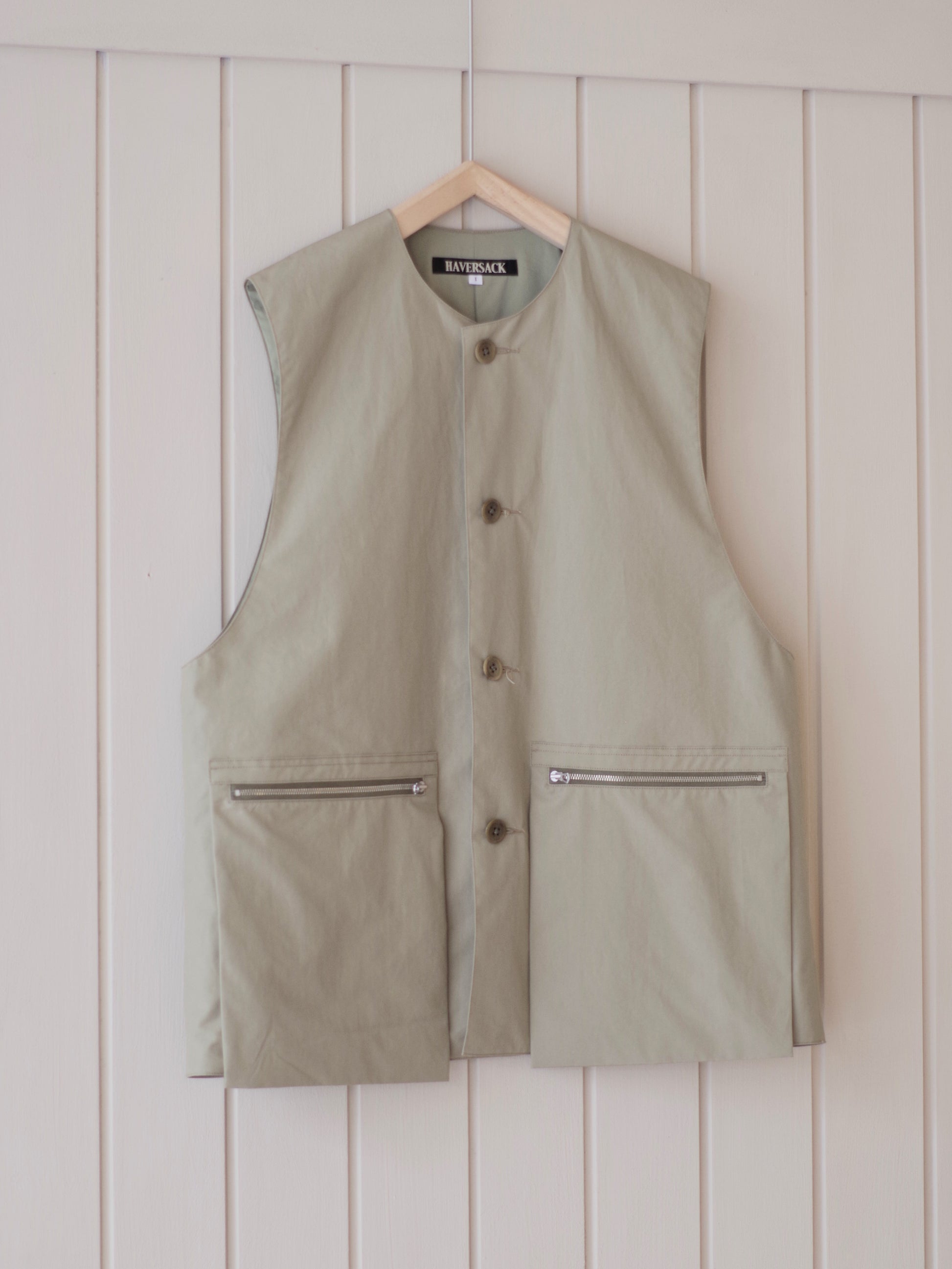 アウターの上から羽織れるようにアームホールを大きく仕上げ、ゆとりのある身頃と着丈の長いサイズ感が特徴のジャーキンベスト。