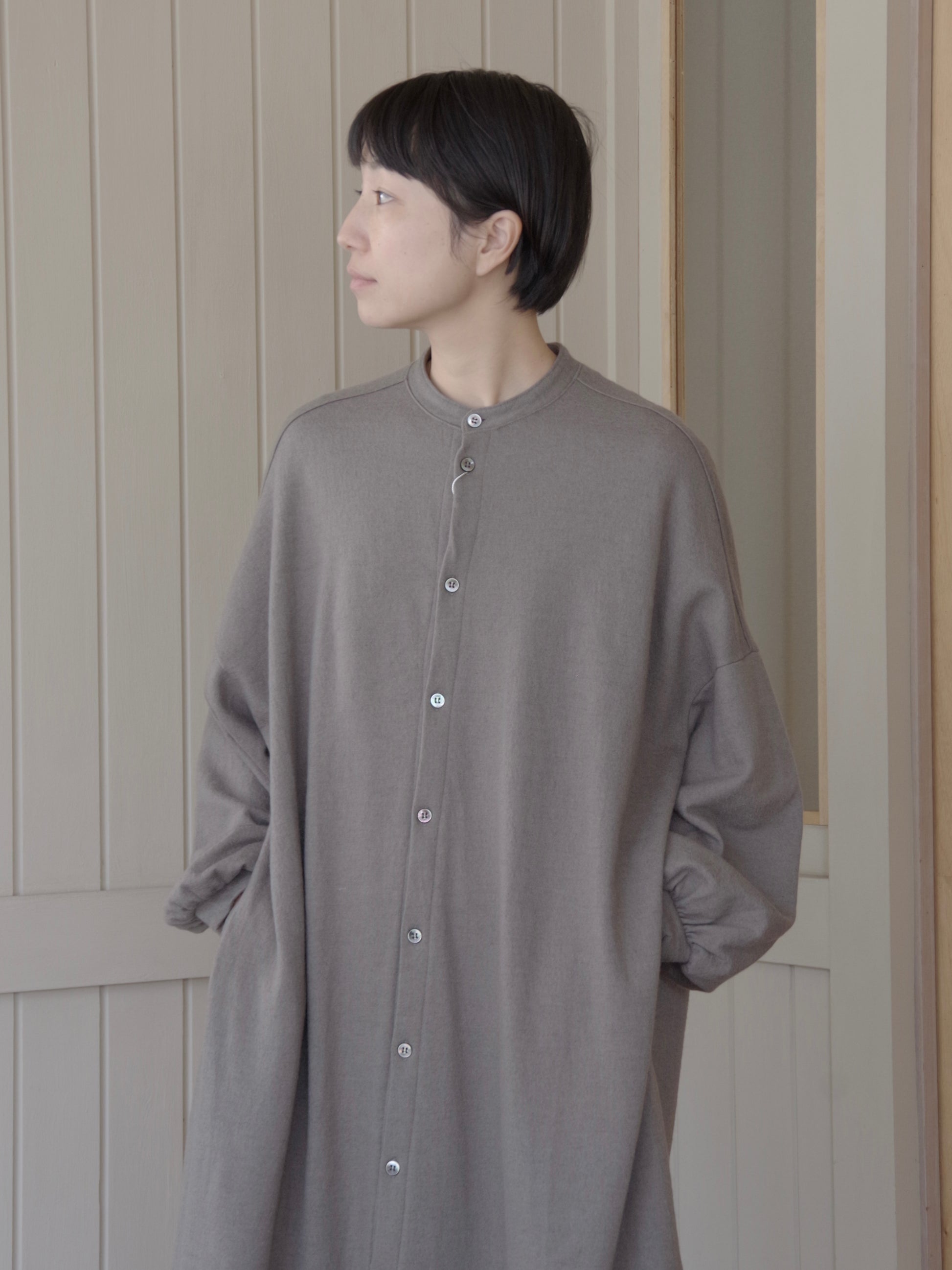 バンドカラーですっきりした首元のシャツワンピース。ゆったりした身幅で、袖口にギャザーを施し袖にも少しボリュームがあります。