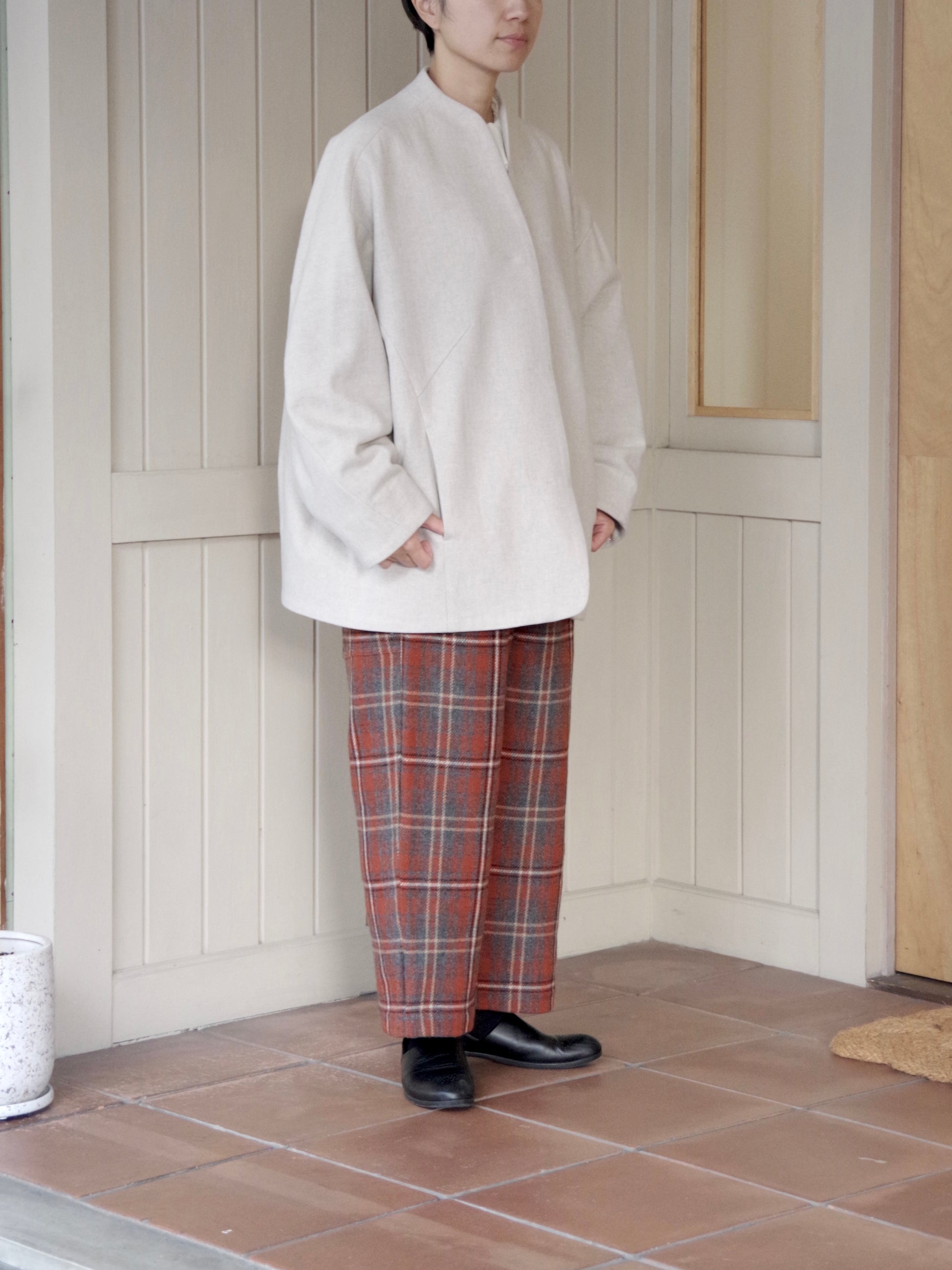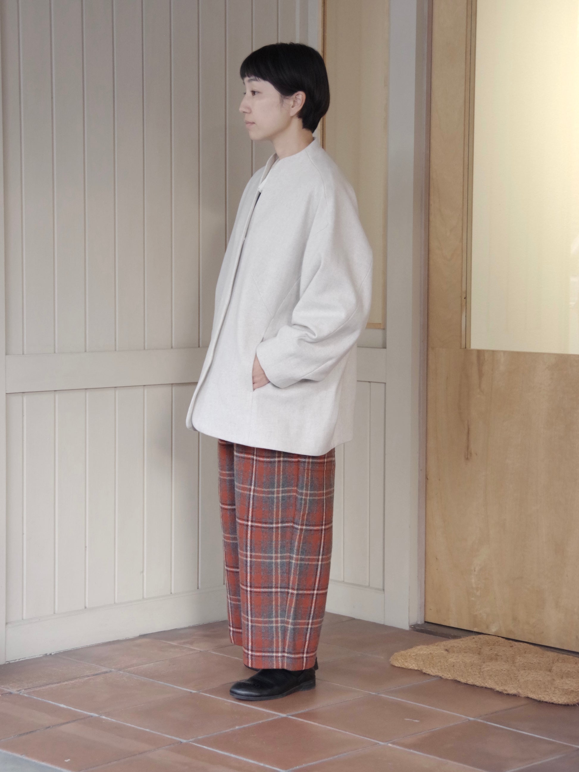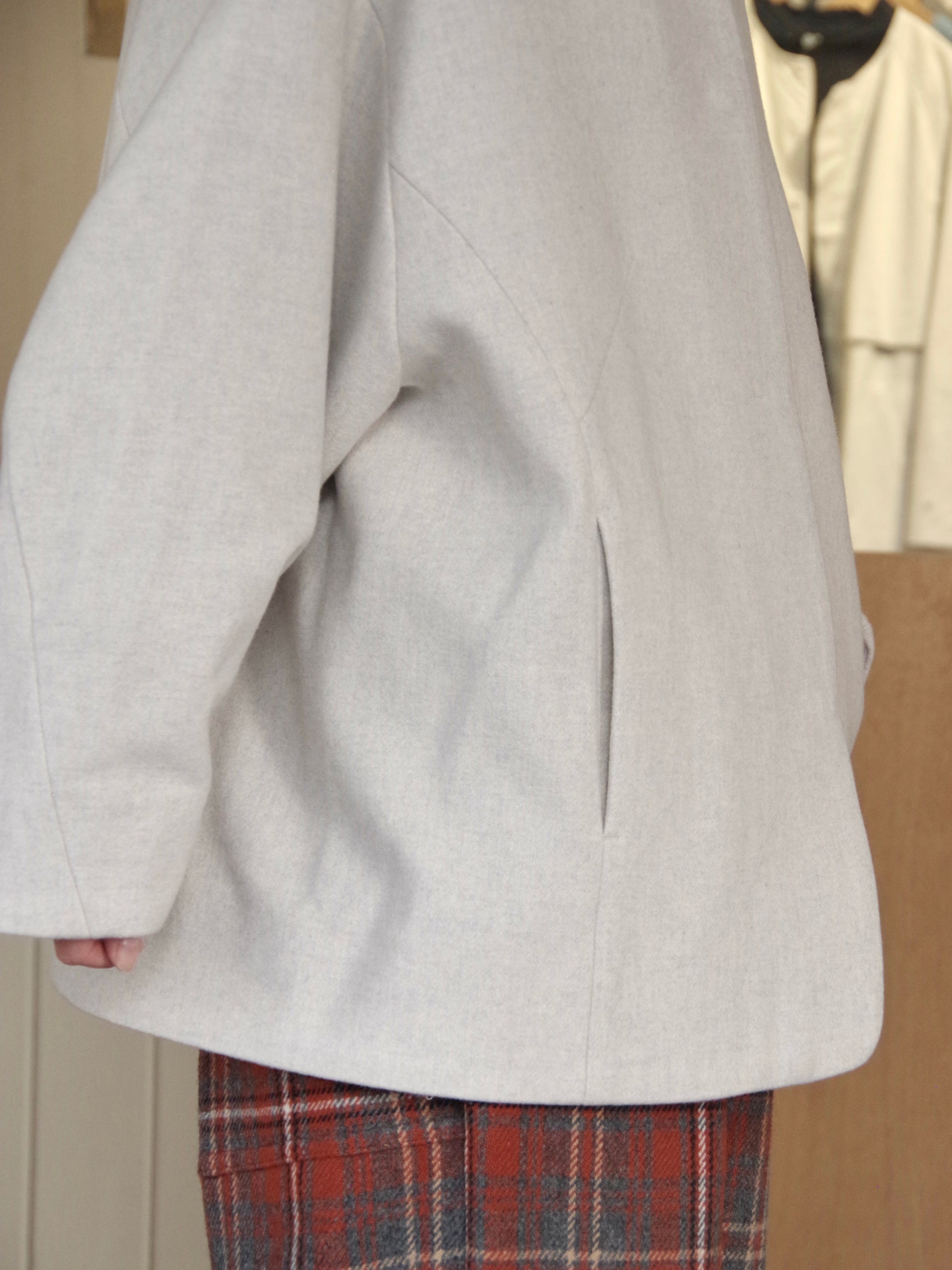 少し立ち上がった後ろ衿のノーカラーデザインが、顔まわりをすっきり見せてくれます。