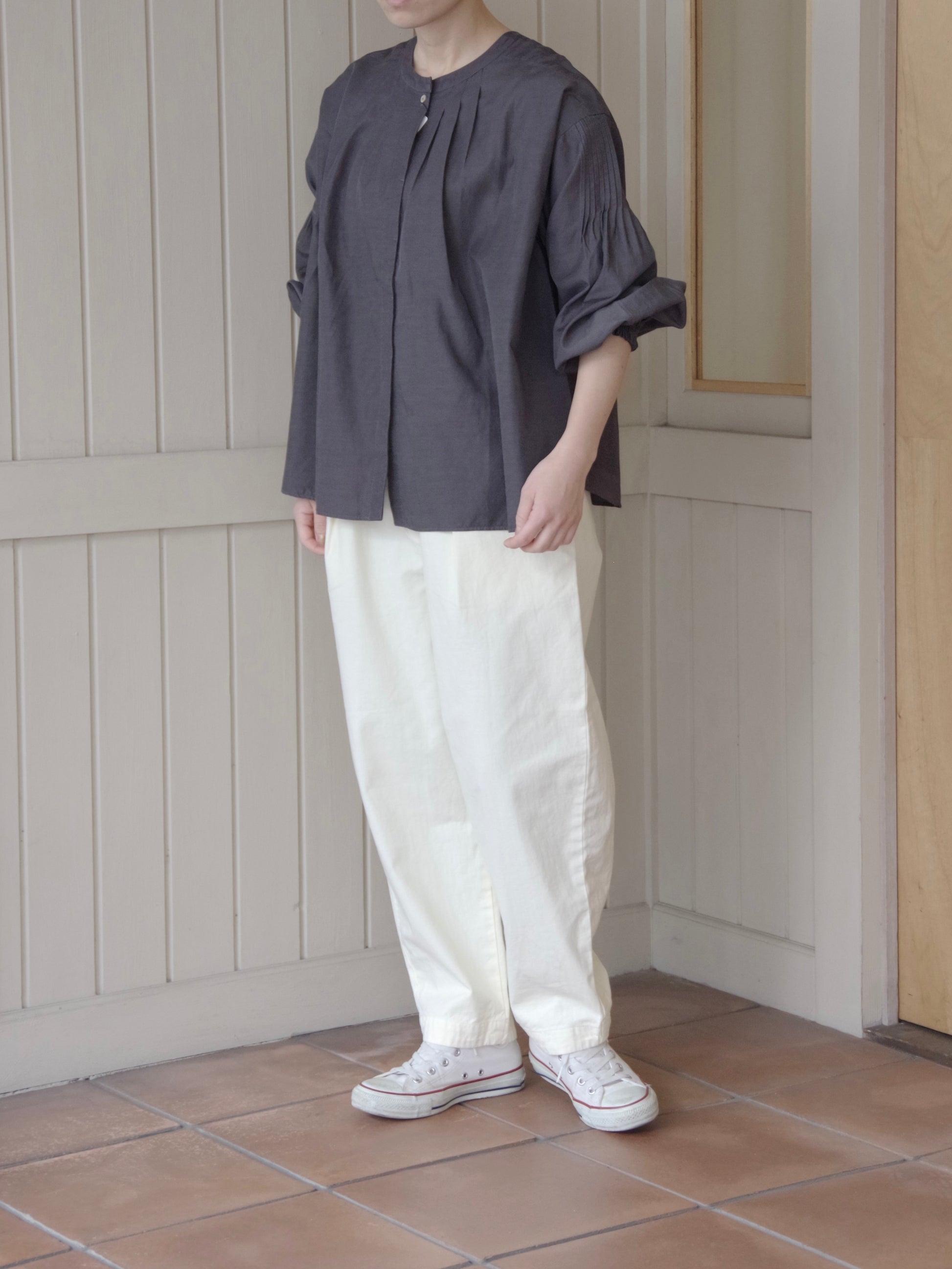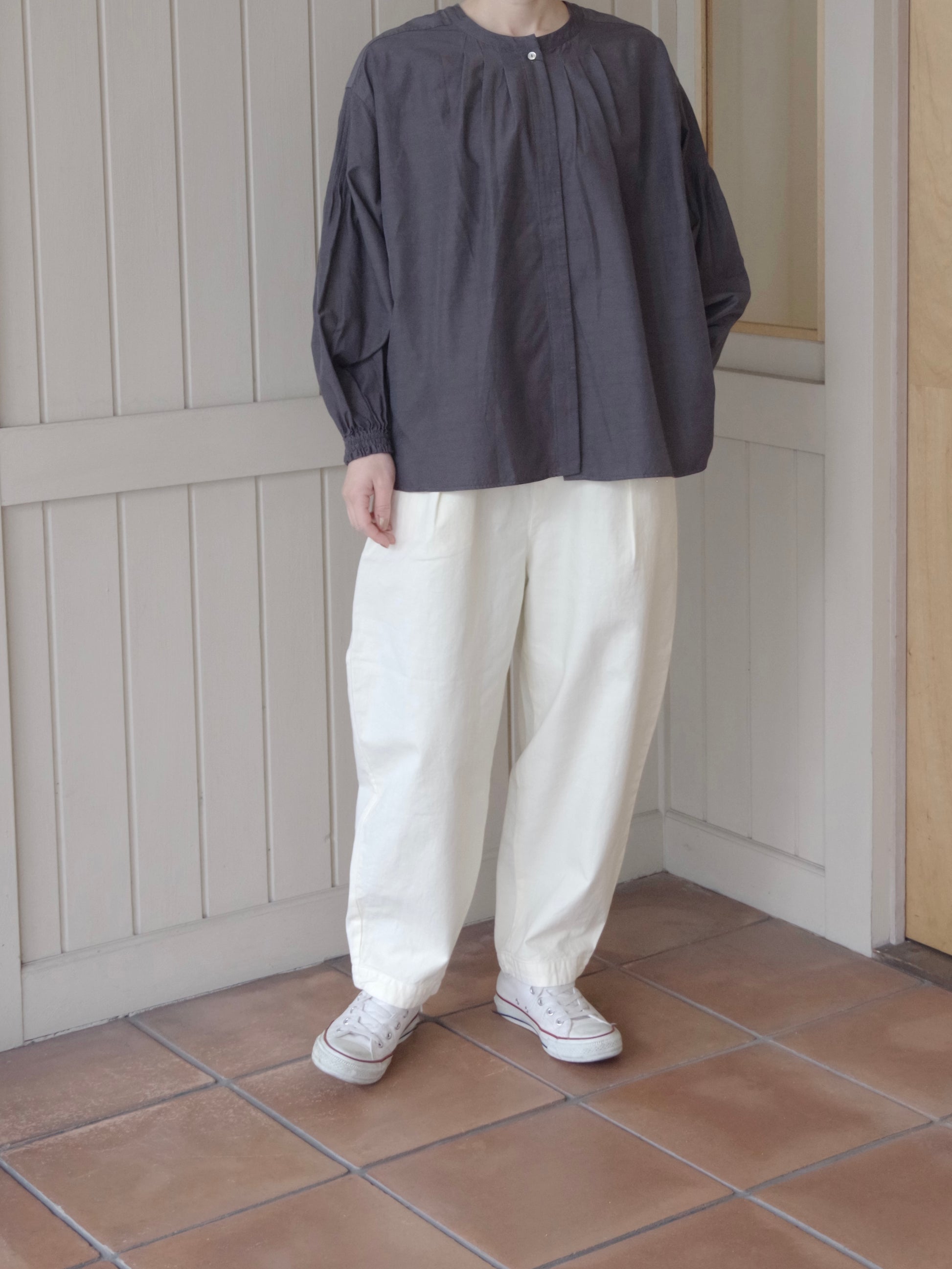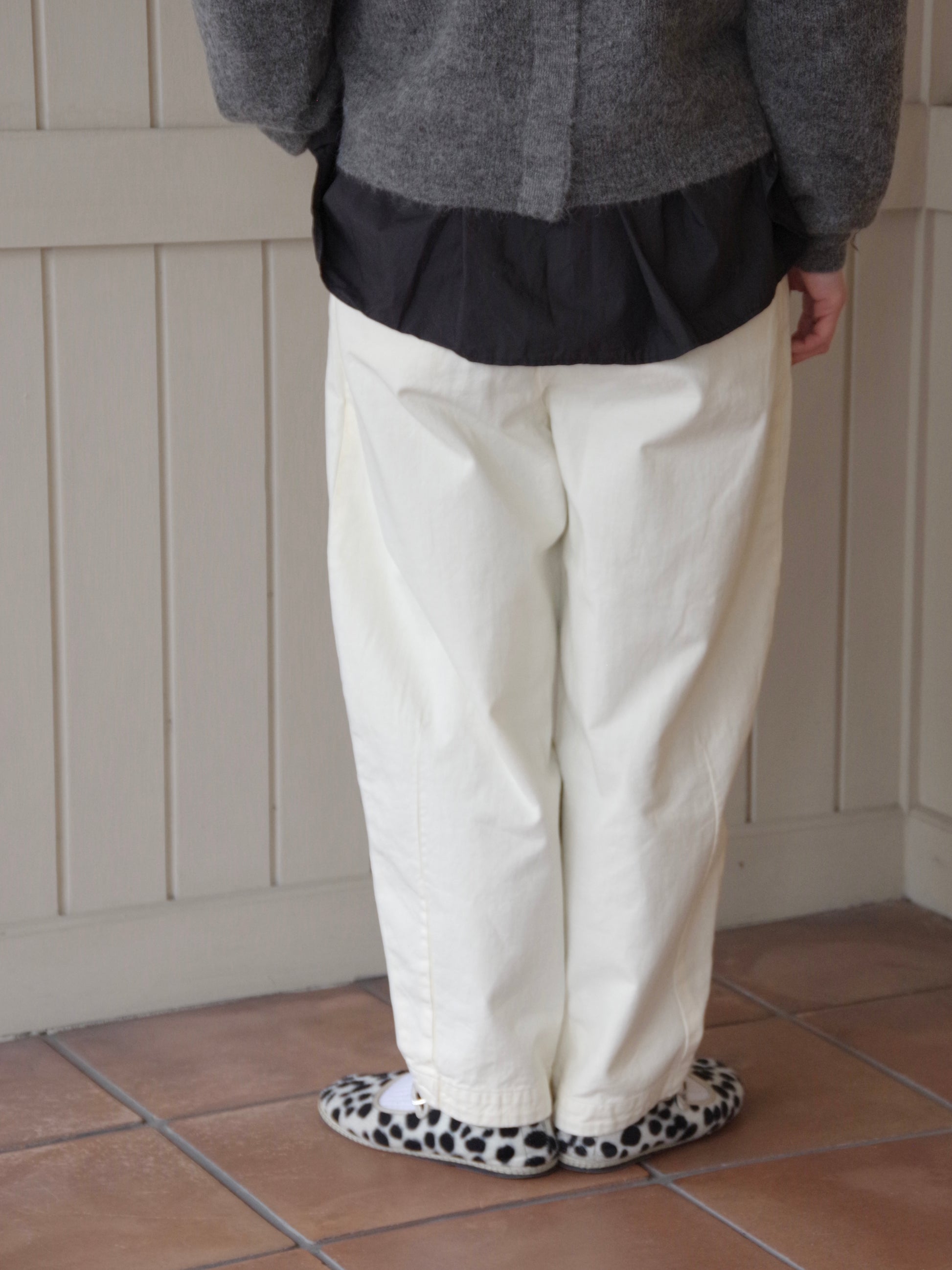 形はHands of creationでは定番のオーバルパンツです。フロント部分にタックがはいりウエストから太ももあたりまでふくらみのあるシルエット、裾にかけてテーパードさせ裾でダーツで絞り丸みのあるシルエットが特徴のパンツです。
