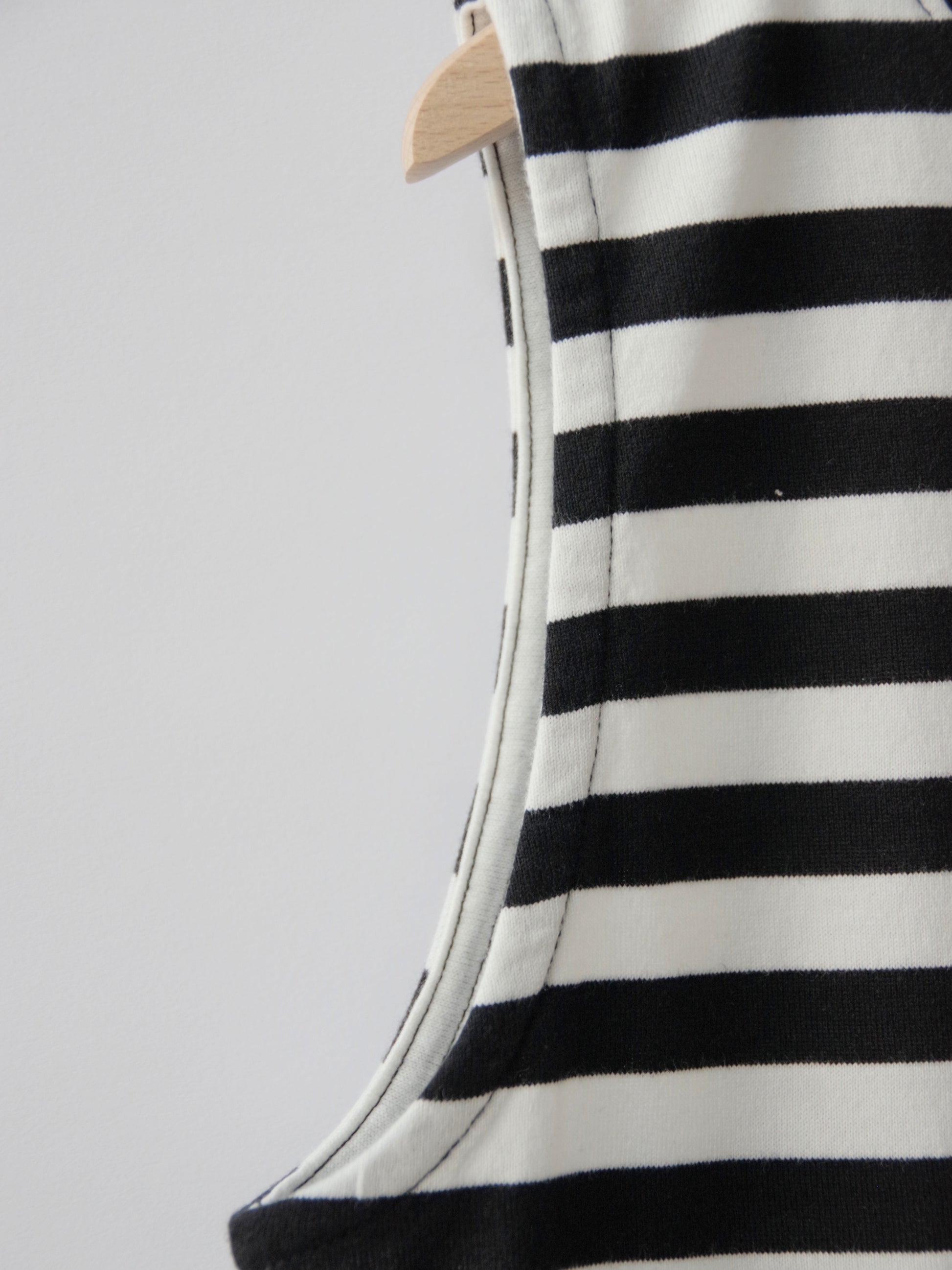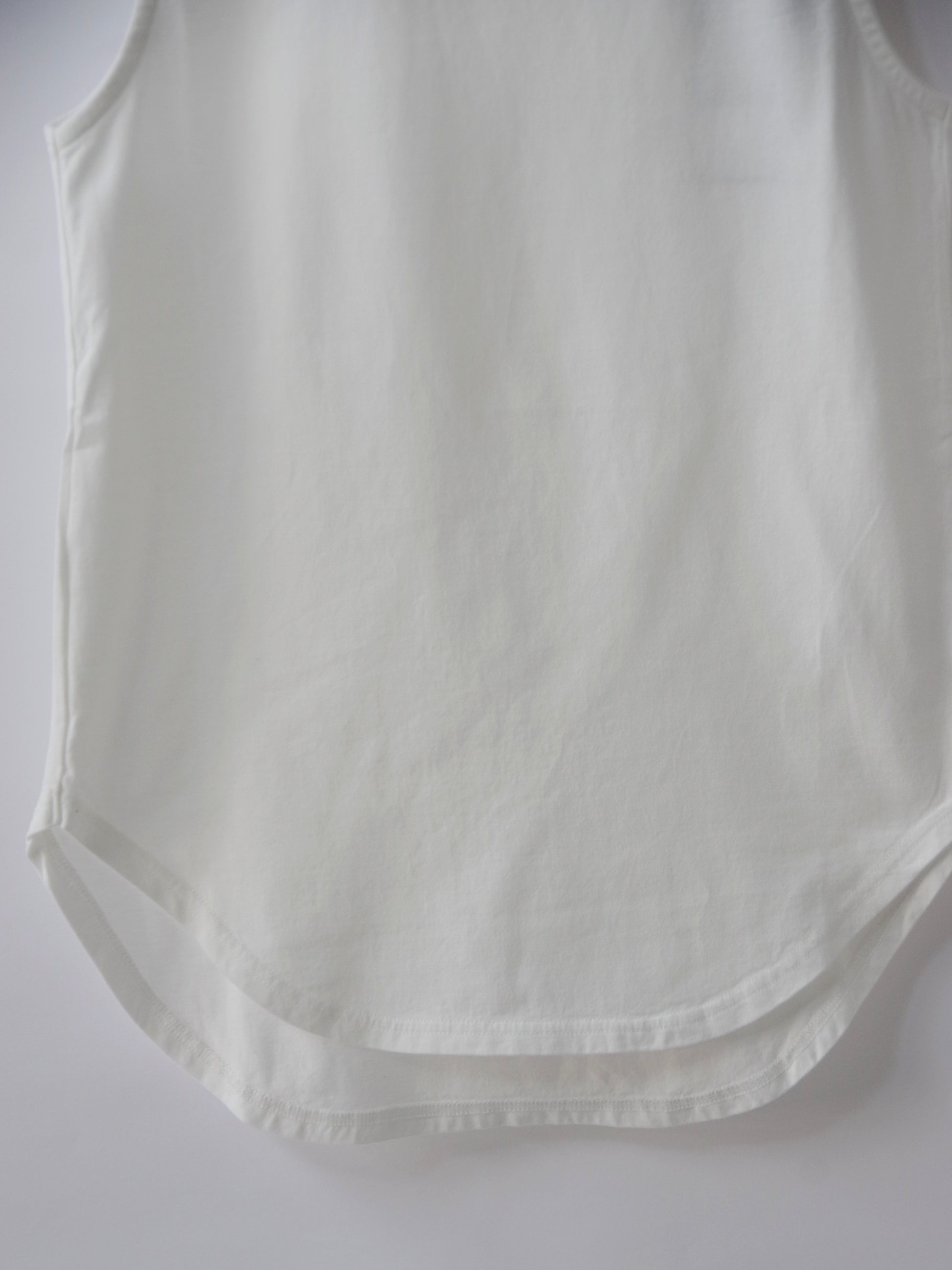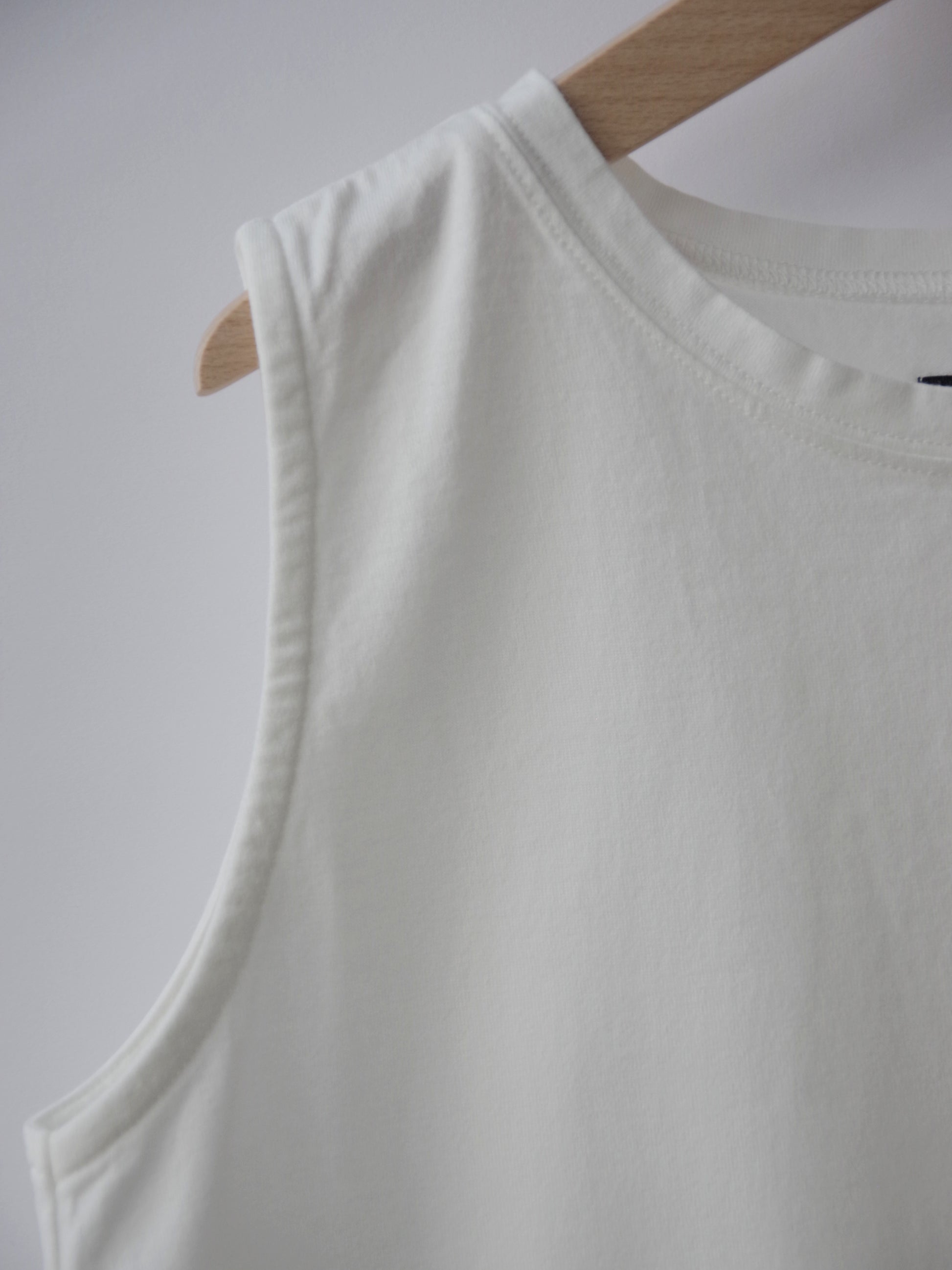 襟ぐりは広くなく、肩の生地幅が広めのタンクトップなのでノースリ1枚でも着ていただきやすい1枚です。