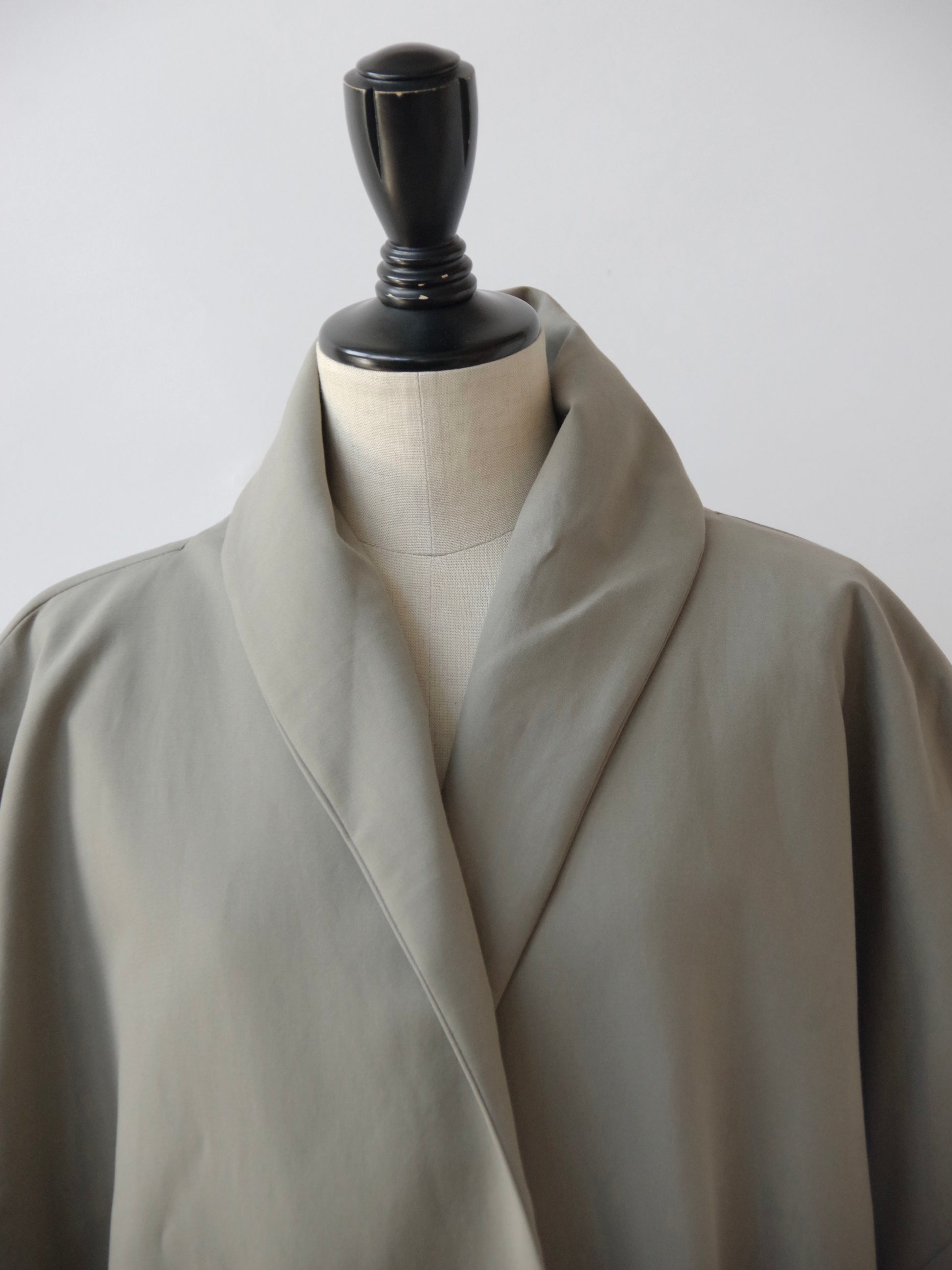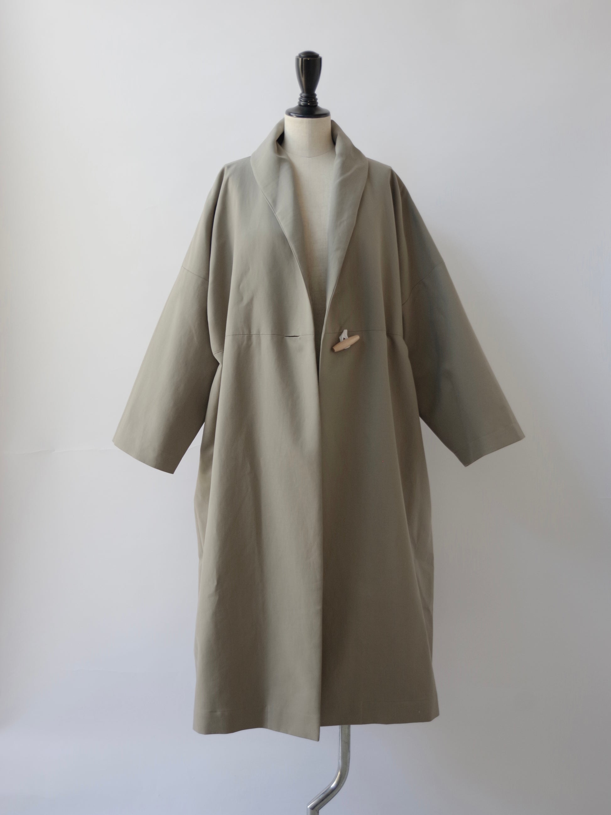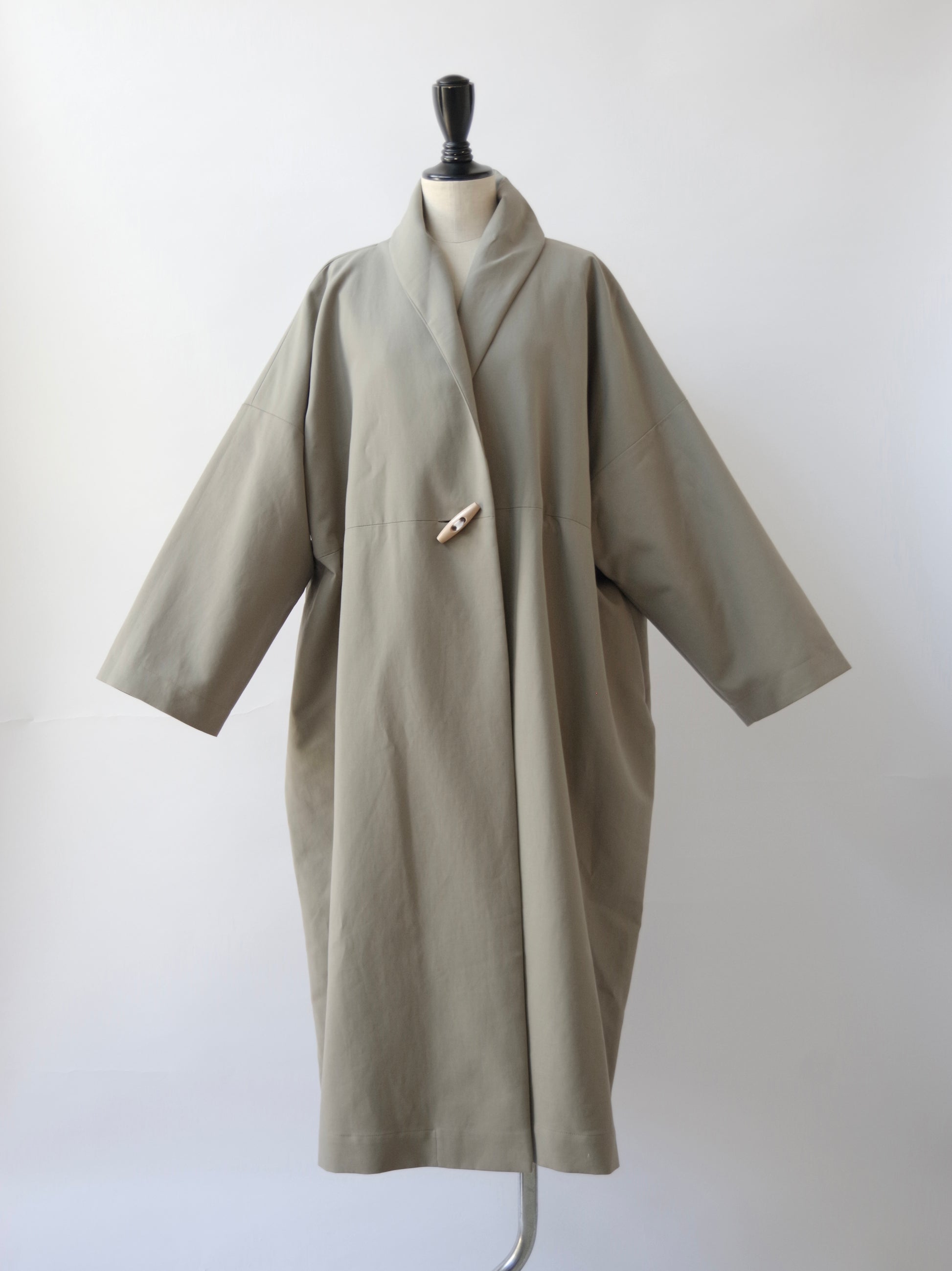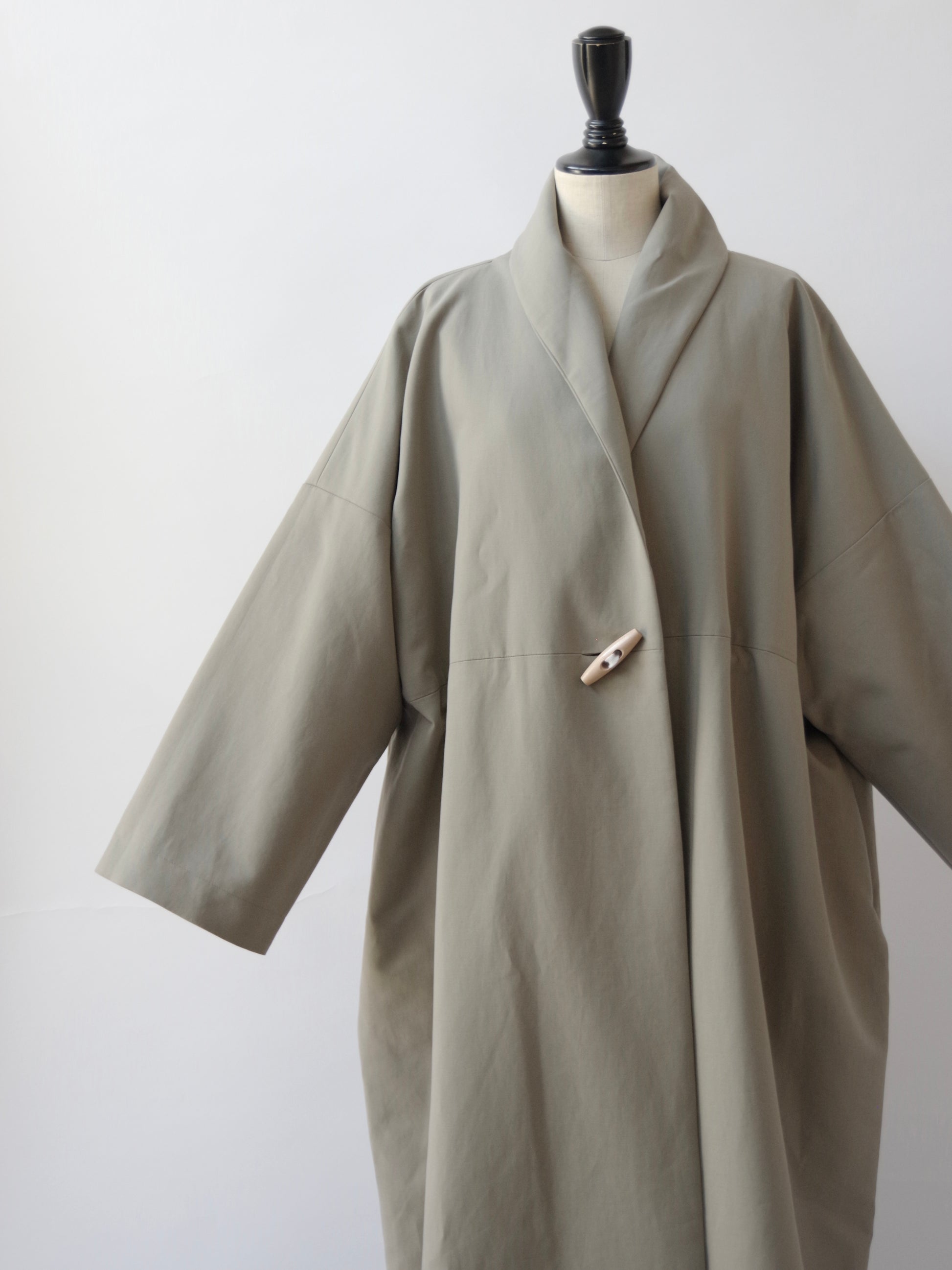 トレンチコートのように着用できるローブコートをSI-HIRAI解釈により、なるべくシンプルに縫製やディテールをそぎ落としたでデザインに仕上がっています。