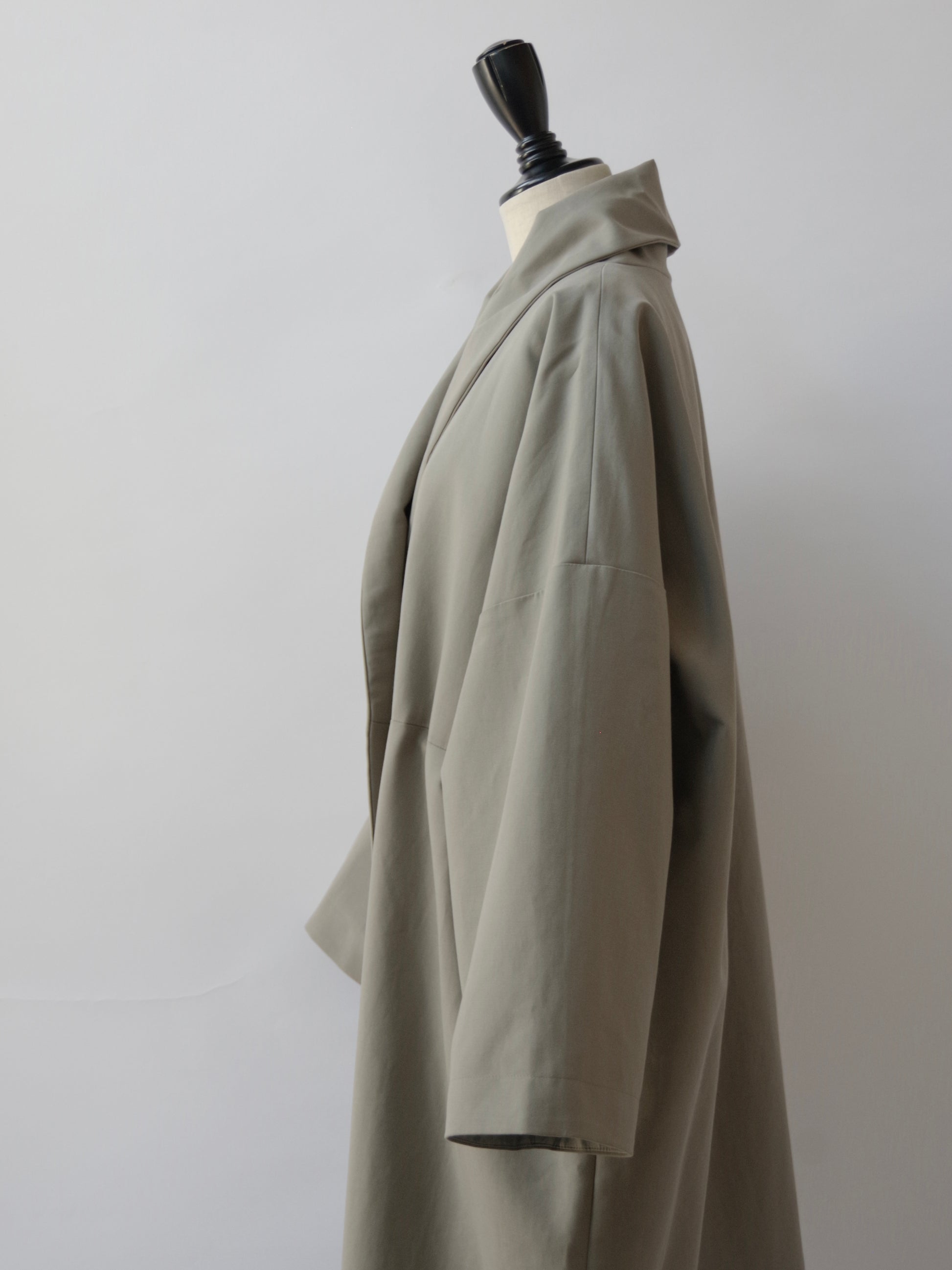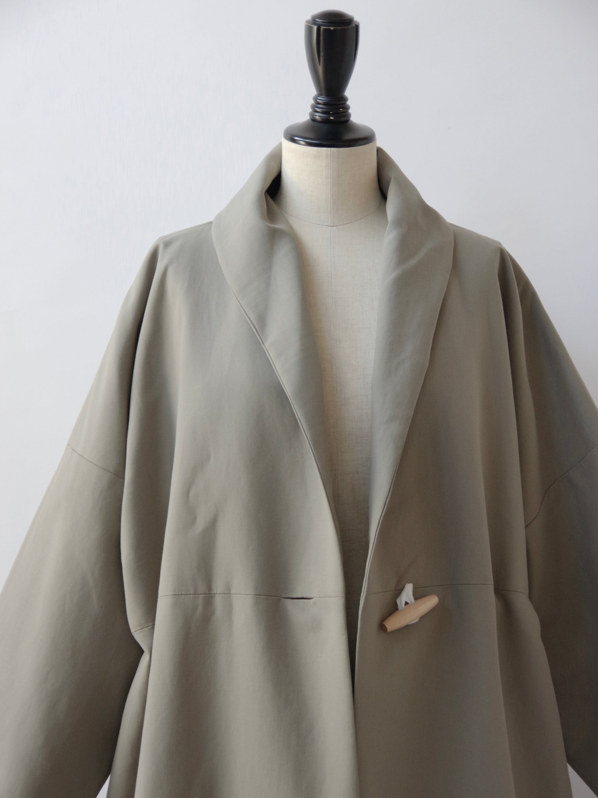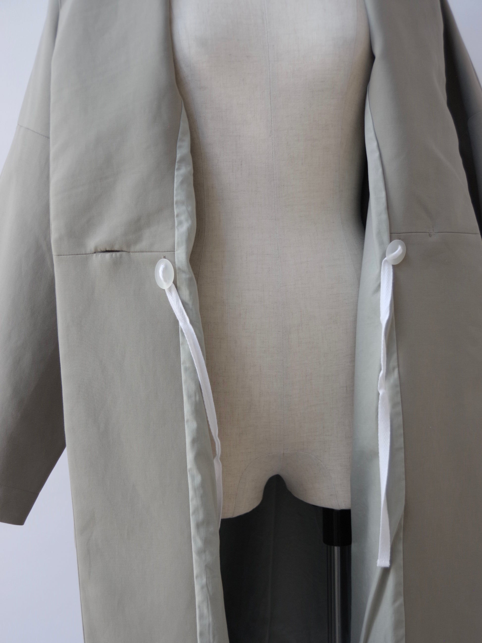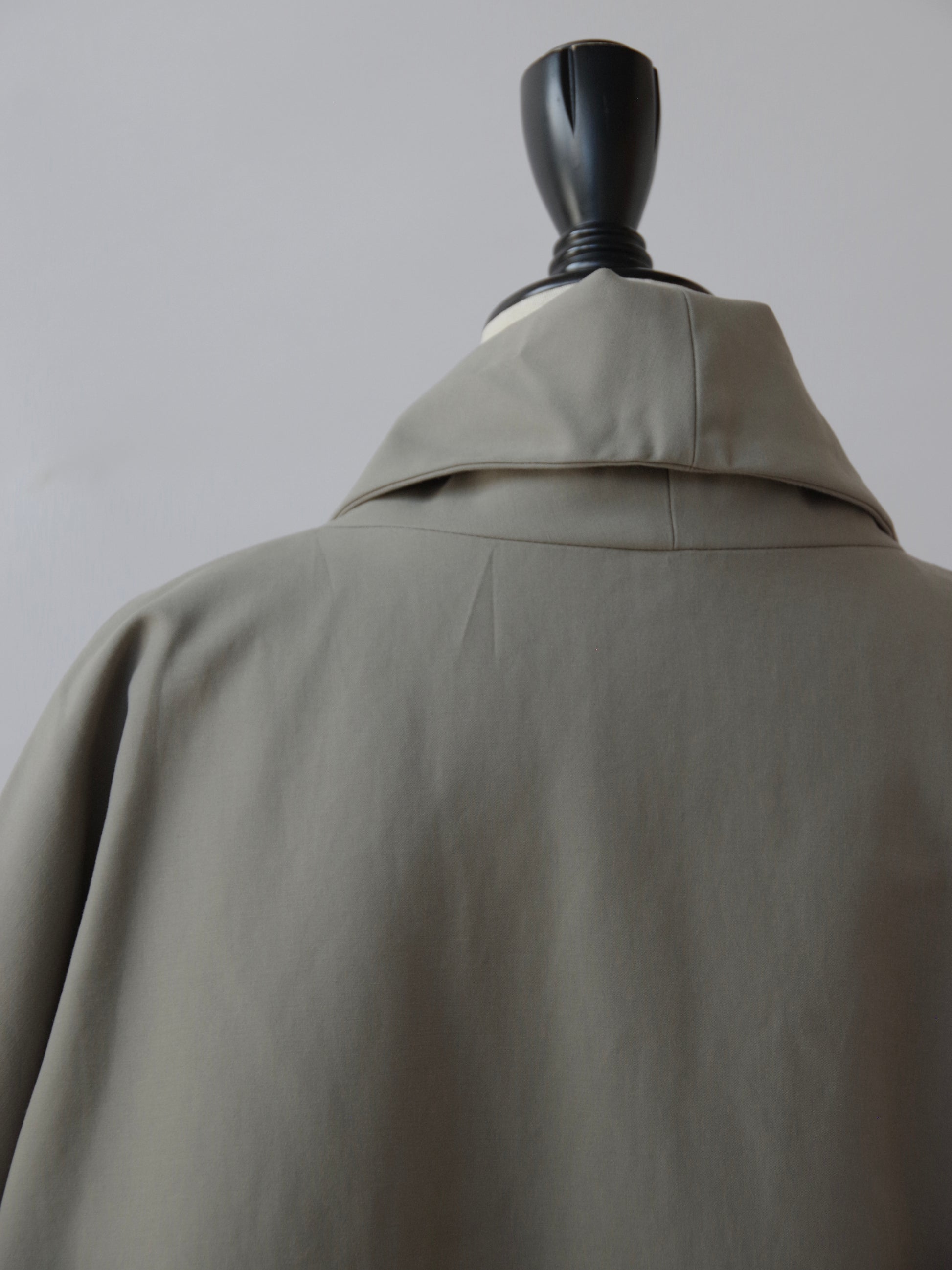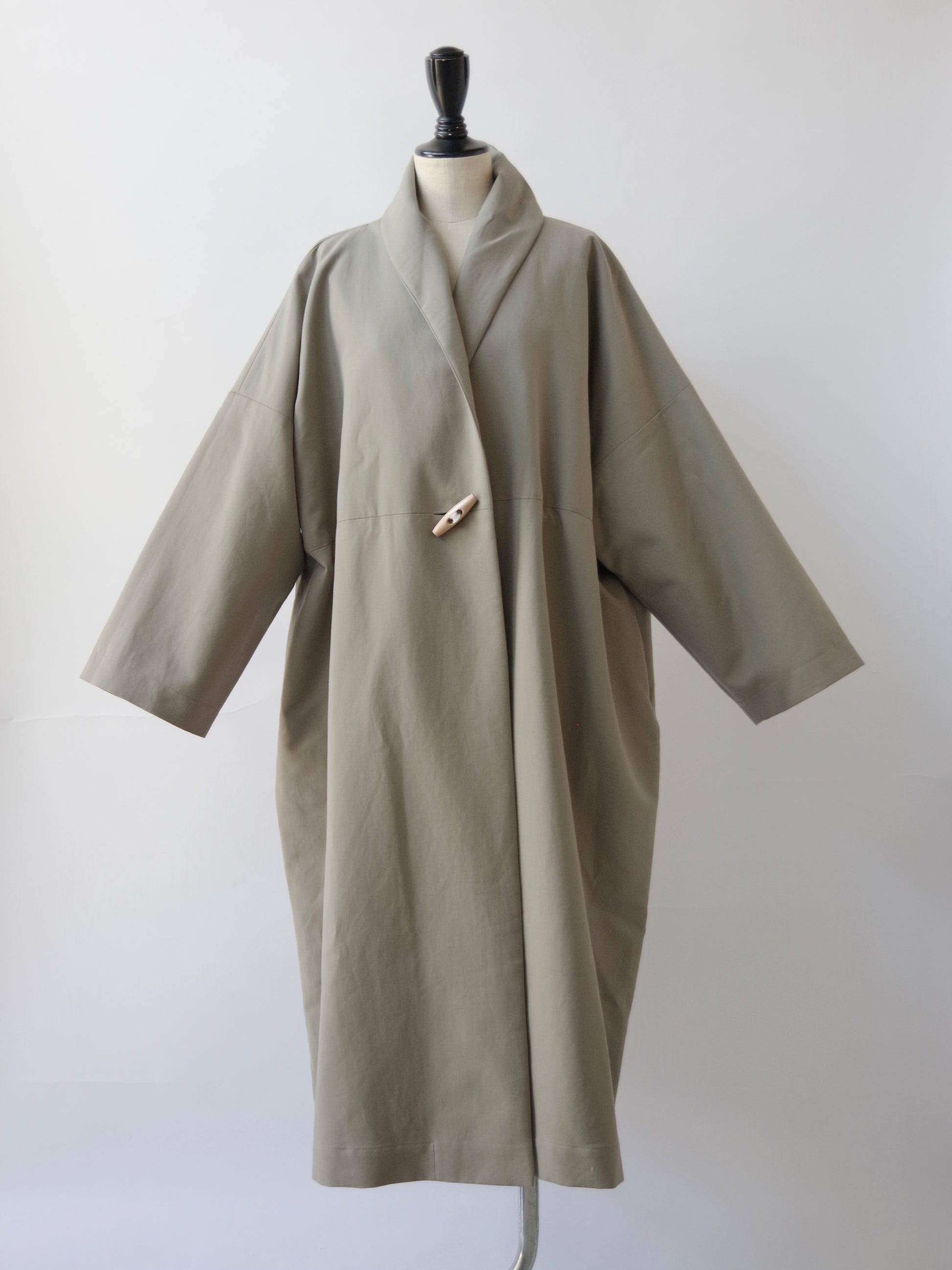 トレンチコートのように着用できるローブコートをSI-HIRAI解釈により、なるべくシンプルに縫製やディテールをそぎ落としたでデザインに仕上がっています。