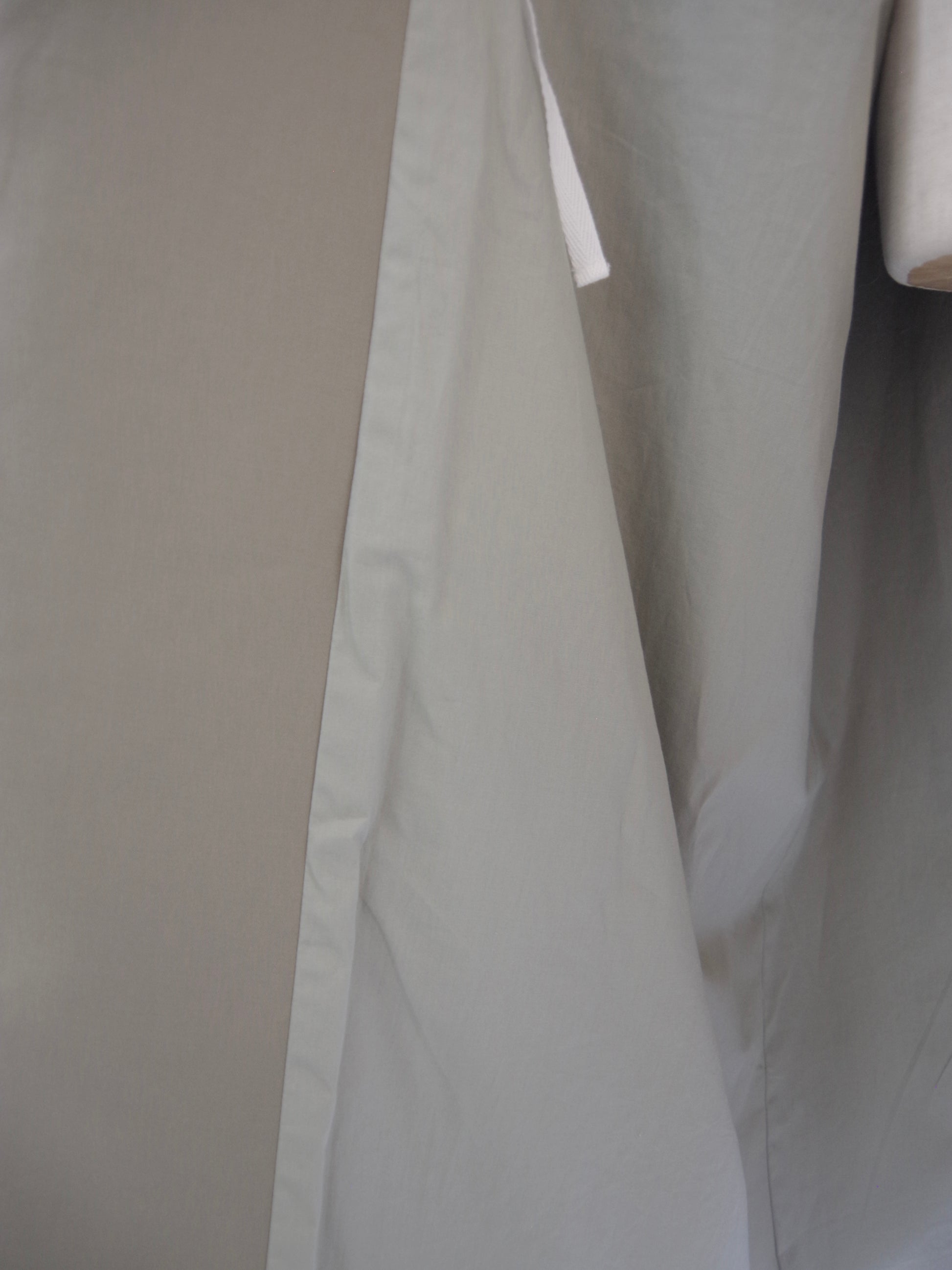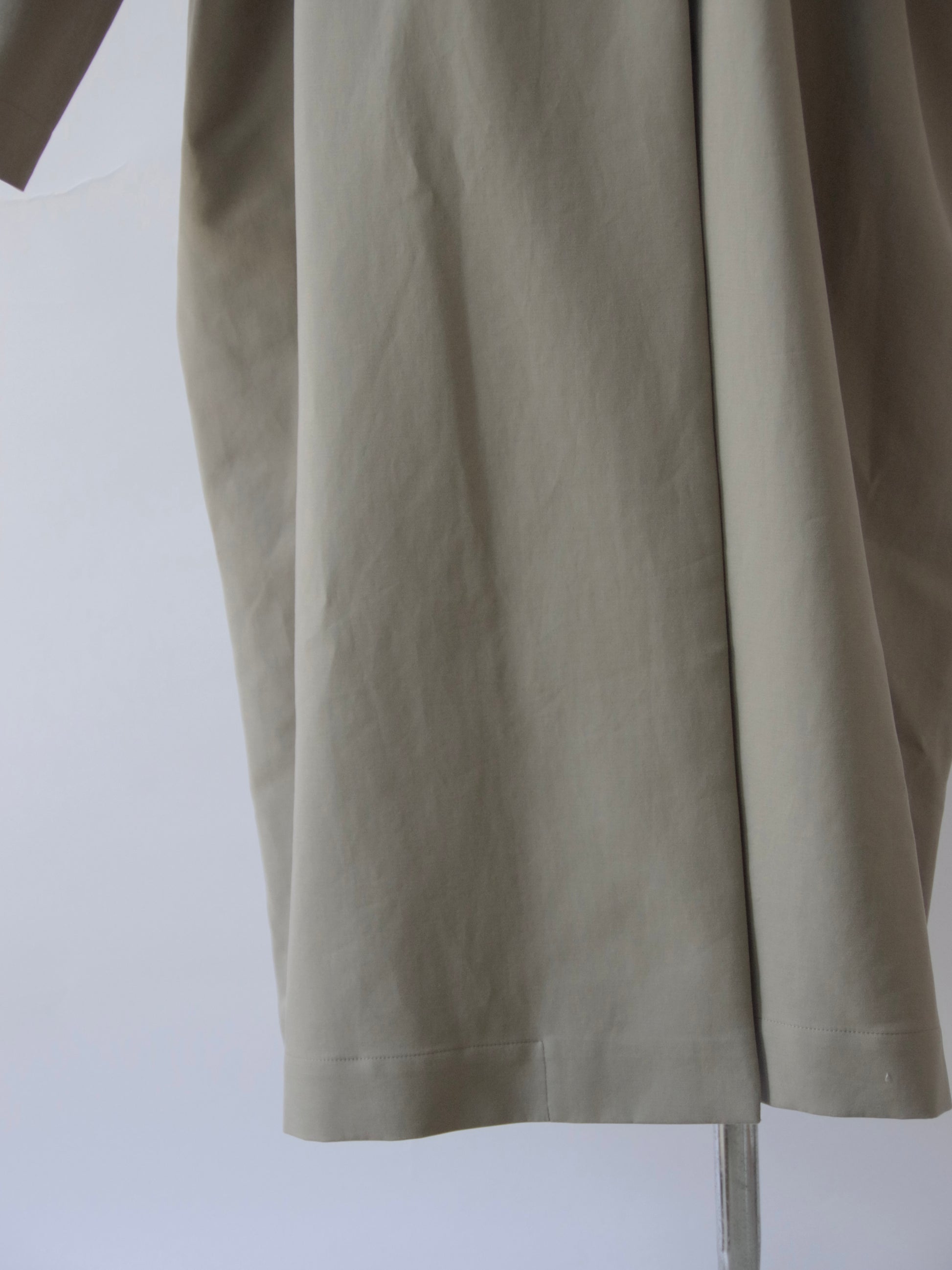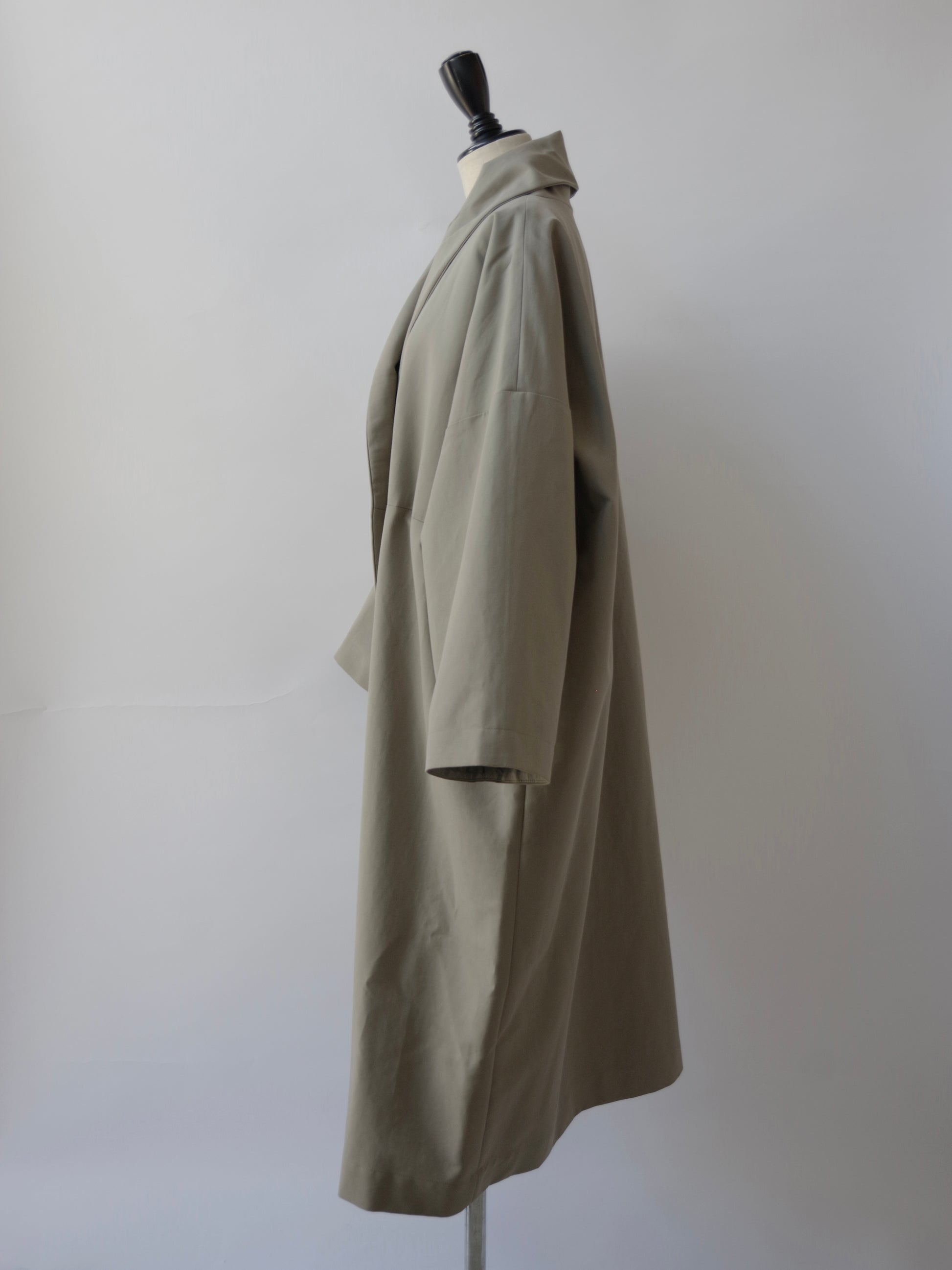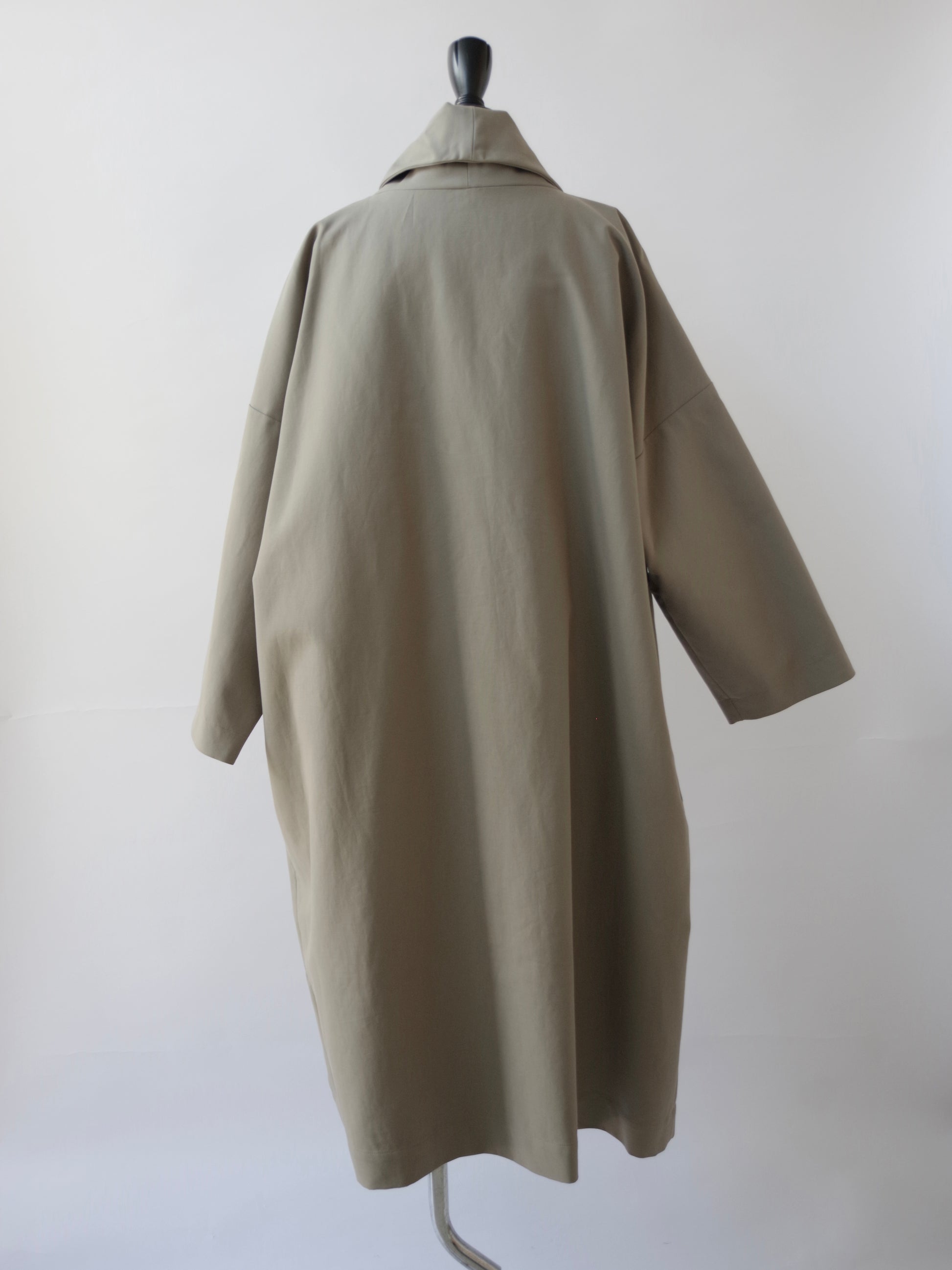 トレンチコートのように着用できるローブコートをSI-HIRAI解釈により、なるべくシンプルに縫製やディテールをそぎ落としたでデザインに仕上がっています。