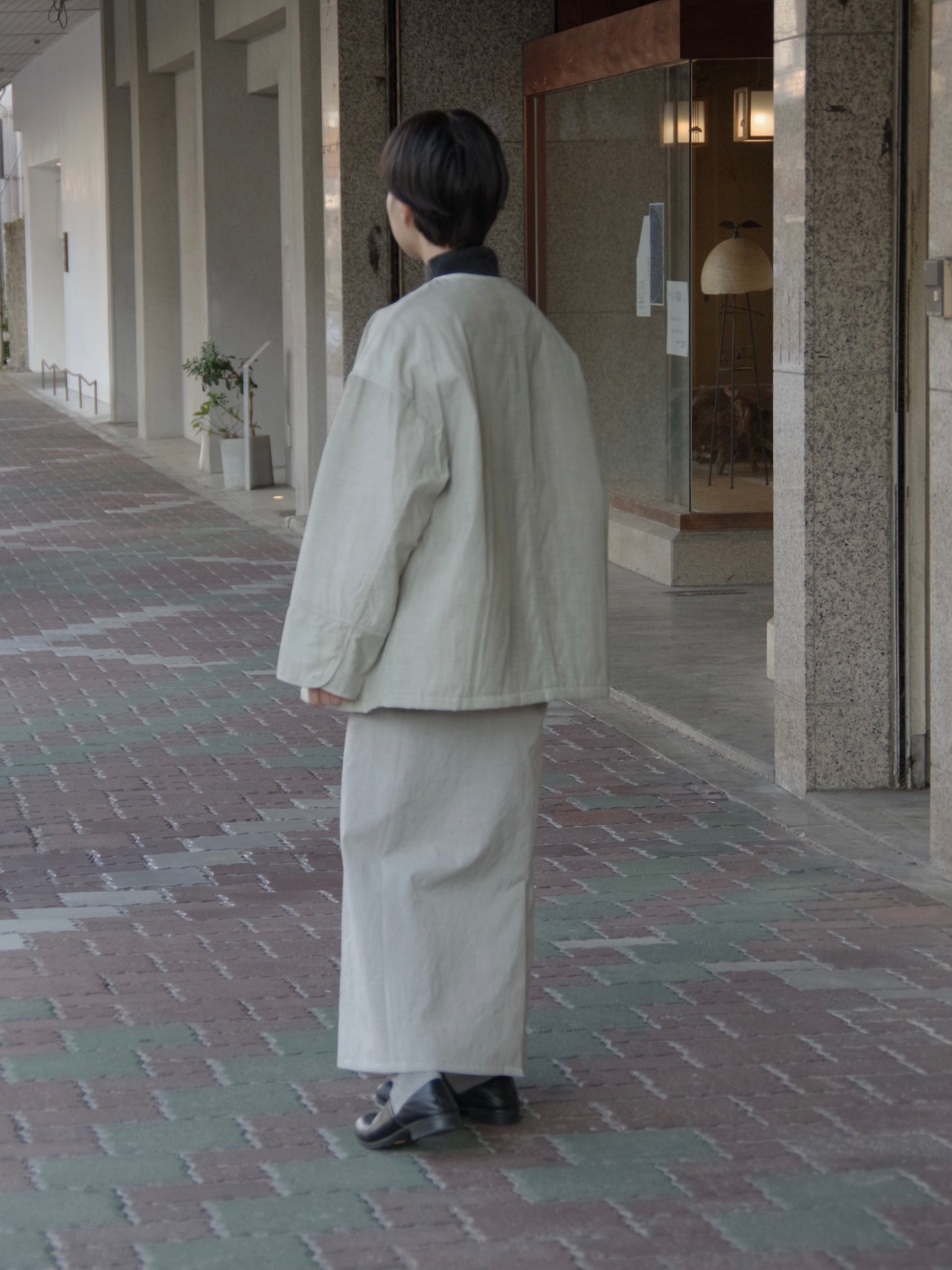 職人の手で一つひとつ丁寧に染め上げた、流し染めによるyuni別注素材を使用したノーカラージャケット。