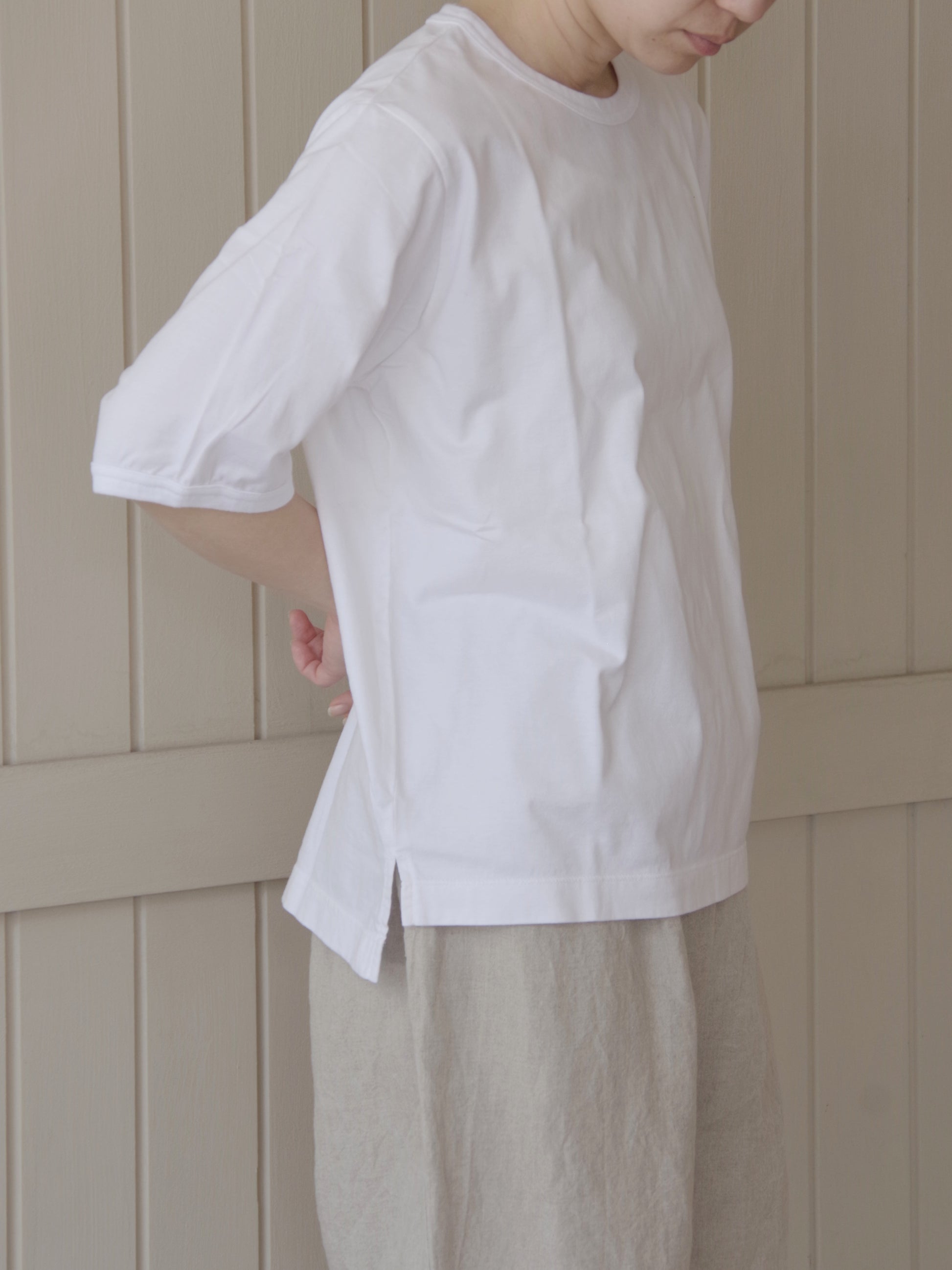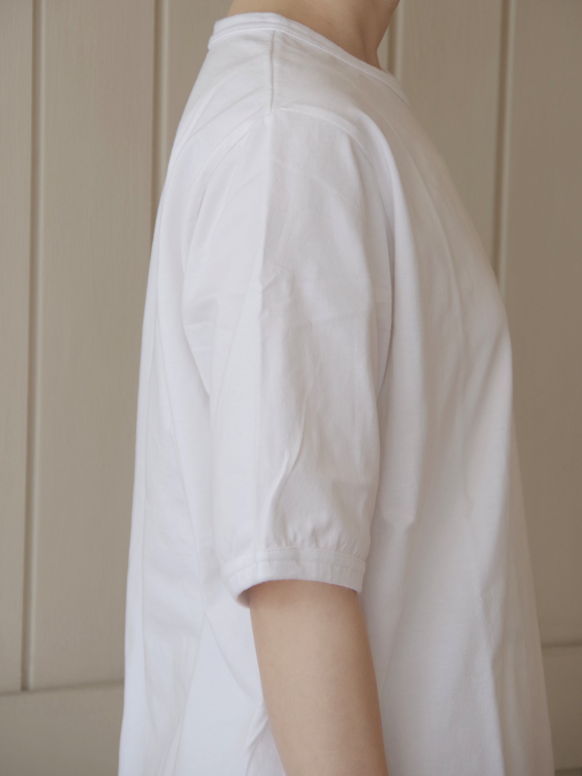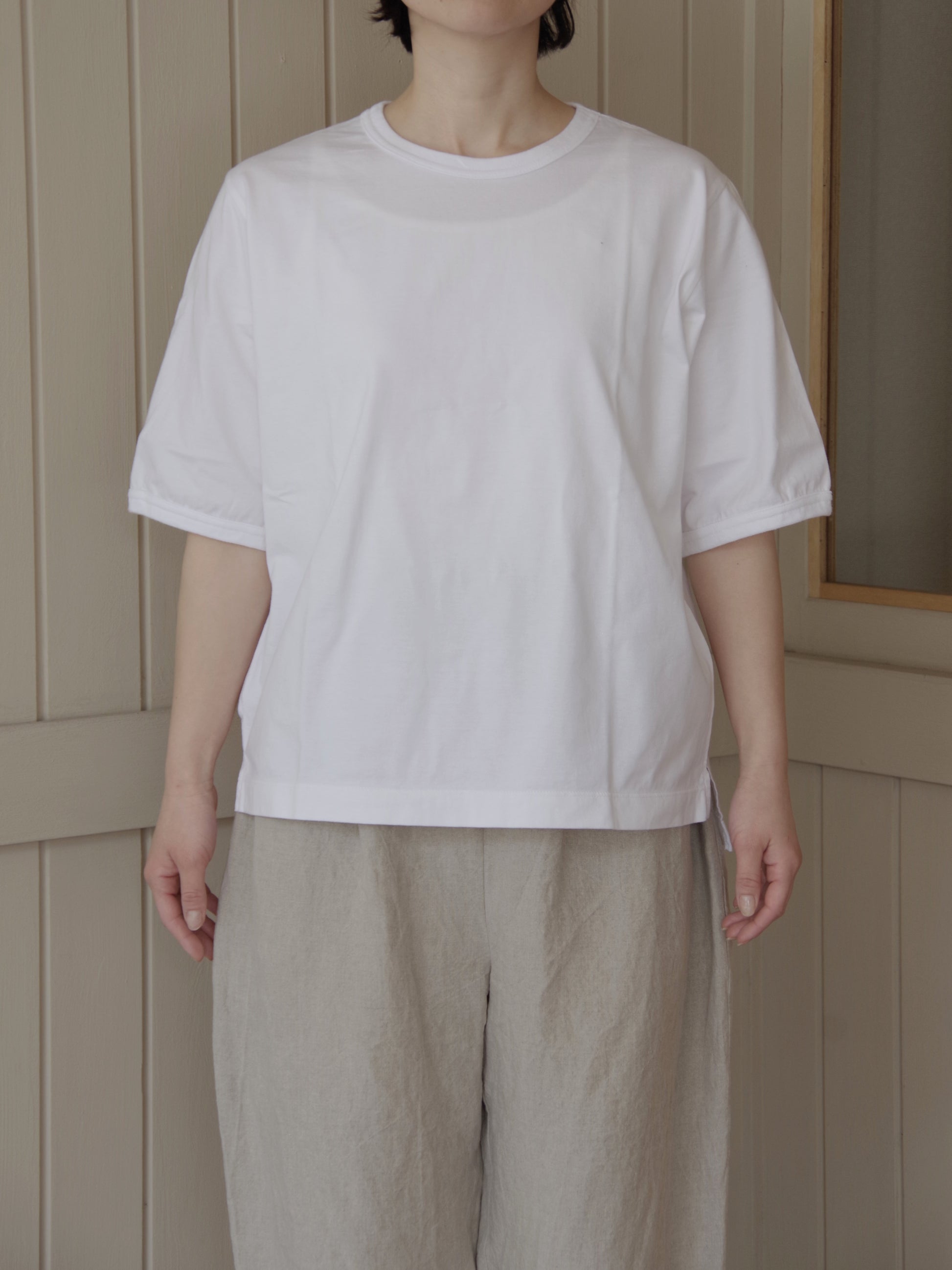 襟ぐりと袖口はリブでパイピングしており袖口は少しふくらみをもたせるように絞っています。袖丈が少し長いのも二の腕を隠せる嬉しいポイントです。