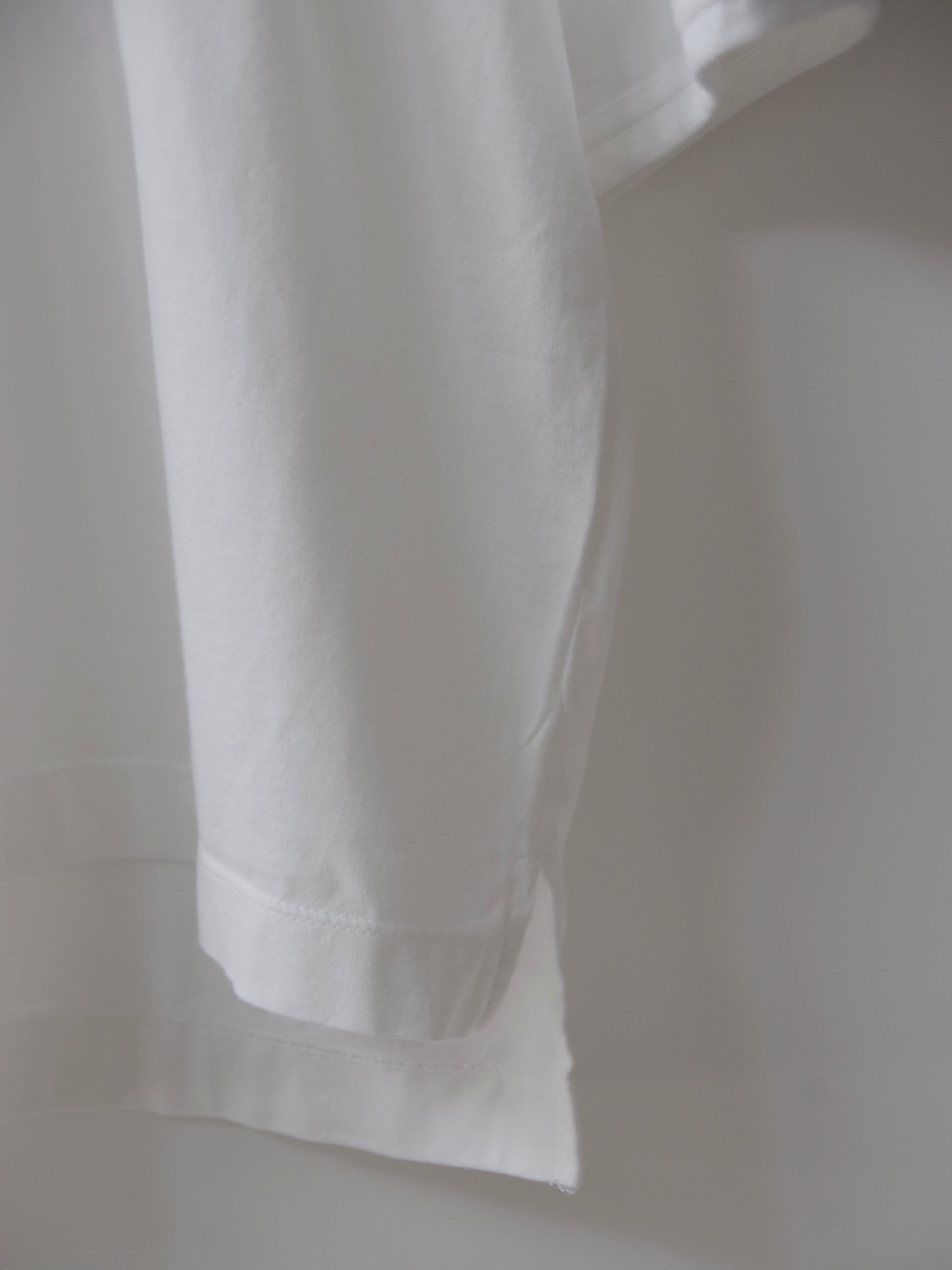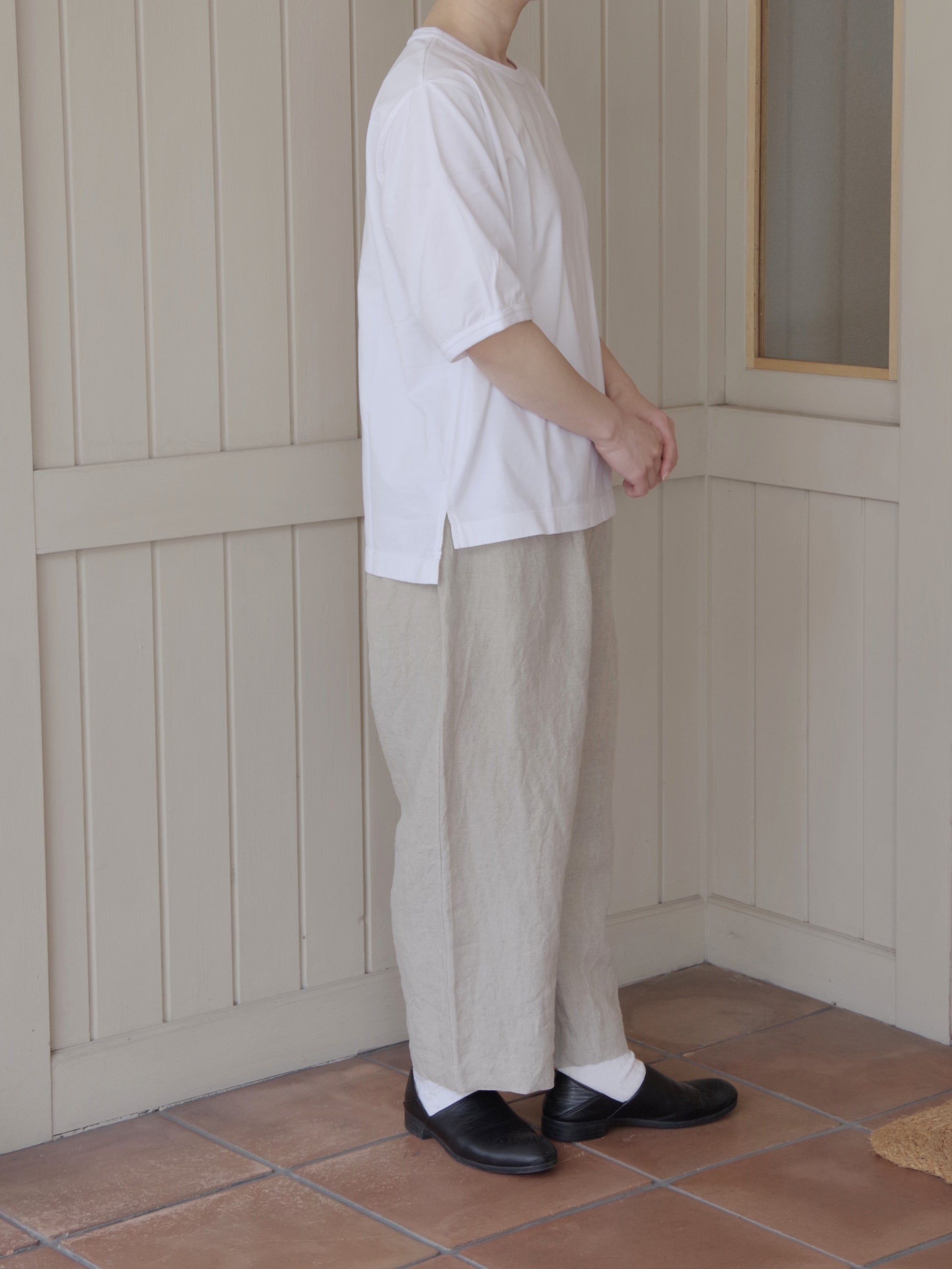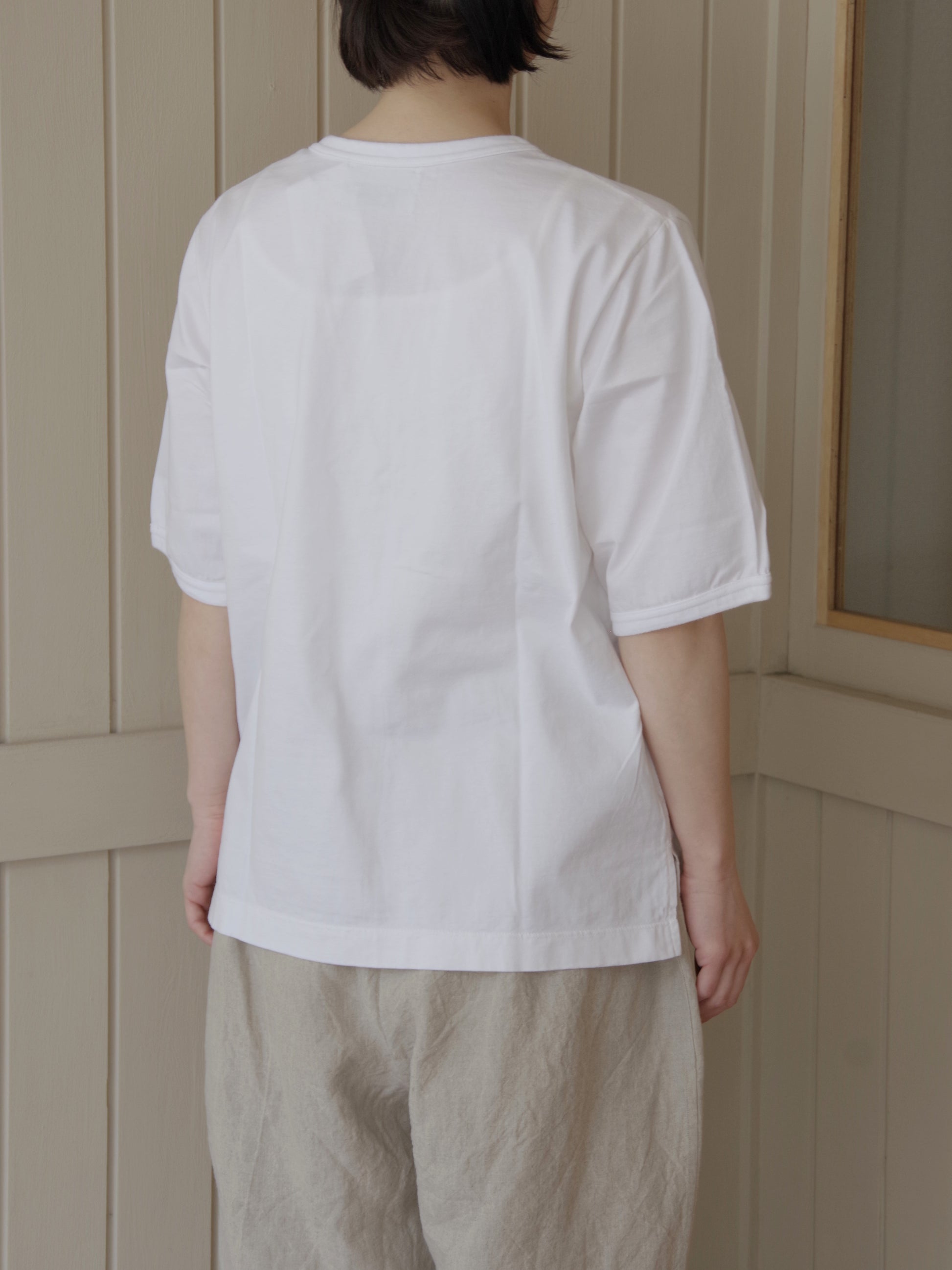 襟ぐりと袖口はリブでパイピングしており袖口は少しふくらみをもたせるように絞っています。袖丈が少し長いのも二の腕を隠せる嬉しいポイントです。