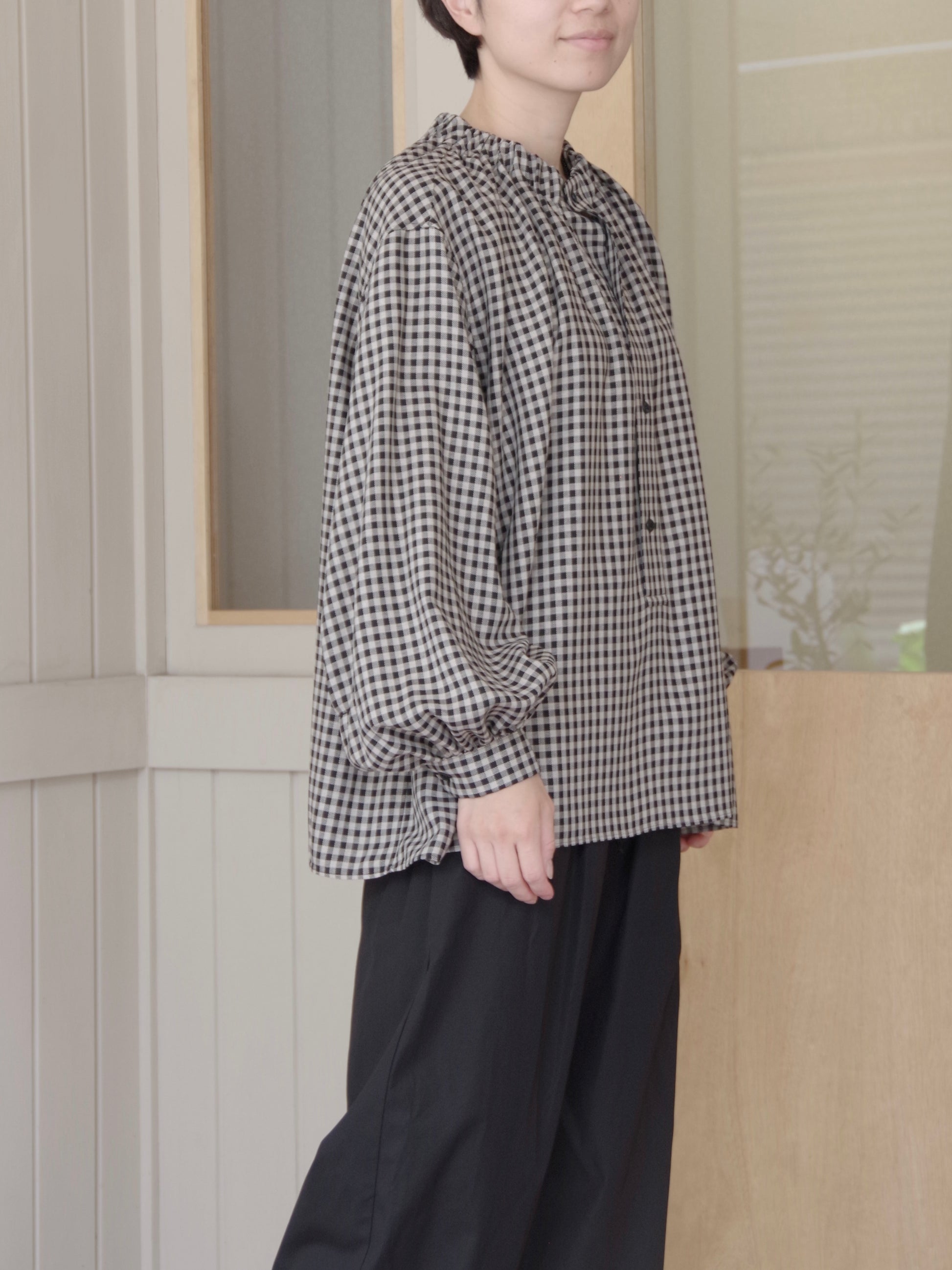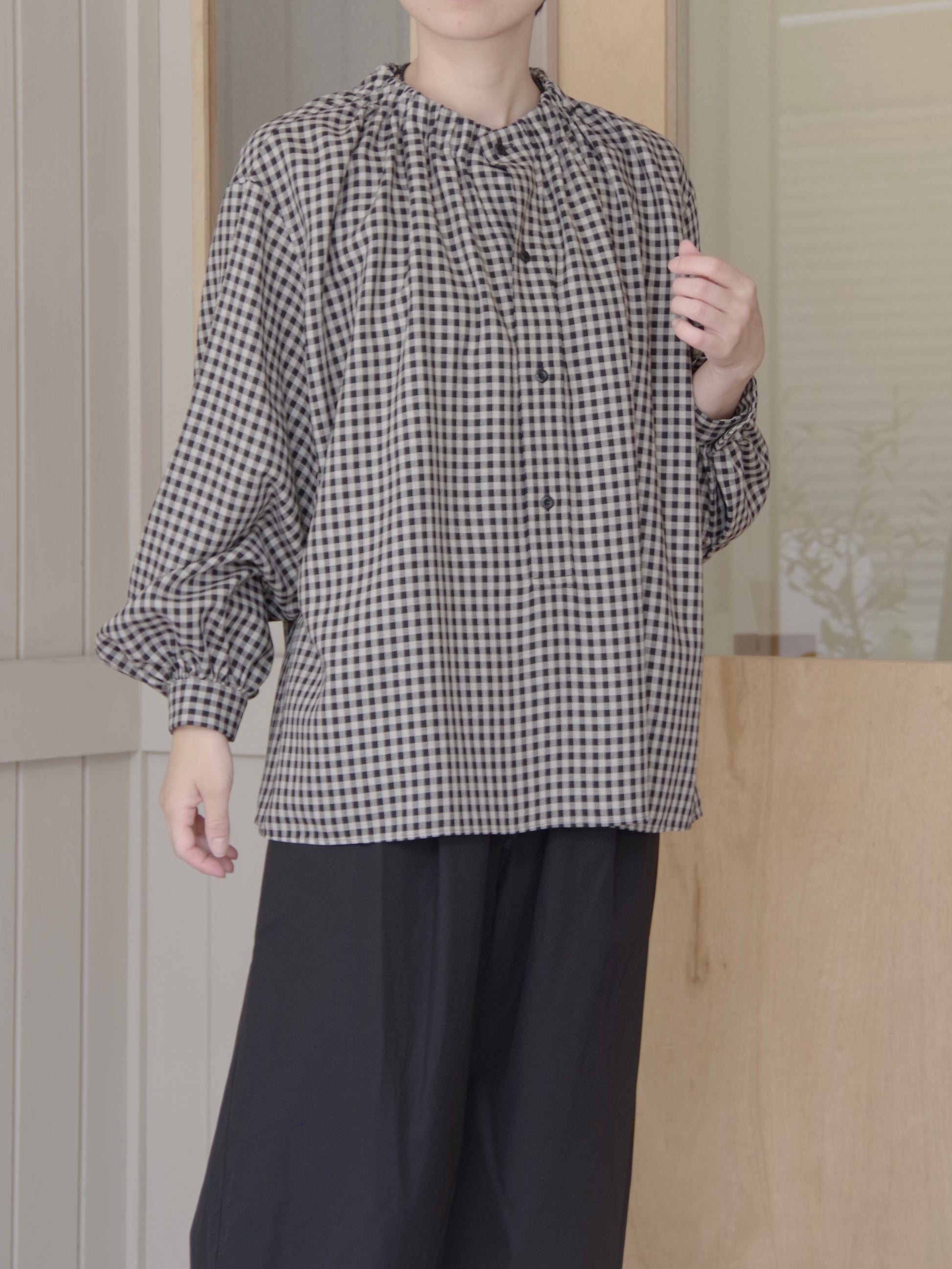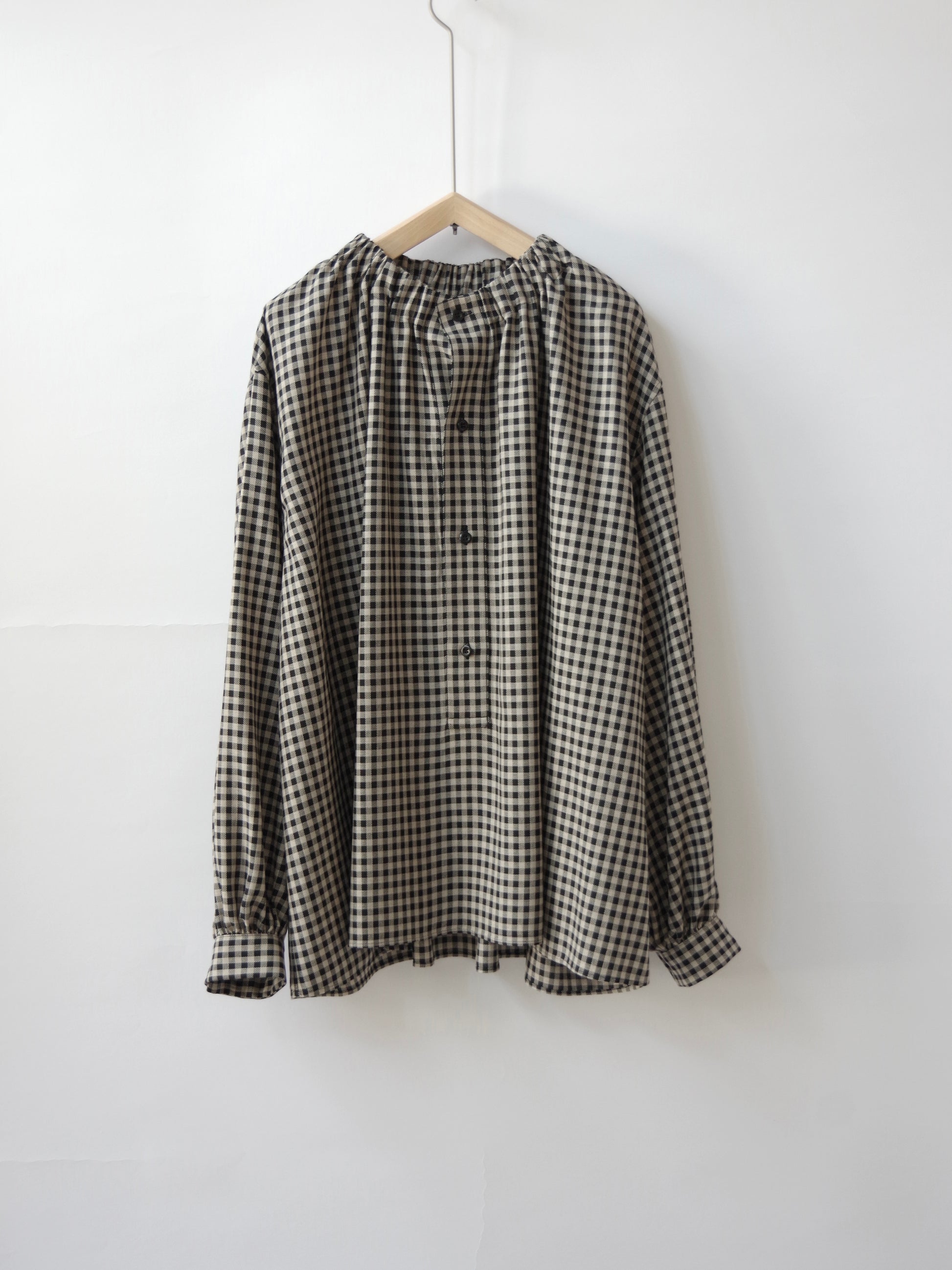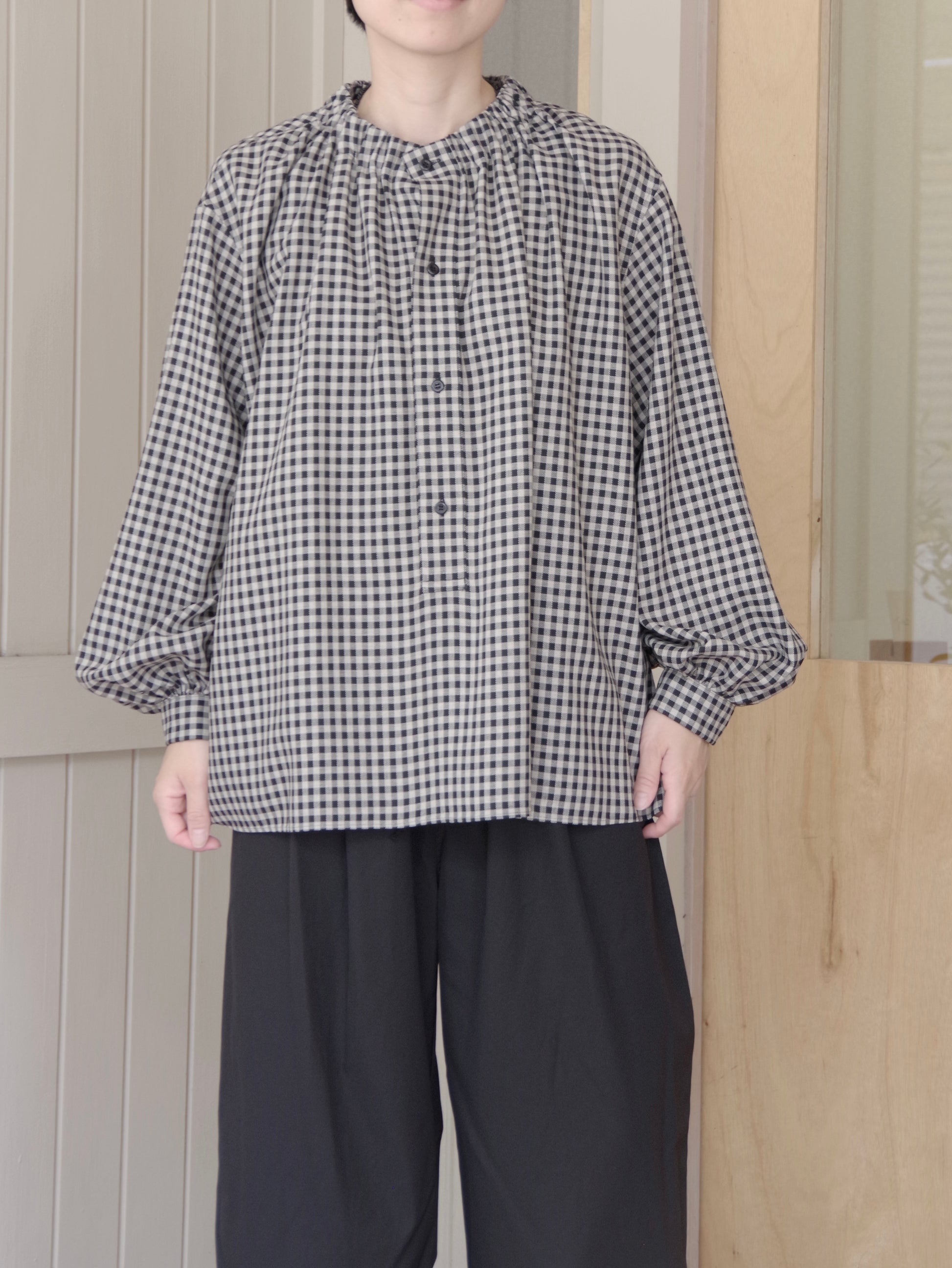 衿回りにゴムシャーリングを施したプルオーバーシャツ。