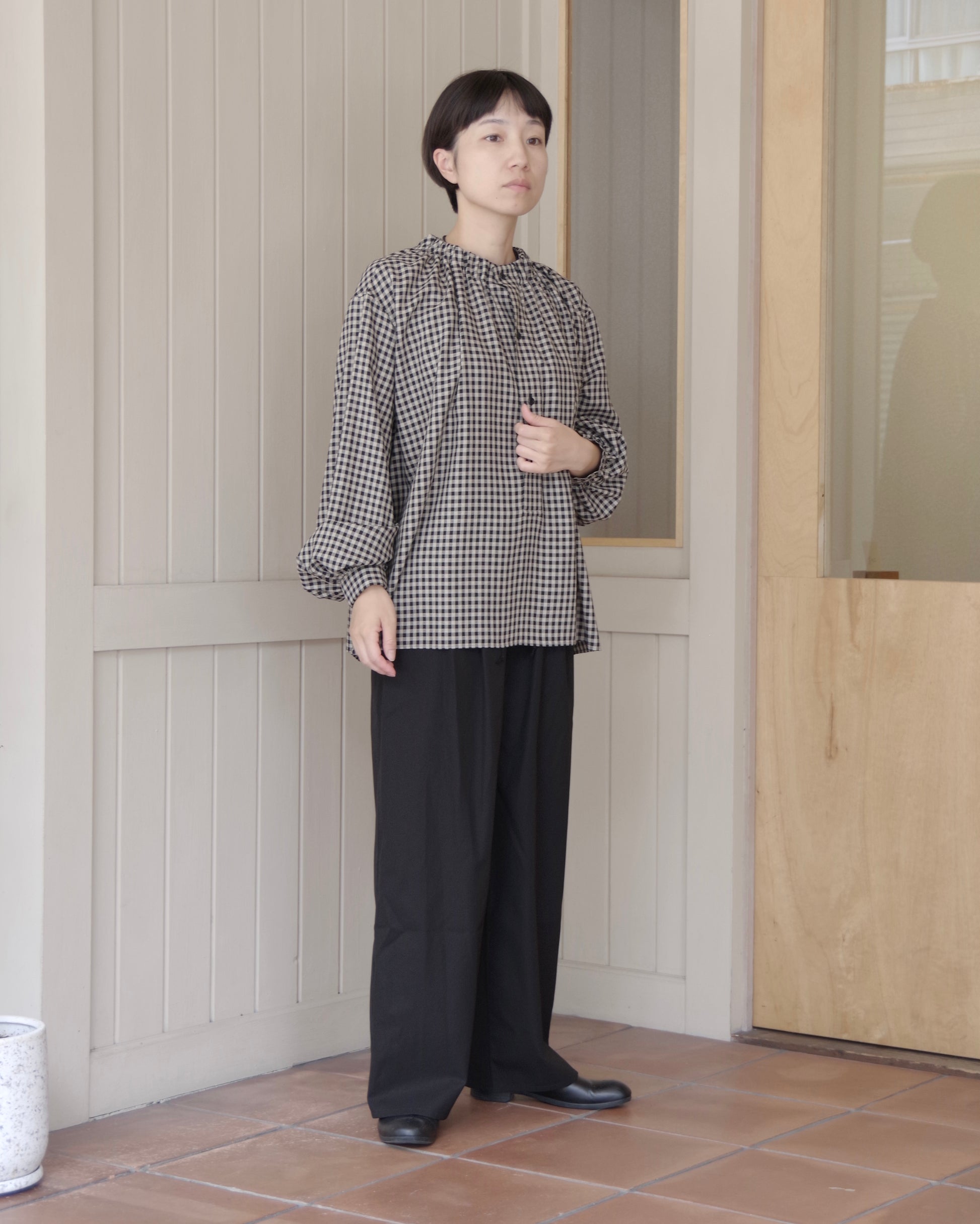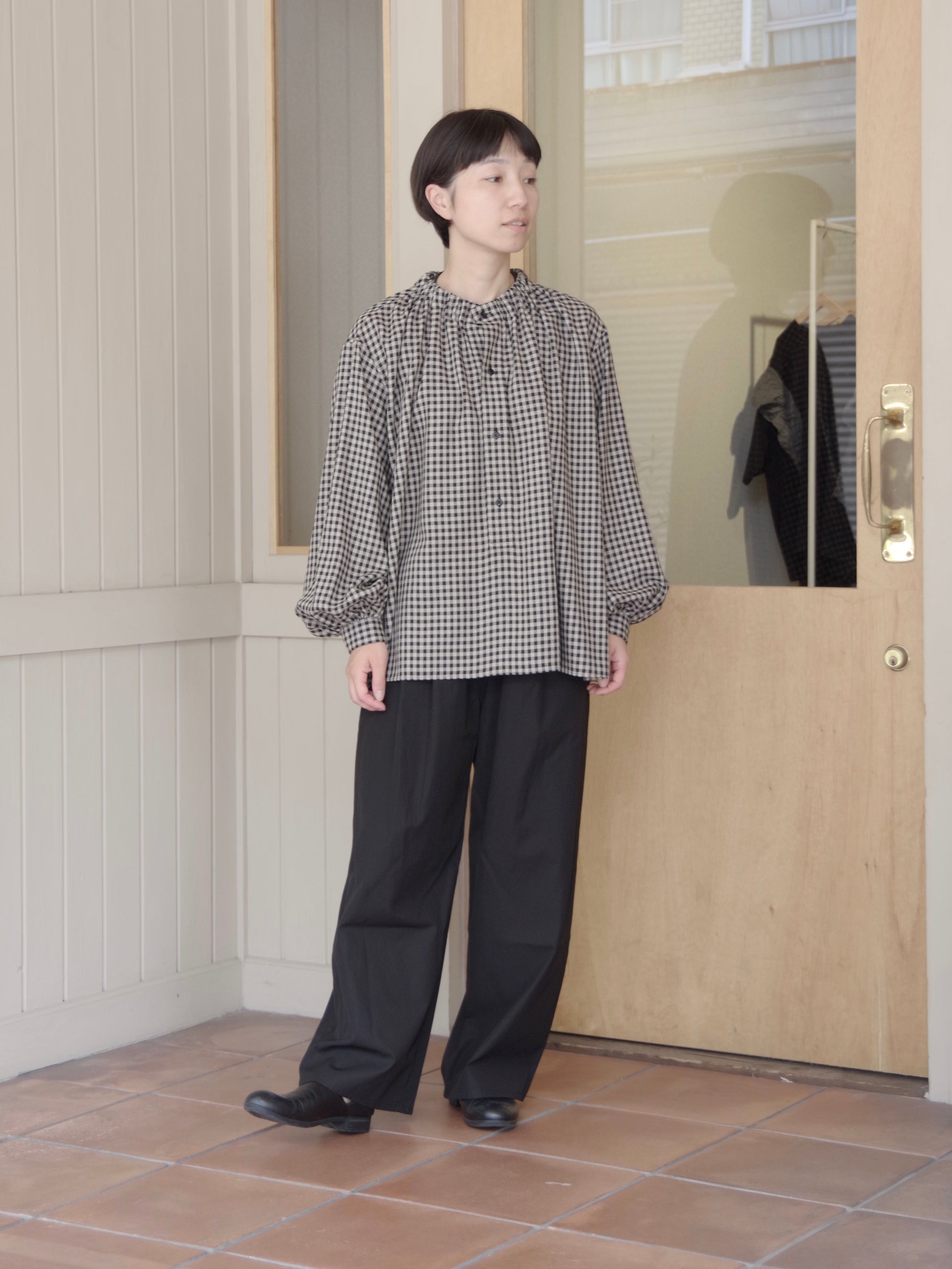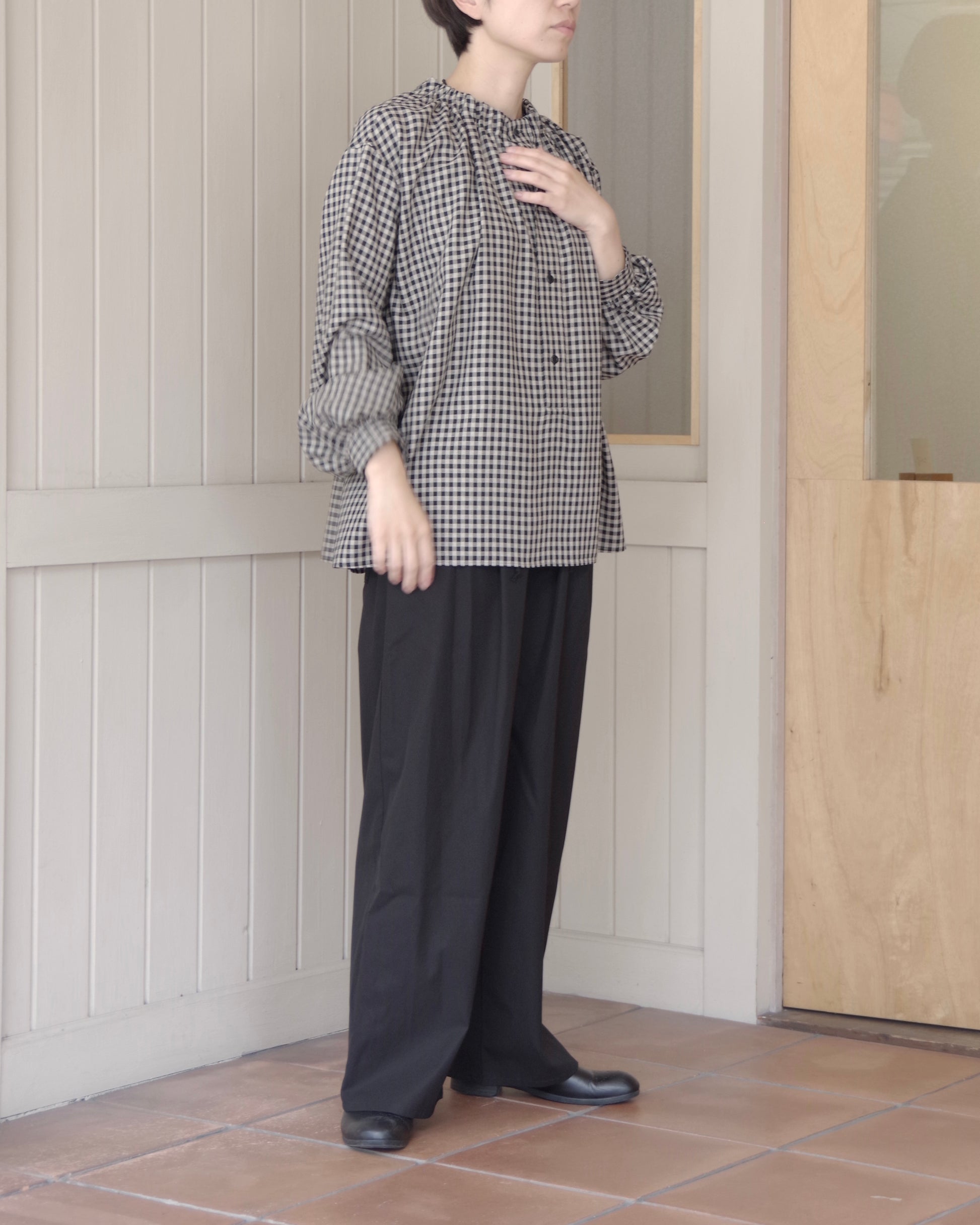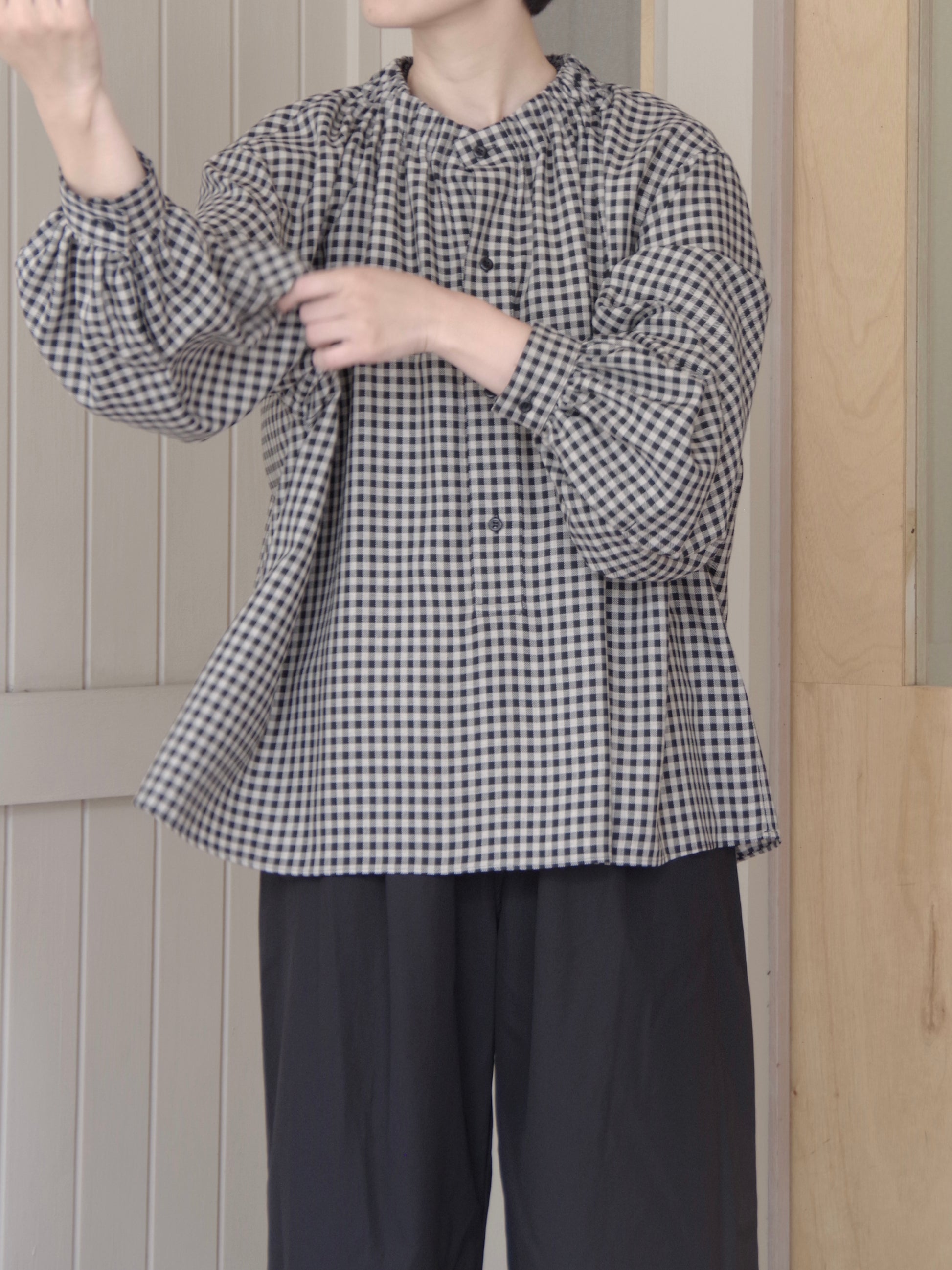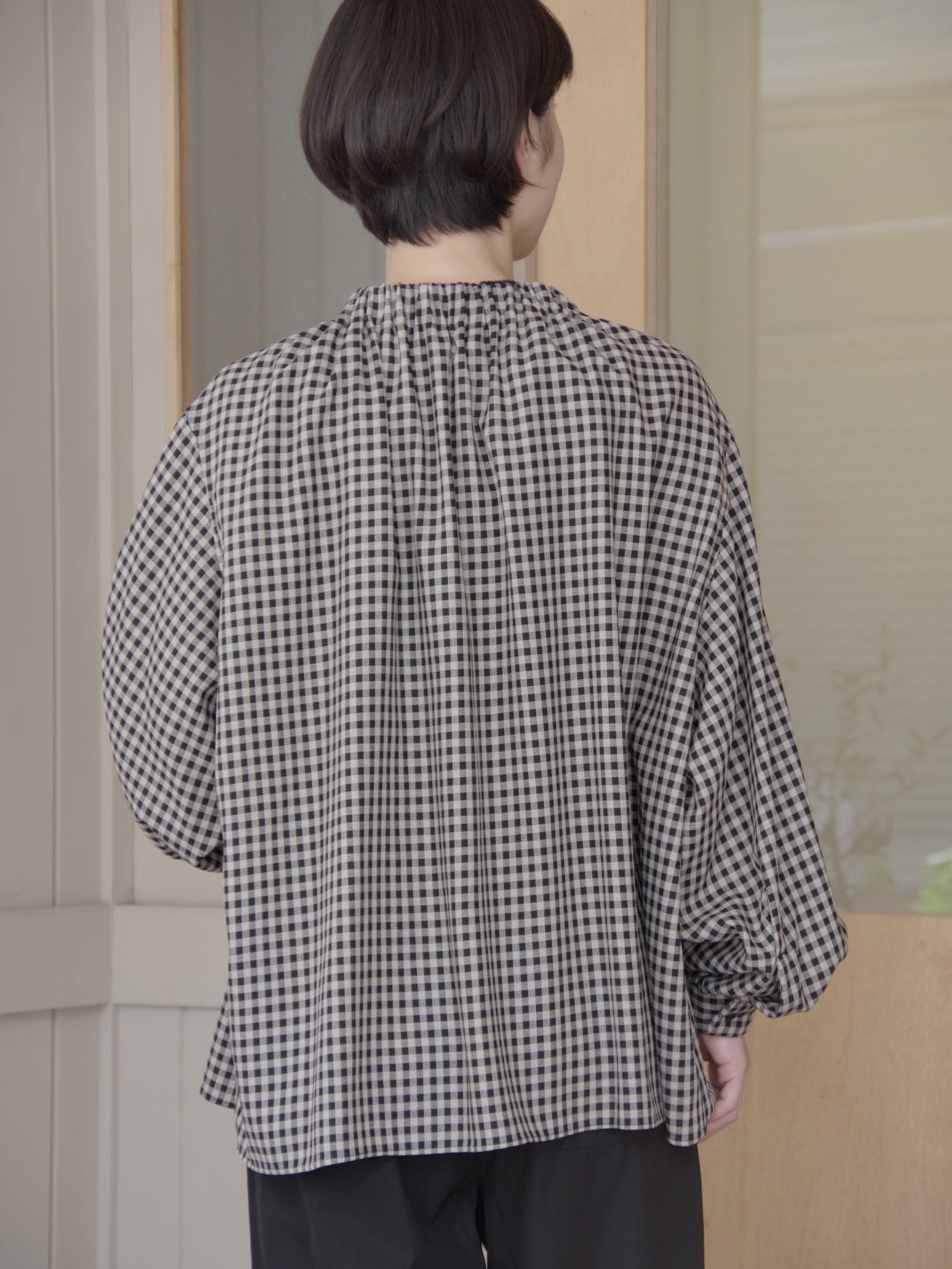 衿回りにゴムシャーリングを施したプルオーバーシャツ。