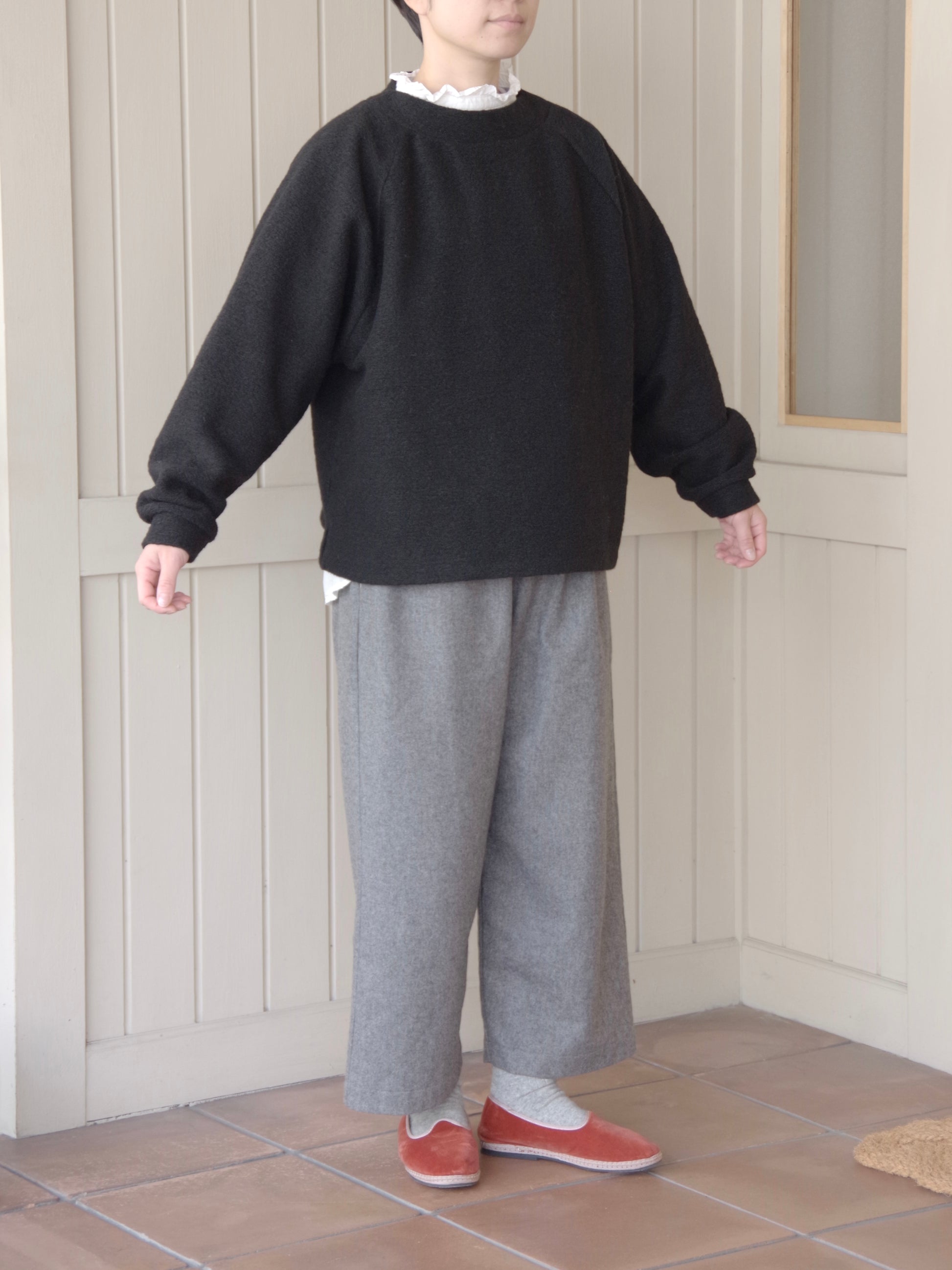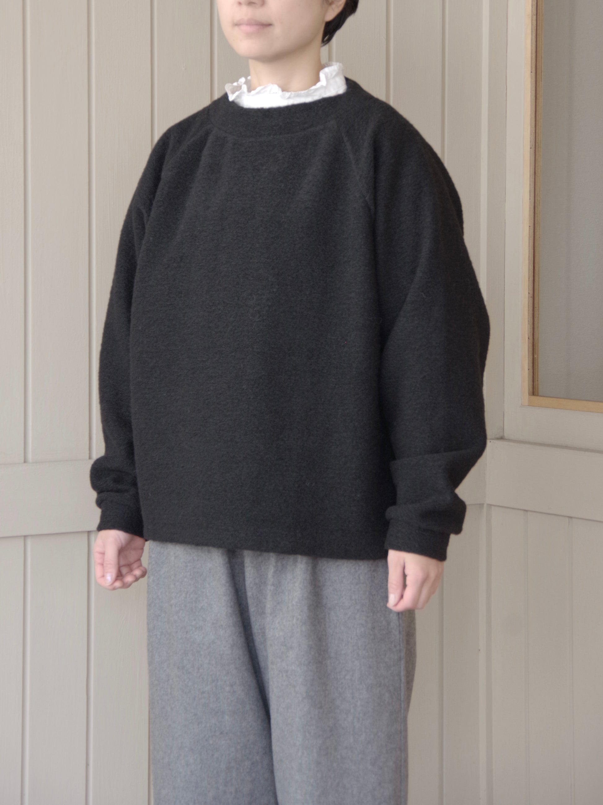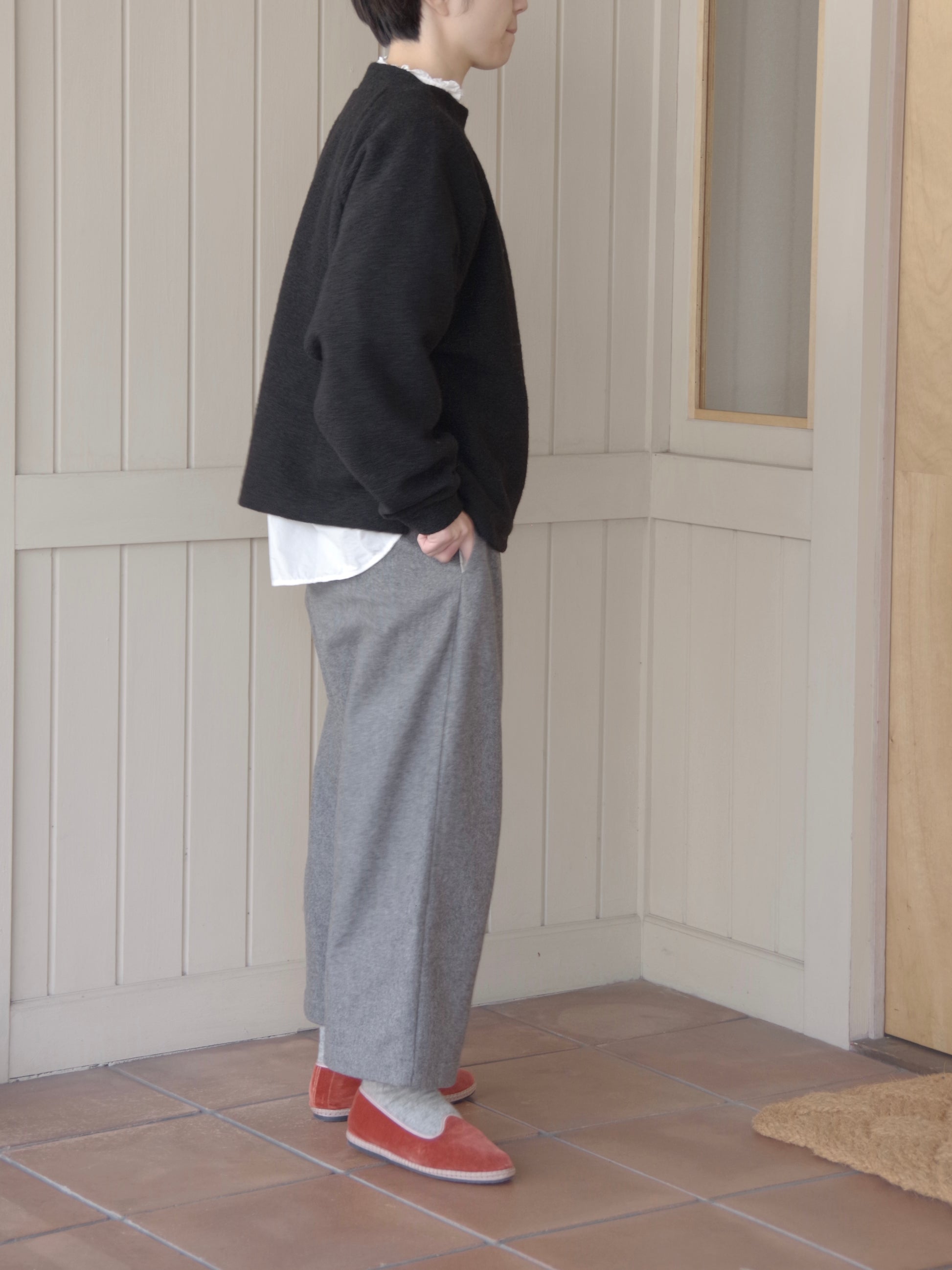 重ね着もしやすいゆったりしたサイズ感と、すこし詰まった首のラインがカジュアルになりすぎずきれいです。