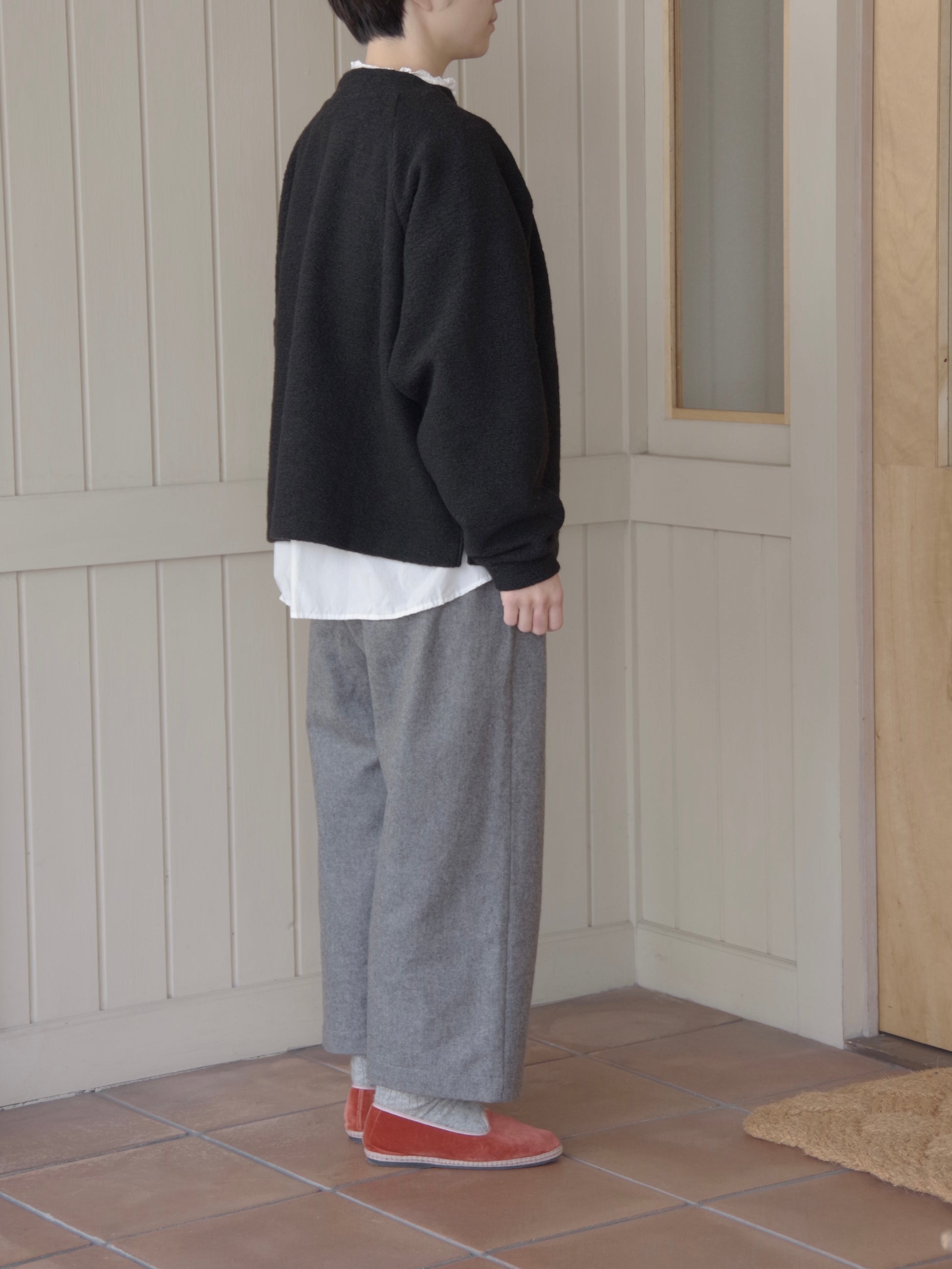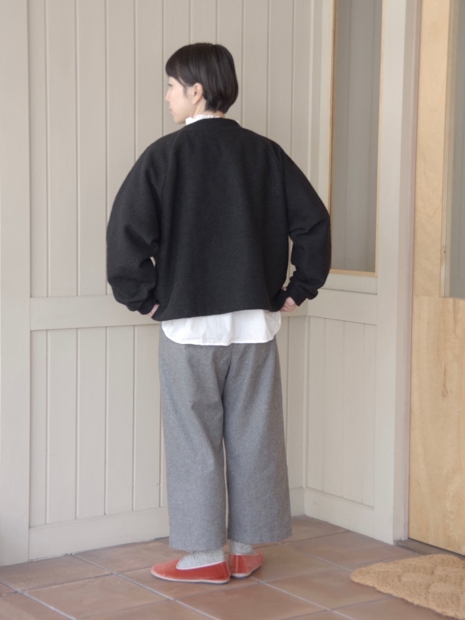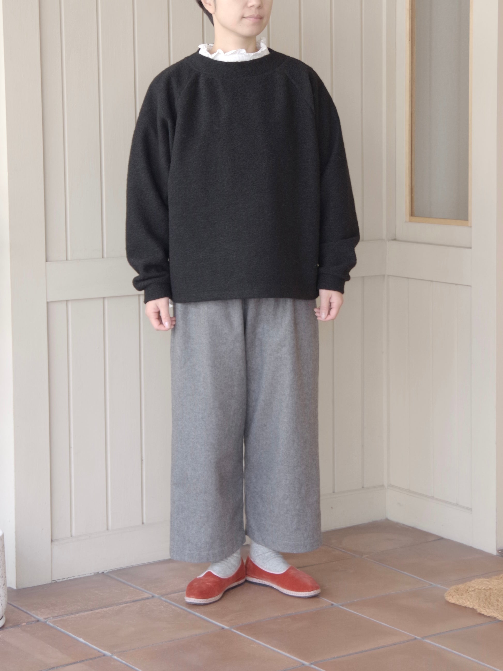 重ね着もしやすいゆったりしたサイズ感と、すこし詰まった首のラインがカジュアルになりすぎずきれいです。