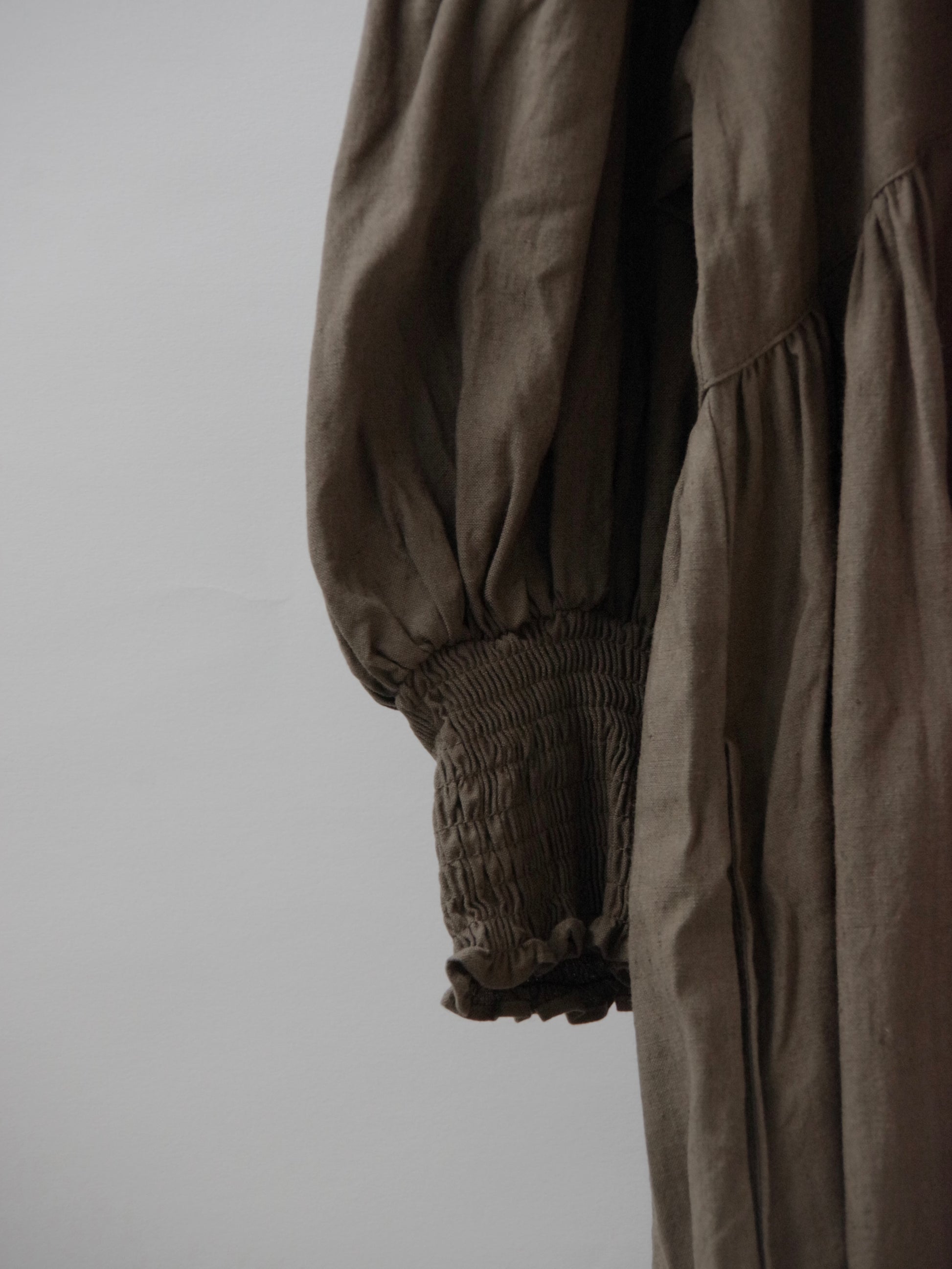 Vネックですっきりした首元に対して、ボリュームのある袖にはシャーリングゴムの袖口になっており長袖としても、たくし上げた袖のシルエットもかわいく見せてくれます。