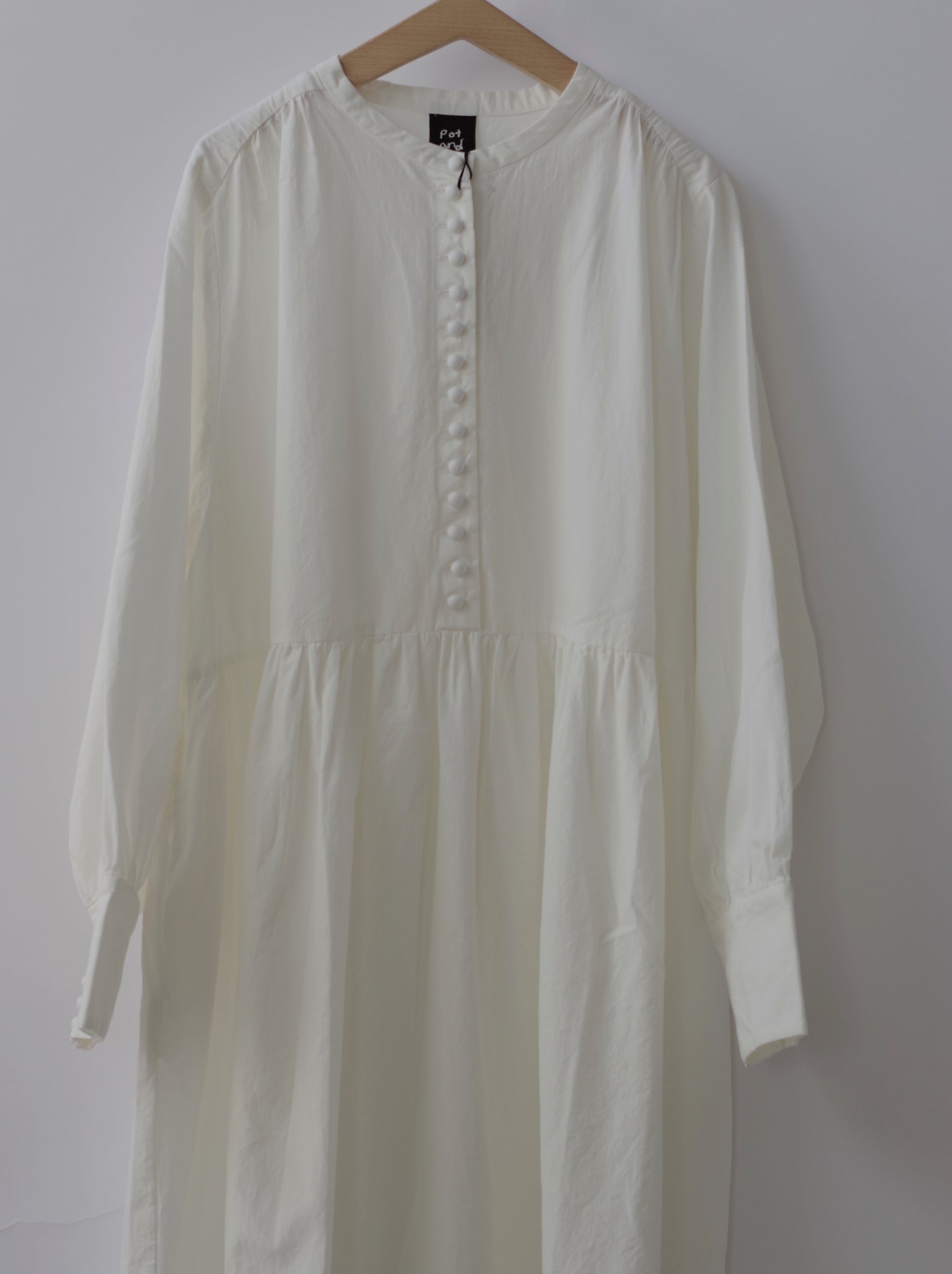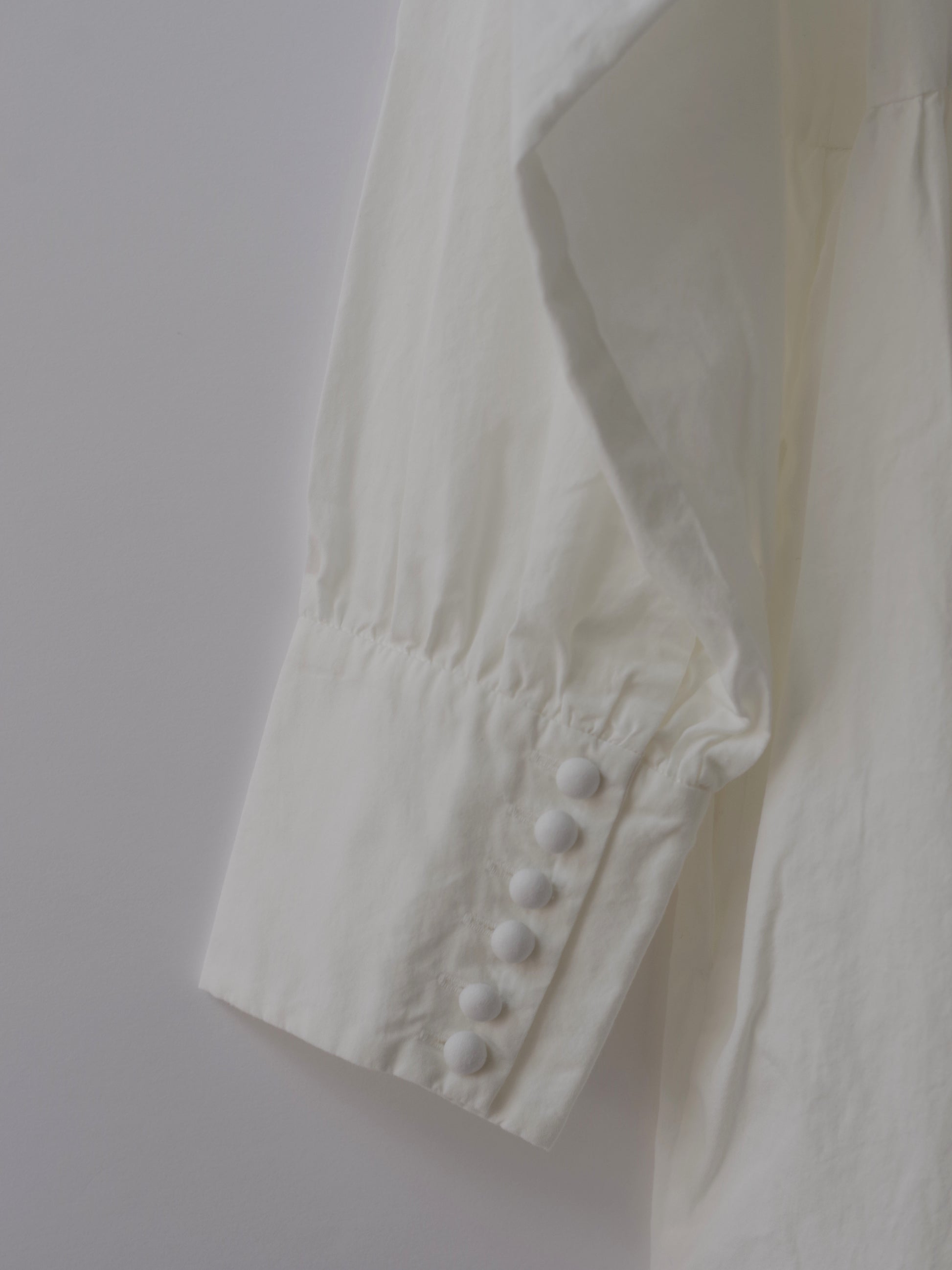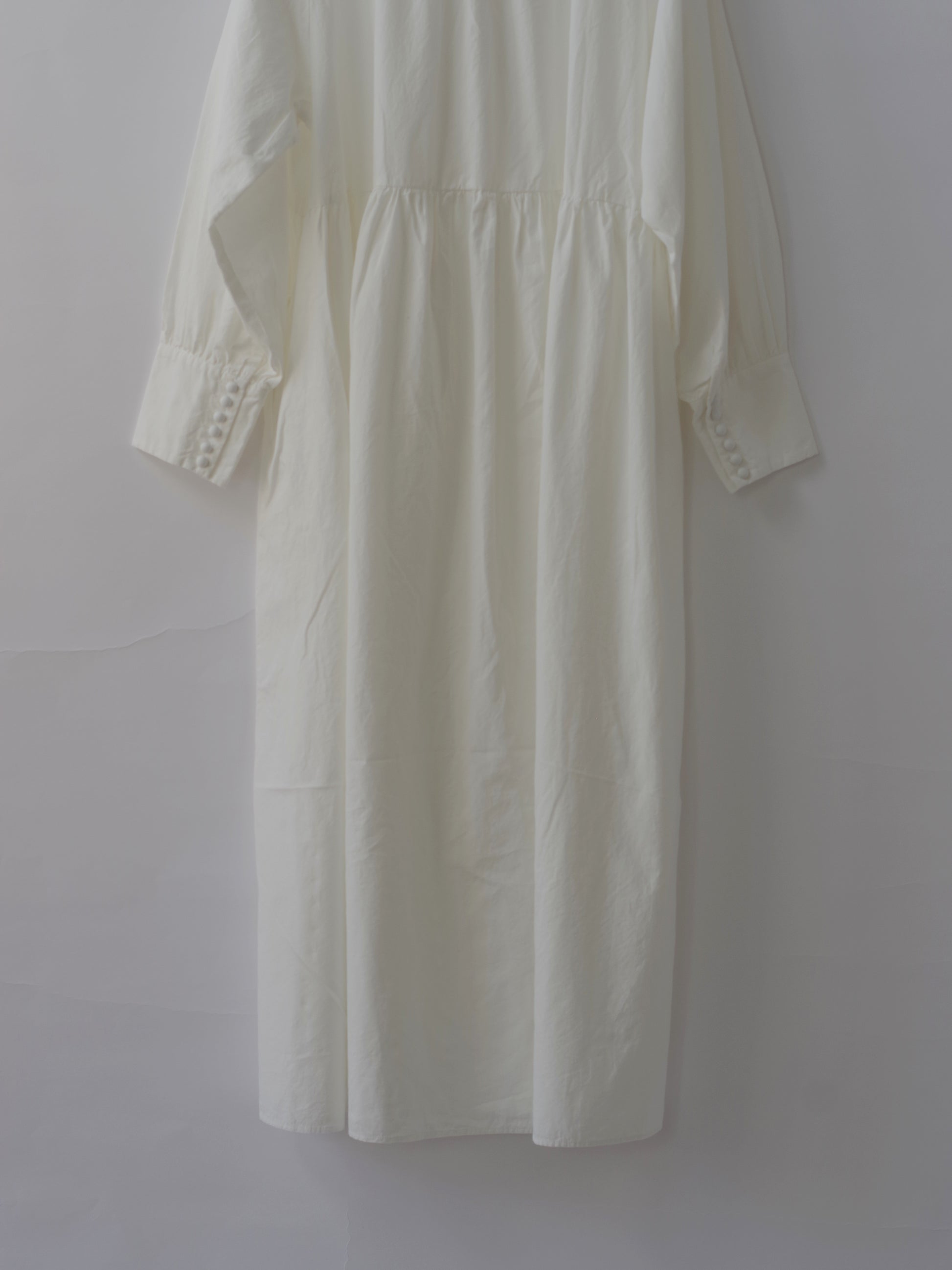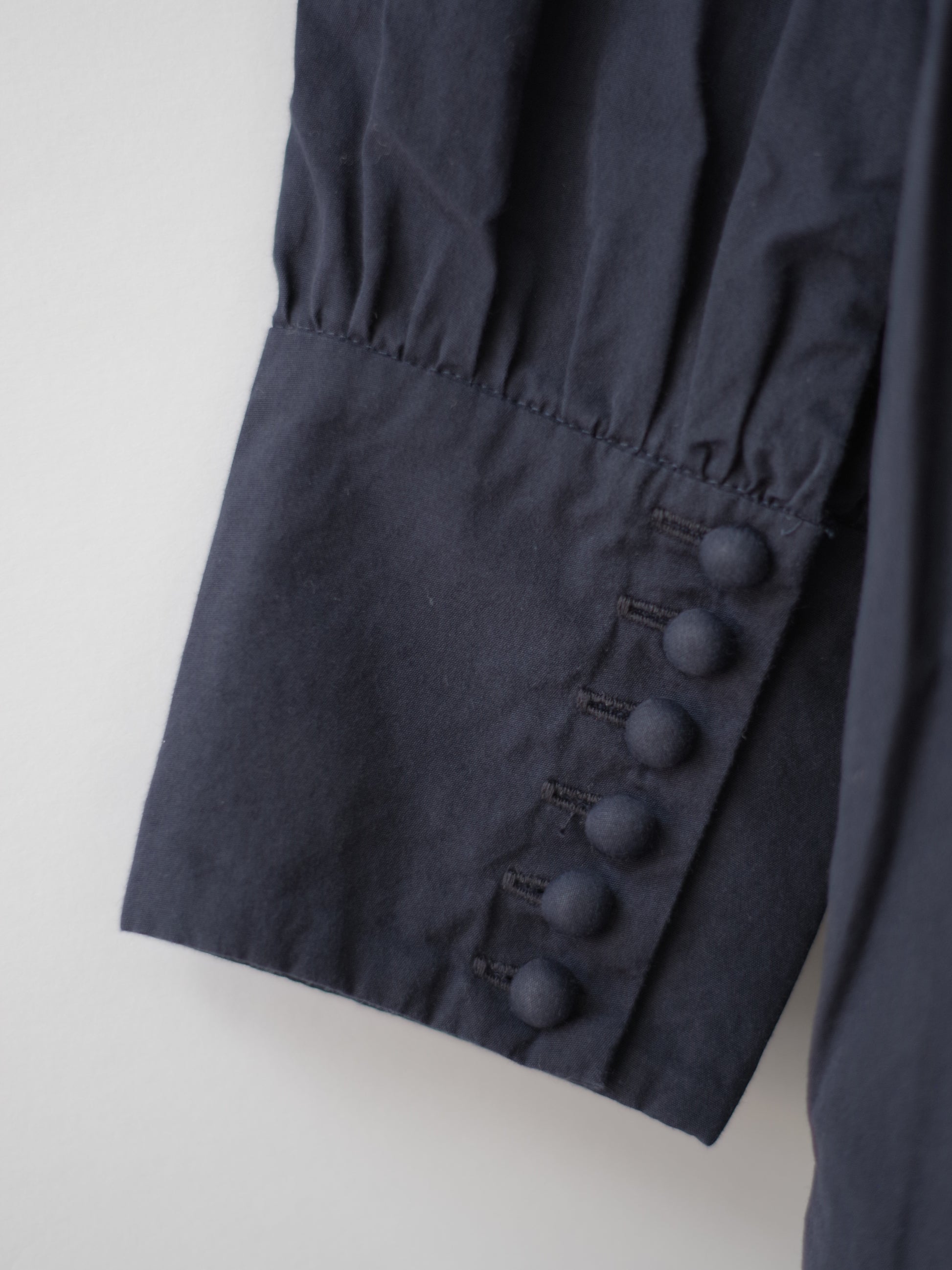 フロントのクルミボタンと袖口のギャザー、ウエストのギャザー、ウエストでの切り替えなどなど、女性らしく大人っぽい要素をバランスよく盛り込んだ一着です。