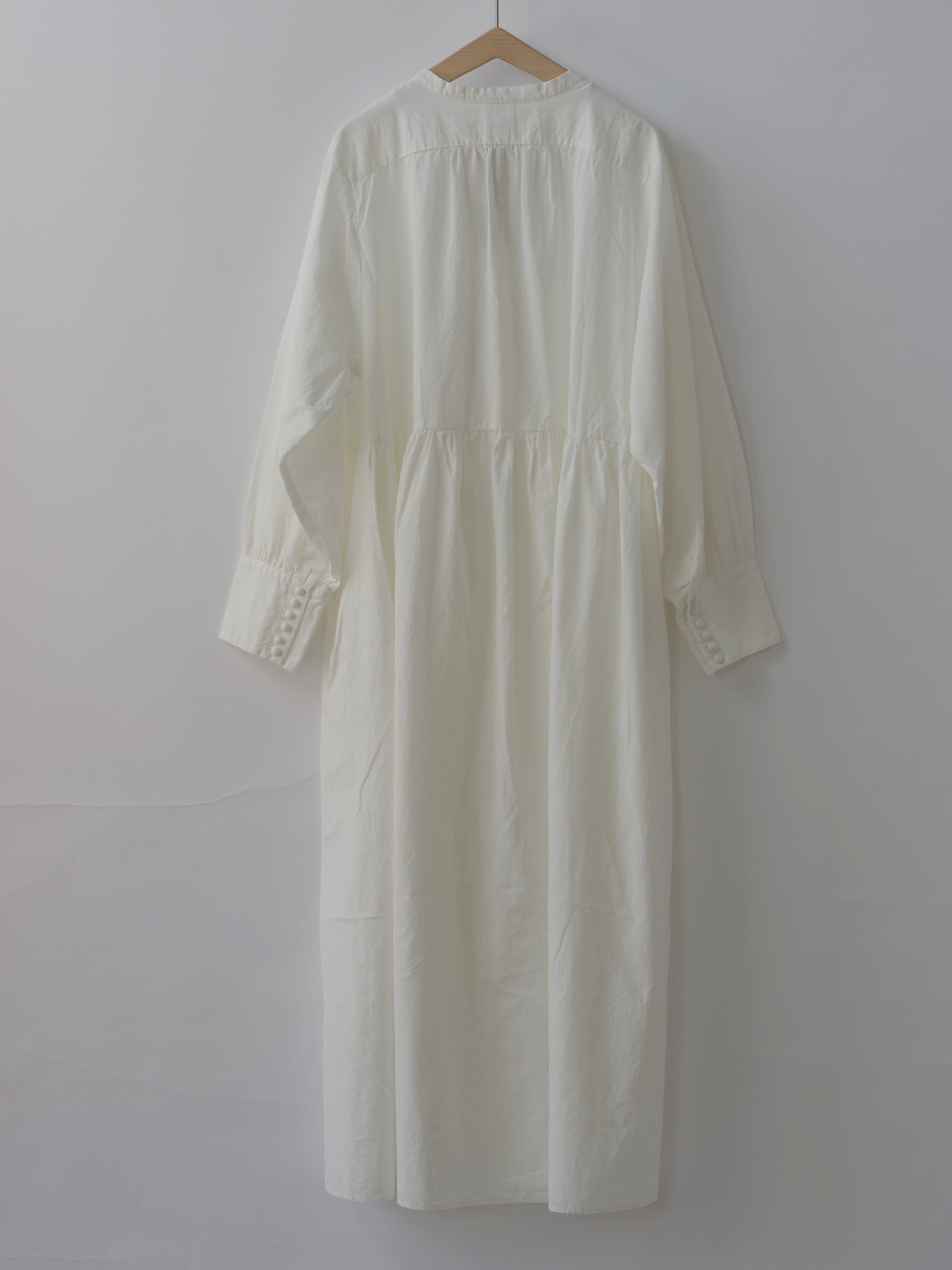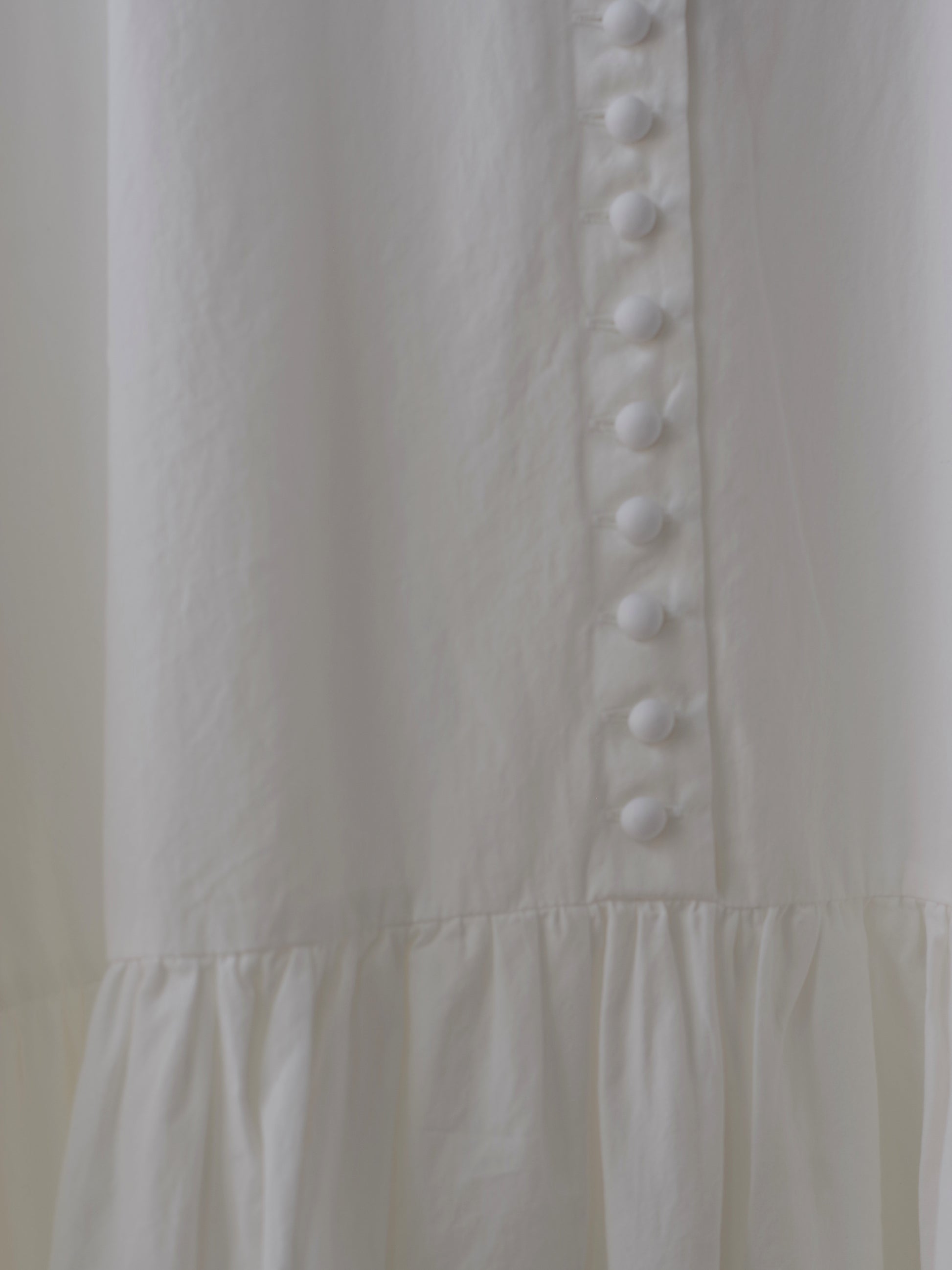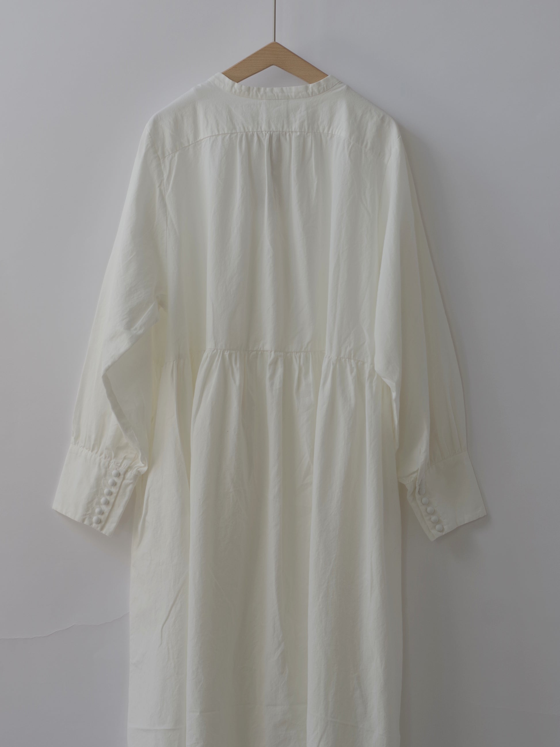 フロントのクルミボタンと袖口のギャザー、ウエストのギャザー、ウエストでの切り替えなどなど、女性らしく大人っぽい要素をバランスよく盛り込んだ一着です。