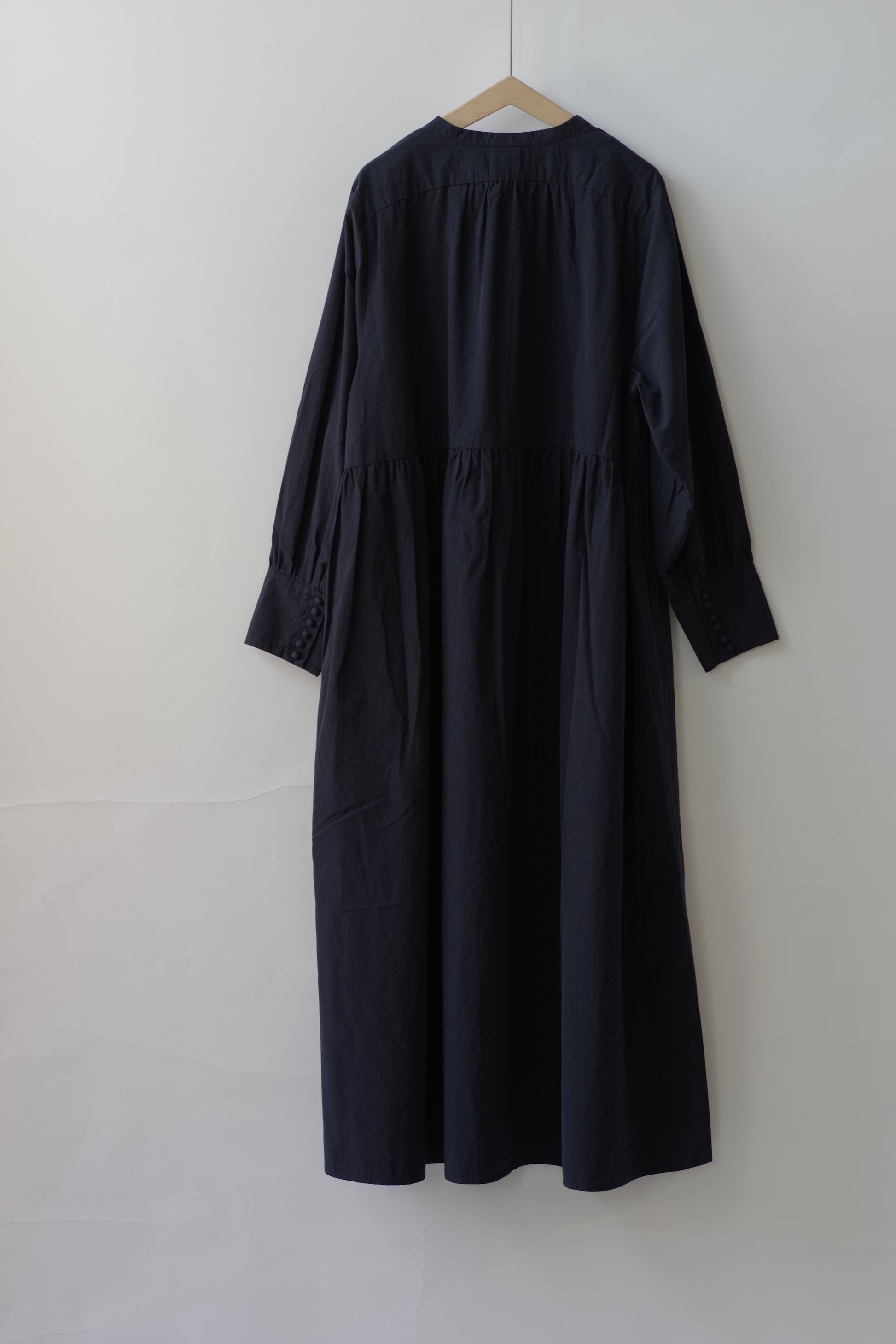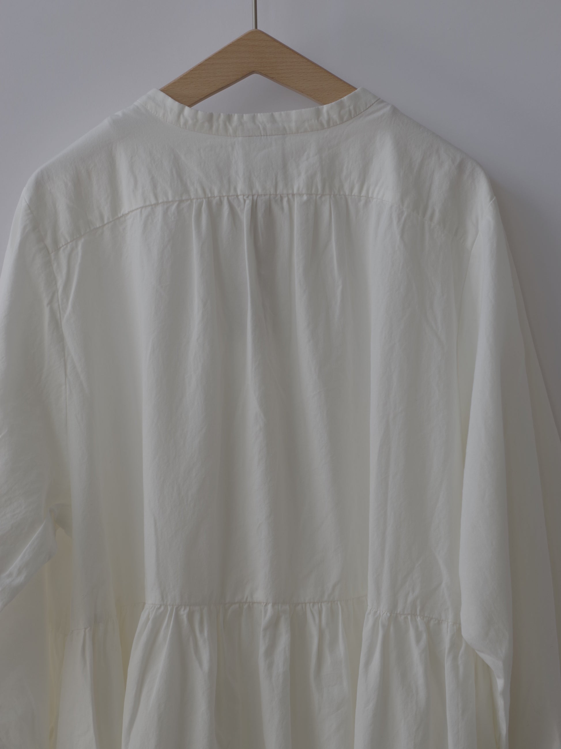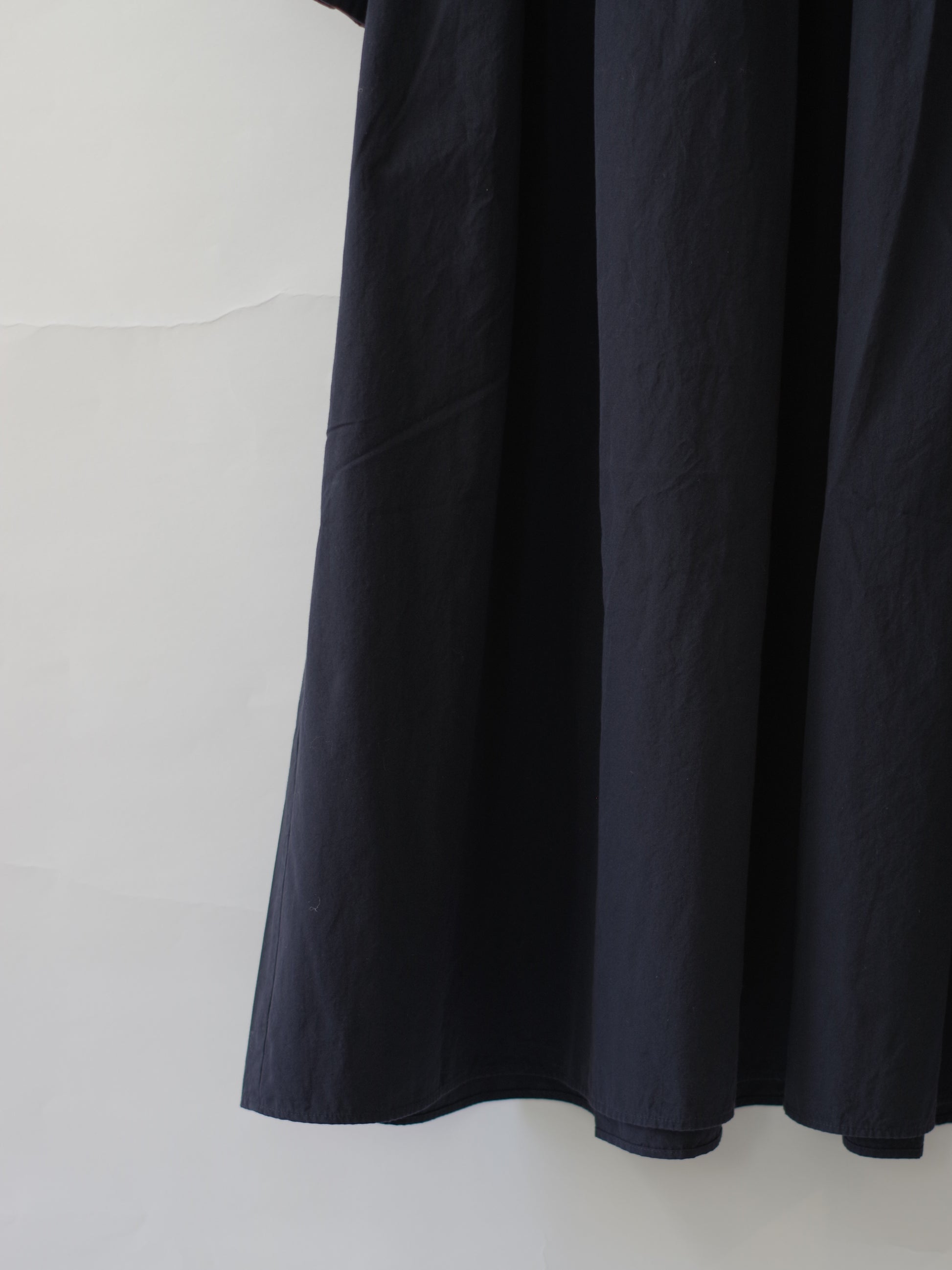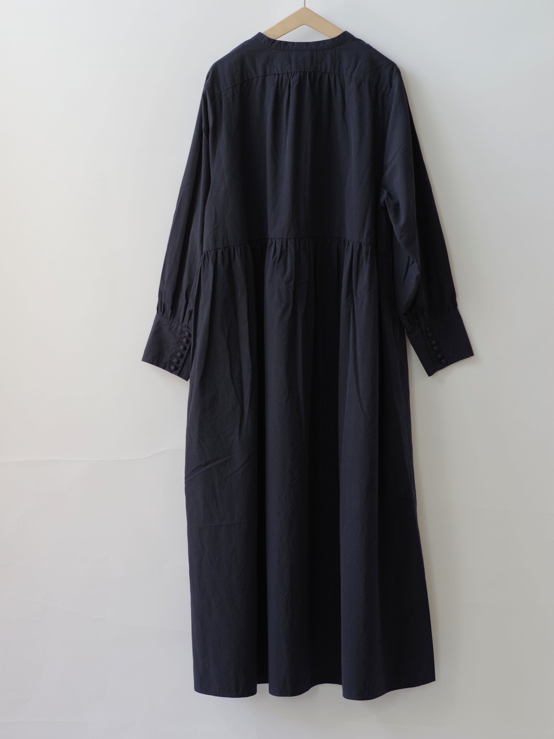 フロントのクルミボタンと袖口のギャザー、ウエストのギャザー、ウエストでの切り替えなどなど、女性らしく大人っぽい要素をバランスよく盛り込んだ一着です。