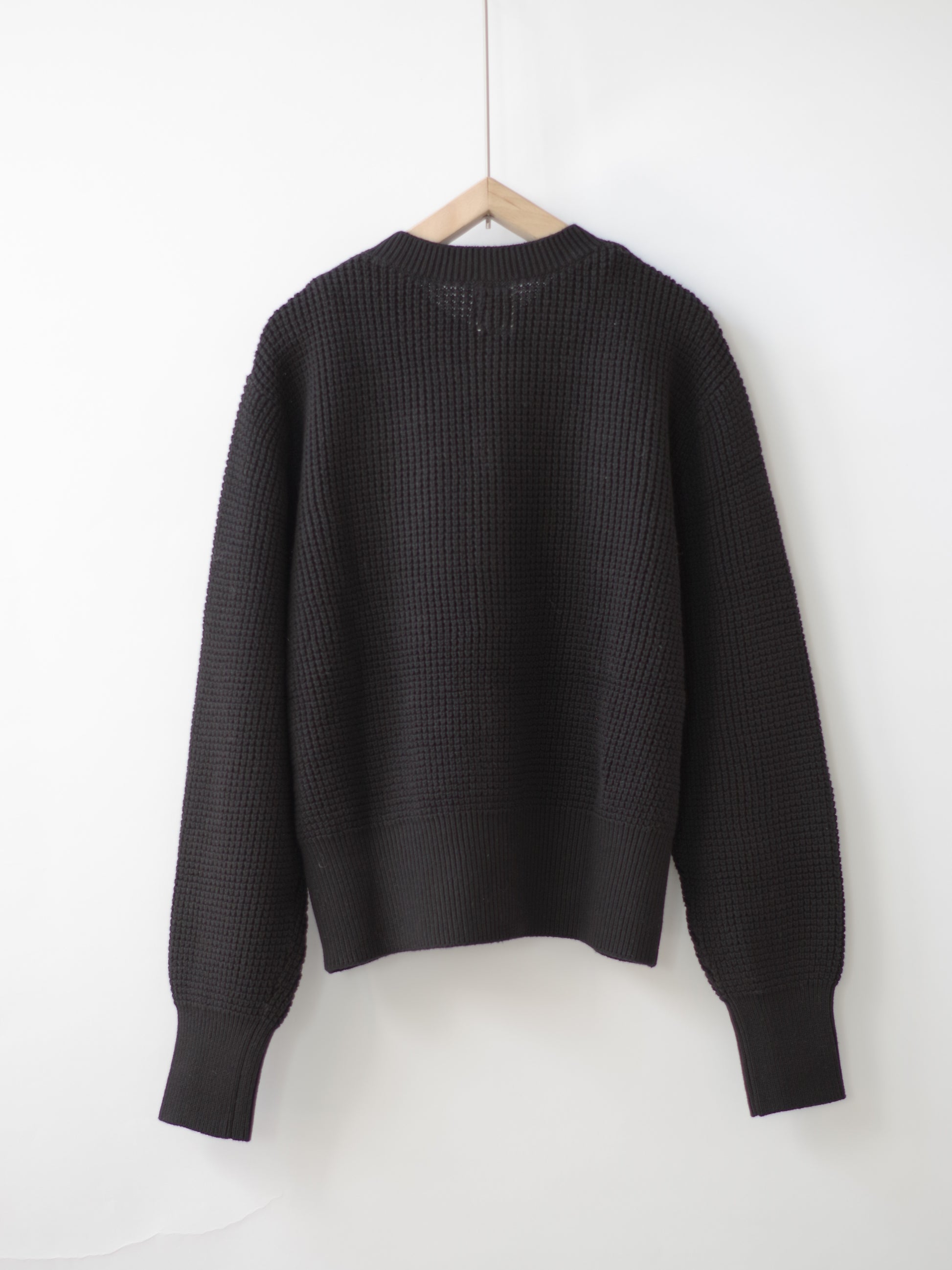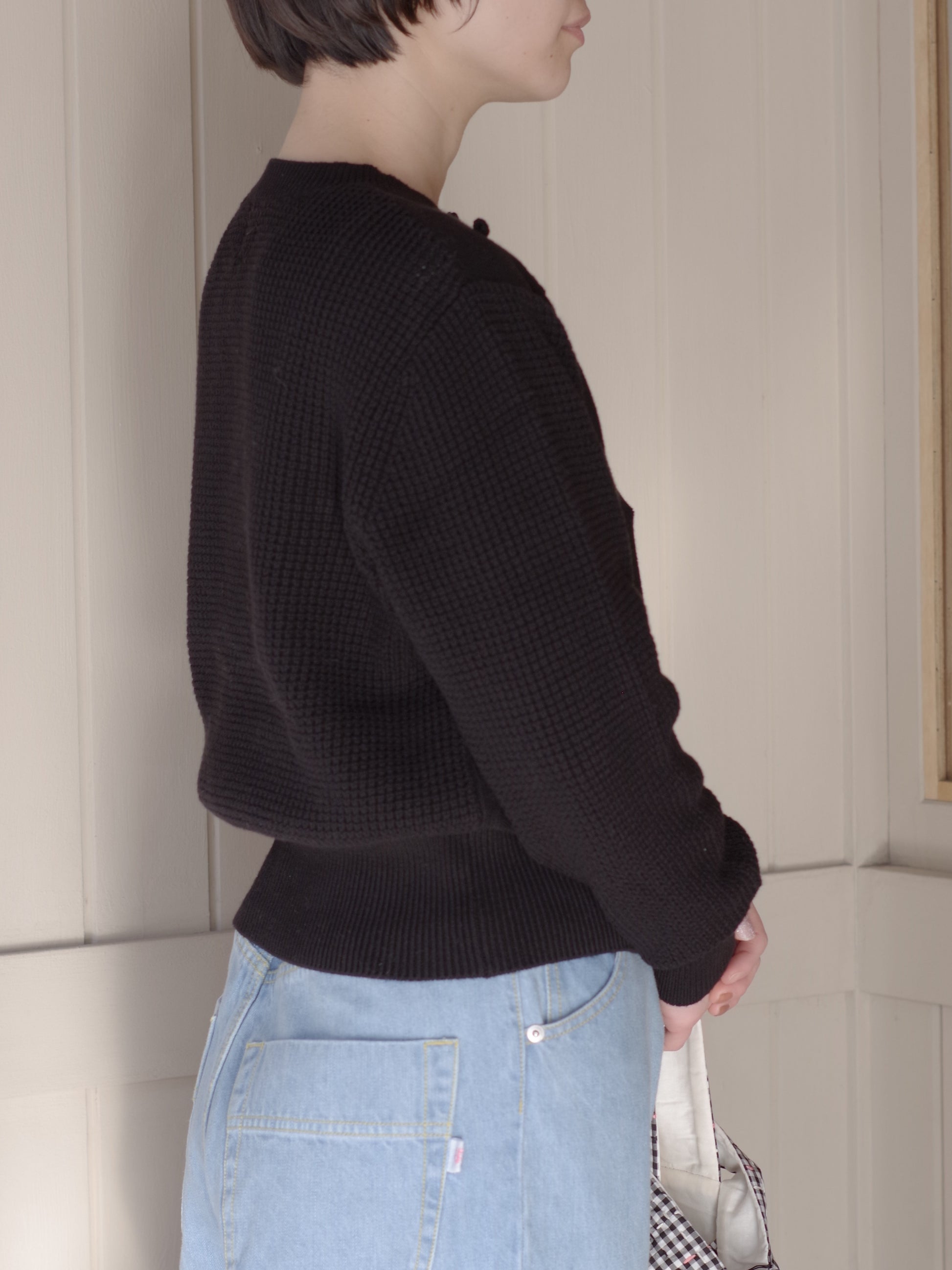 コンパクトなすっきりしたサイズ感は、ボタンを全部しめてプルオーバーとして着ても素敵です。ブランドのおすすめの着方は、potandteaボタンたくさんのトップスやフリルブラウスなどにさらっと羽織り、ボタンをあけて着ていただく着こなしもおすすめしています。