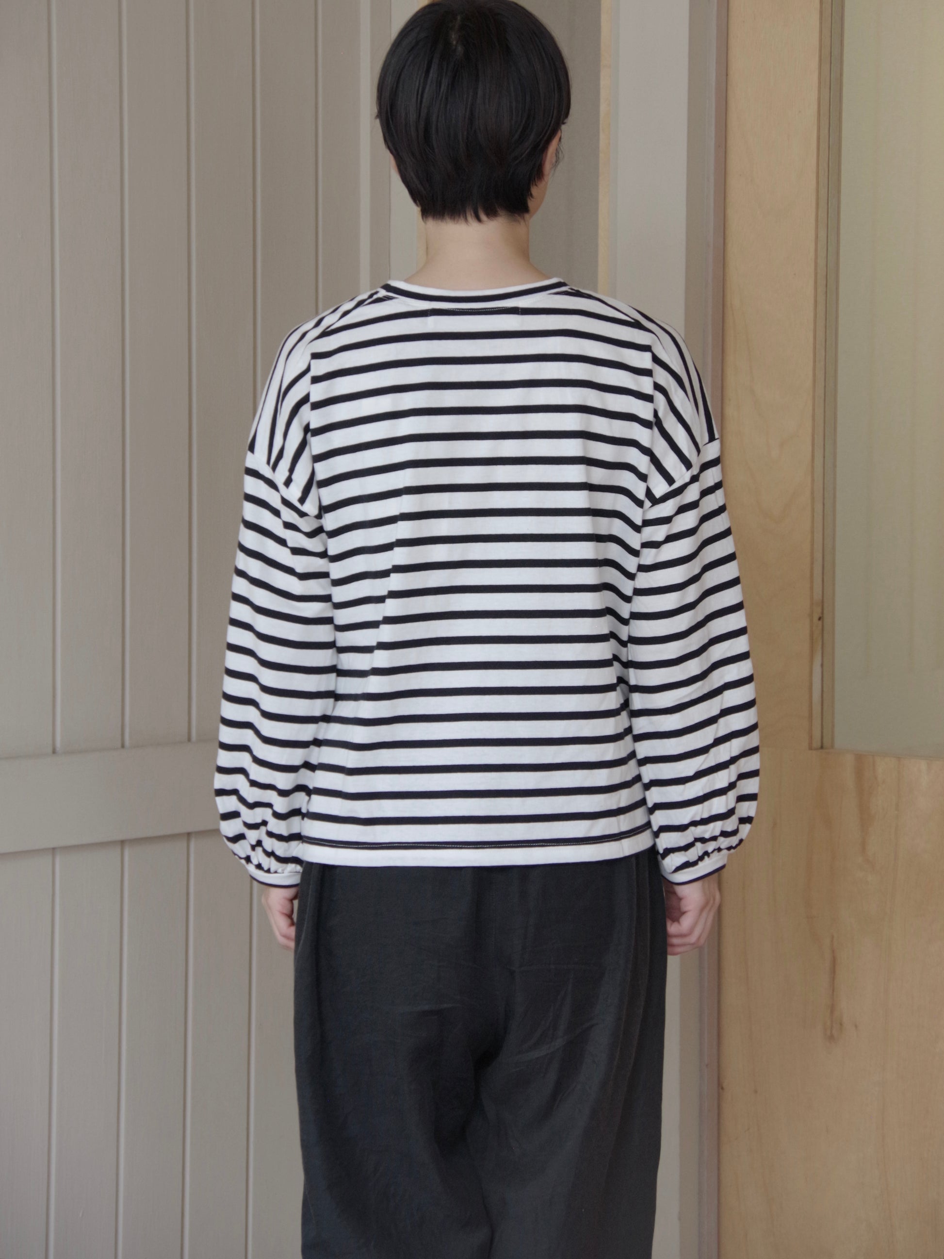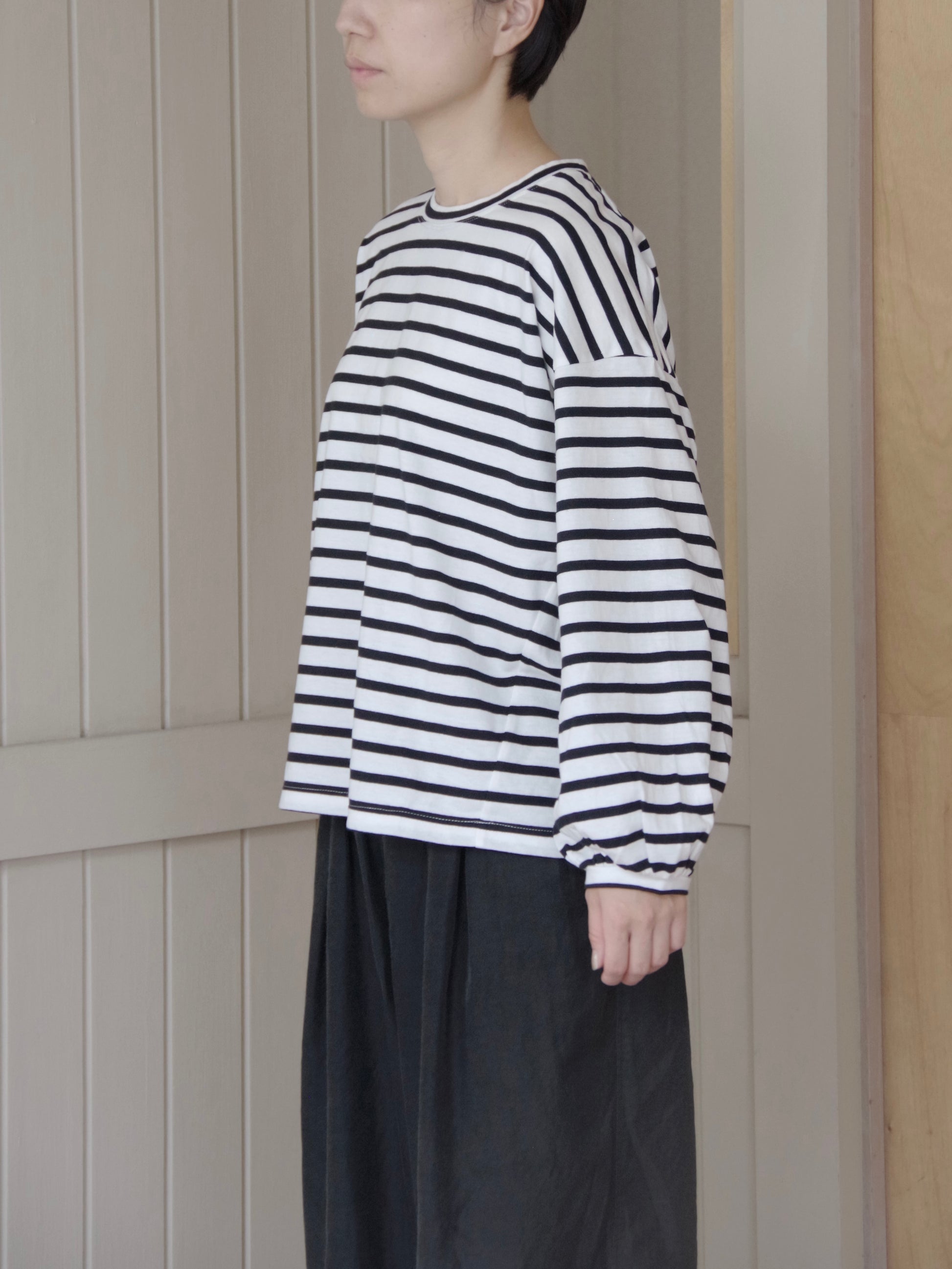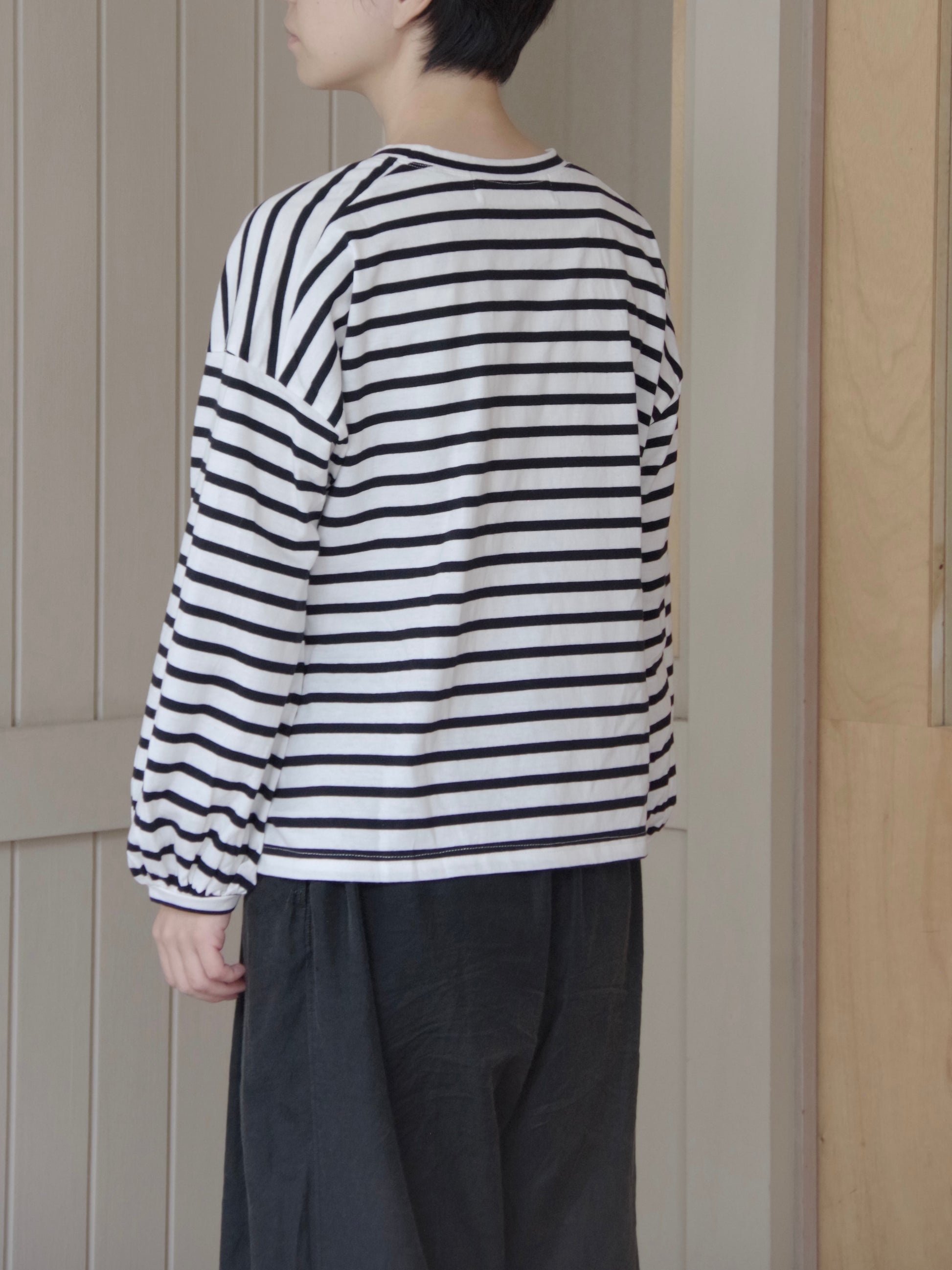 ボーダーは肉感が薄めのカットソー生地。ボーダーのクロラインの中心を襟元に合わせたり、袖口の端をクロボーダーに合わせたり、細かなこだわりが入っております。