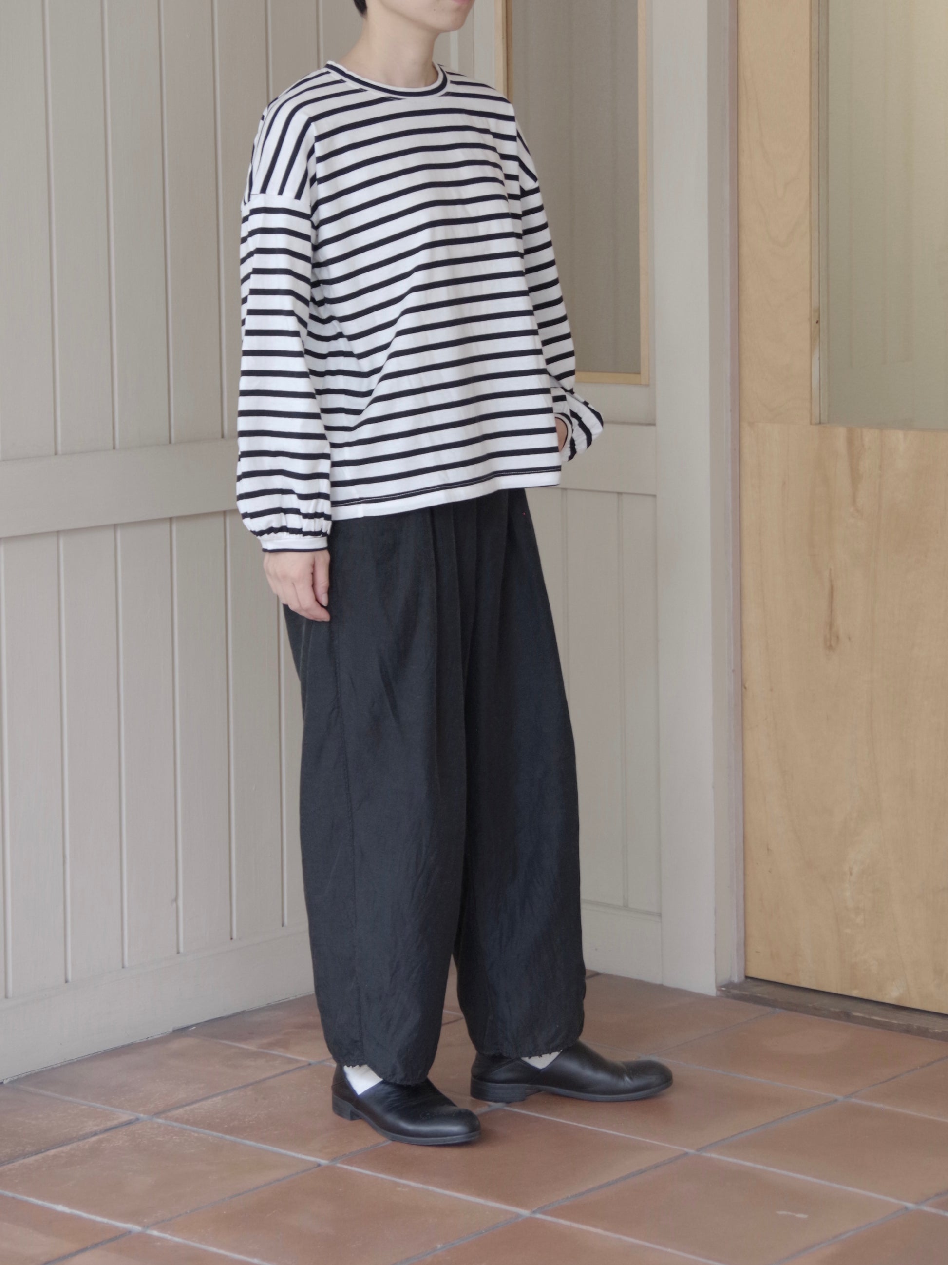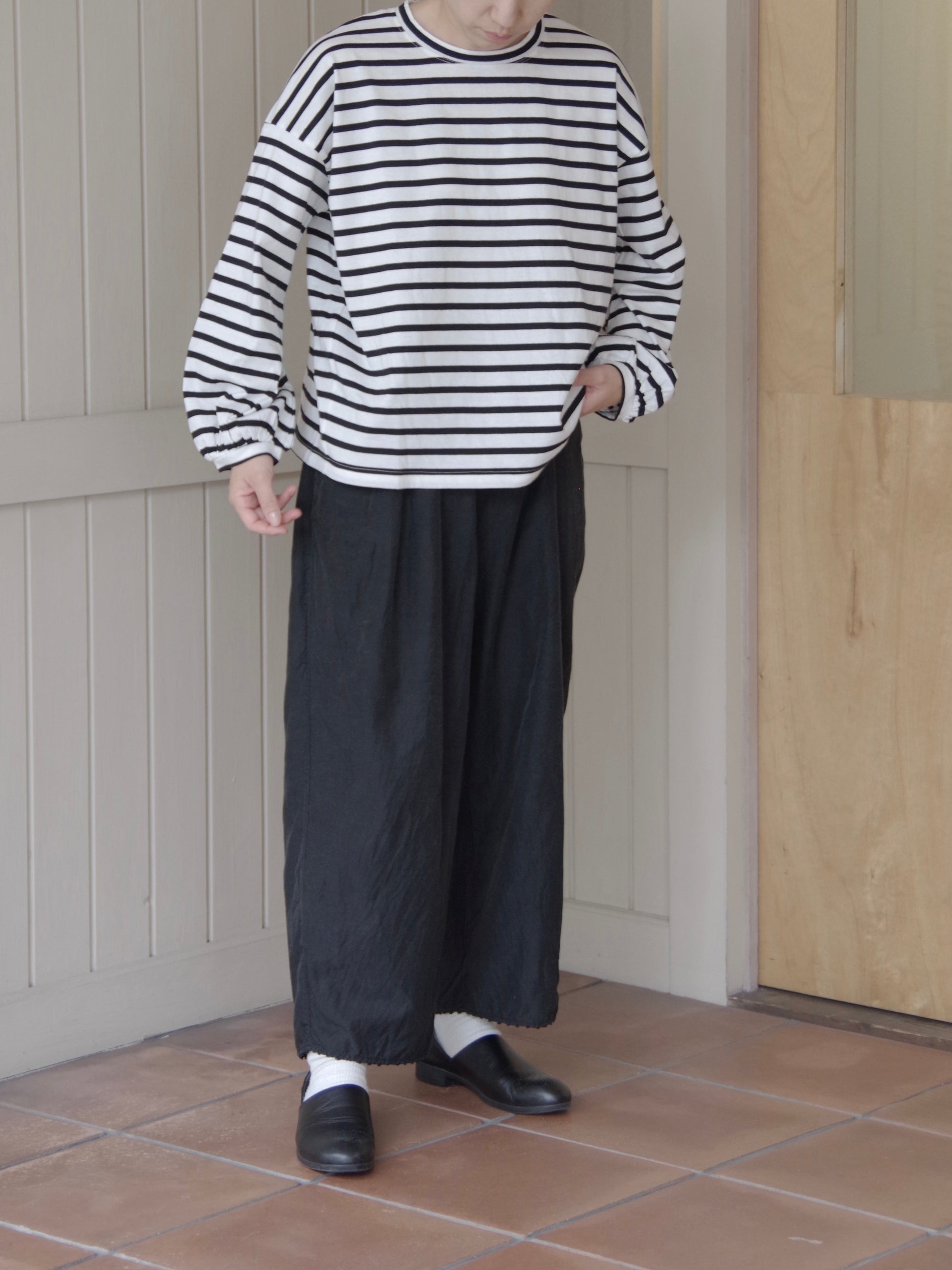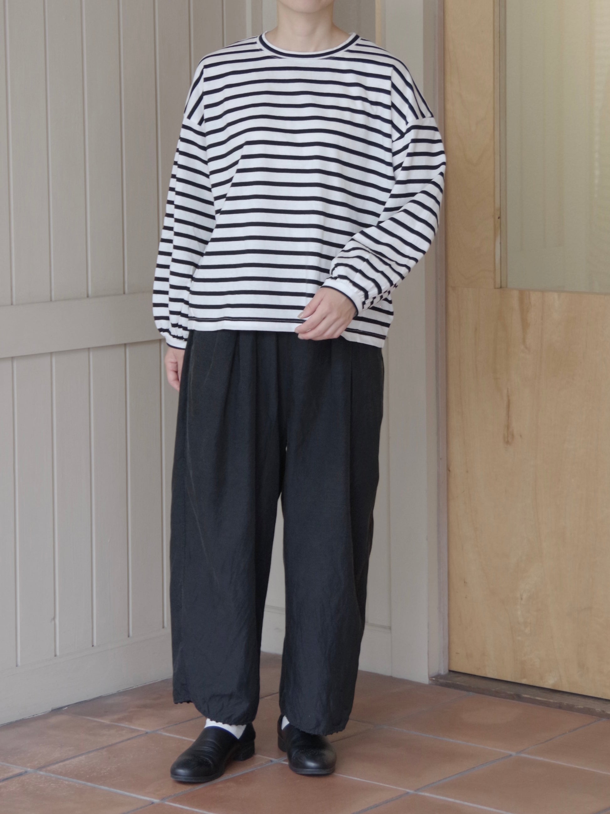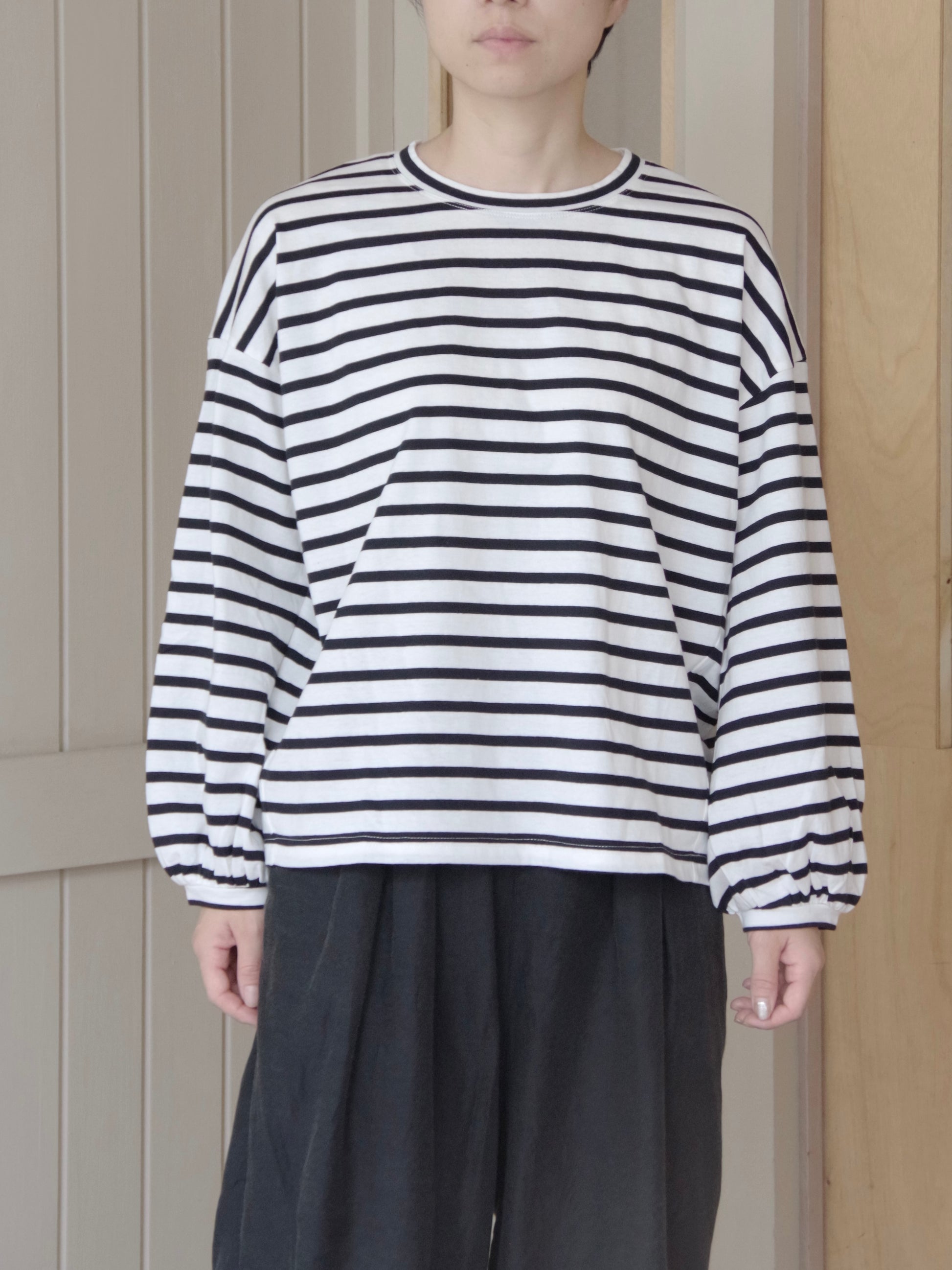 ボーダーは肉感が薄めのカットソー生地。ボーダーのクロラインの中心を襟元に合わせたり、袖口の端をクロボーダーに合わせたり、細かなこだわりが入っております。