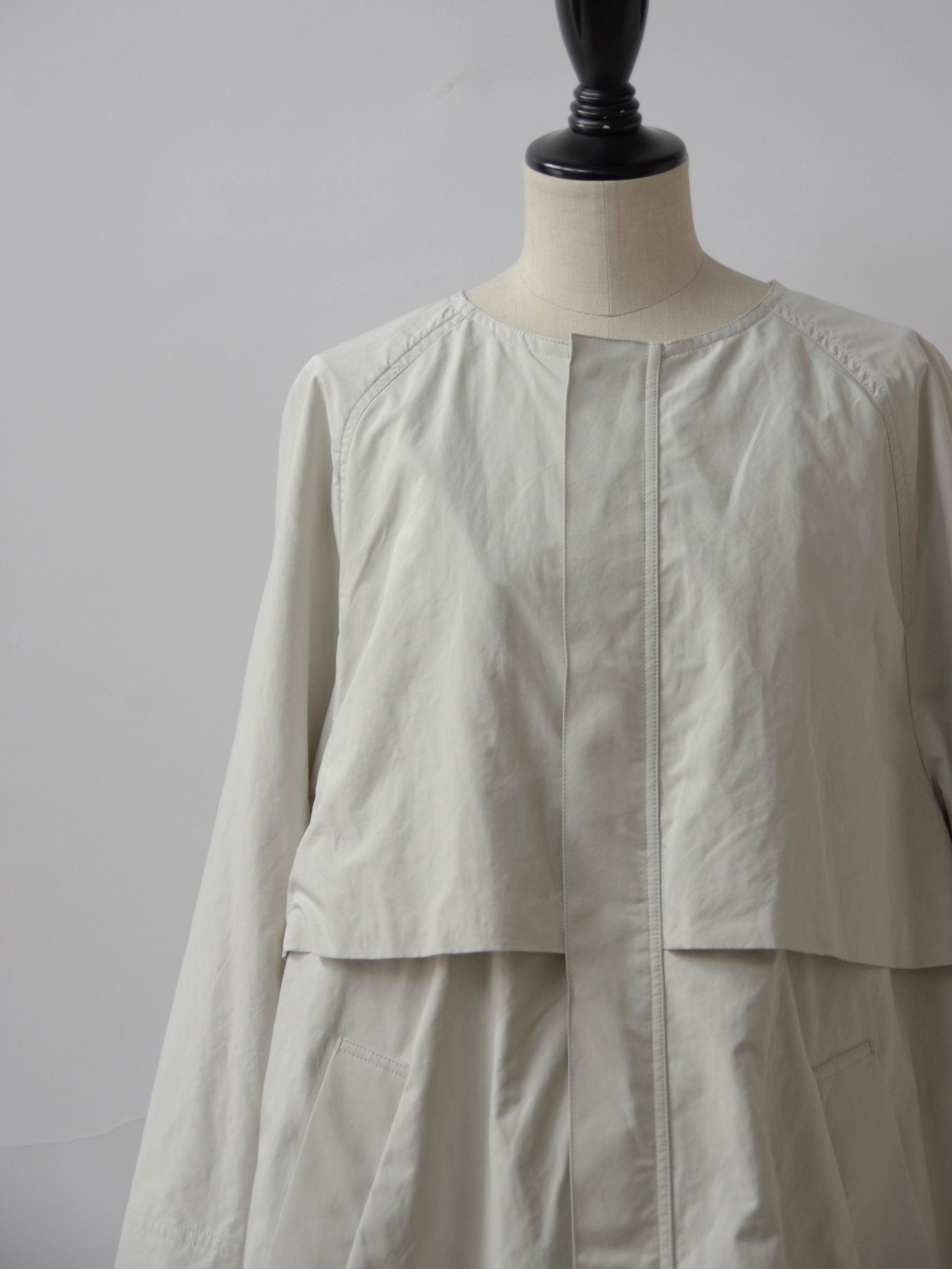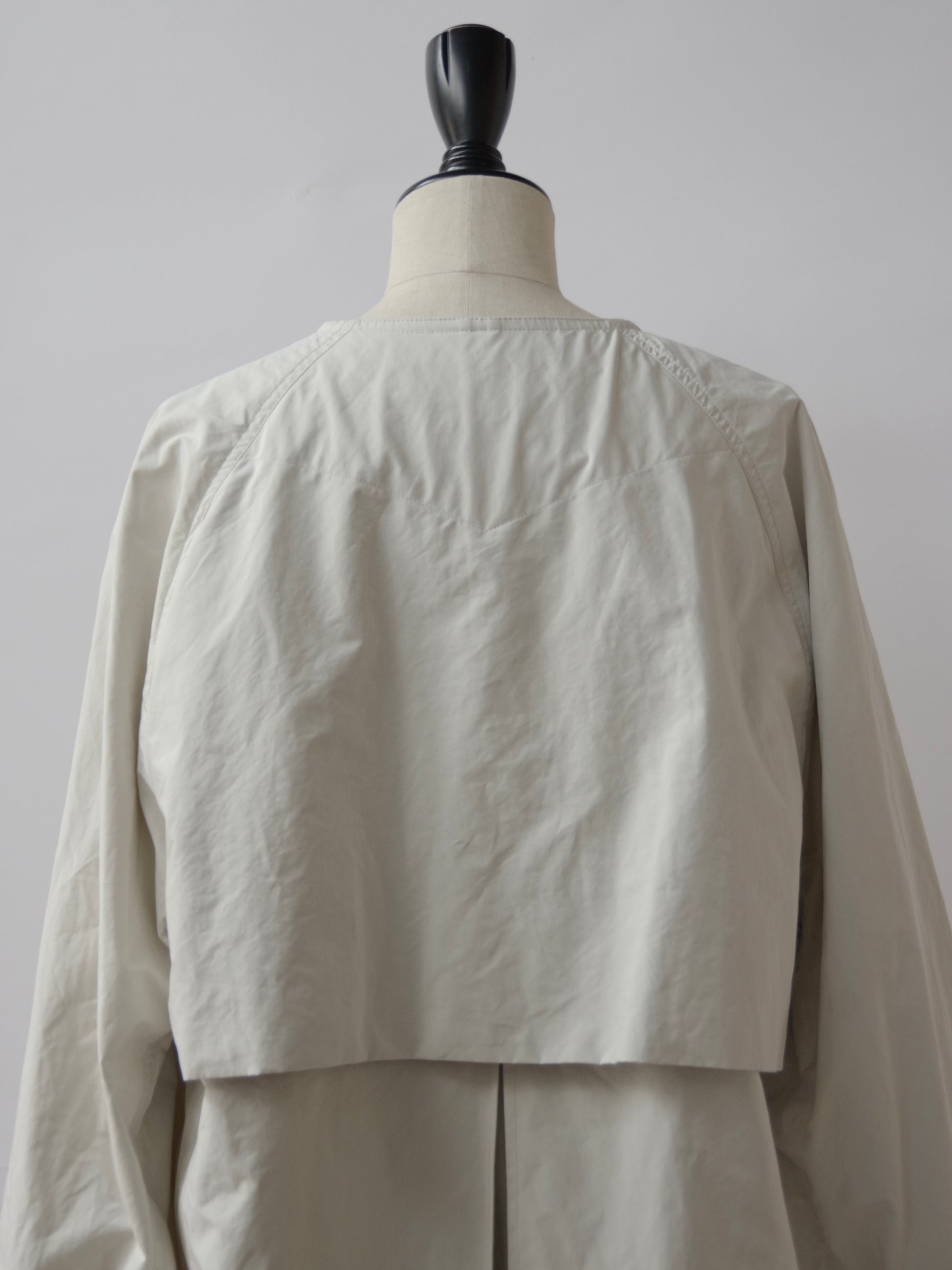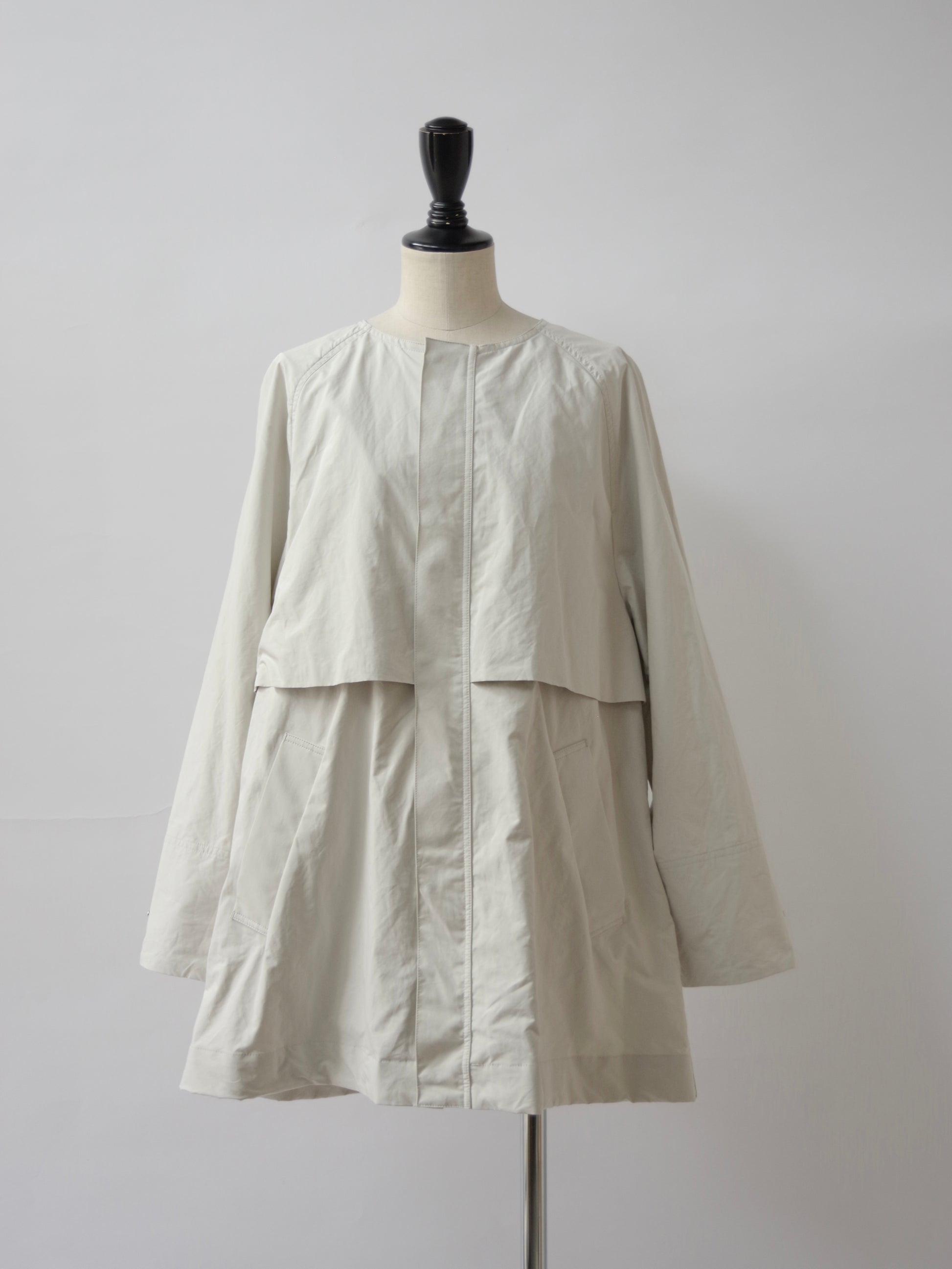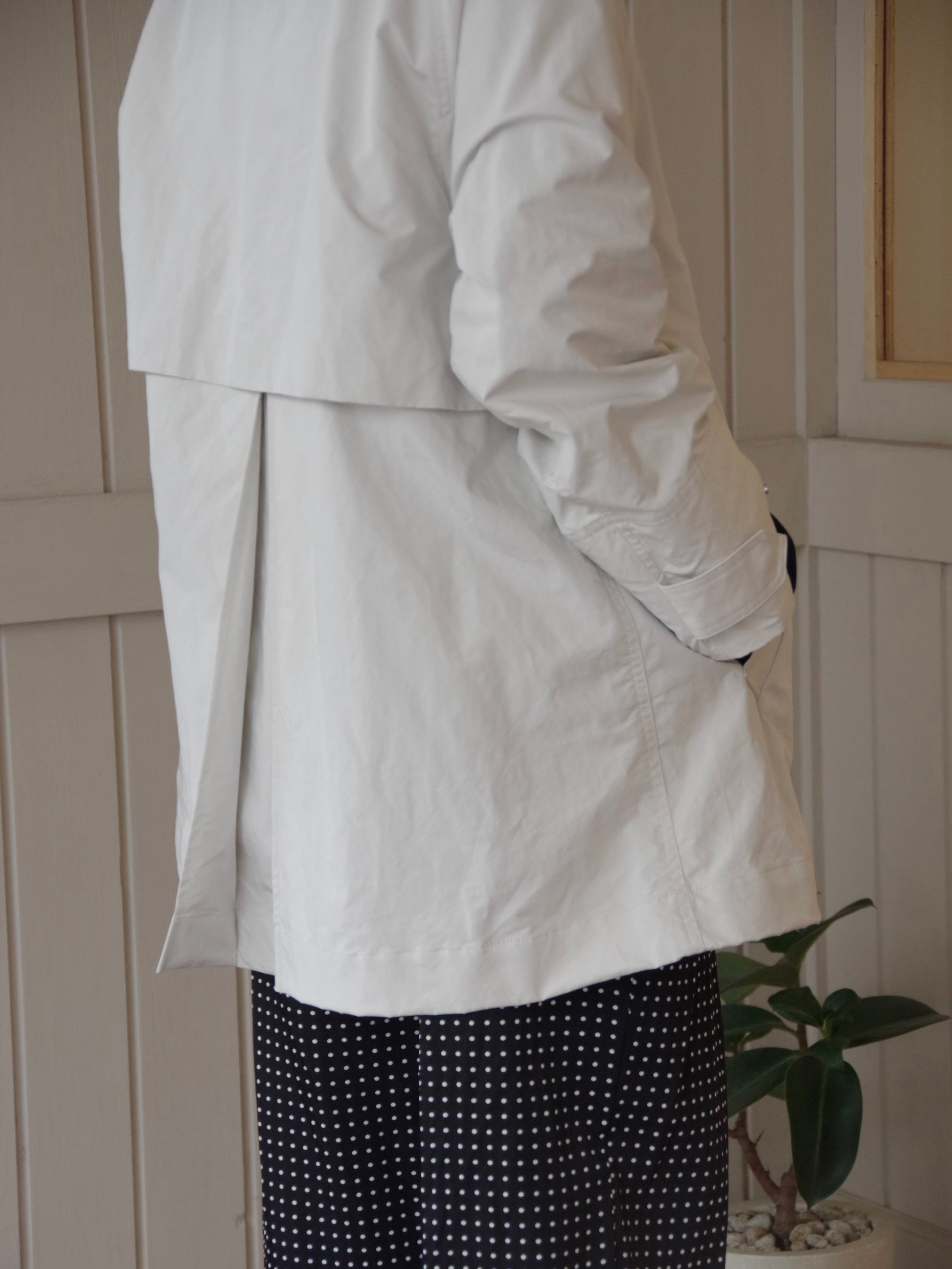 ノーカラーですっきりした襟元、ミドル丈のでつつみこむように防寒性もあるアウターです。ヨークデザインや、背中のタックデザイン。