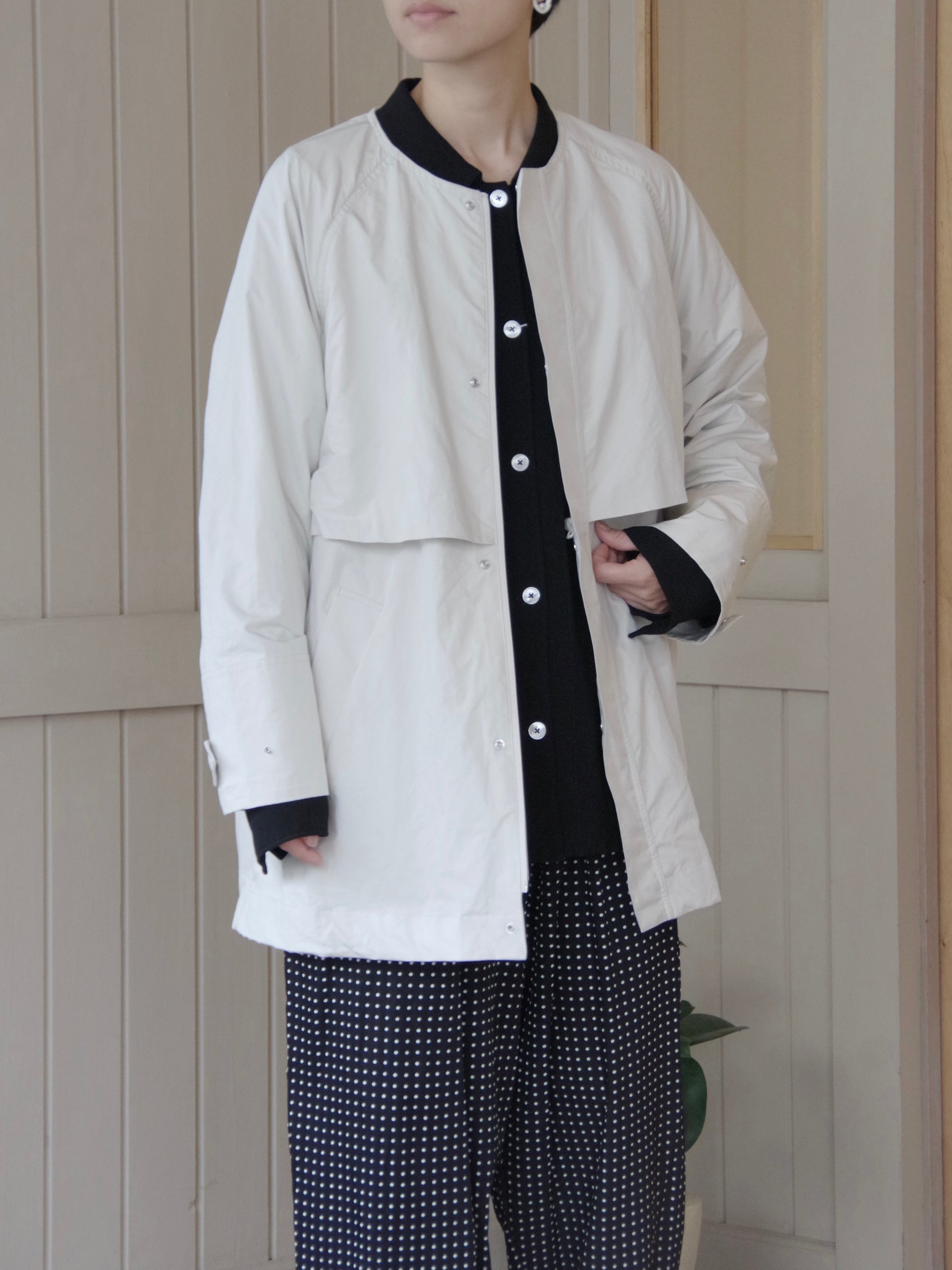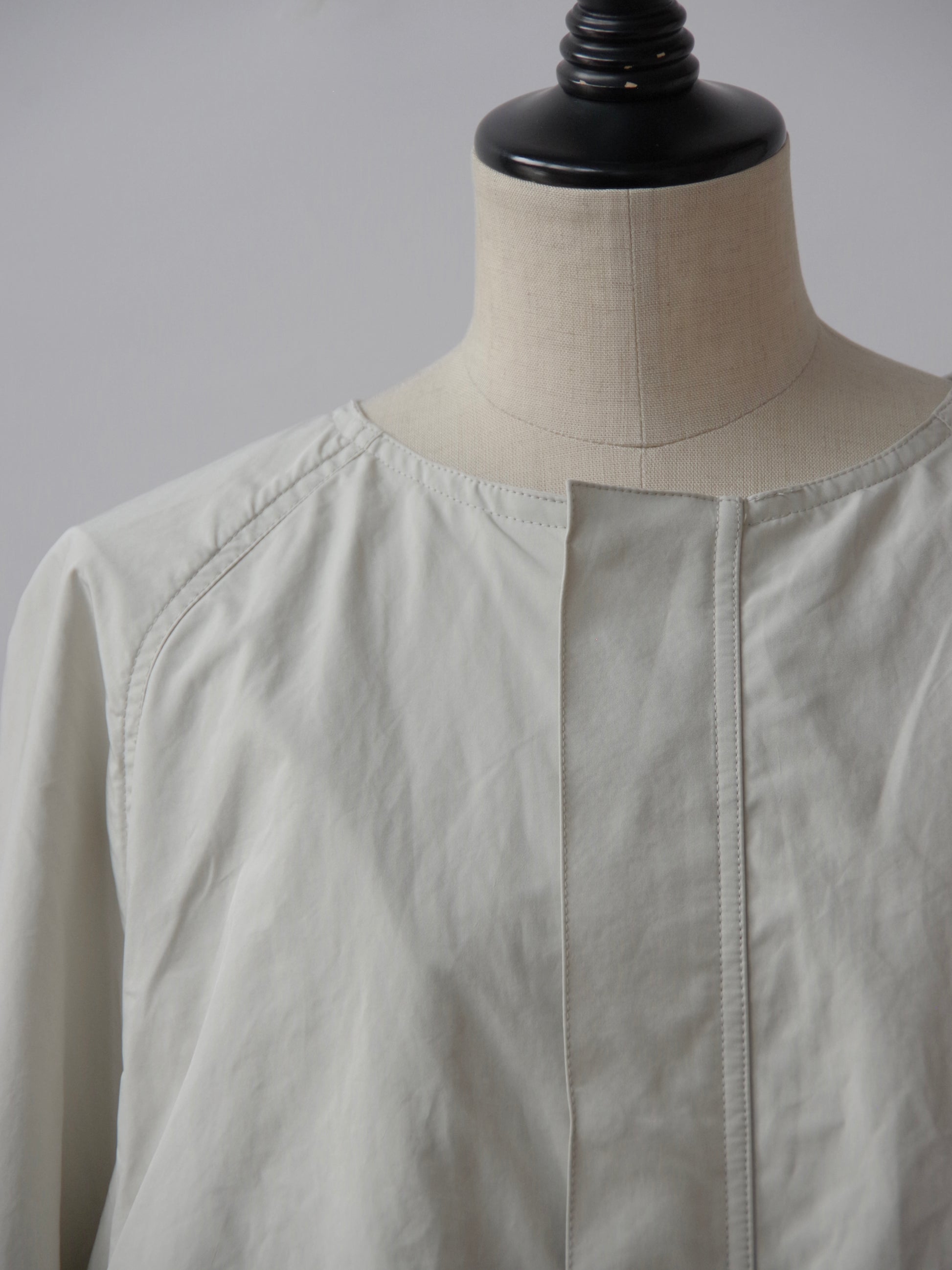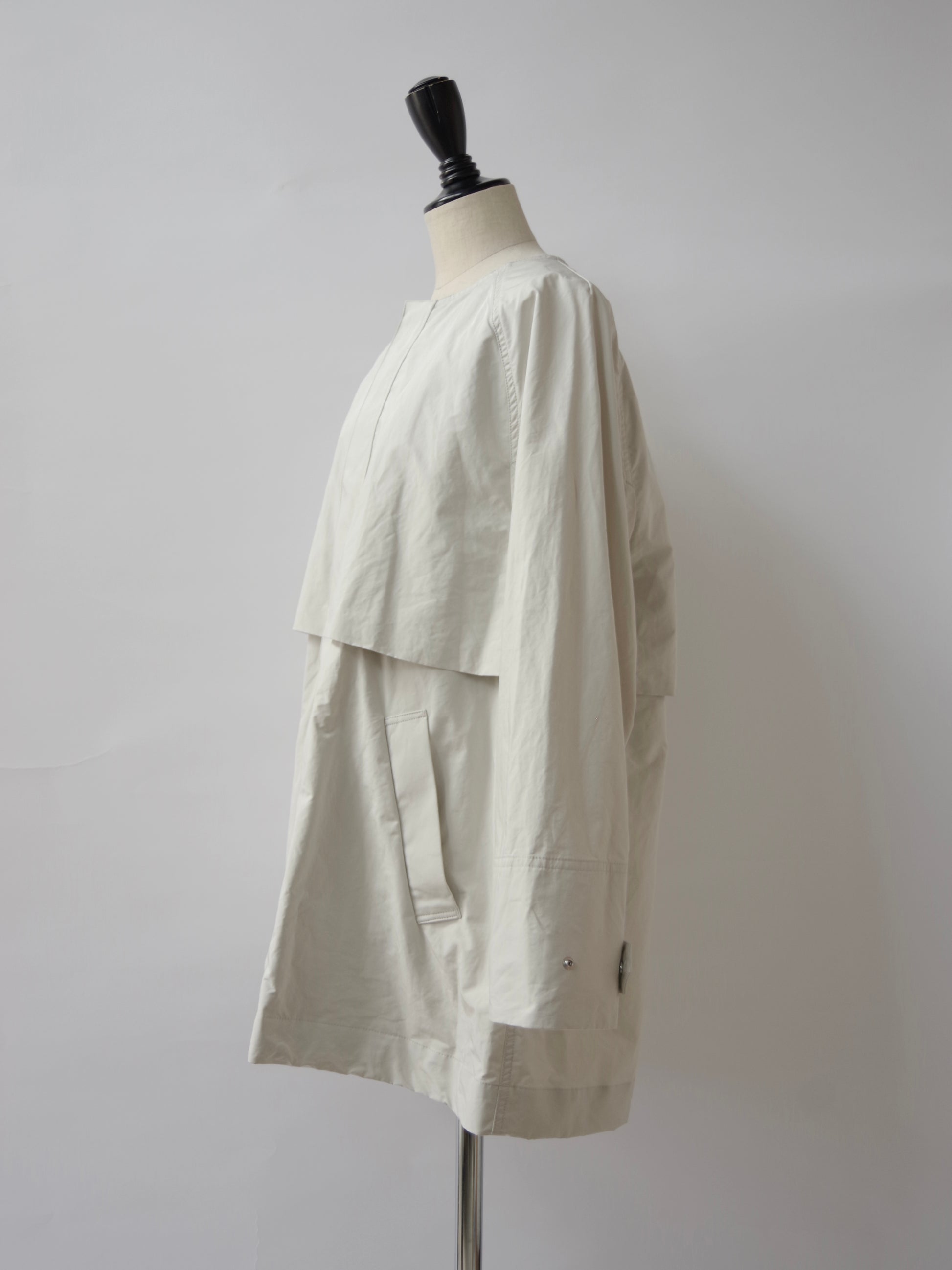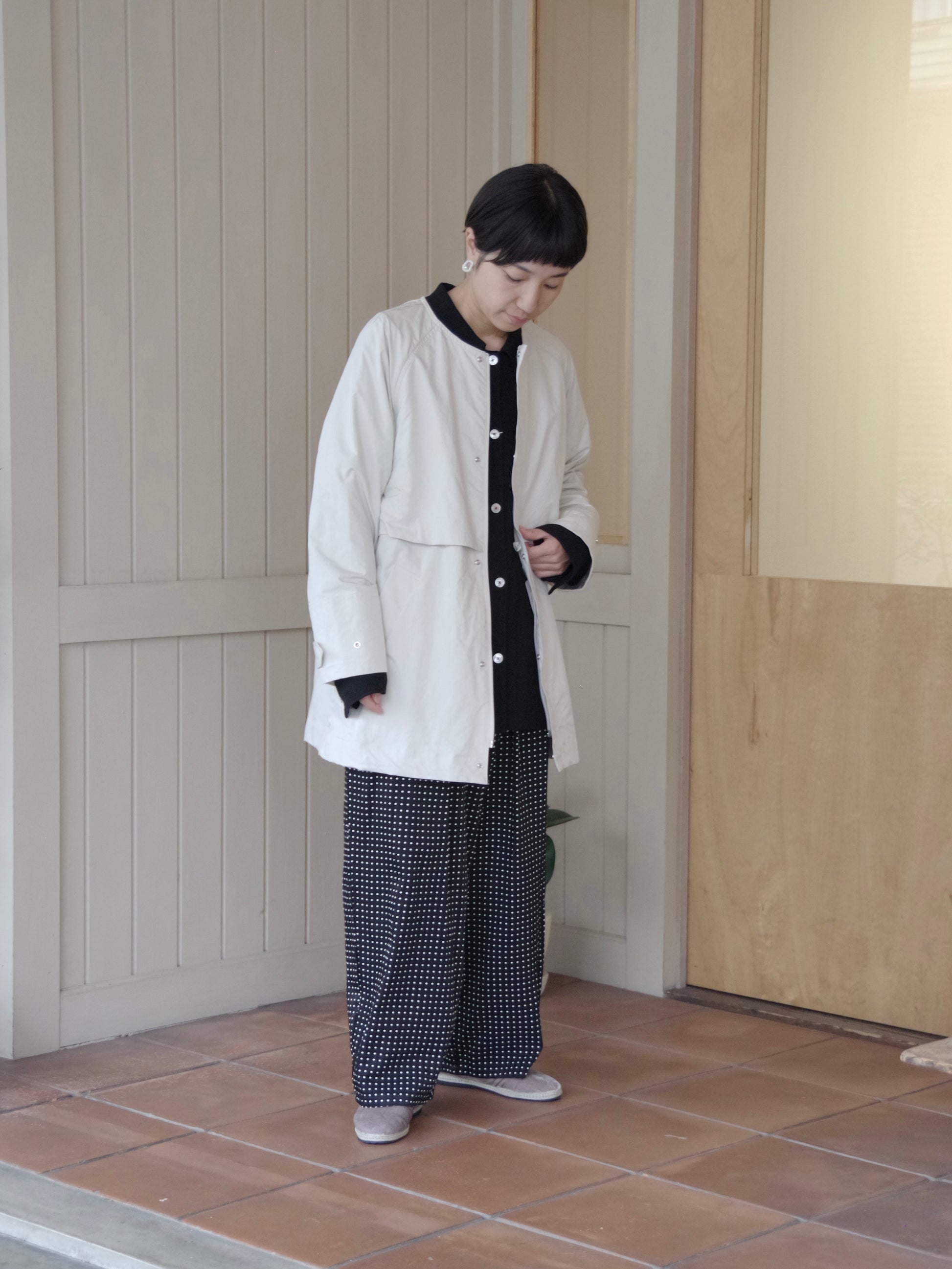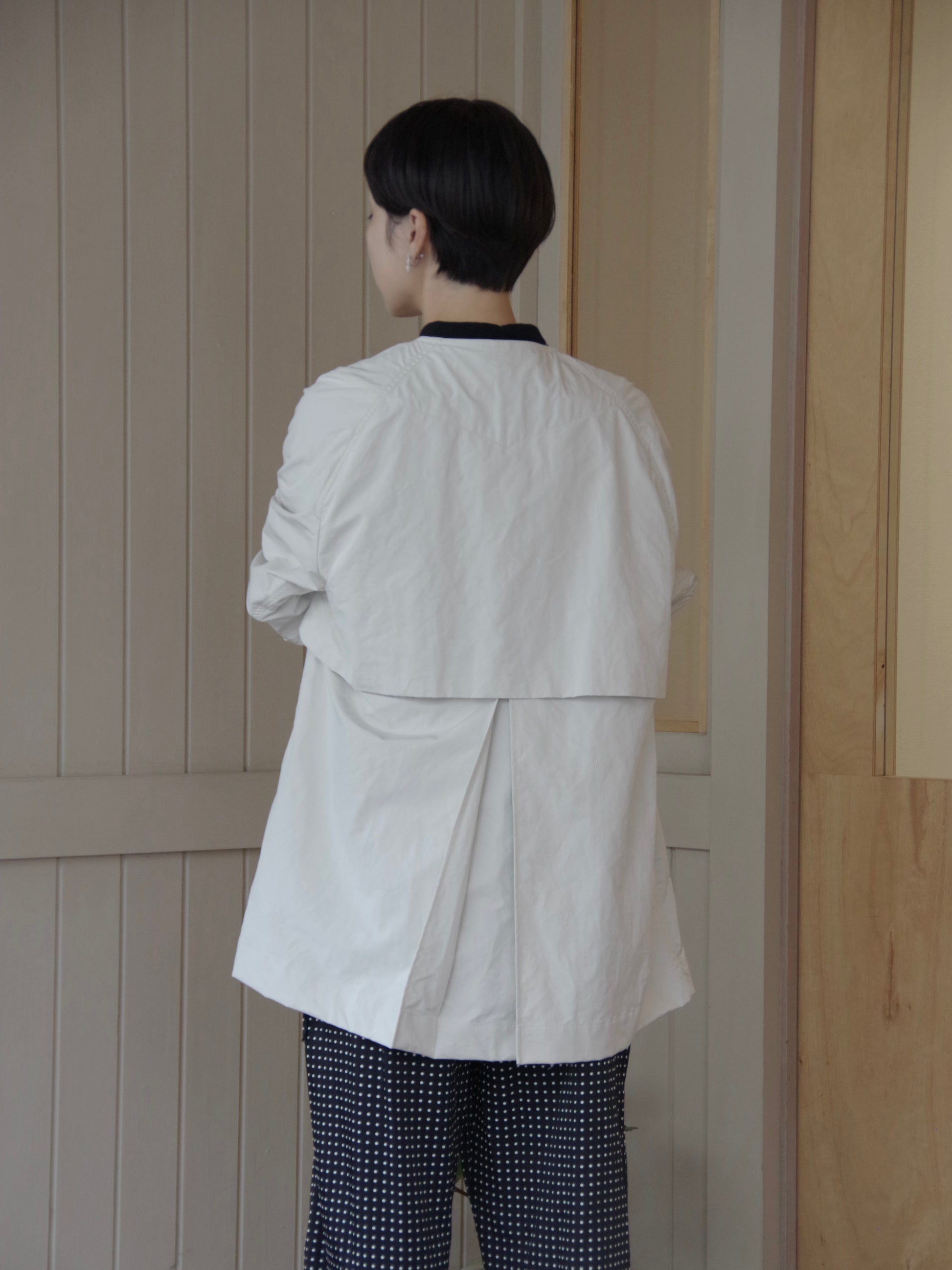 ノーカラーですっきりした襟元、ミドル丈のでつつみこむように防寒性もあるアウターです。ヨークデザインや、背中のタックデザイン。