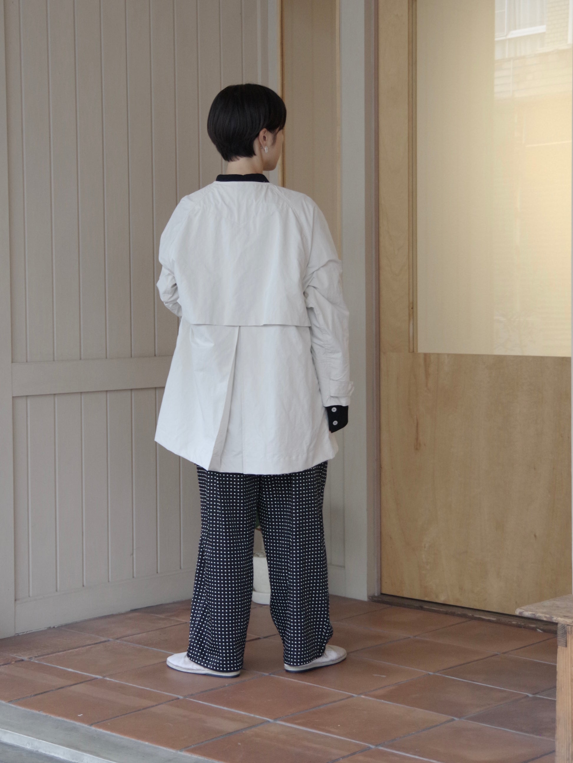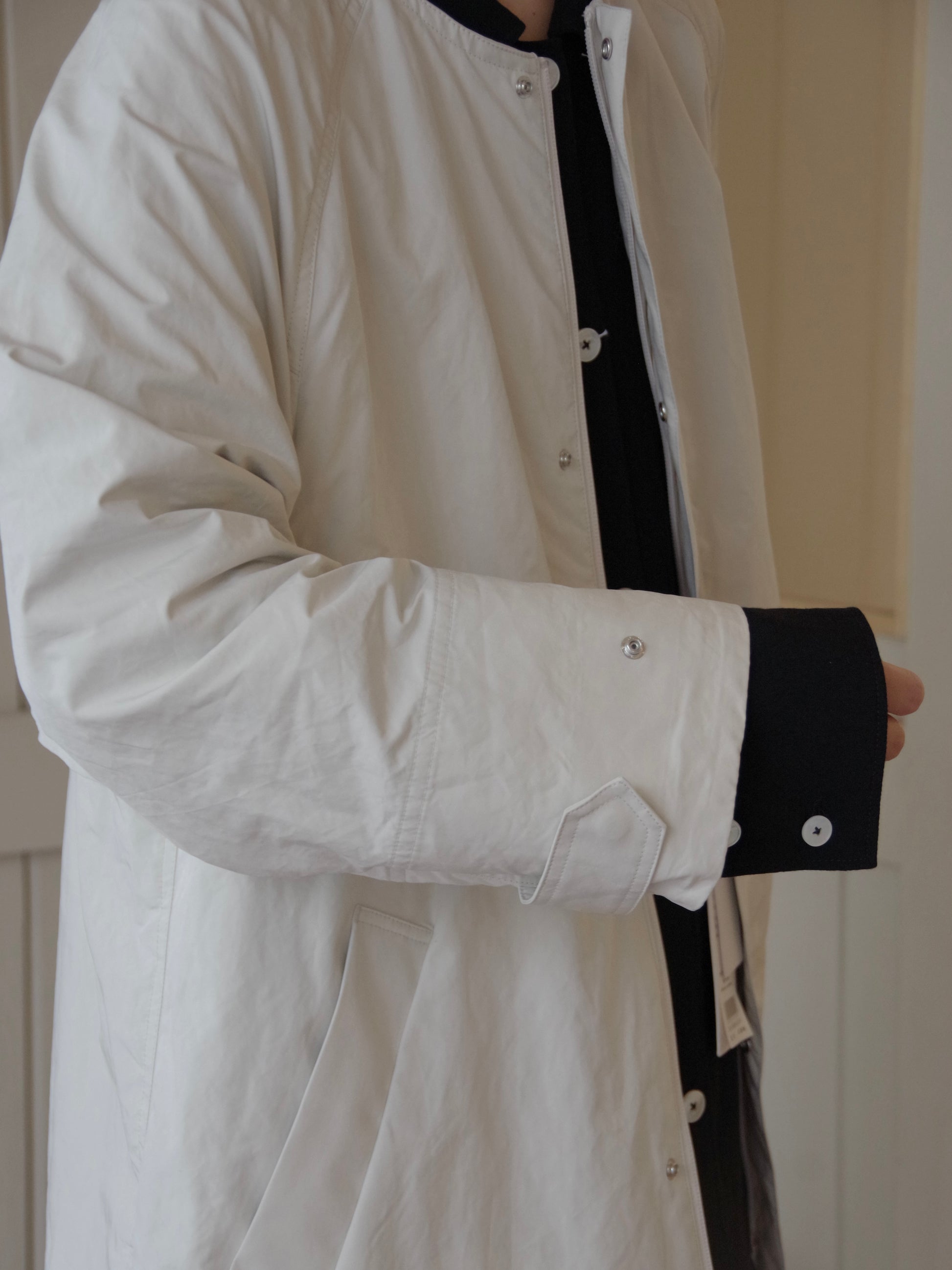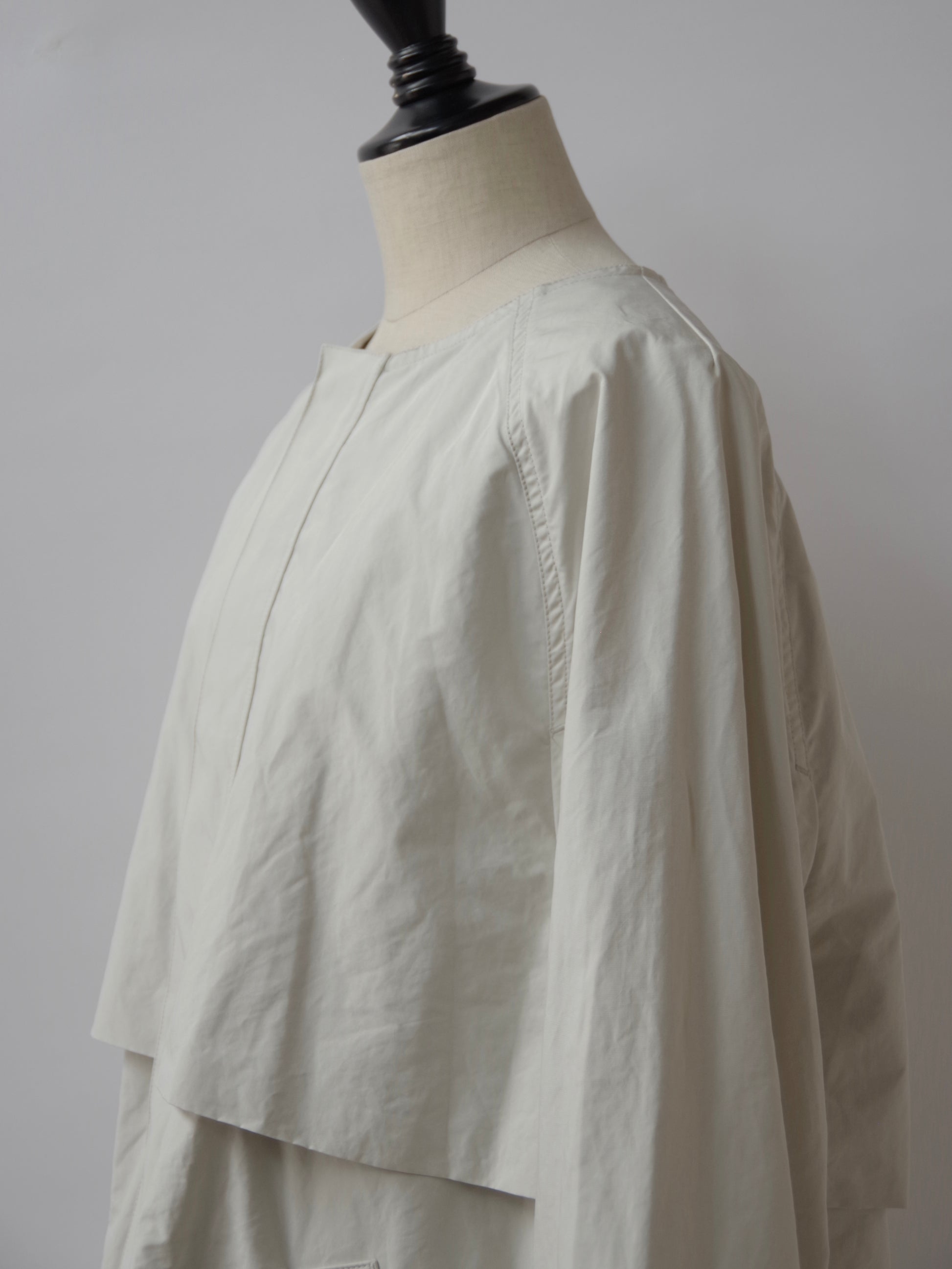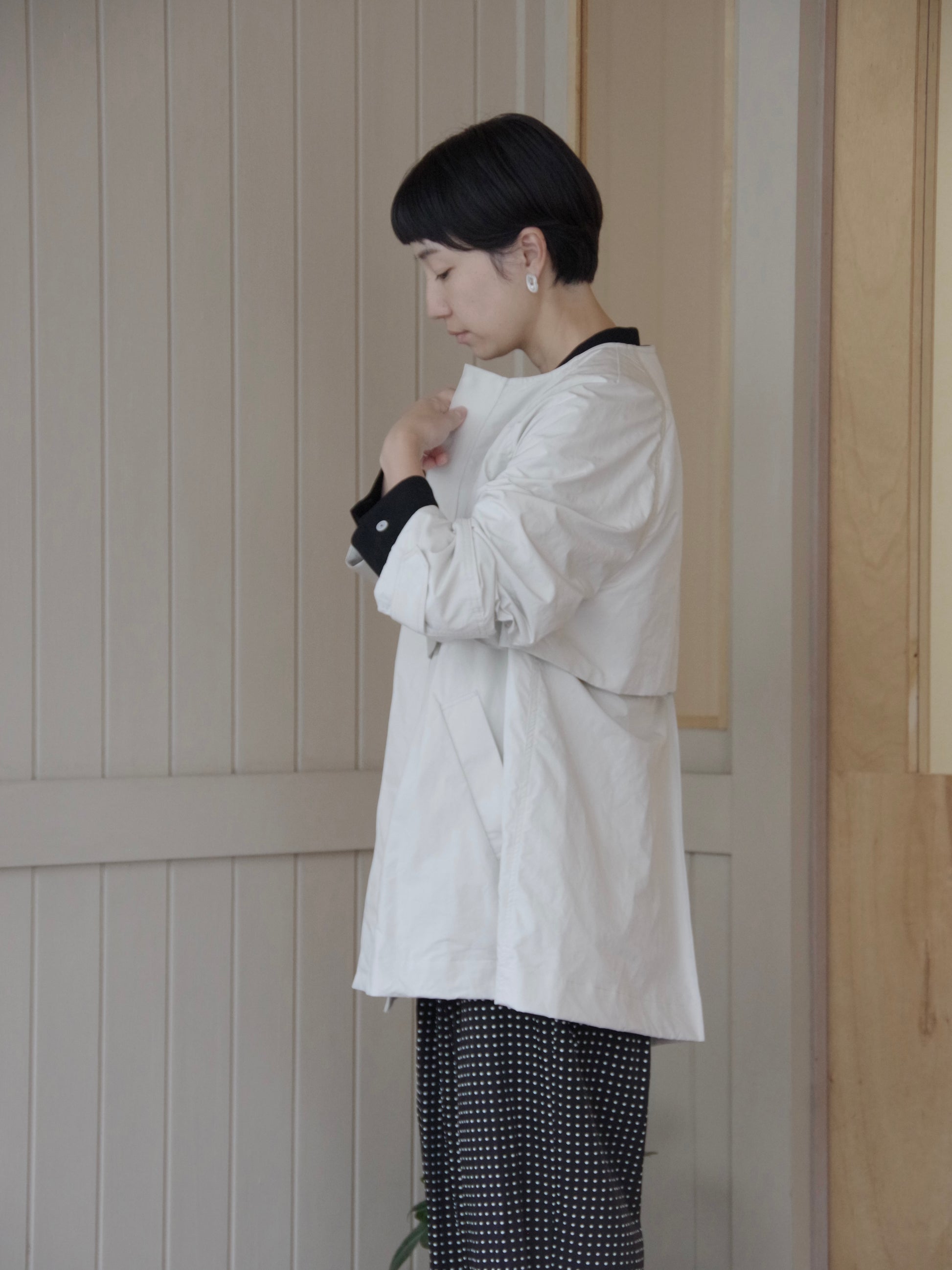 ノーカラーですっきりした襟元、ミドル丈のでつつみこむように防寒性もあるアウターです。ヨークデザインや、背中のタックデザイン。