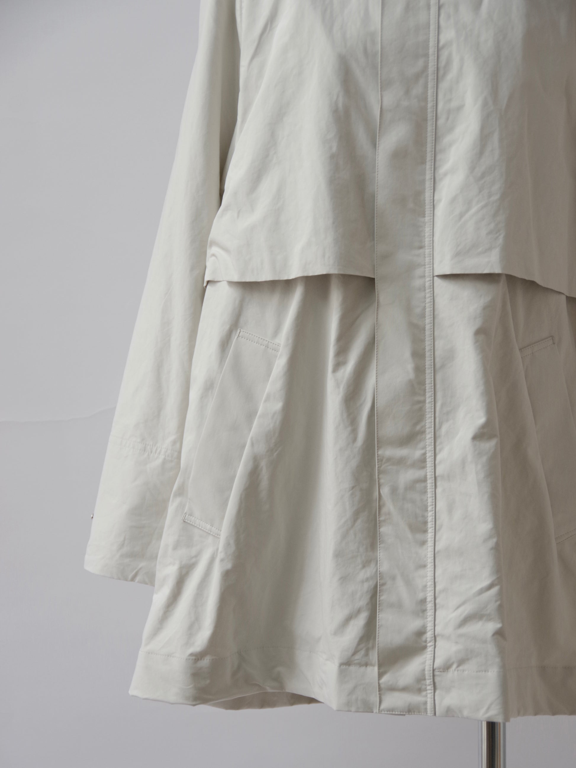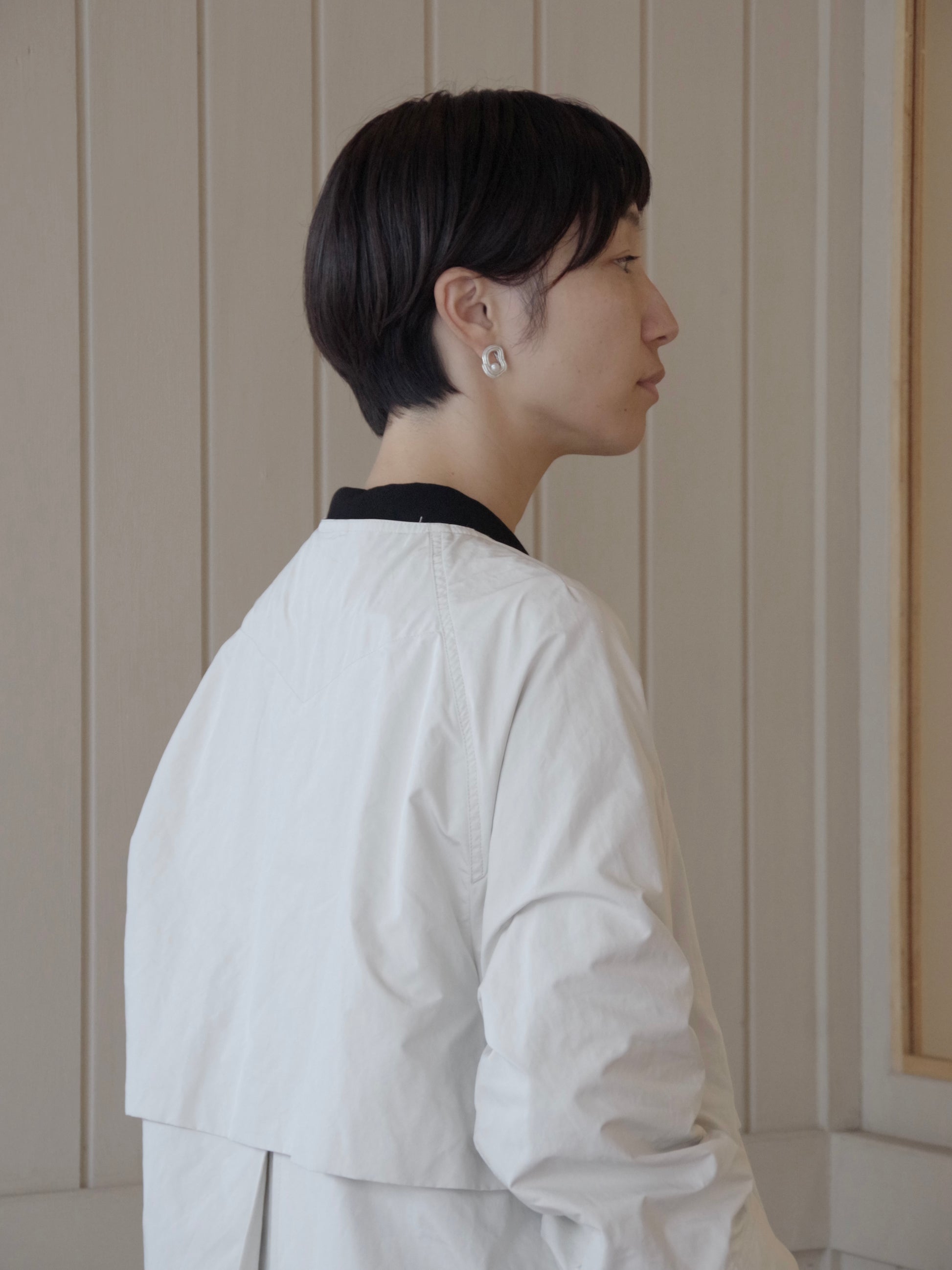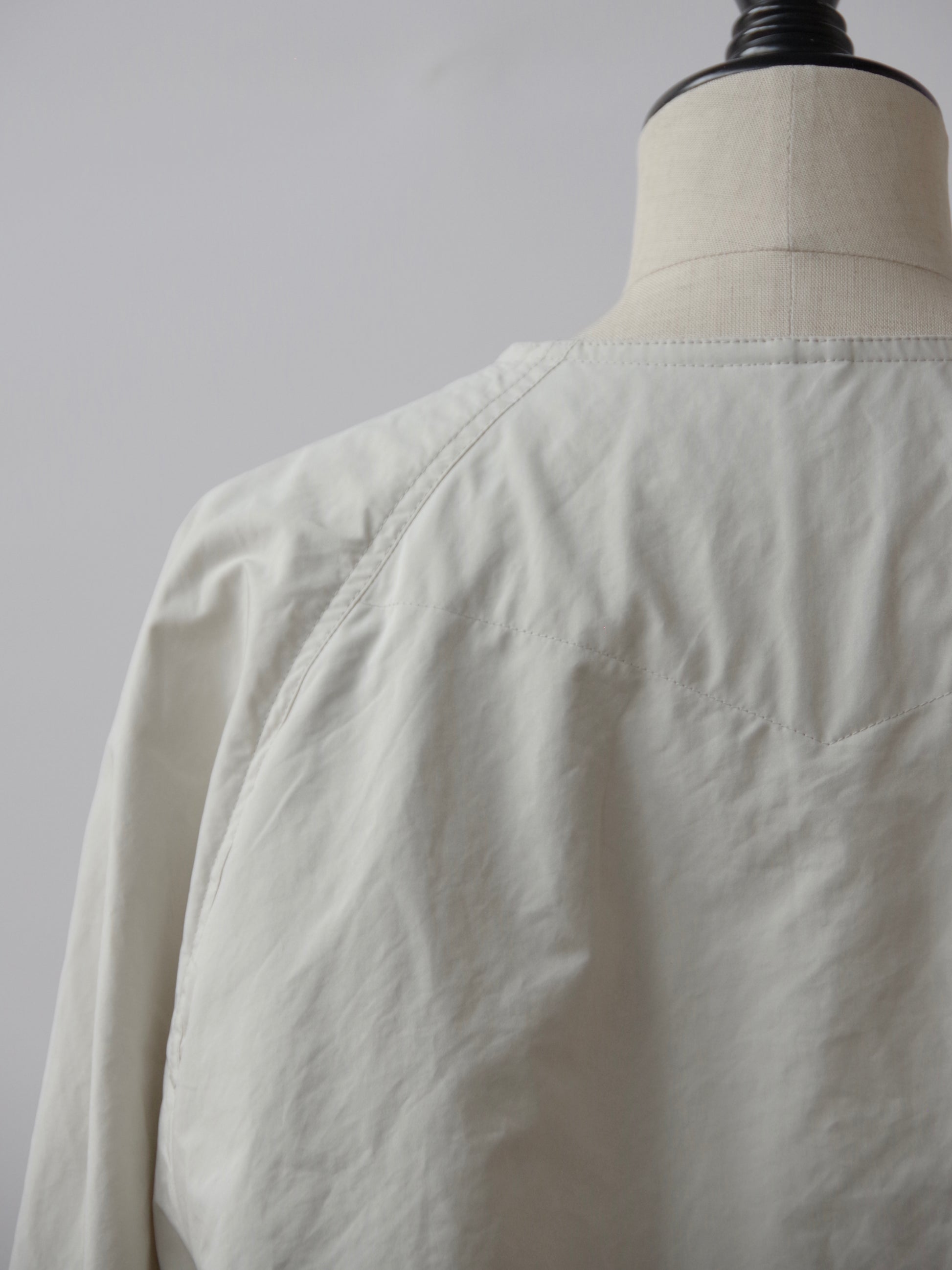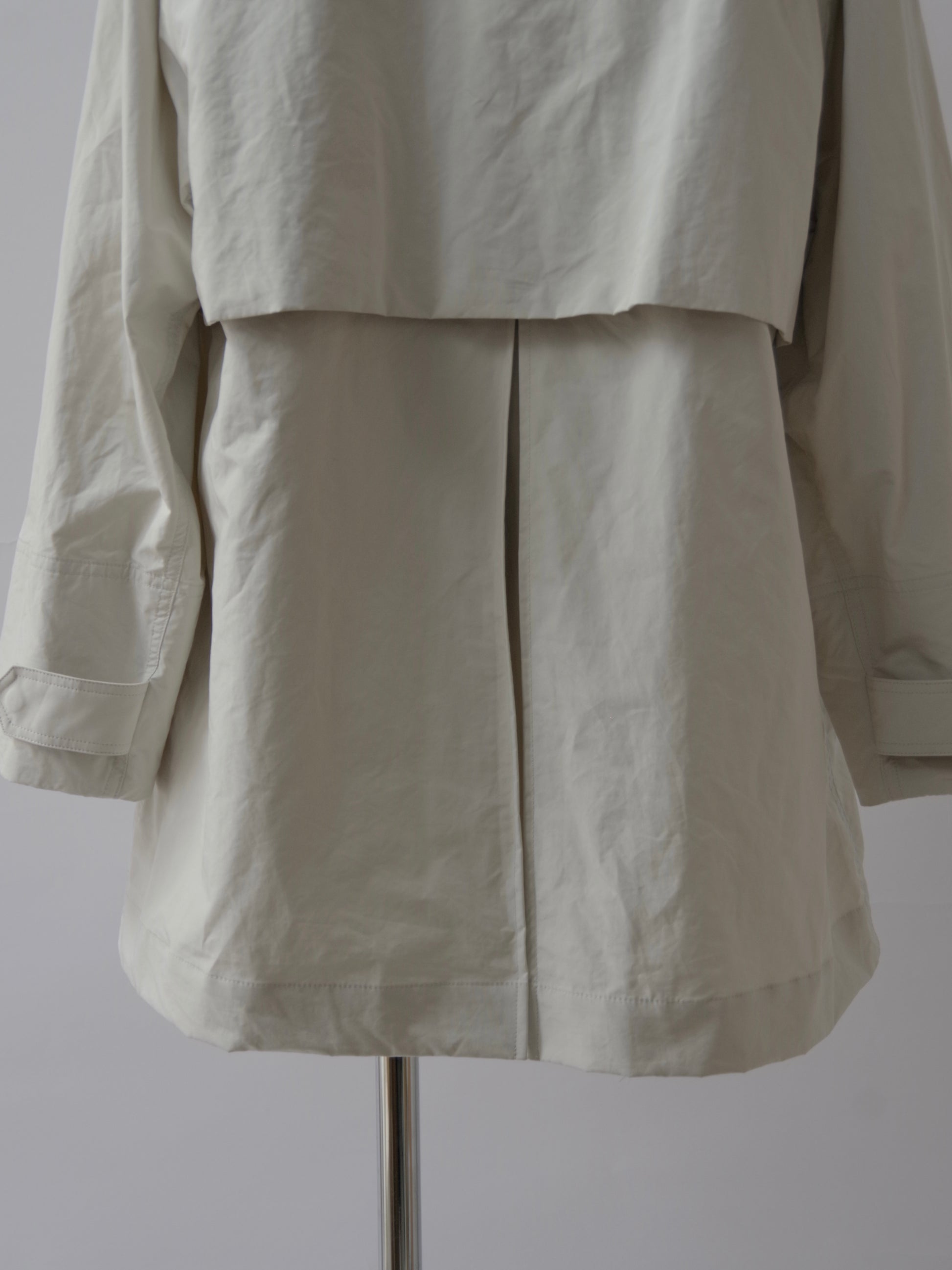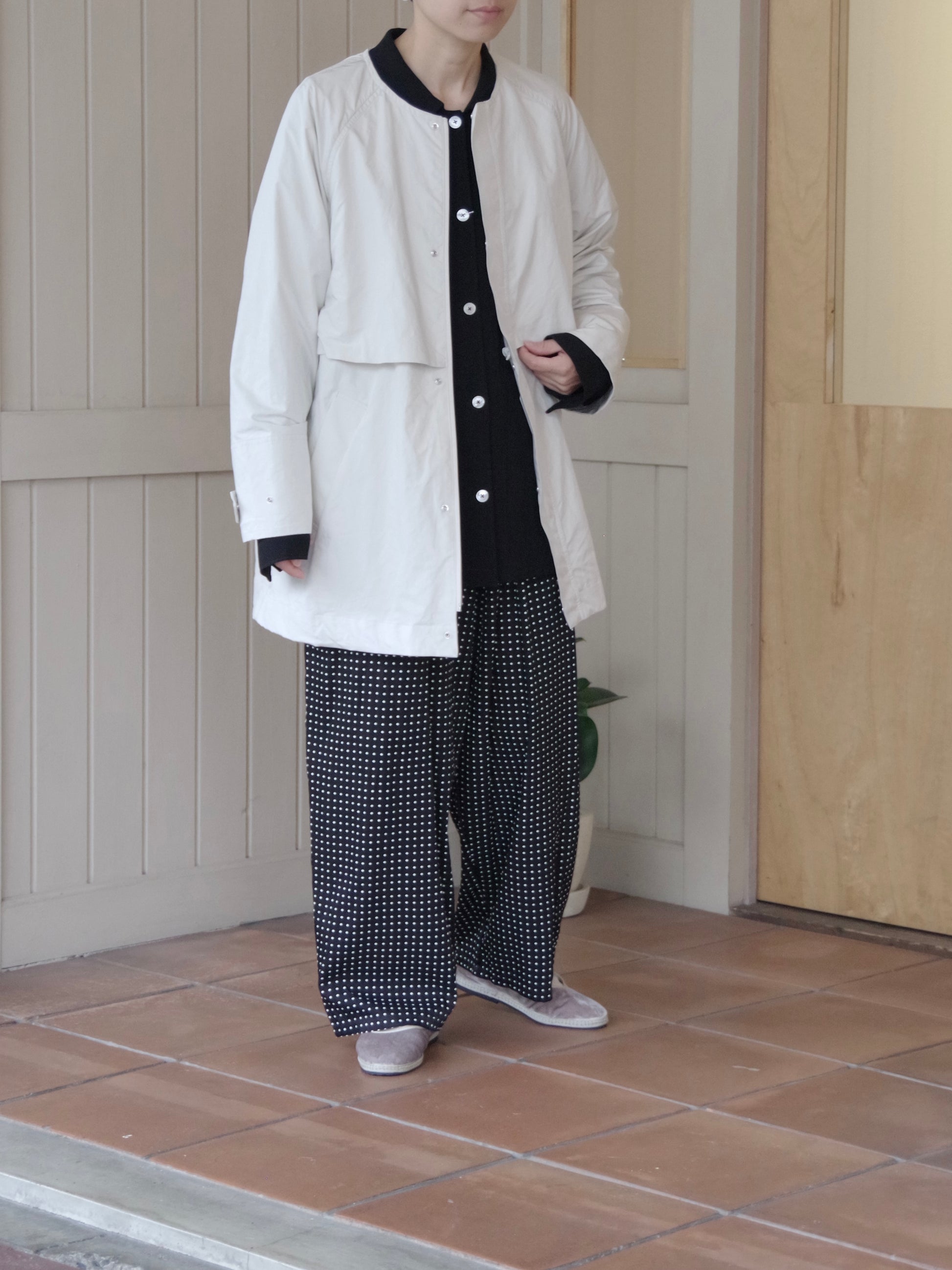 ノーカラーですっきりした襟元、ミドル丈のでつつみこむように防寒性もあるアウターです。ヨークデザインや、背中のタックデザイン。