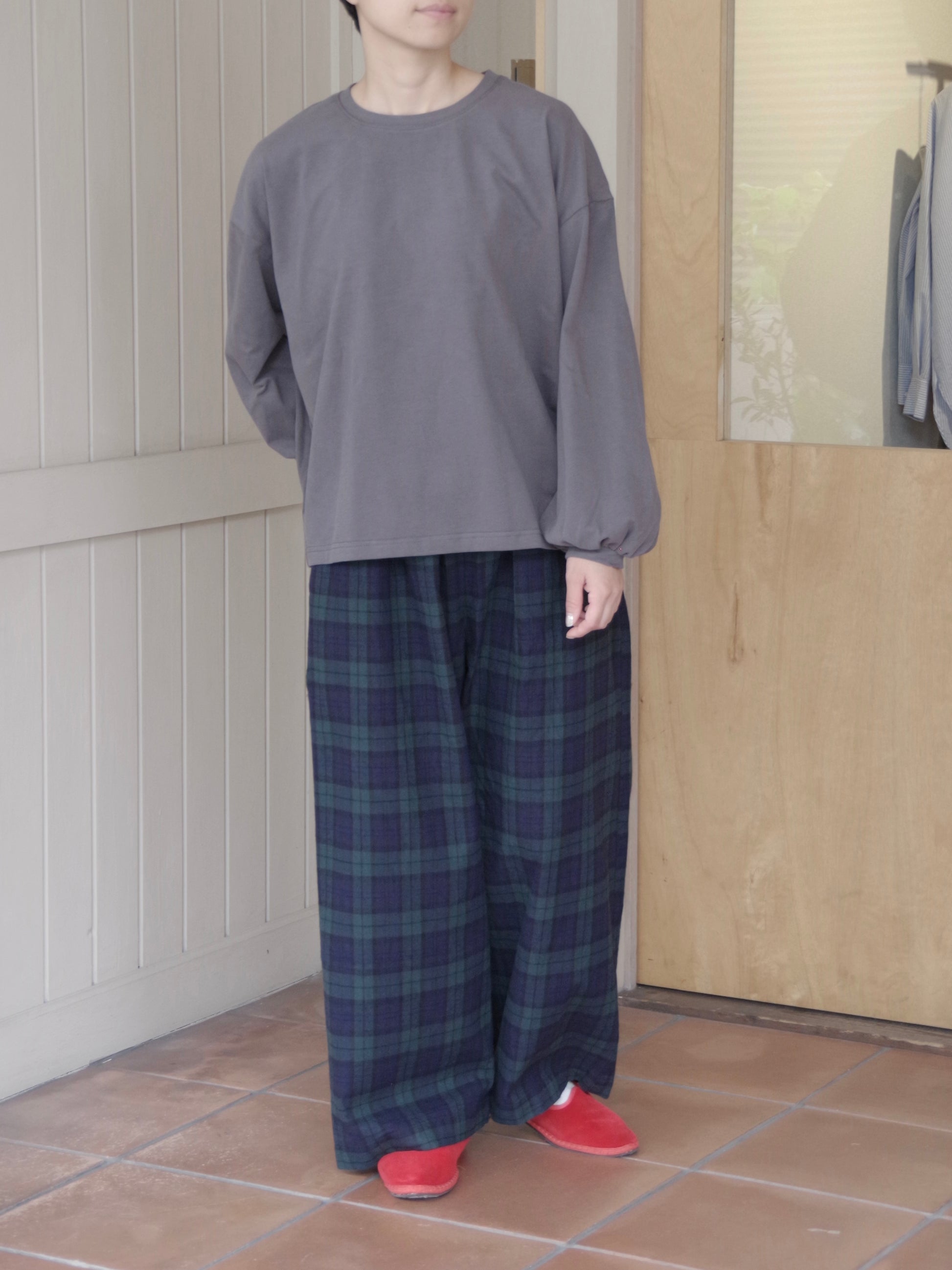 履きやすさとシルエットが人気の定番のワイドパンツに、ブラックウォッチが登場しました。コットン素材に起毛をかけた生地なので、秋冬に向けて少し温かみのある表情ですがコットンなので早い時期から履いていただけるパンツです。