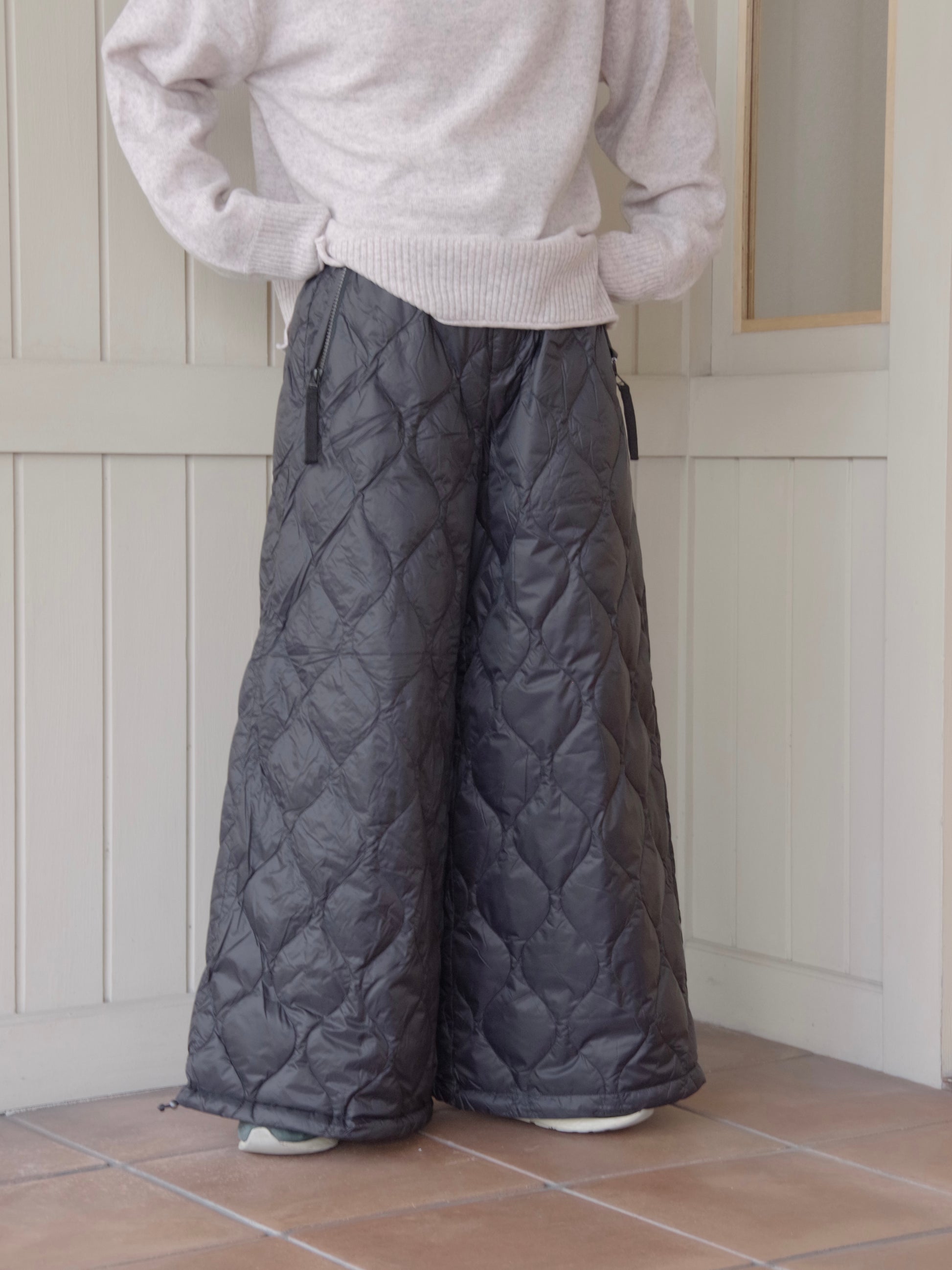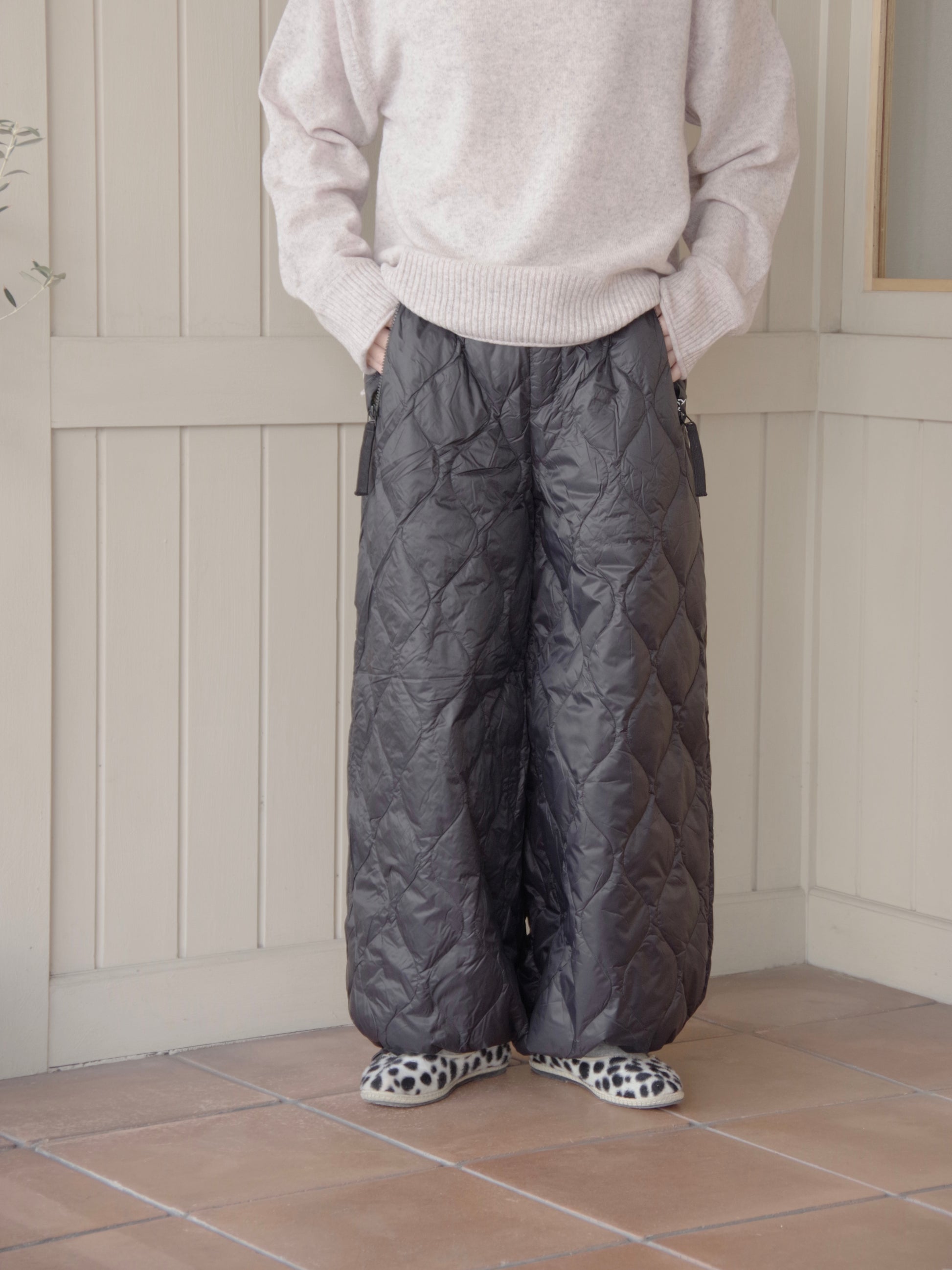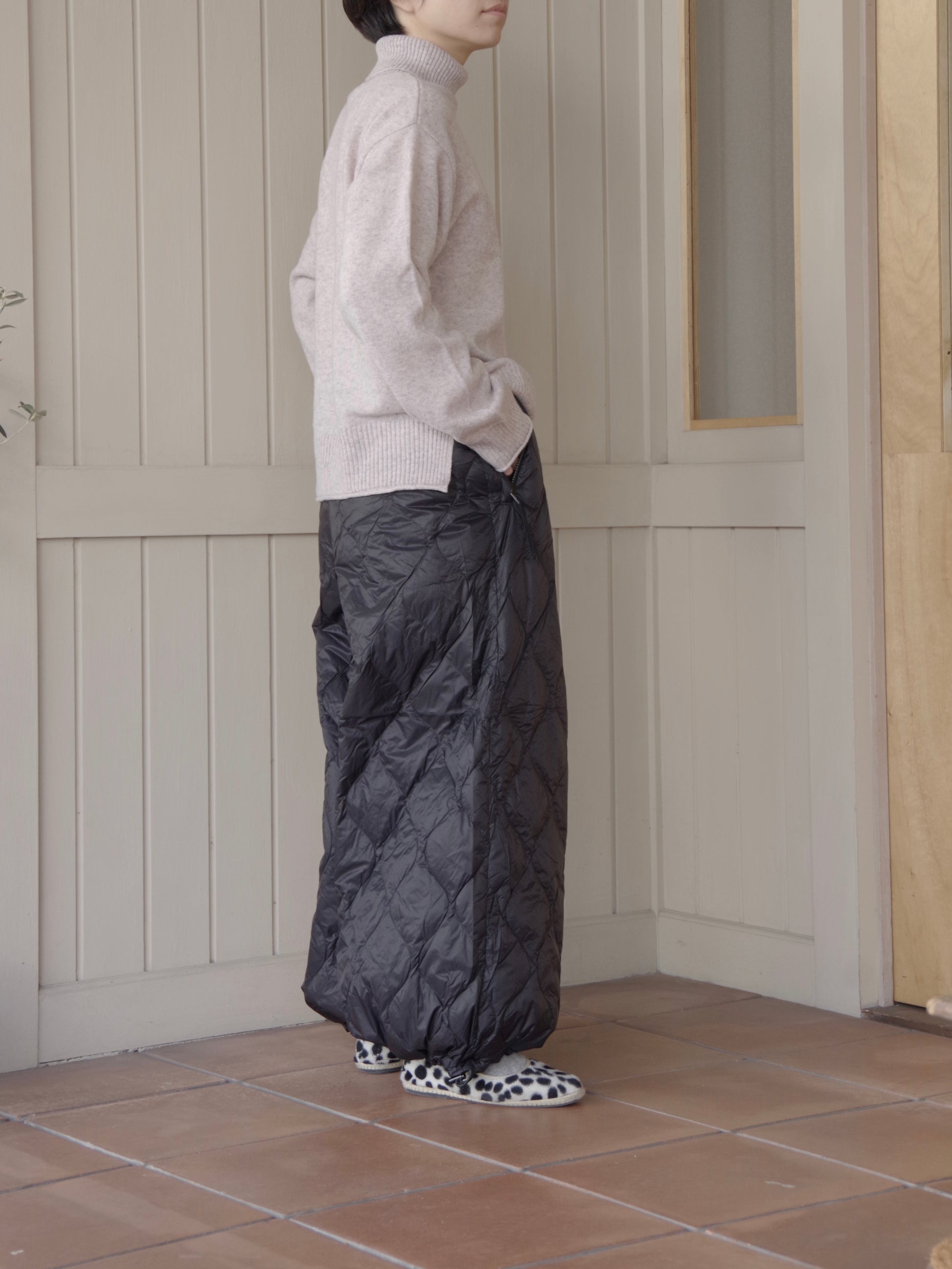 スカートのふんわりとしたボリューム感、裾は広めのデザインですが、裾はアジャスターで絞ることでシルエットが変えることができ、9分丈でバランスよく履きこなせます。