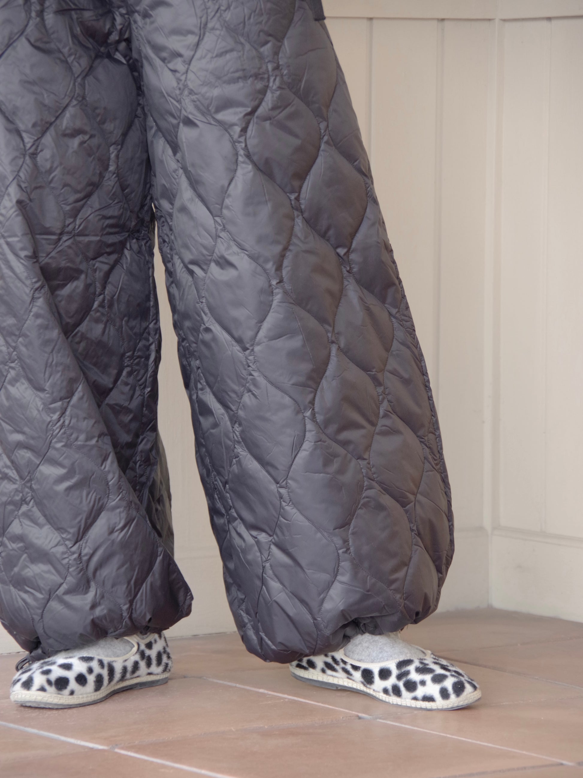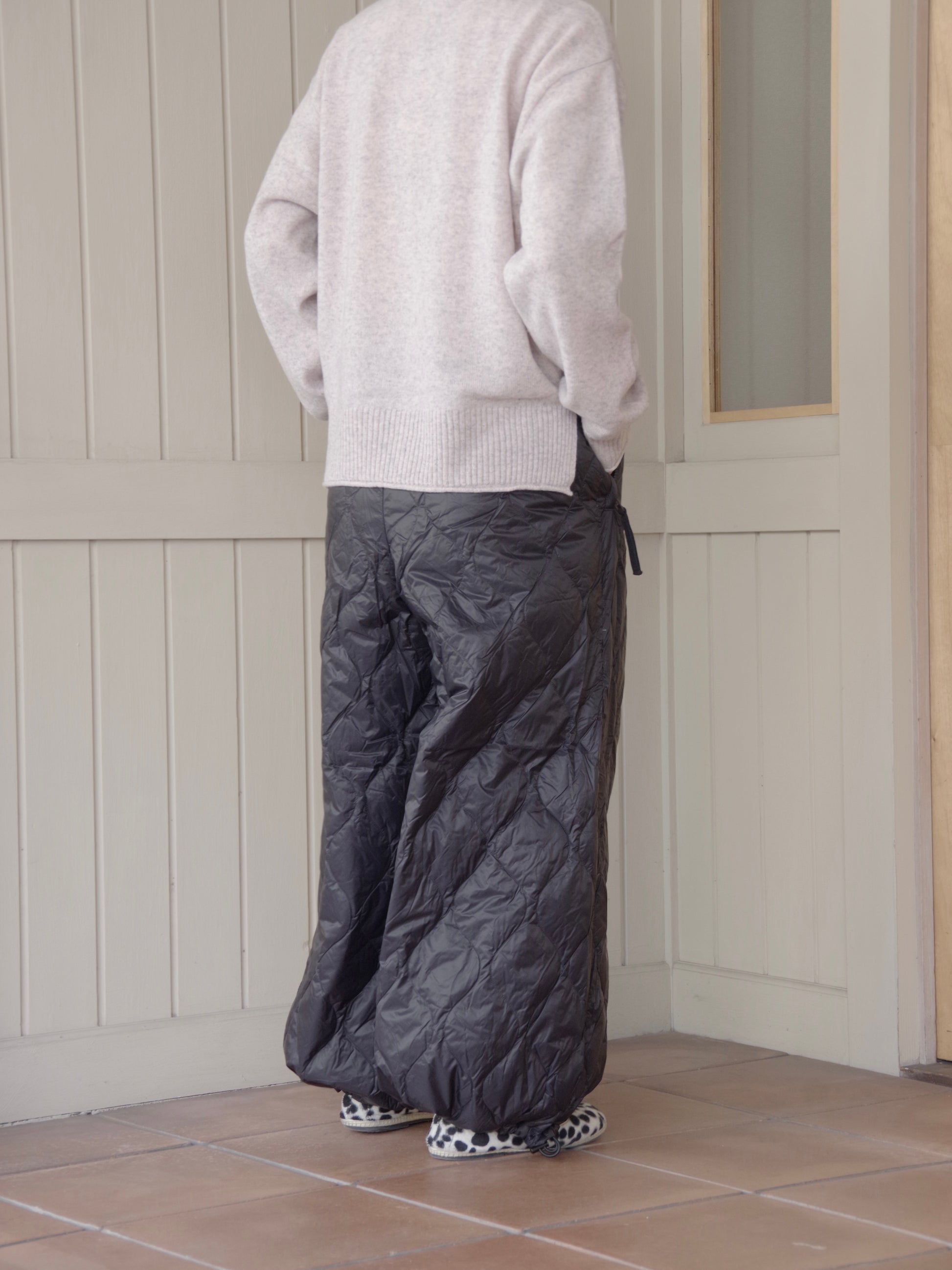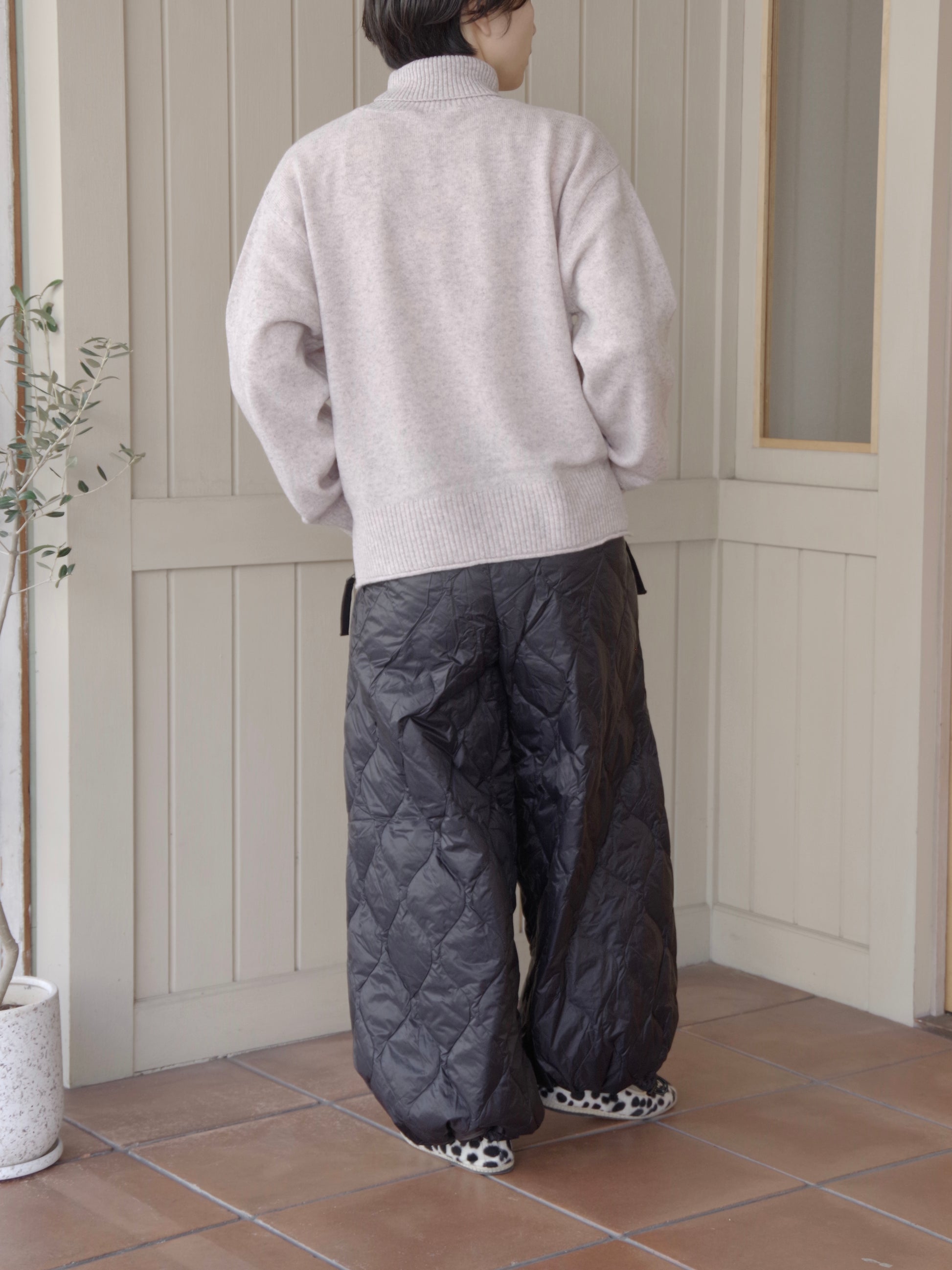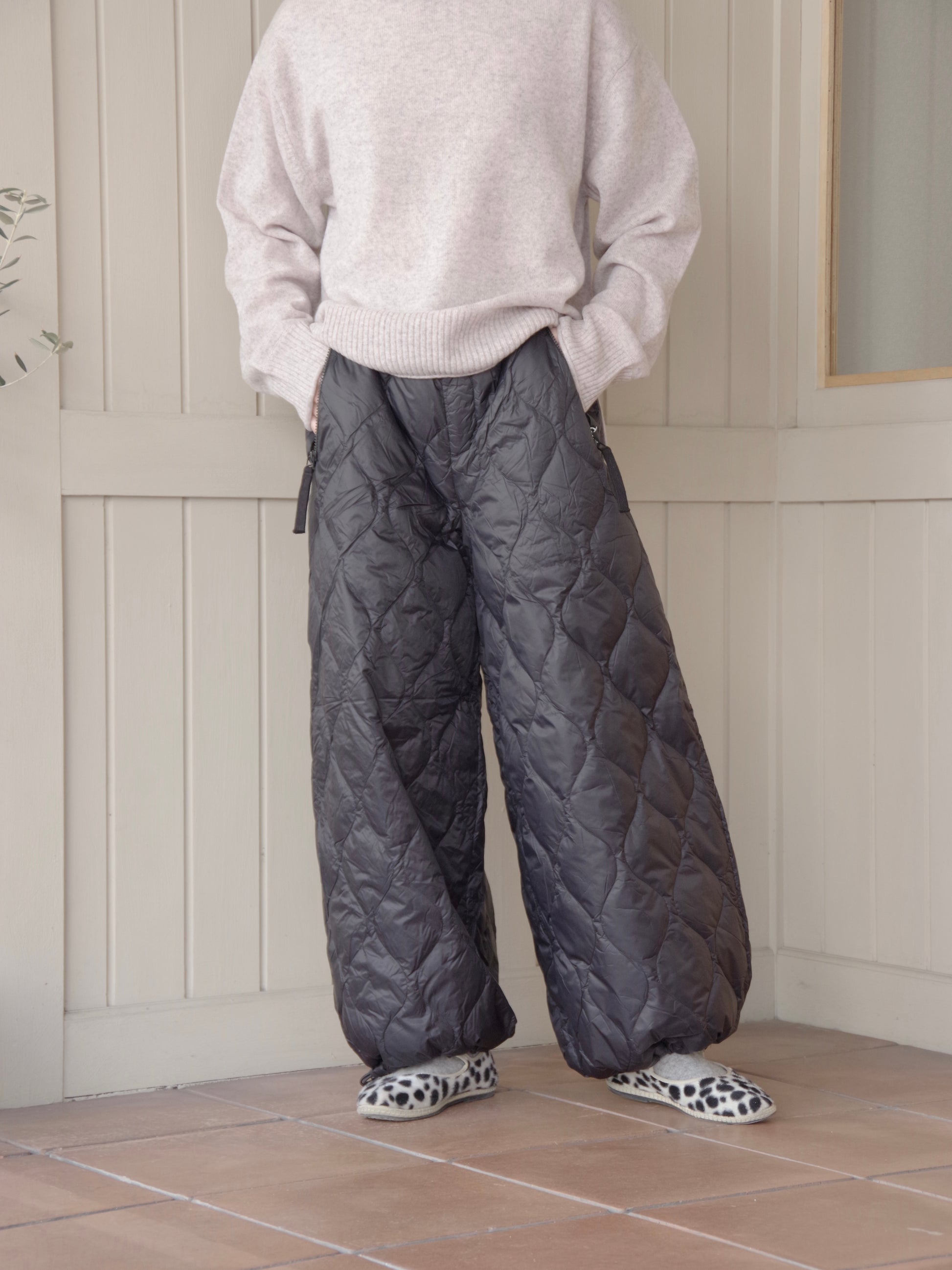 スカートのふんわりとしたボリューム感、裾は広めのデザインですが、裾はアジャスターで絞ることでシルエットが変えることができ、9分丈でバランスよく履きこなせます。