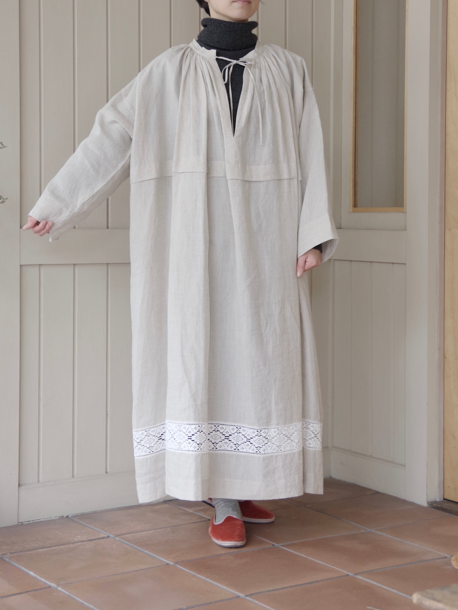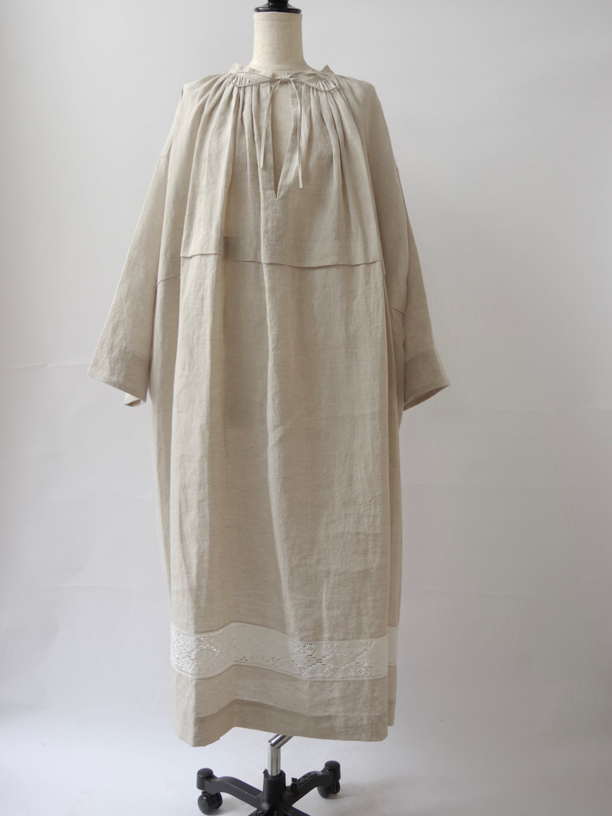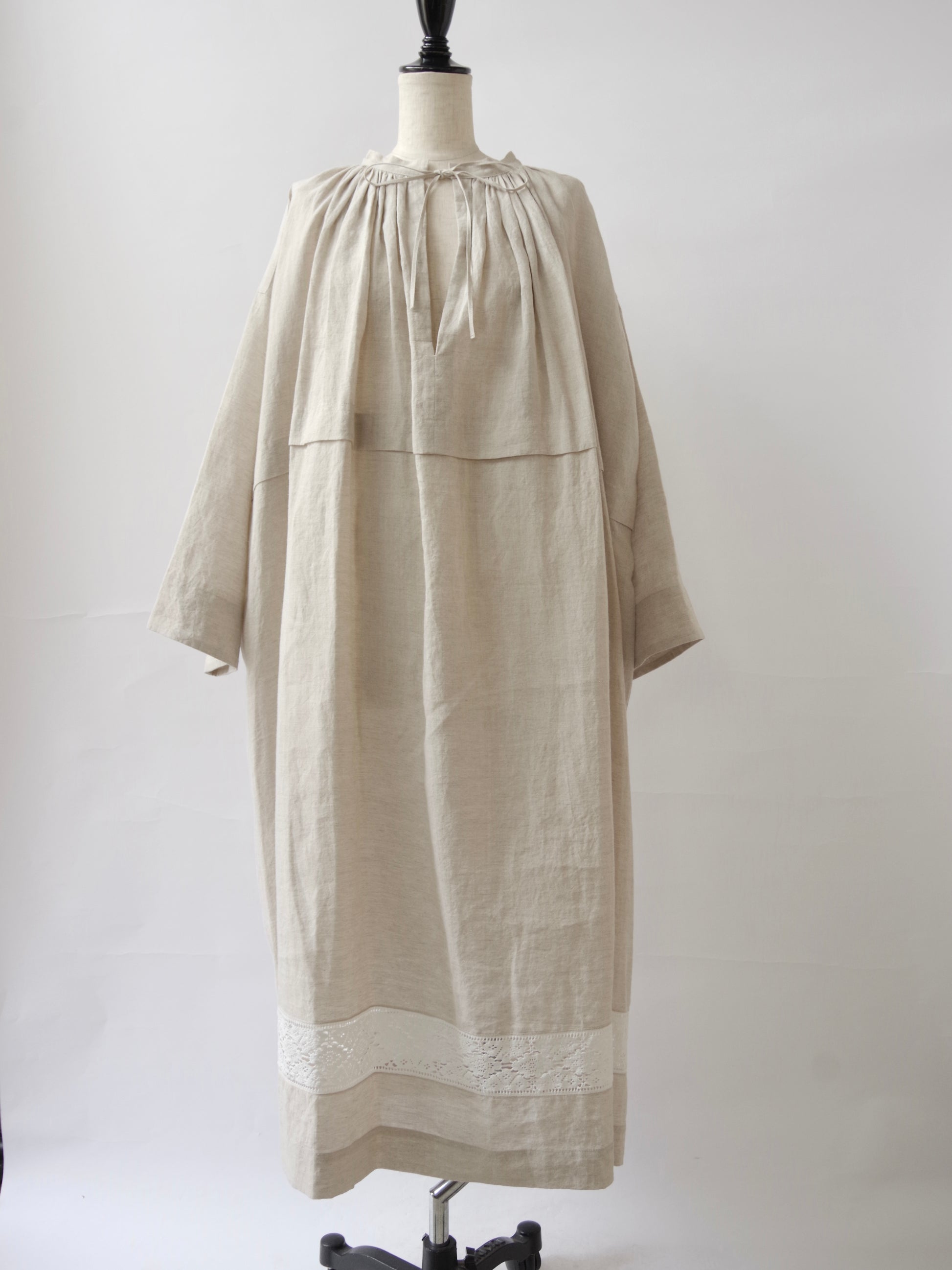 首元に寄せたギャザーが立体的なシルエットを生み出します。裾にはレースを配してアクセントに清らかで品のある佇まいに仕上げました。