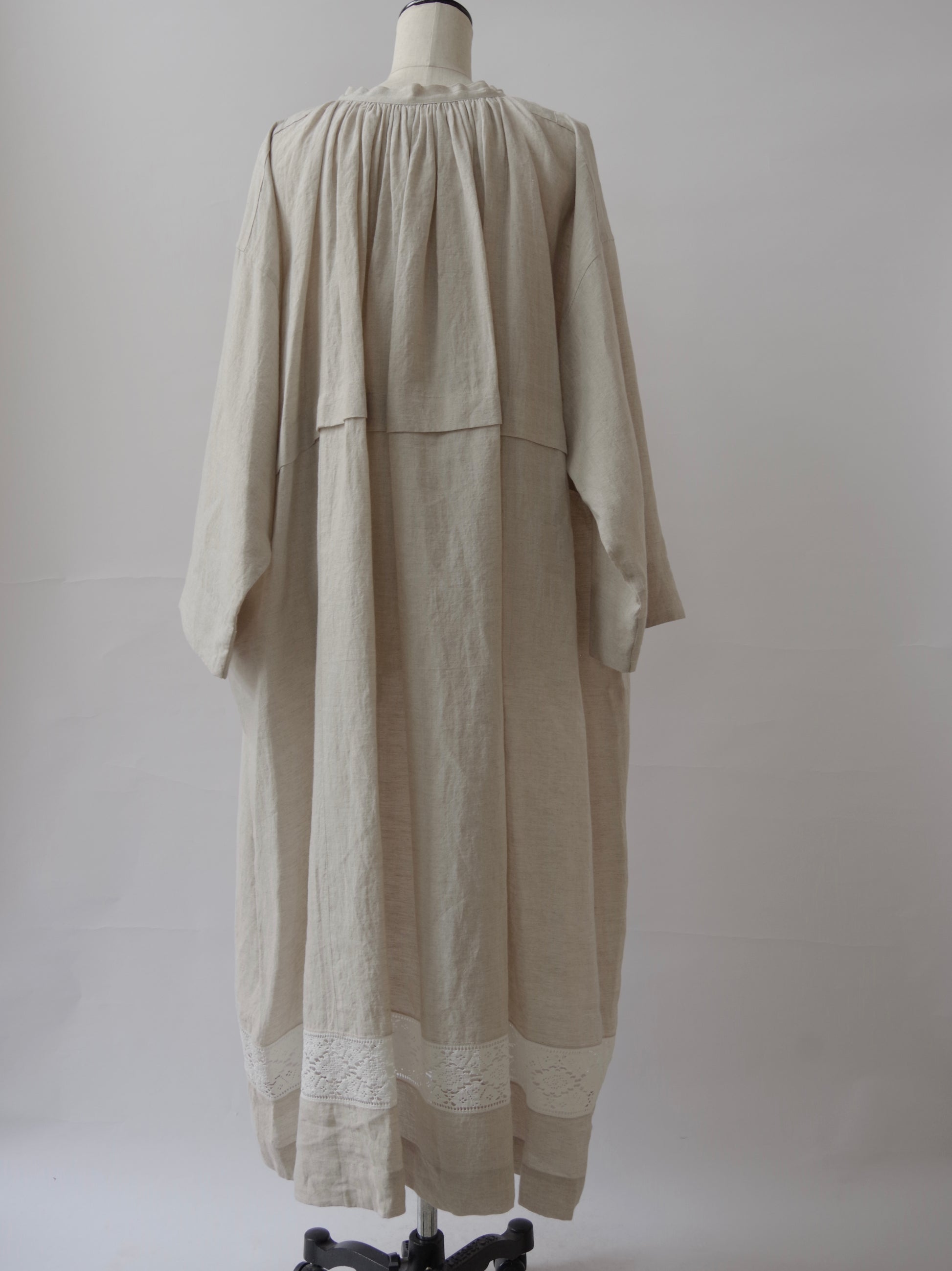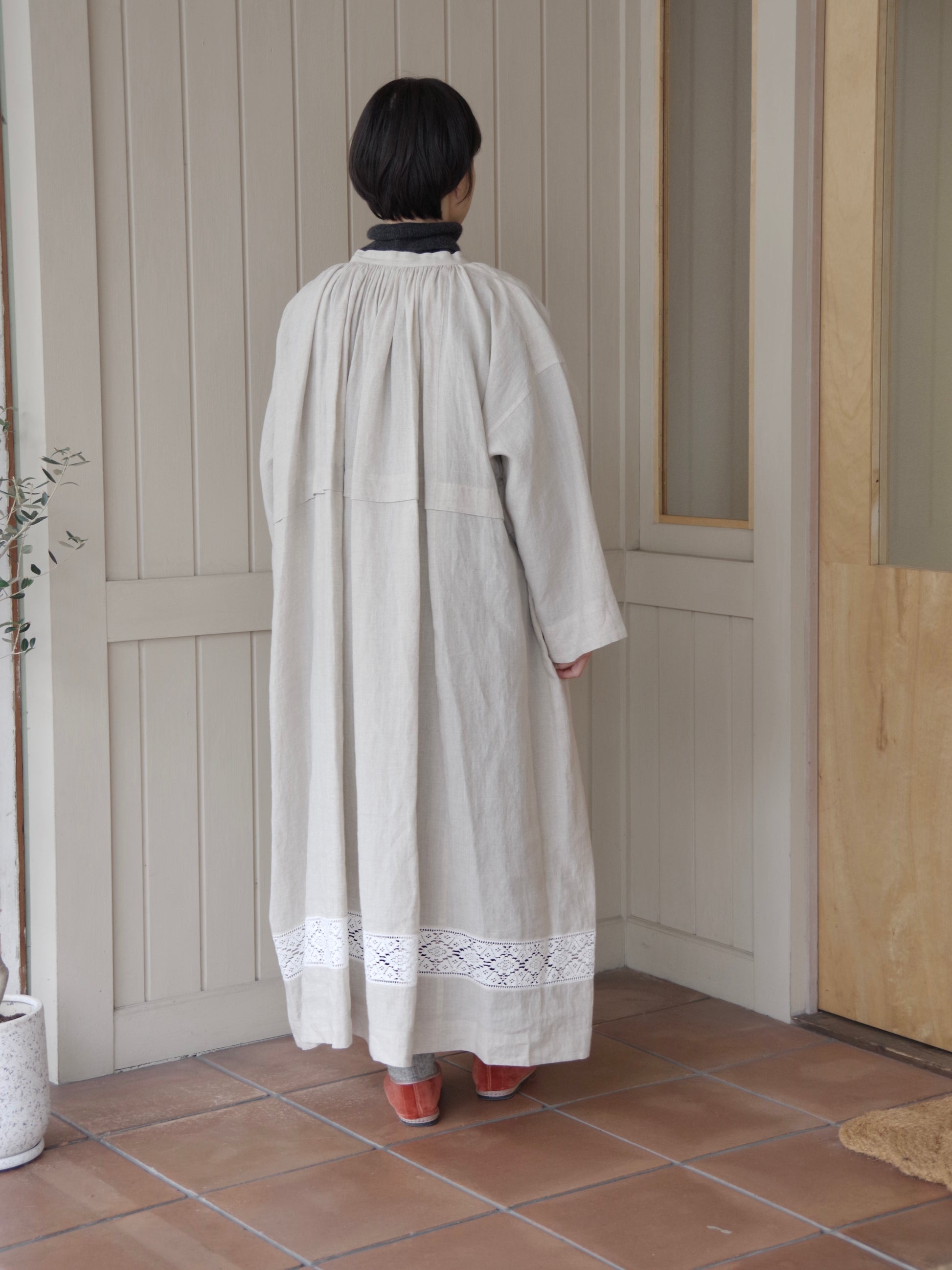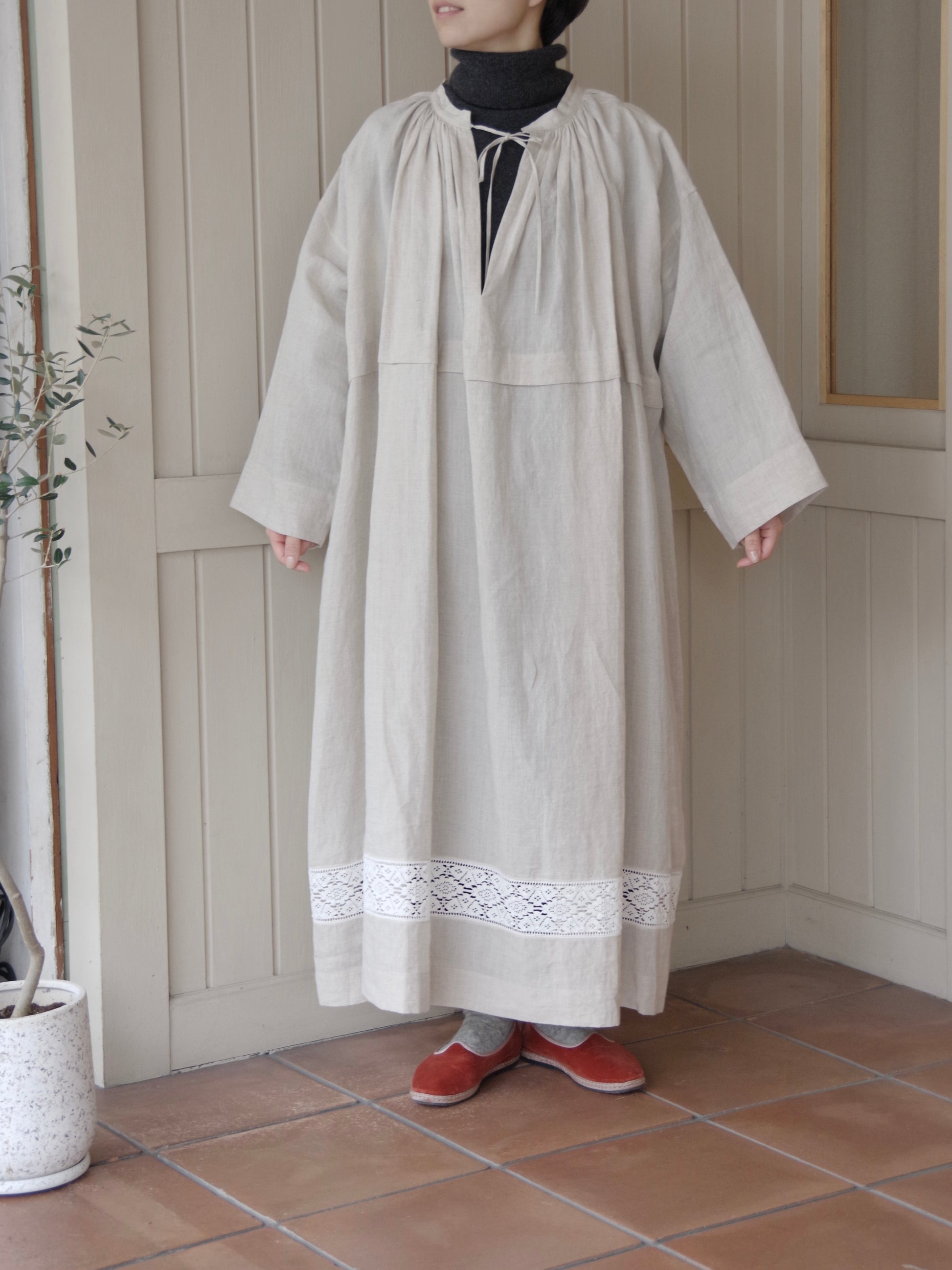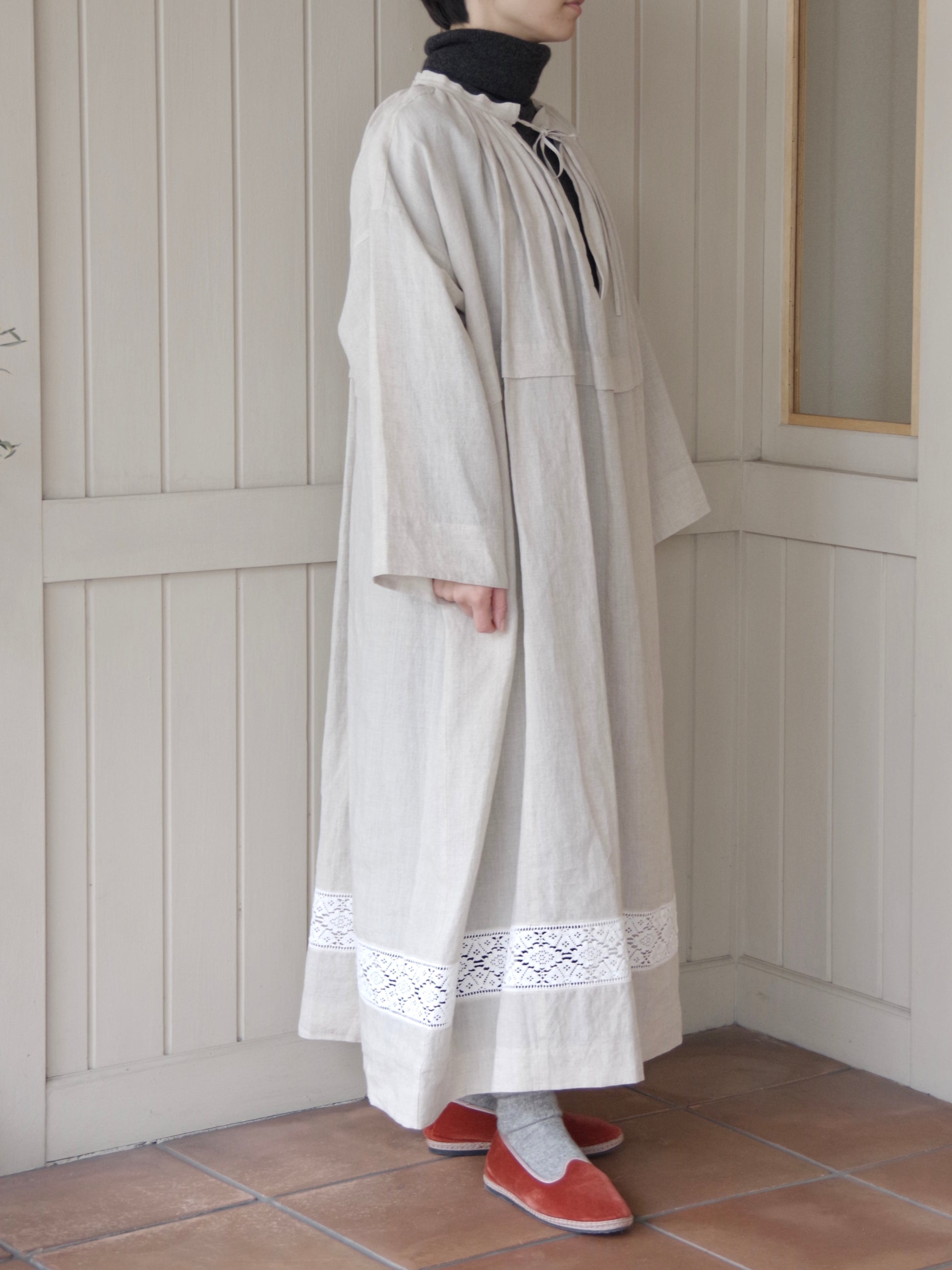 首元に寄せたギャザーが立体的なシルエットを生み出します。裾にはレースを配してアクセントに清らかで品のある佇まいに仕上げました。