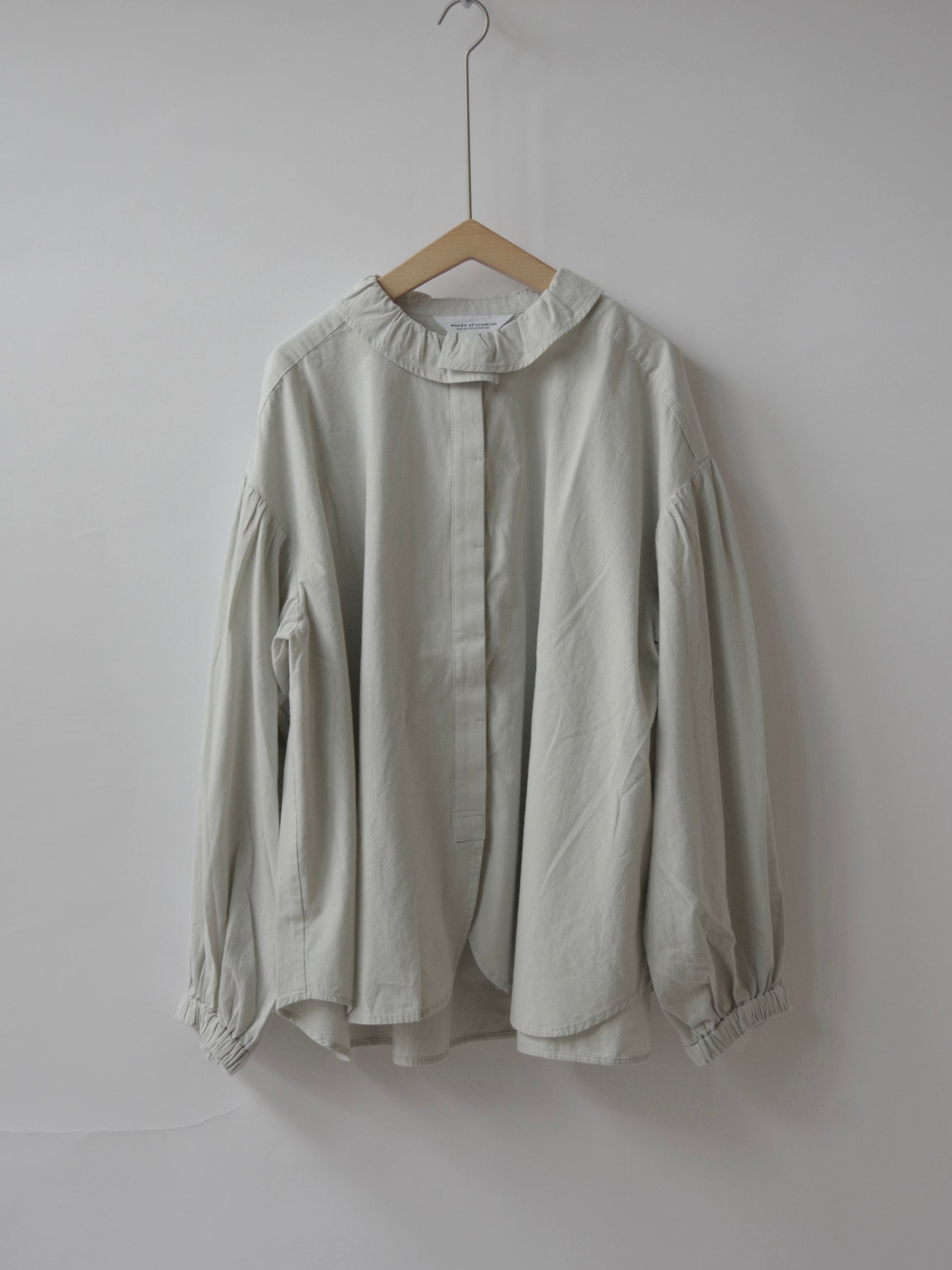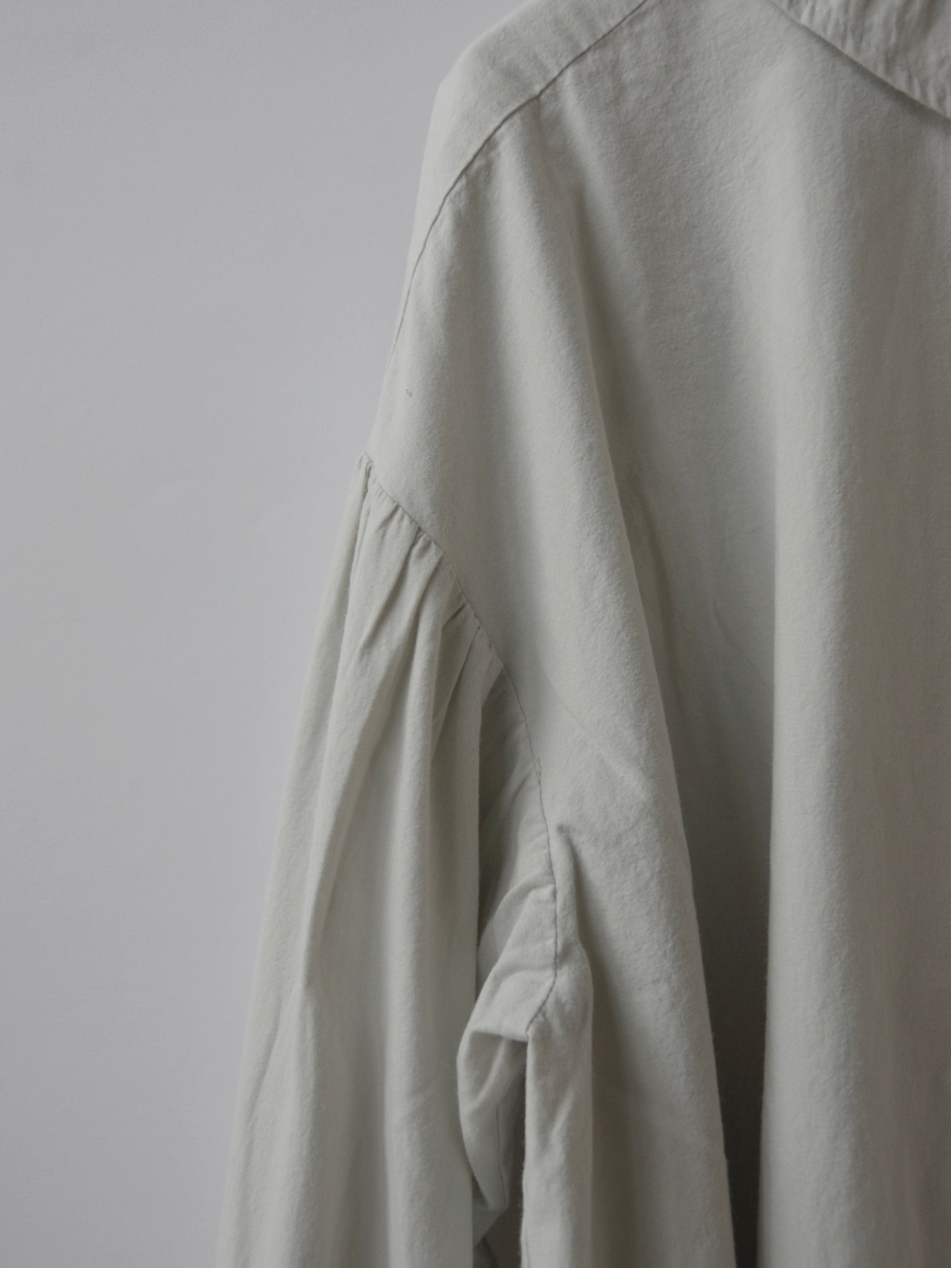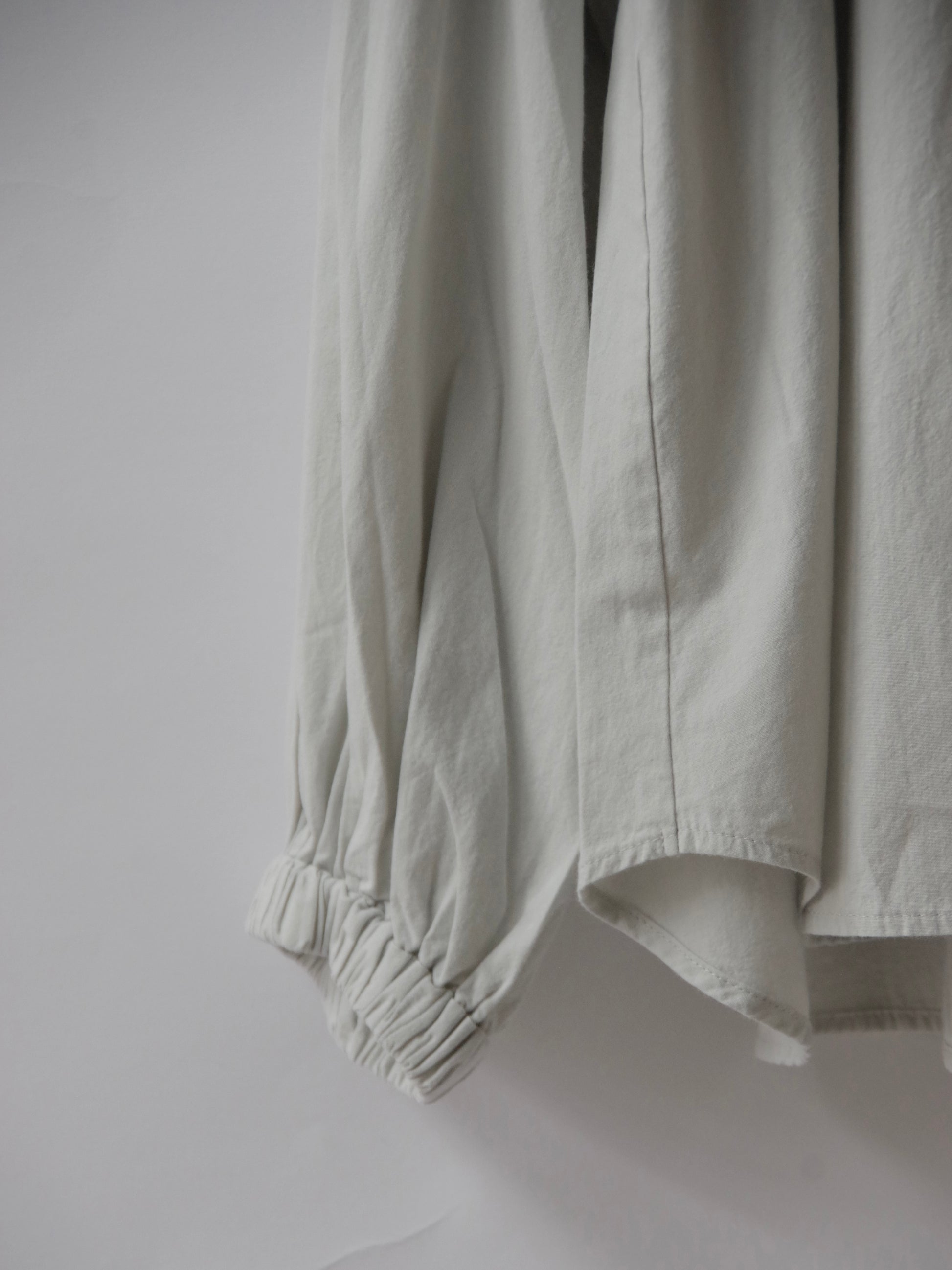 少しボリュームのある袖は、袖口がゴムになっているのでたくし上げることでシルエットをも変えれます。1枚でも様になり、衿をいかしたインナーとしても活躍してくれる1枚です。
