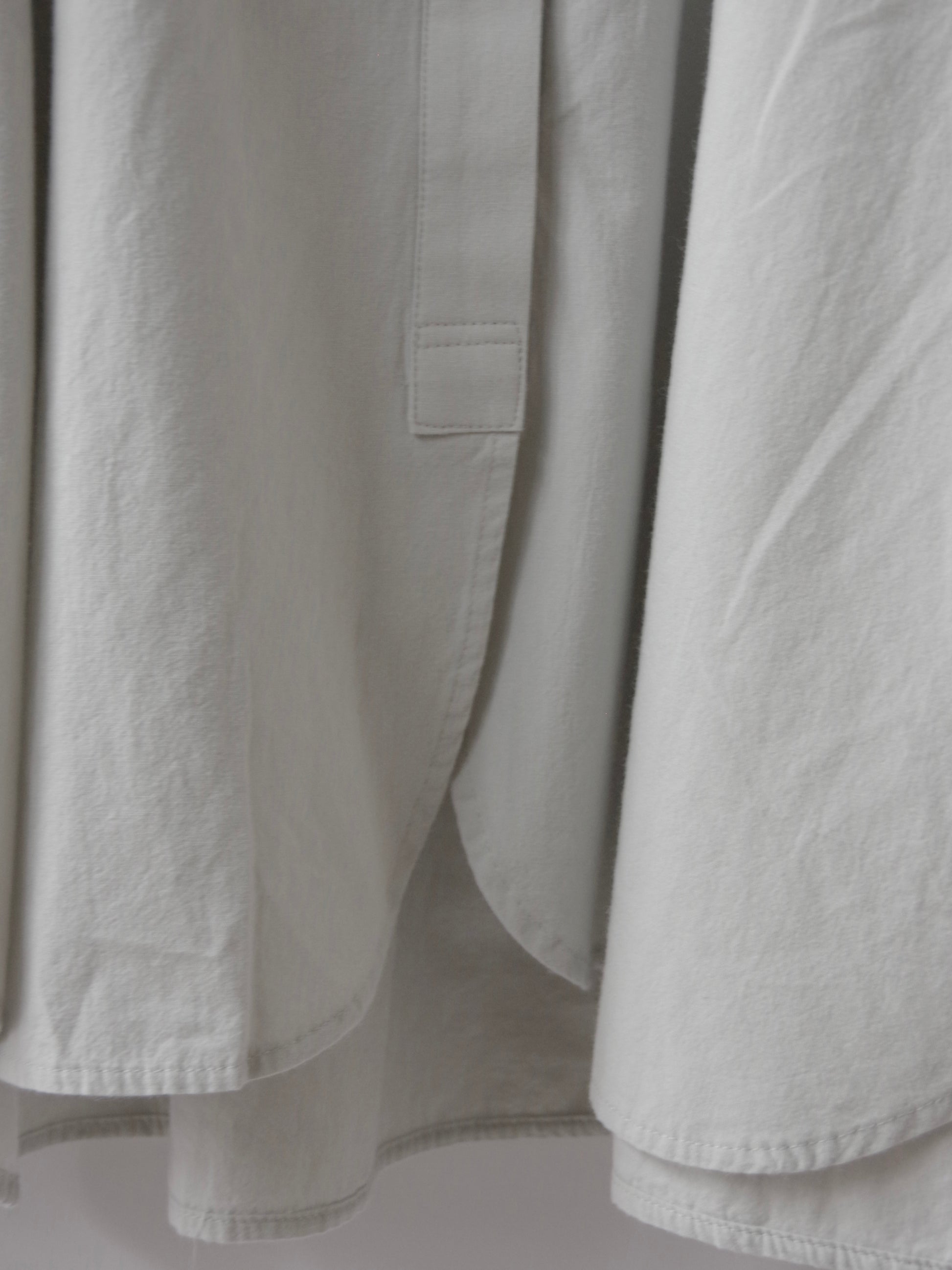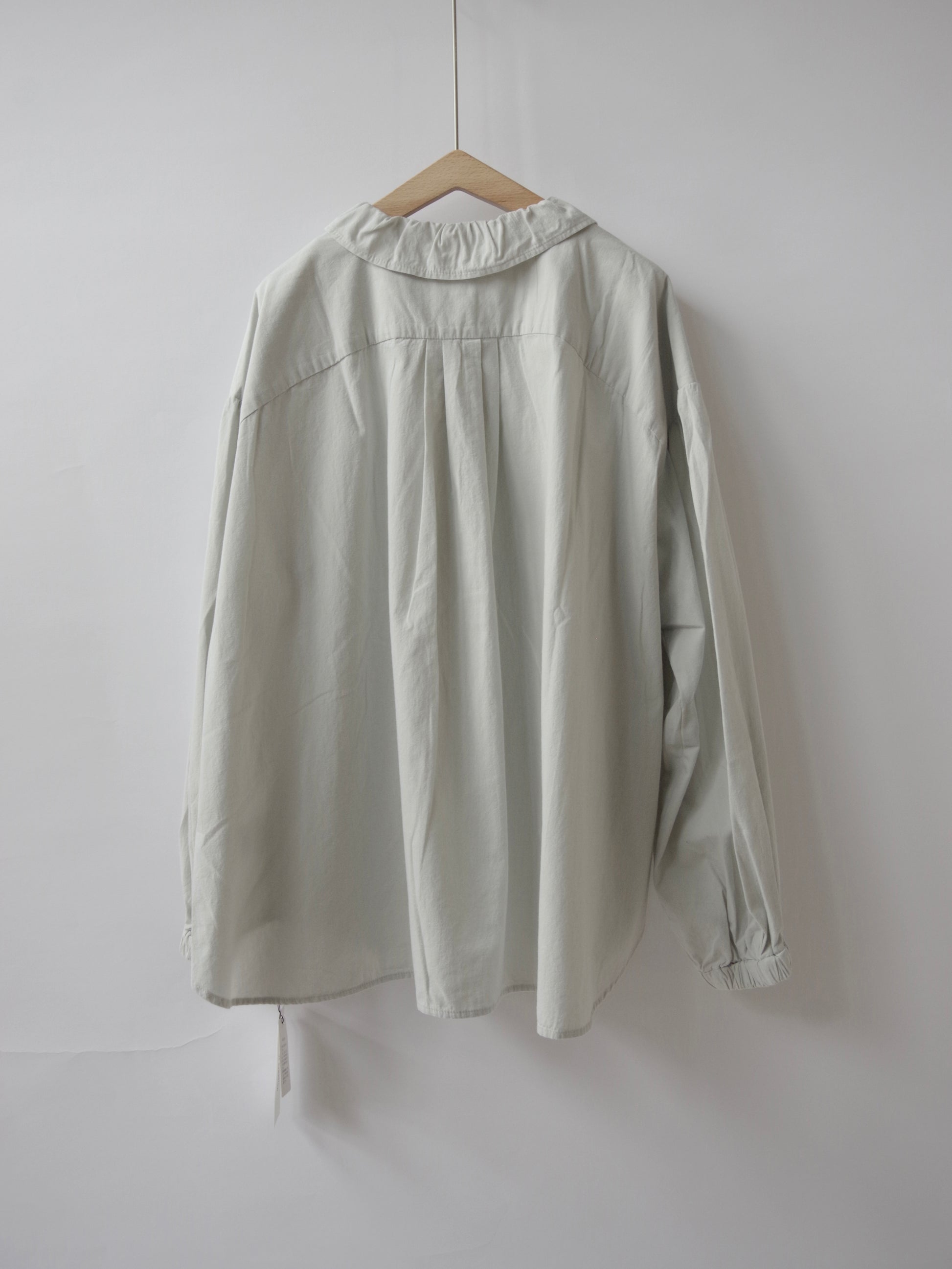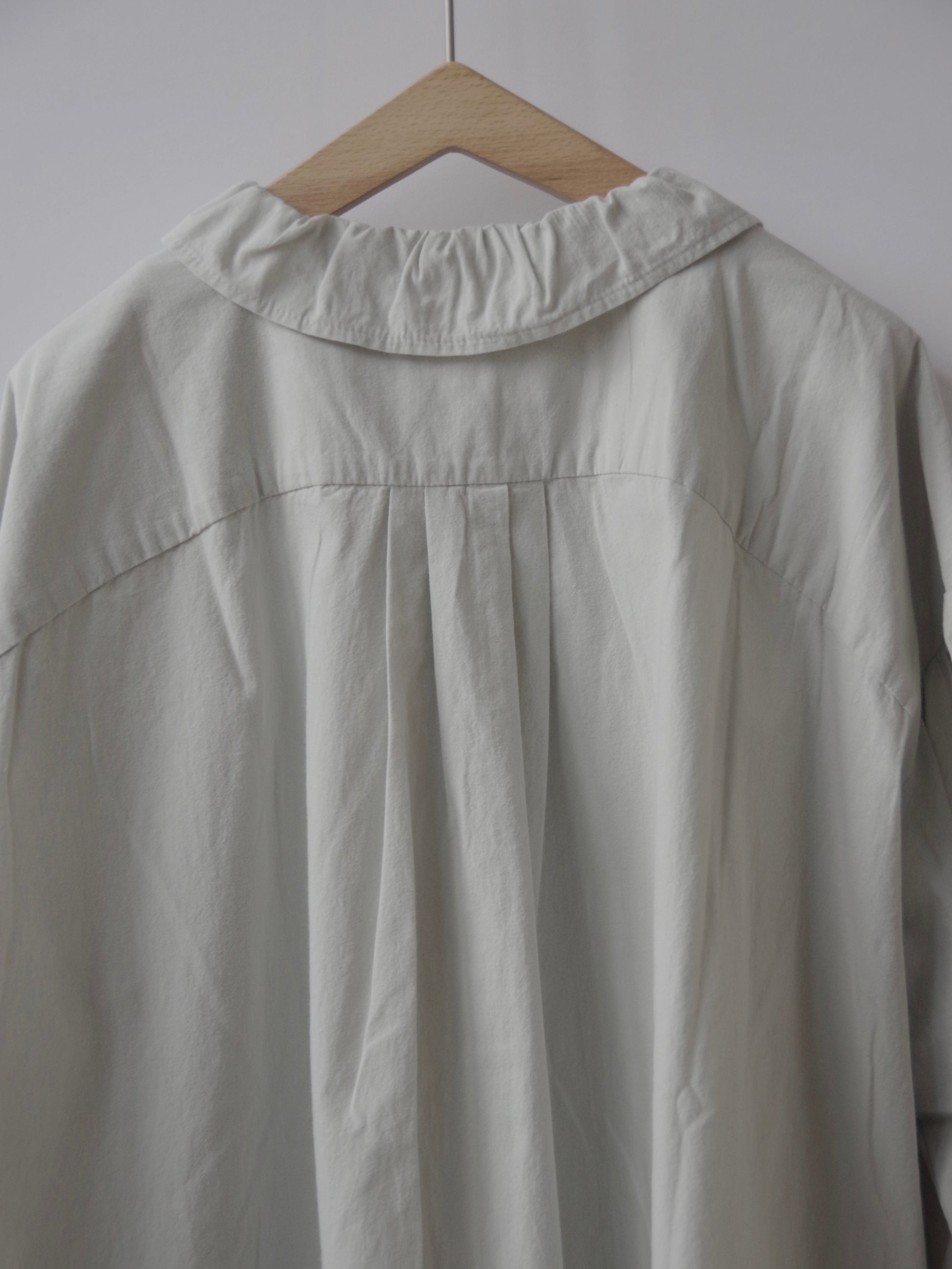 少しボリュームのある袖は、袖口がゴムになっているのでたくし上げることでシルエットをも変えれます。1枚でも様になり、衿をいかしたインナーとしても活躍してくれる1枚です。