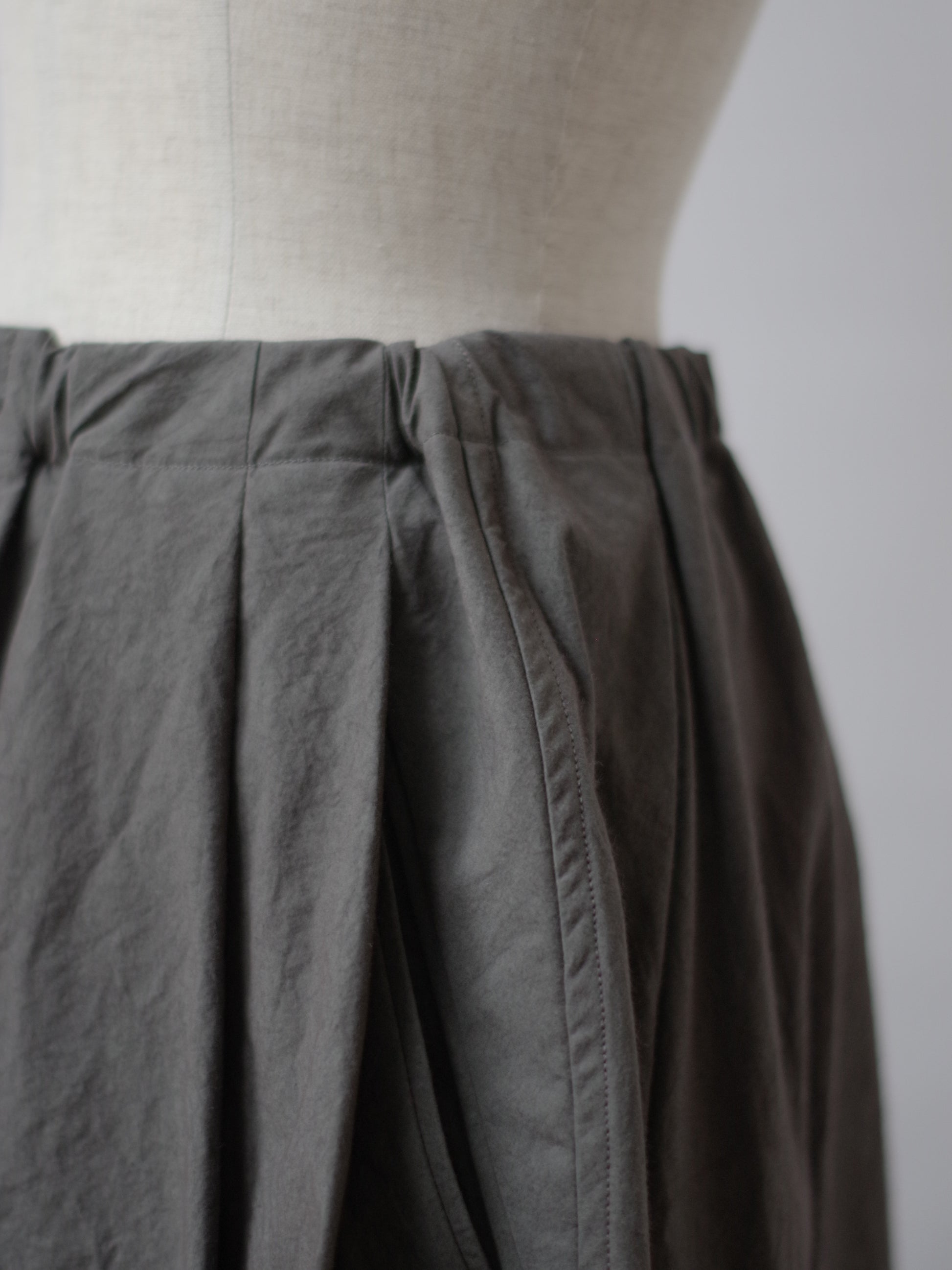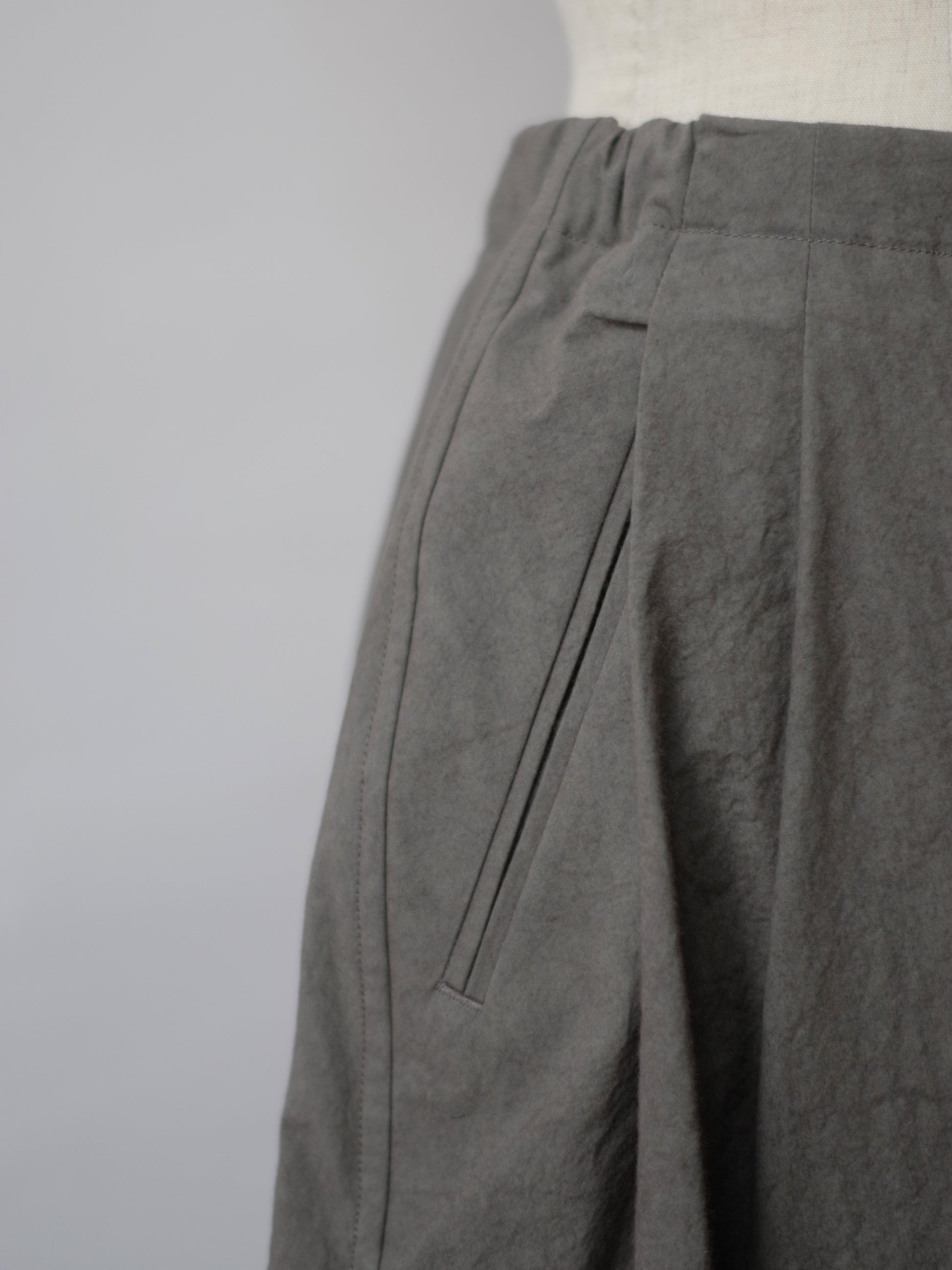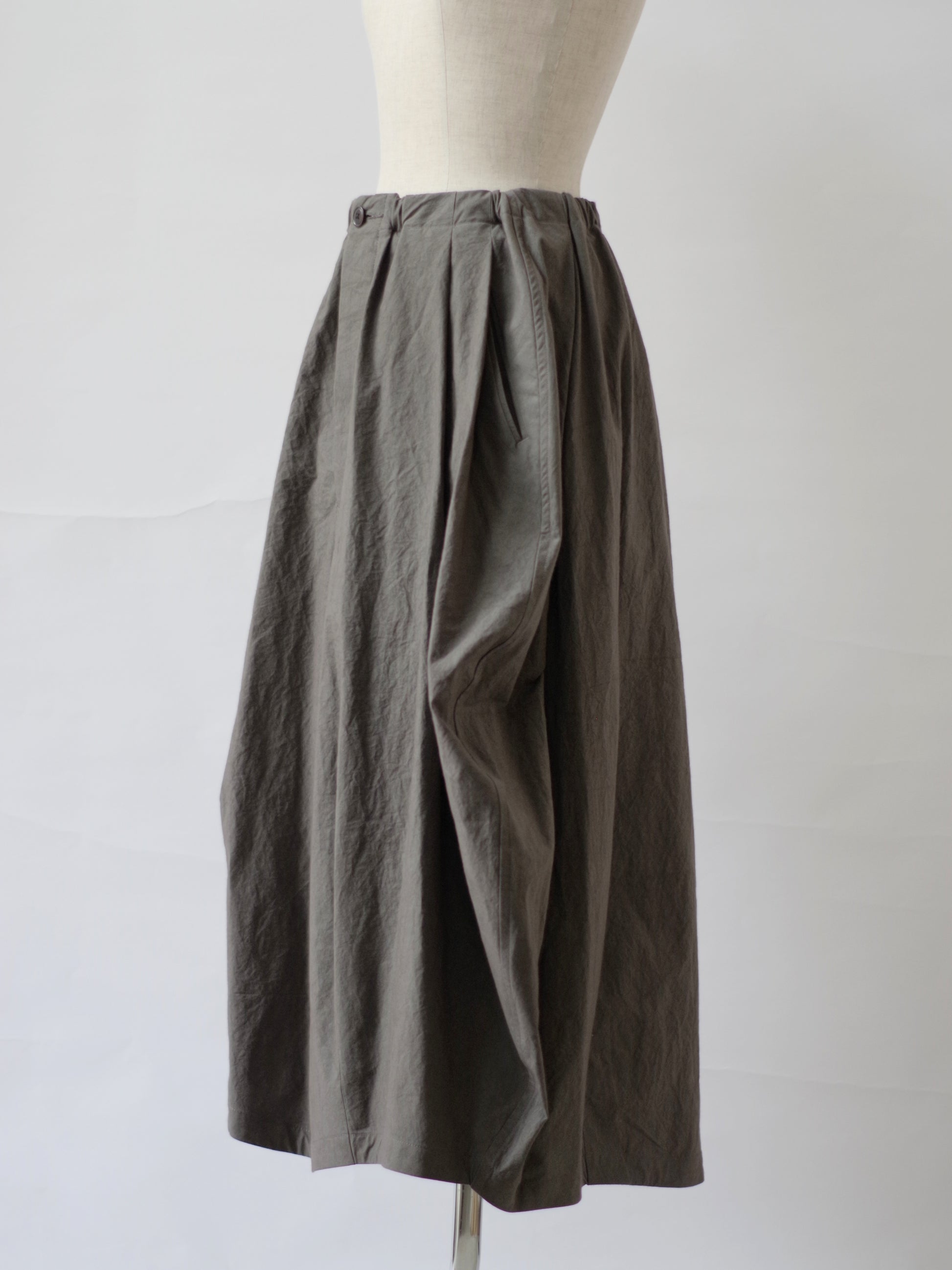 深いプリーツとプリーツに重なる5mm巾両玉縁ポケット、そしてバルーンシルエットが特徴のロングスカートです。