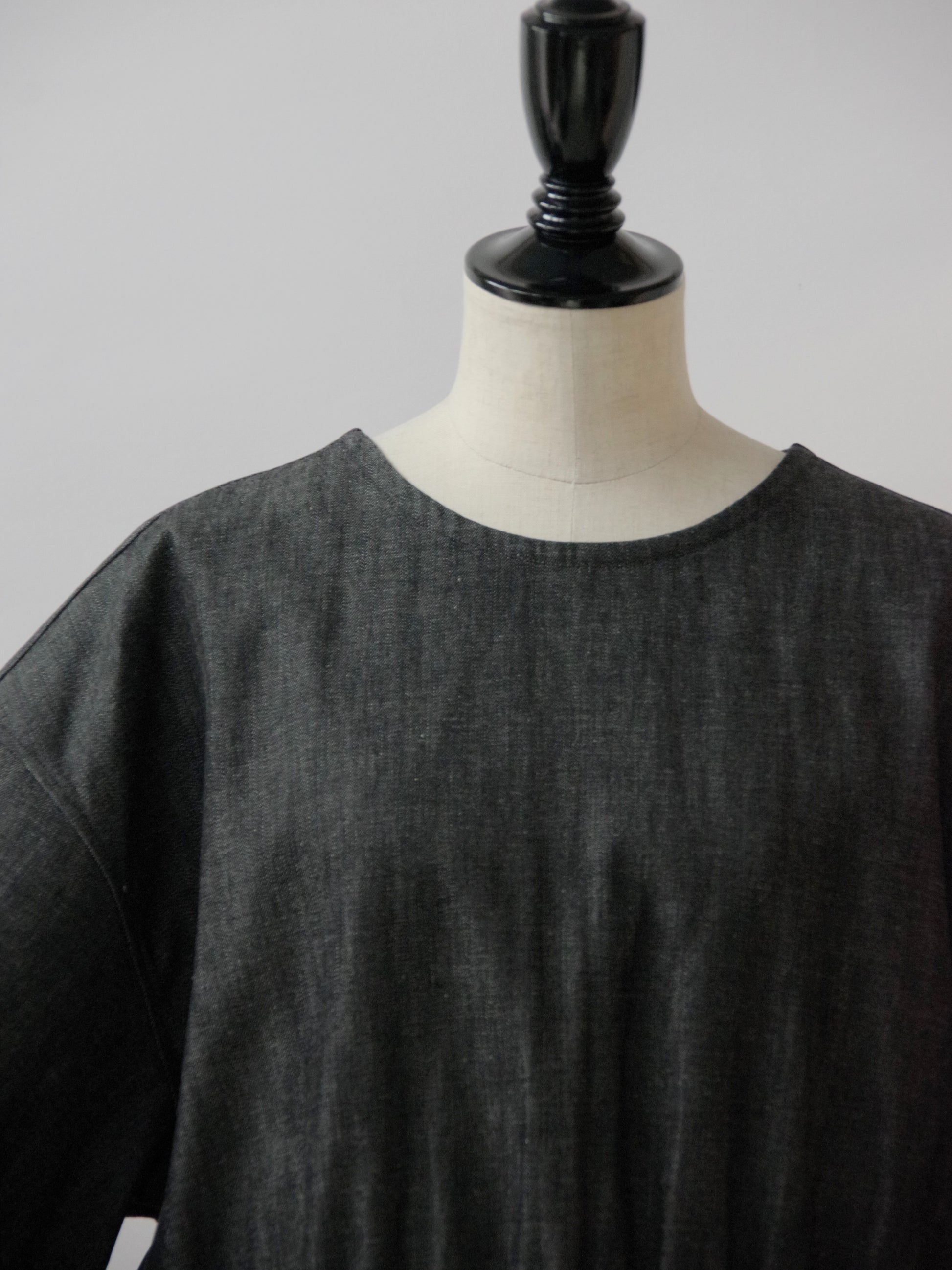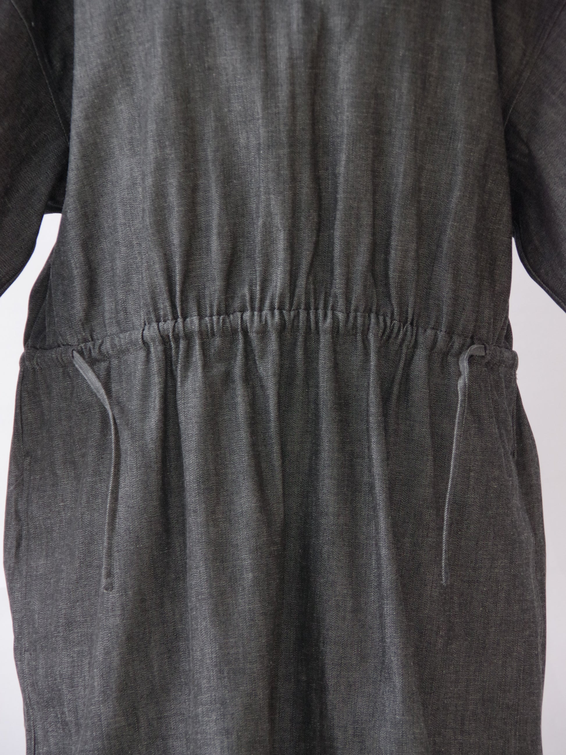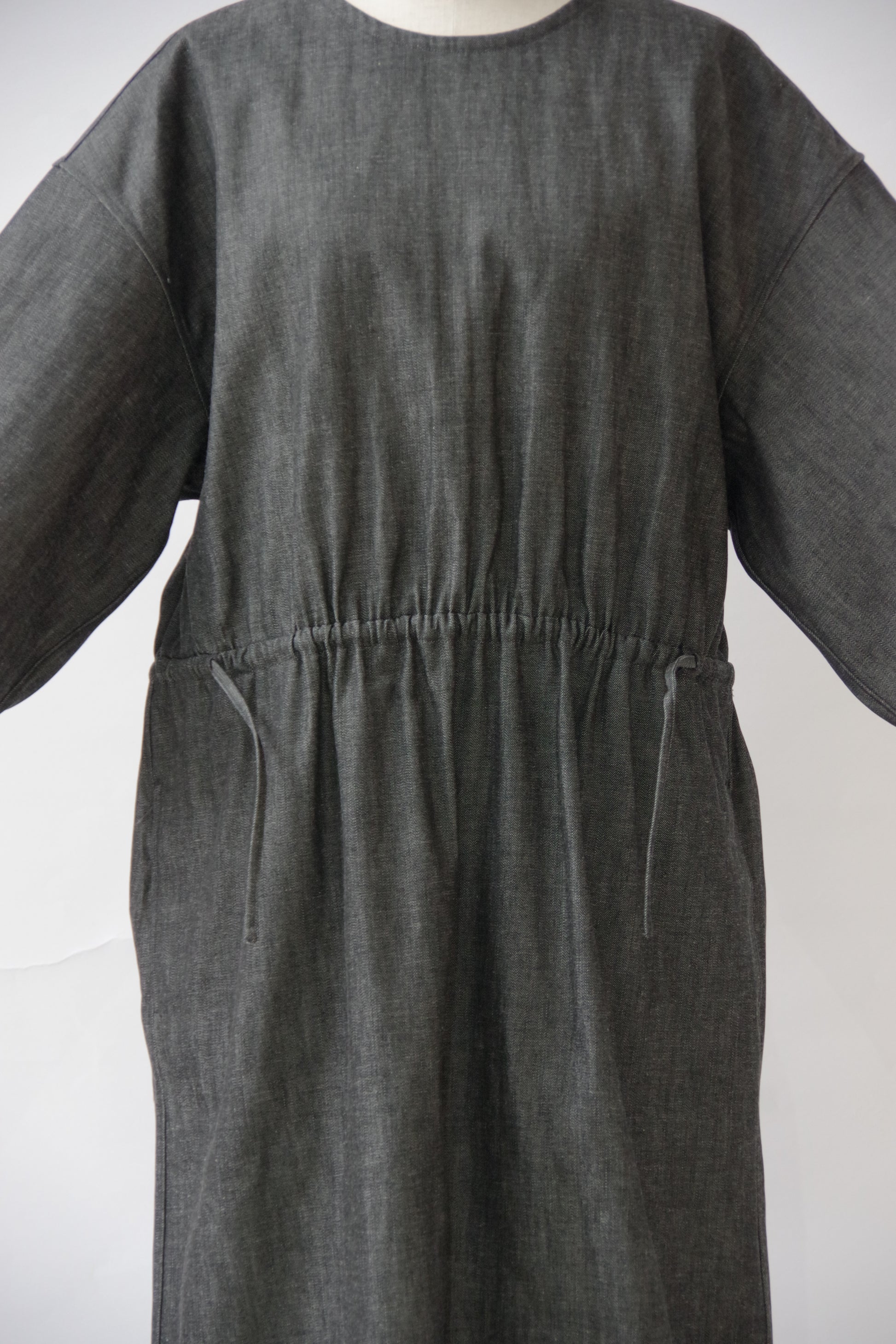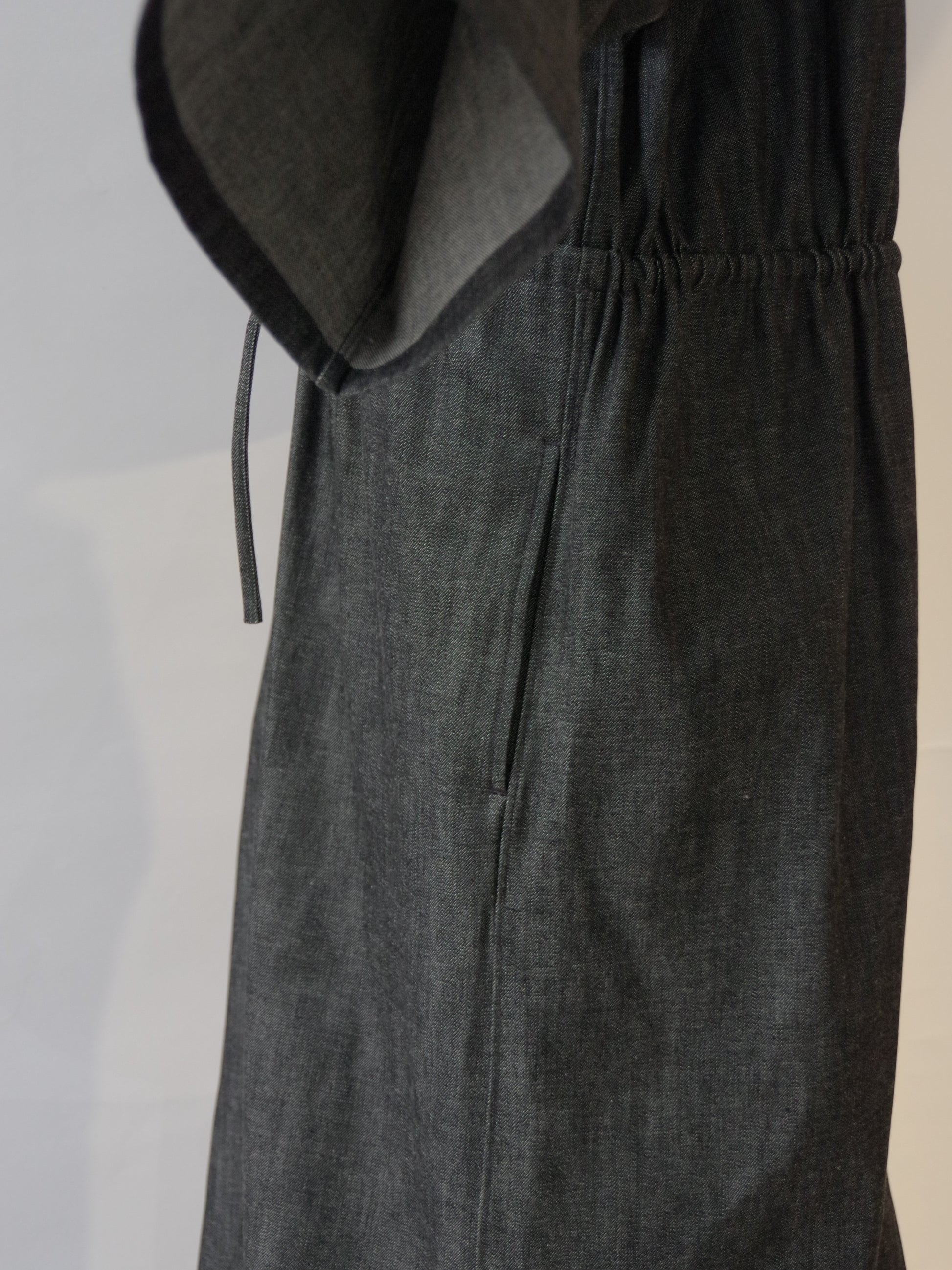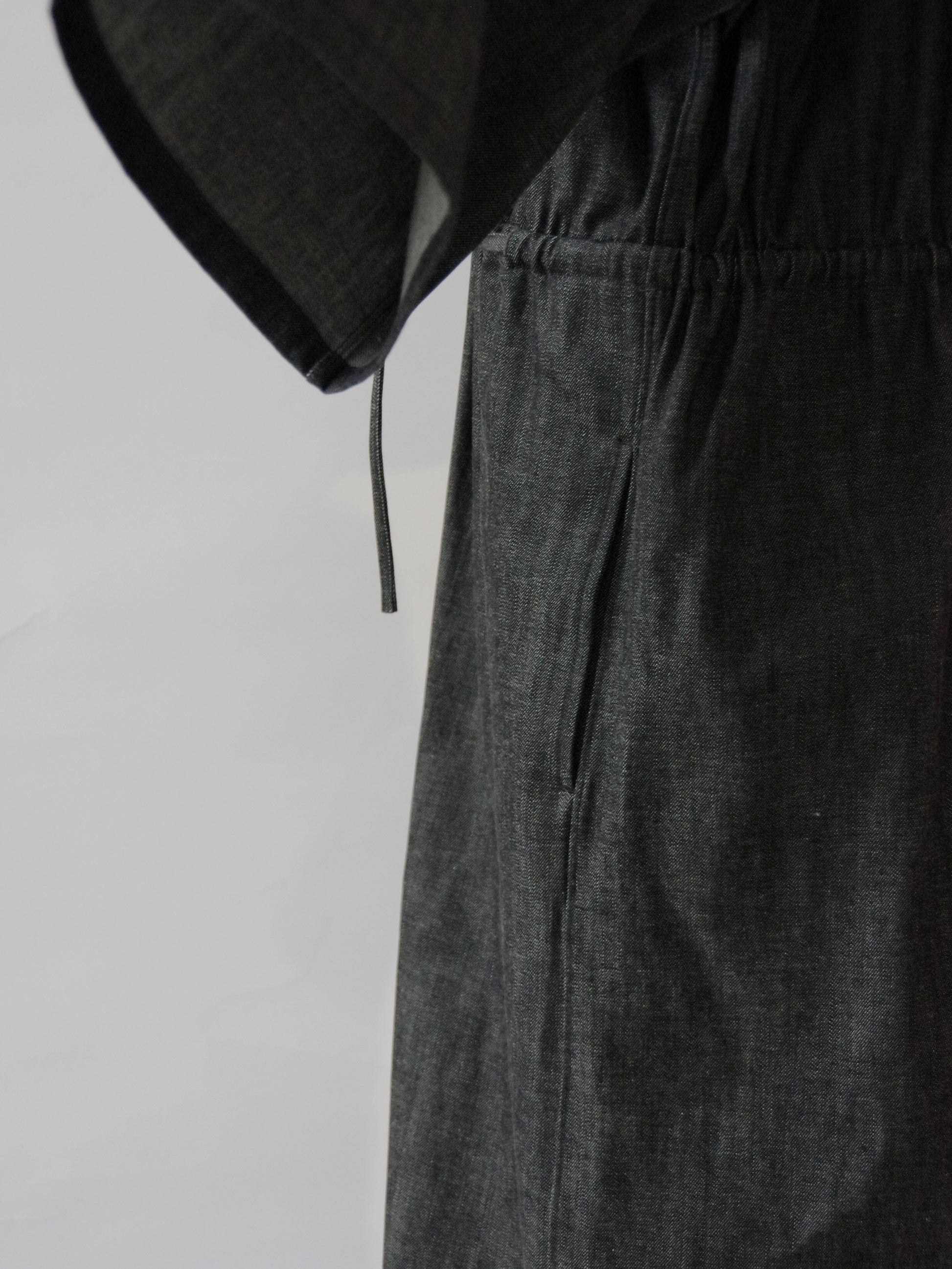 水通しをしていない薄手のデニム生地なので、着用し洗っていくことで柔らかさが出てきます。デニムは経年変化も楽しめるワンピースです。