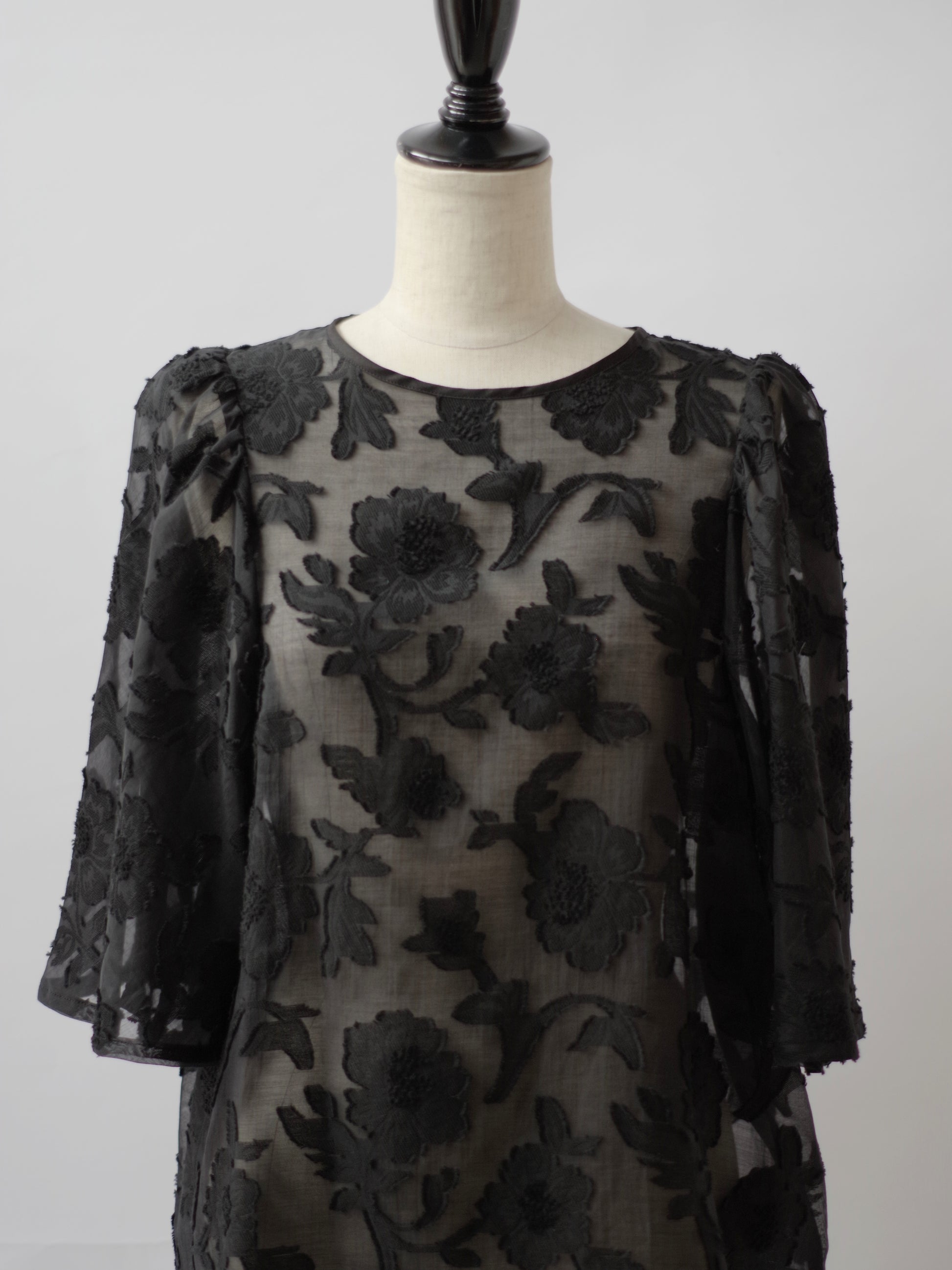 コットンナイロン素材、オーガンジーのような透け感のあるベースに同色の糸で花柄がおられており、花模様が浮かび上がっているような表情です。