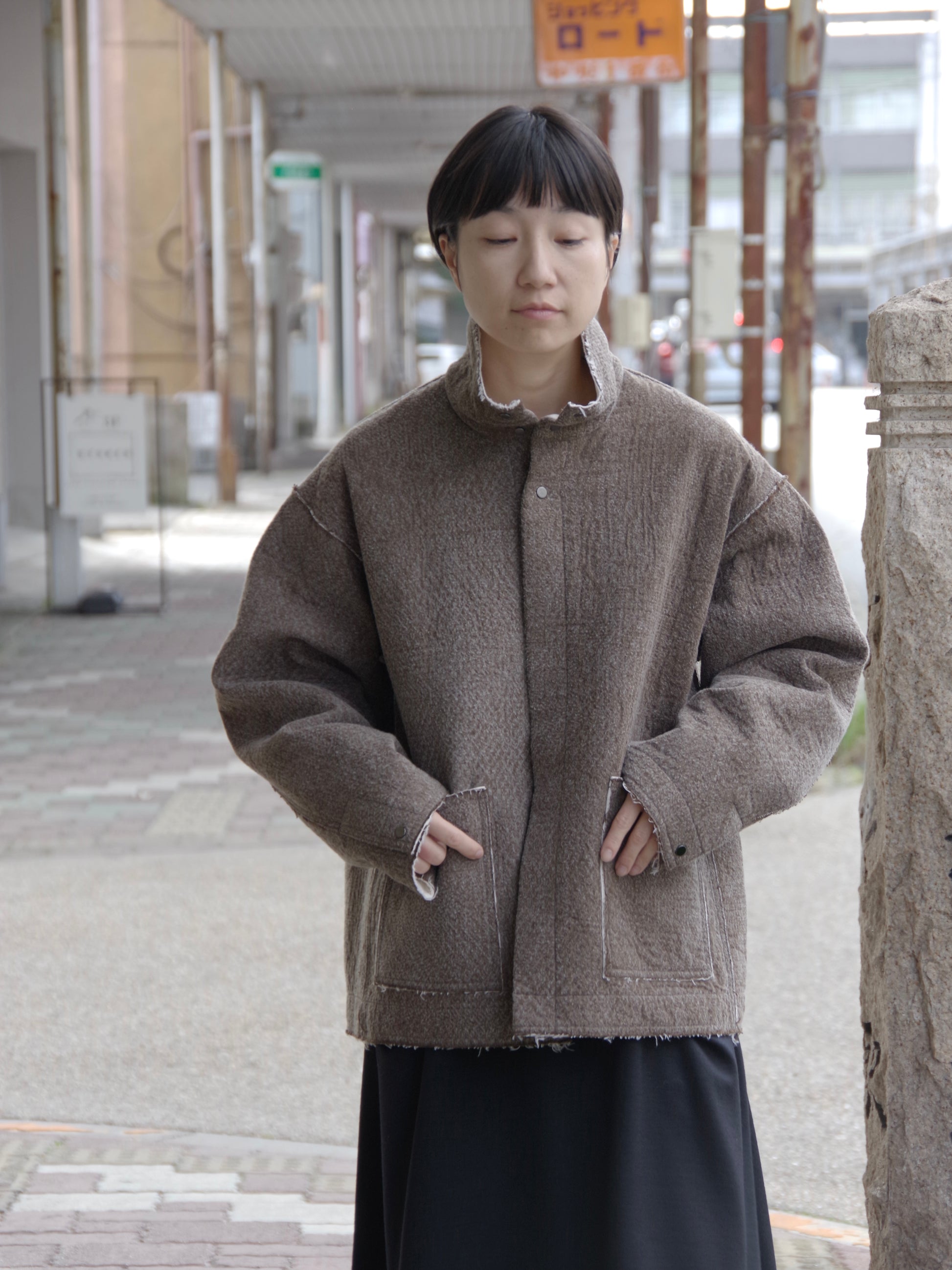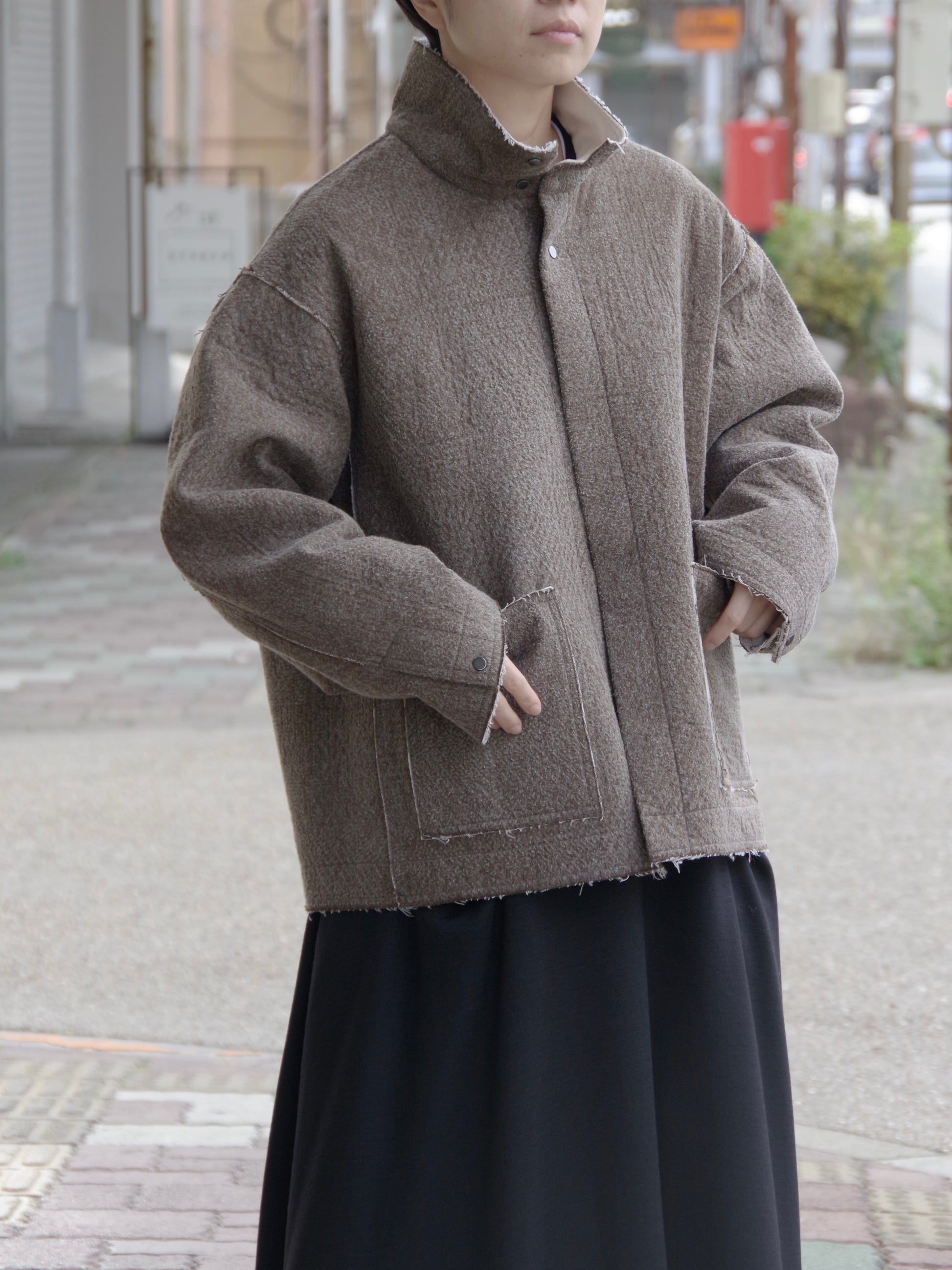 qiri冬の定番生地です。今年はスタンドカラーですこしマニッシュな印象に。