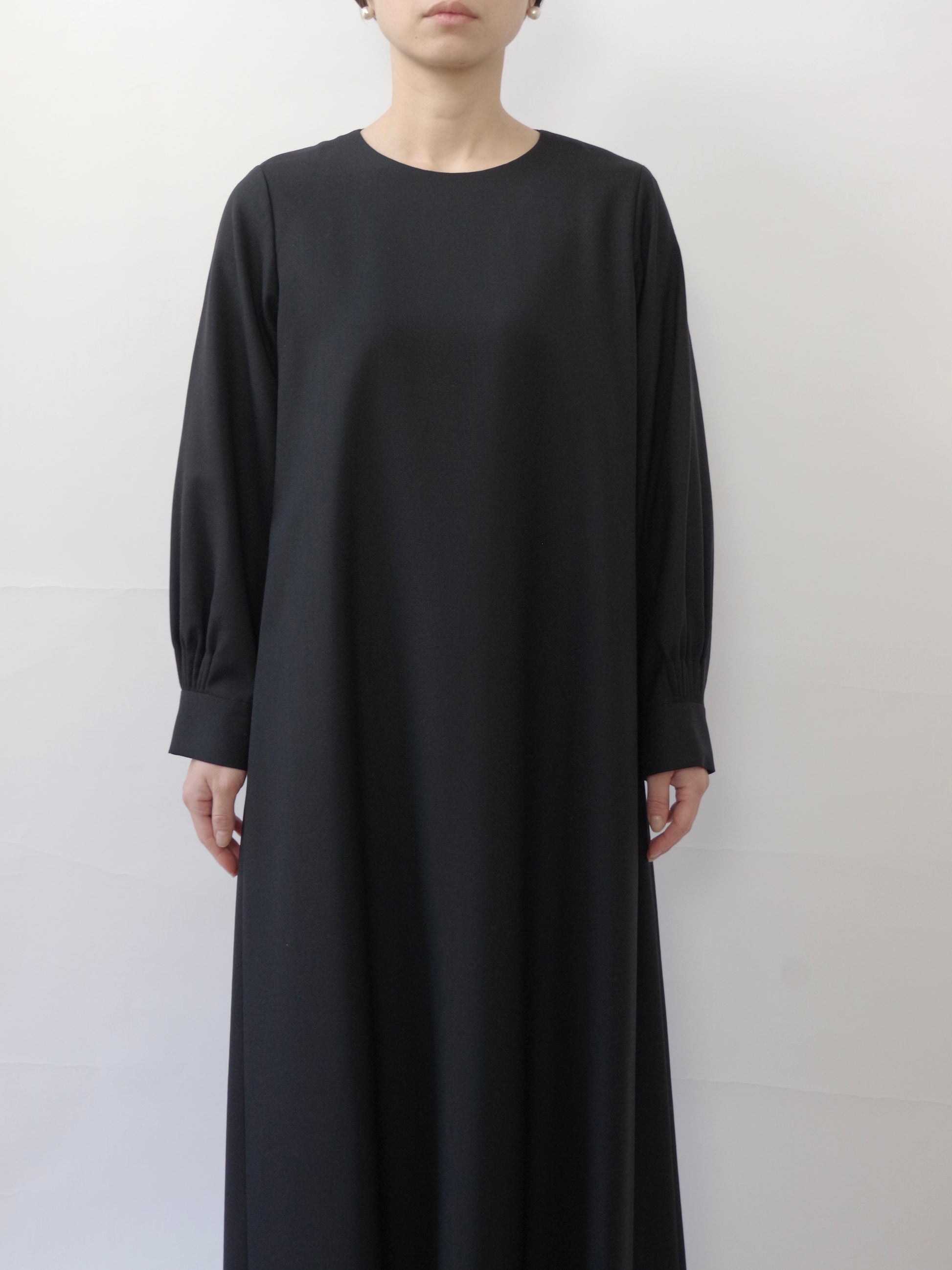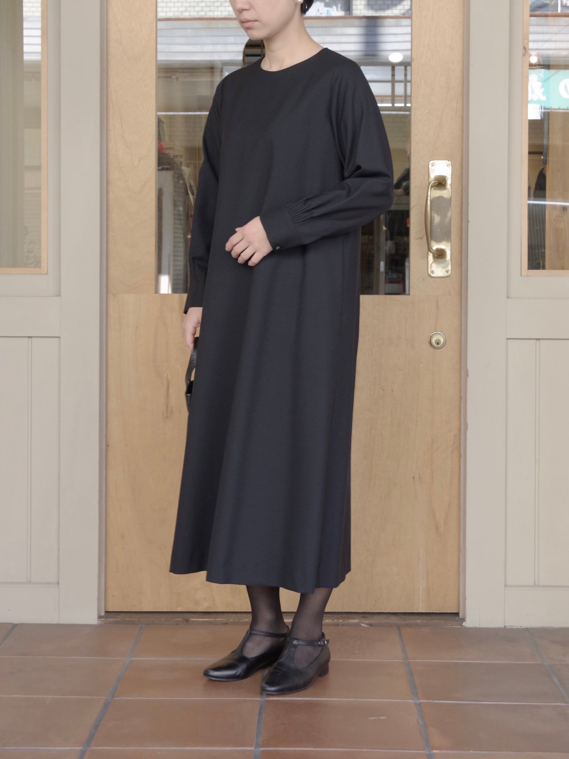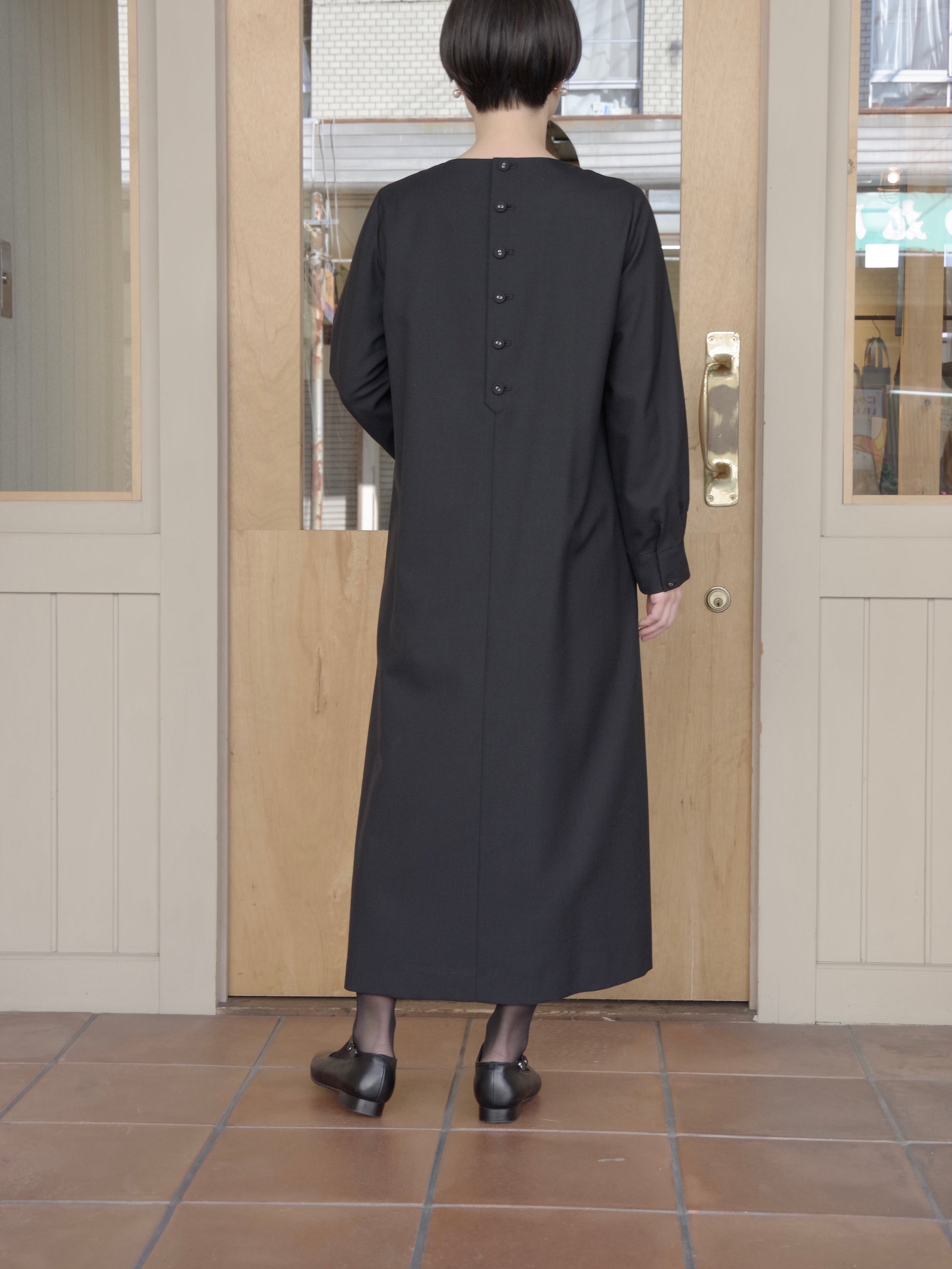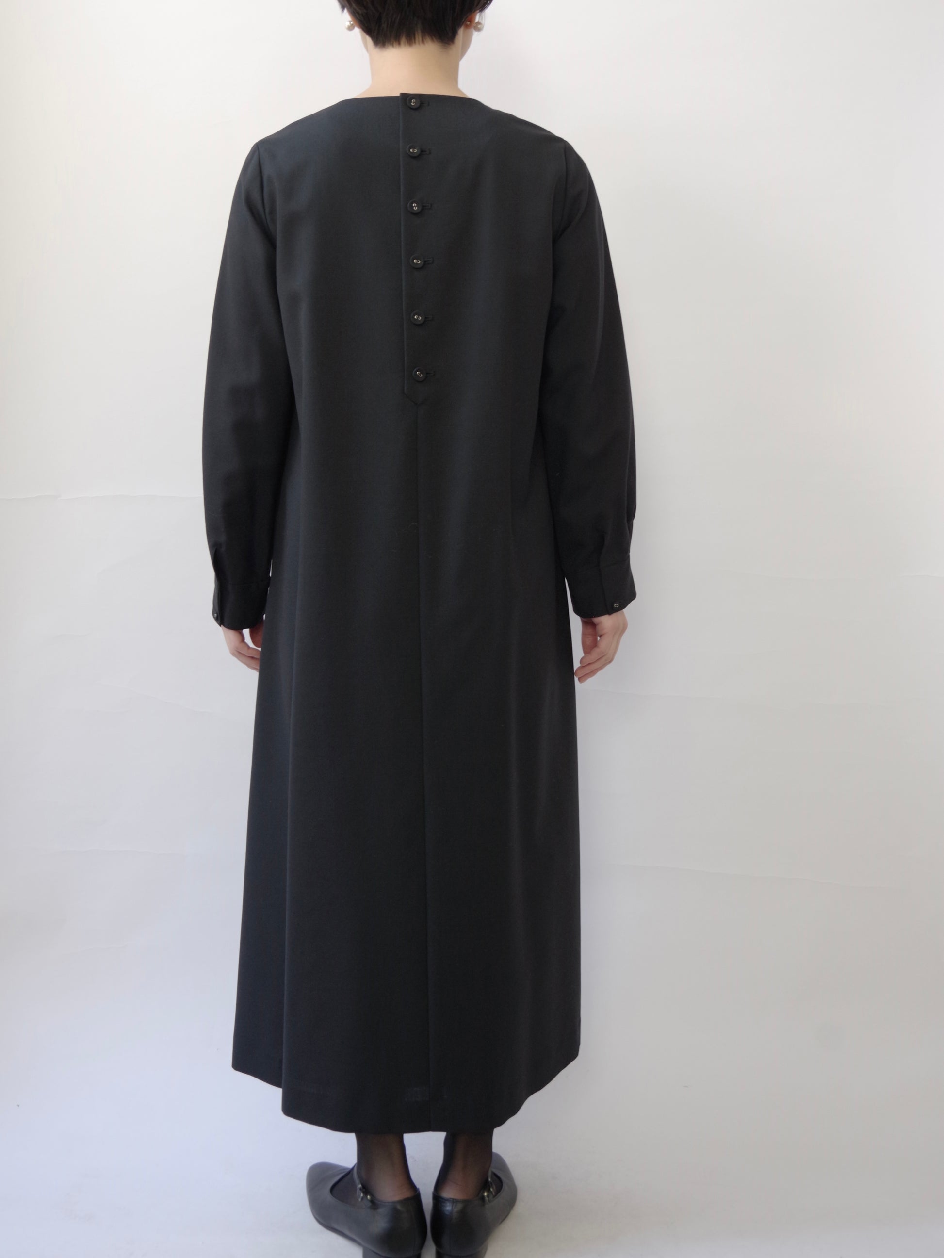 フロントデザインはシンプルですが、フラットなクルミボタンが並ぶ後ろあきデザインや、袖カフス部分のこまかなピンタックデザインなどひとつひとつのディテールにこだわったワンピースです。