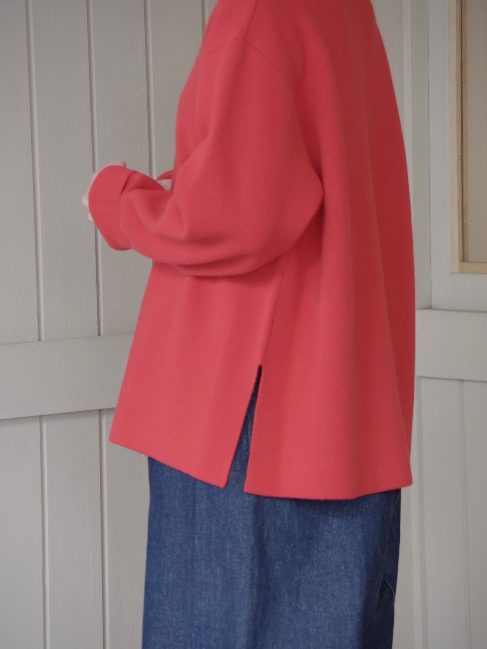 スムース編みの袖口は、くるんと折ってもいい感じにきまります。