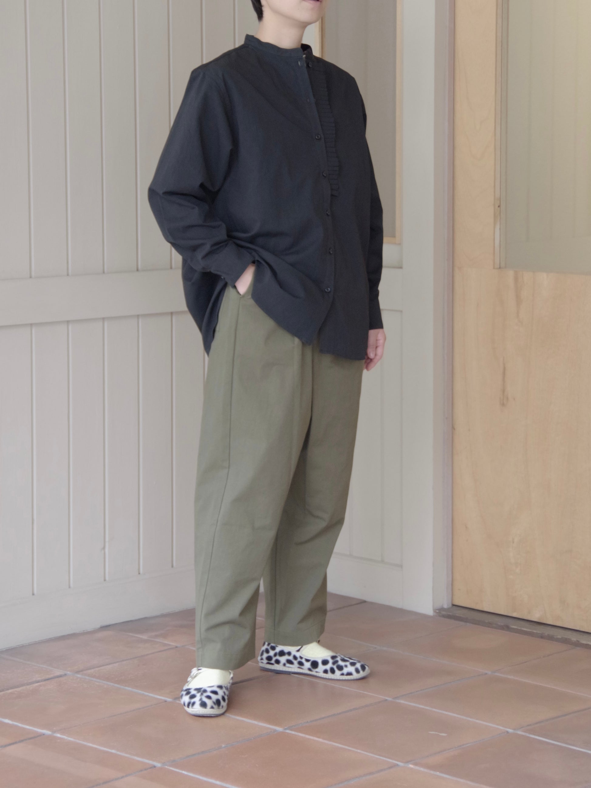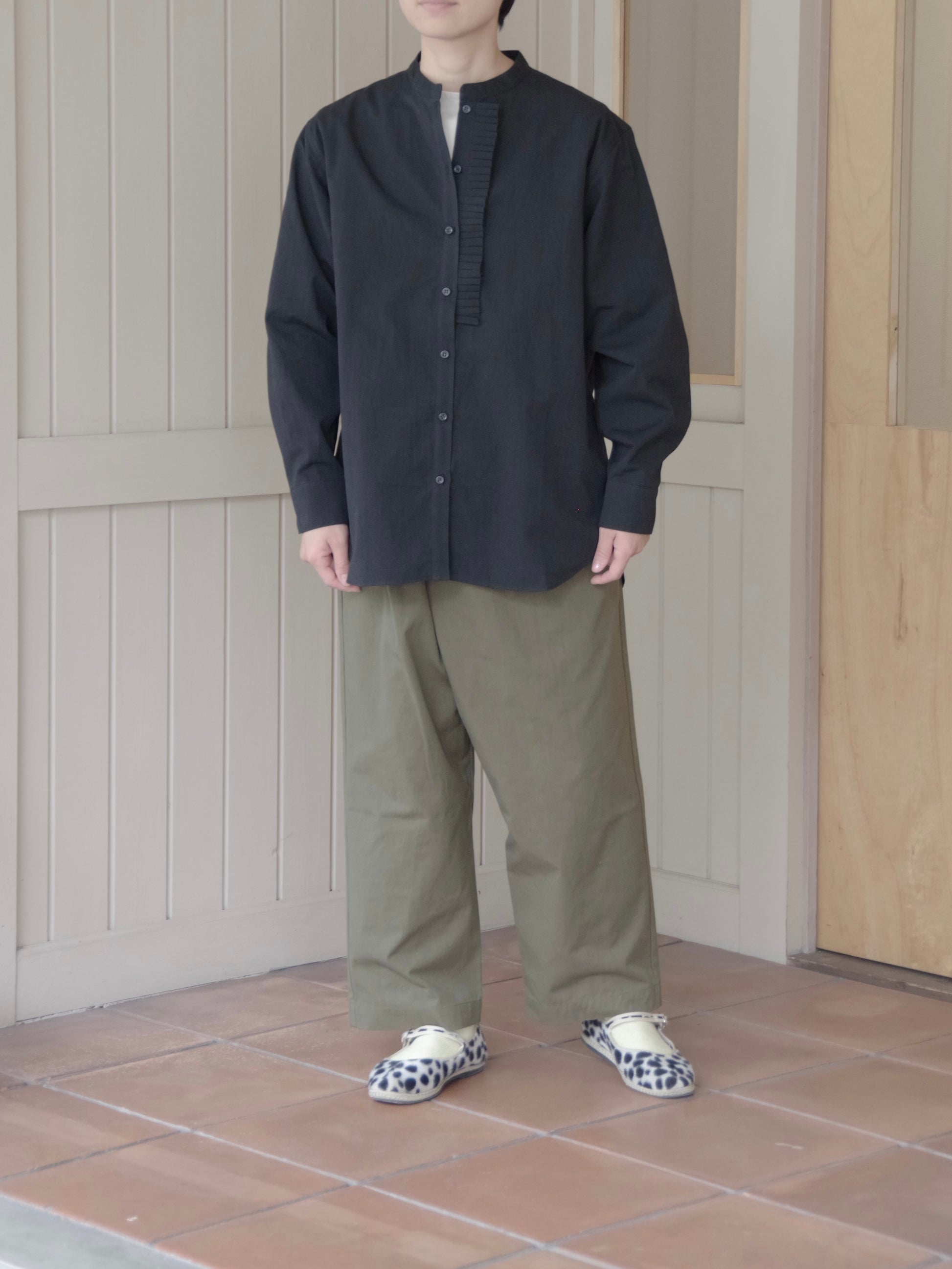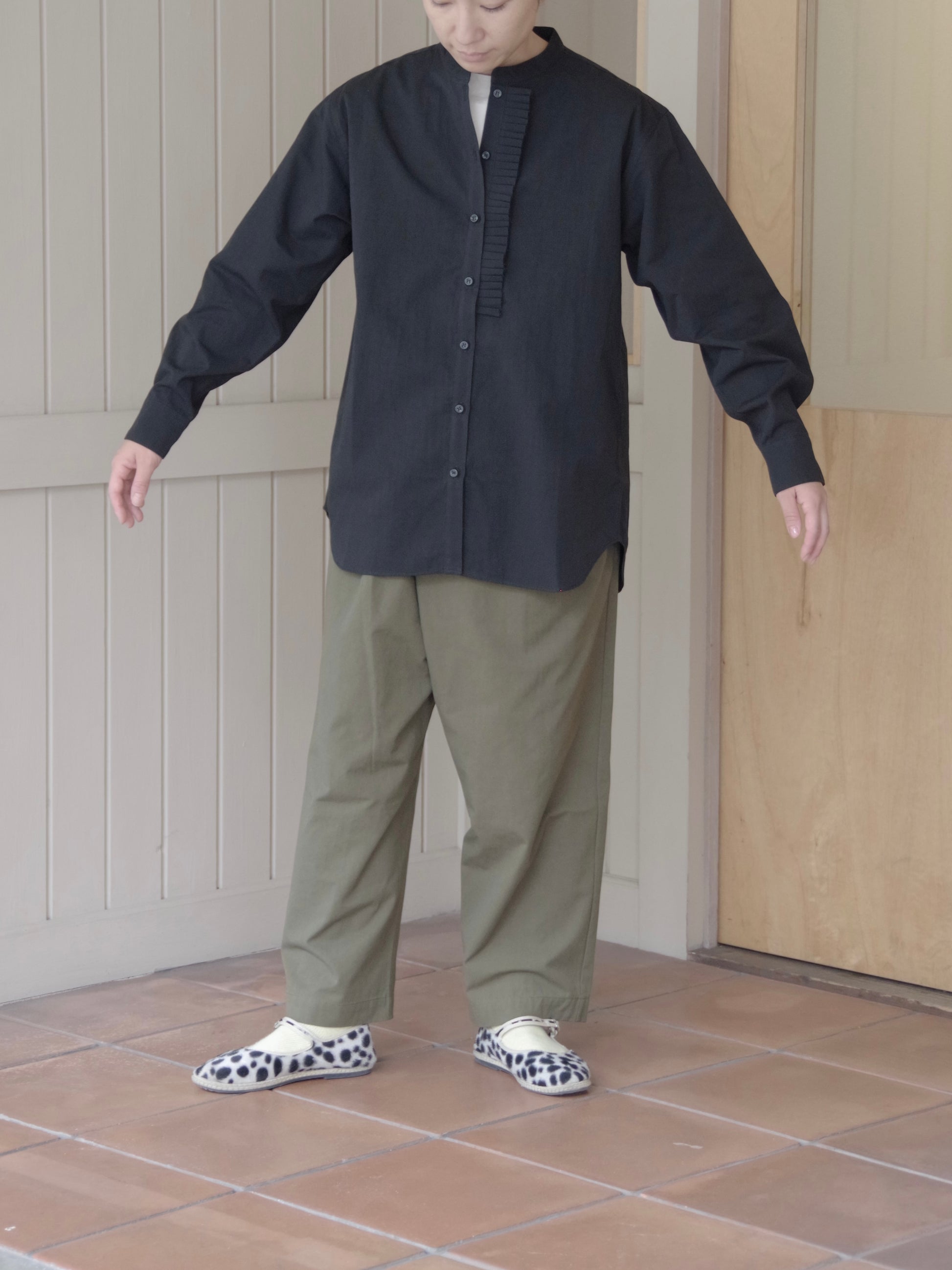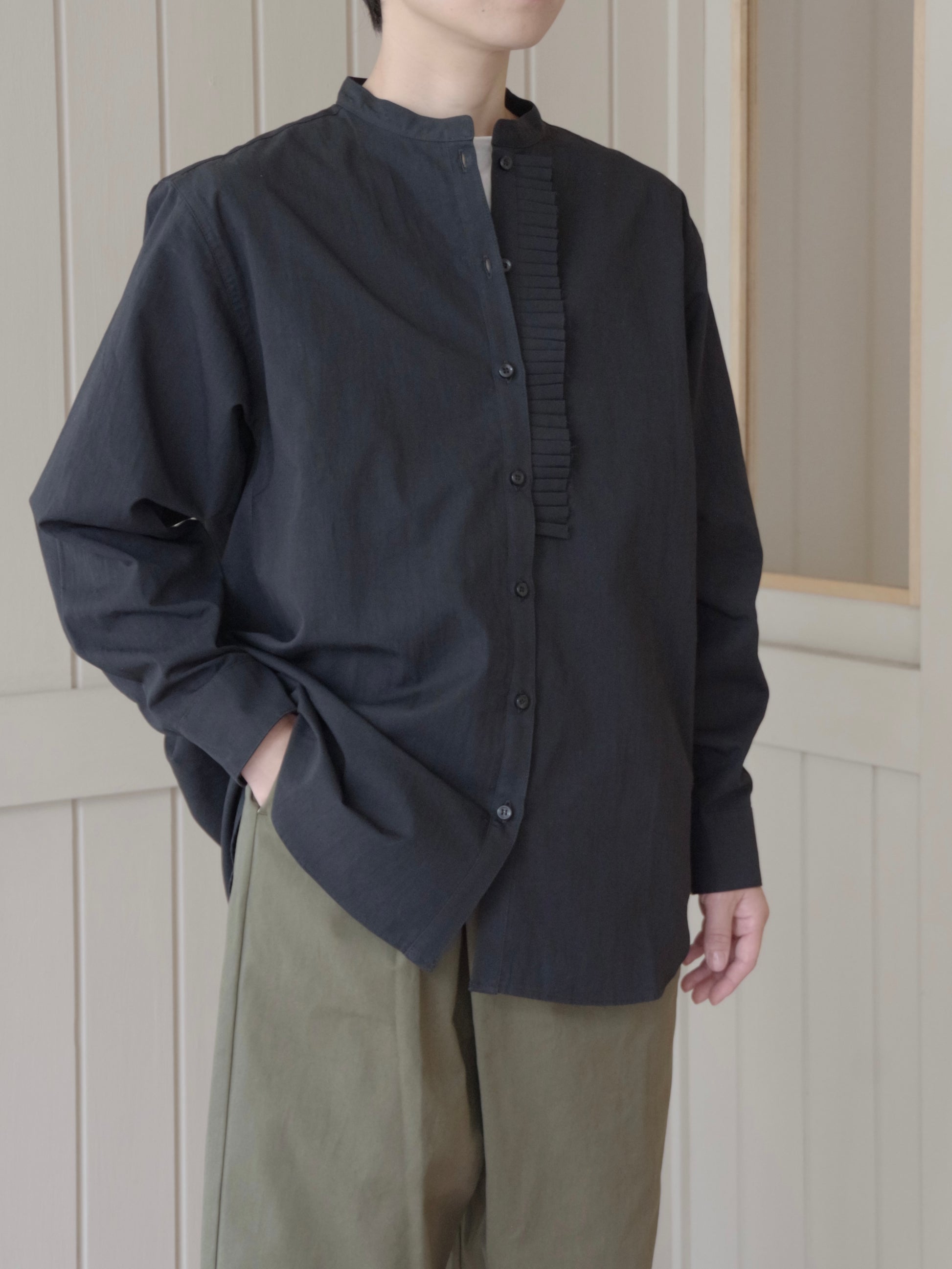 スタンダードなスタンドカラーシャツに、1ポイント胸元にピンタックを縫い付けています。ピンタックの端はカットオフになっています。