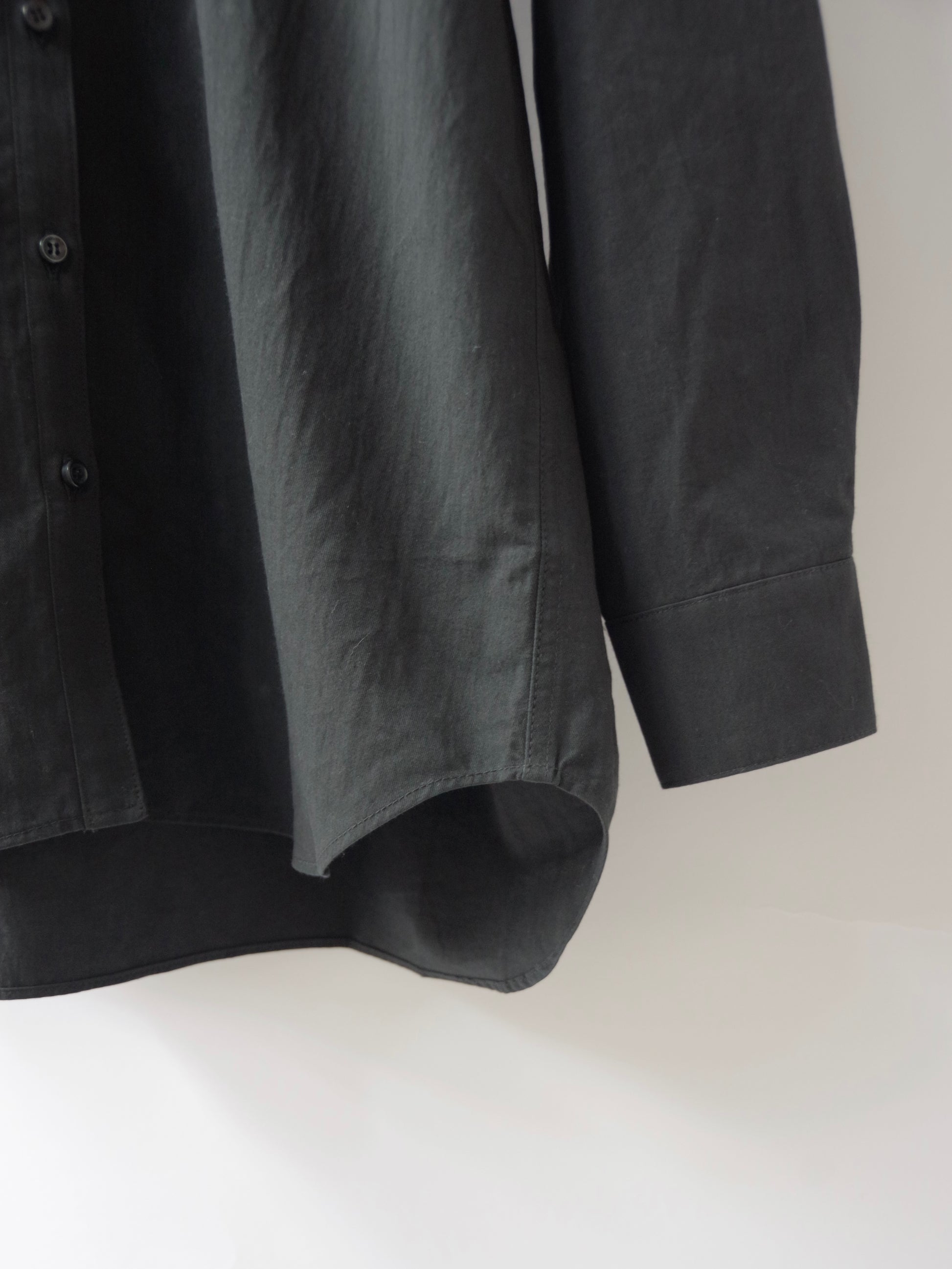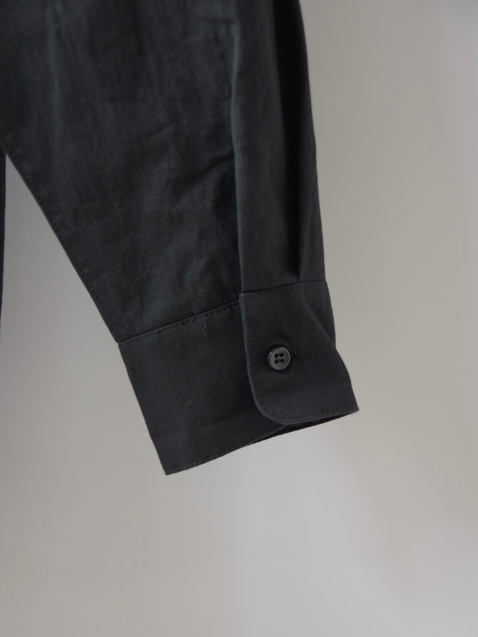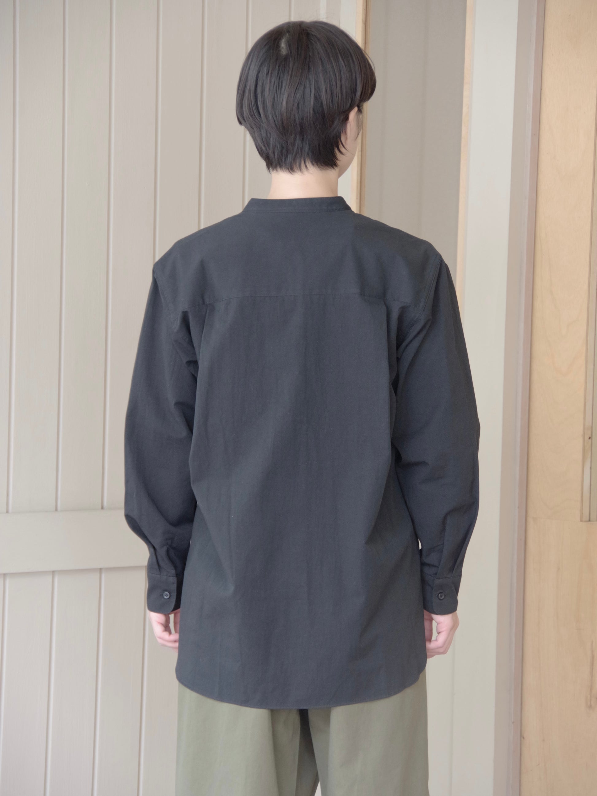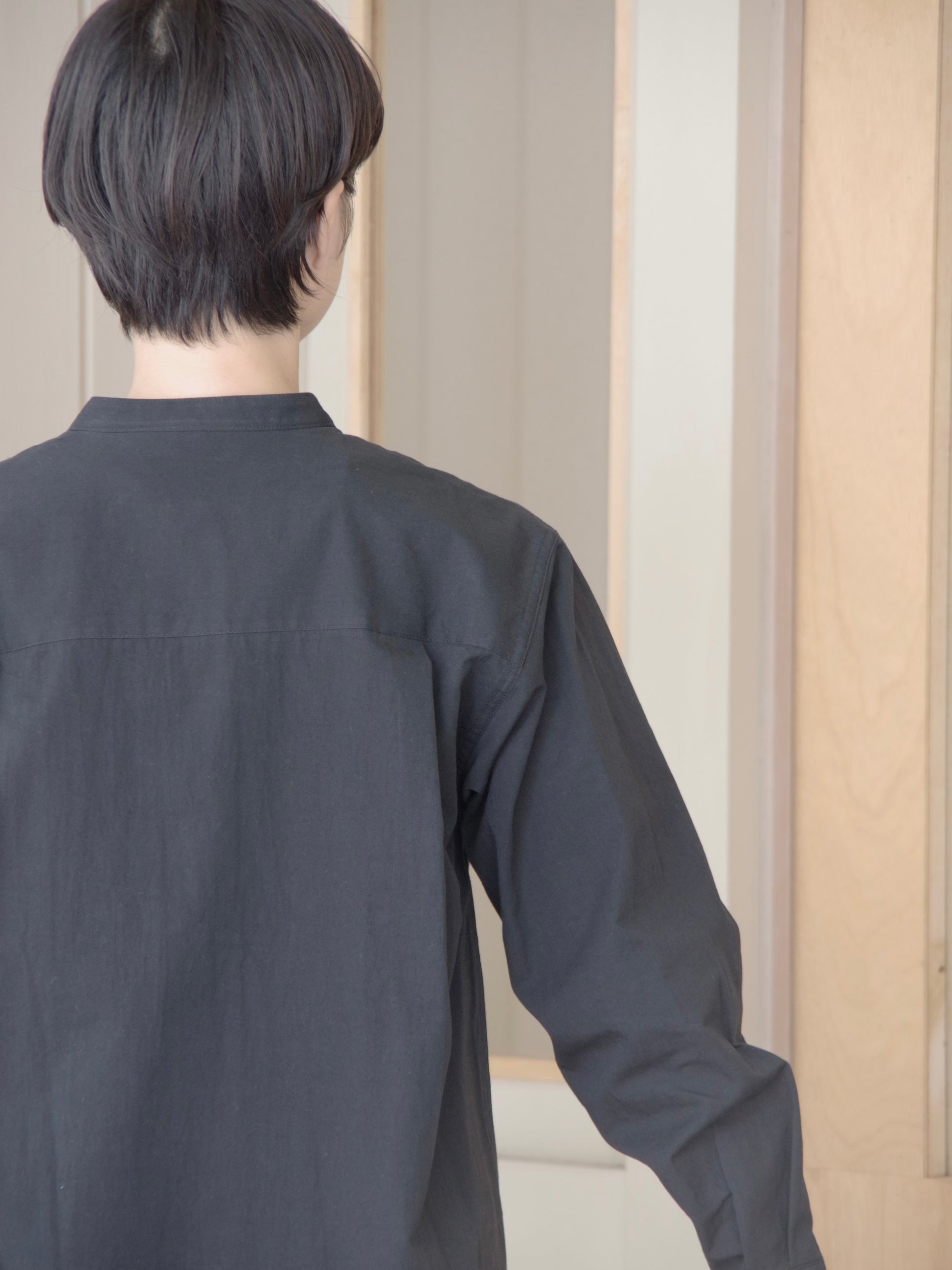 スタンダードなスタンドカラーシャツに、1ポイント胸元にピンタックを縫い付けています。ピンタックの端はカットオフになっています。