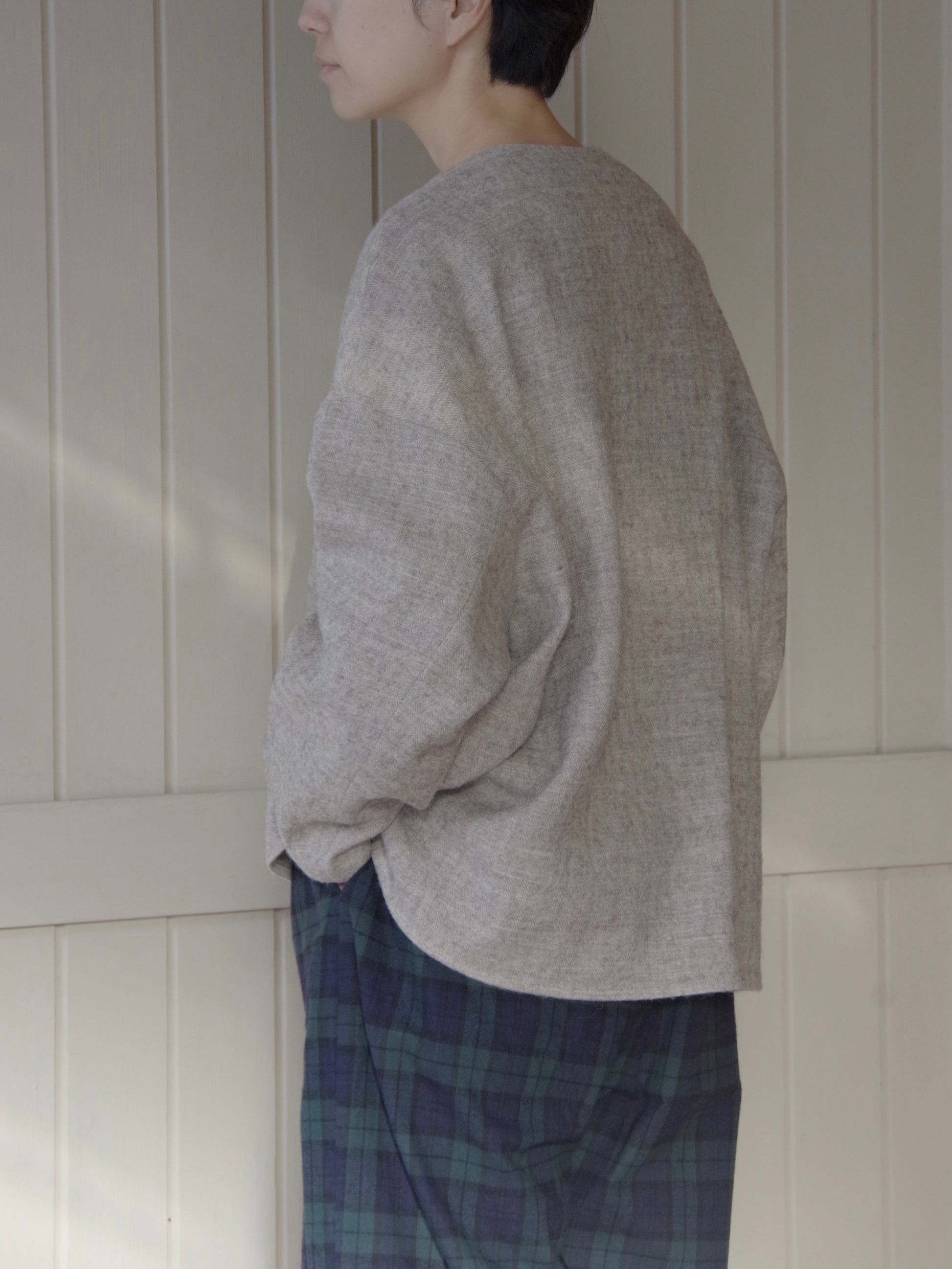 Vネックの首元なので、襟付きのシャツやタートルネックなど幅広く合わせていただけます。