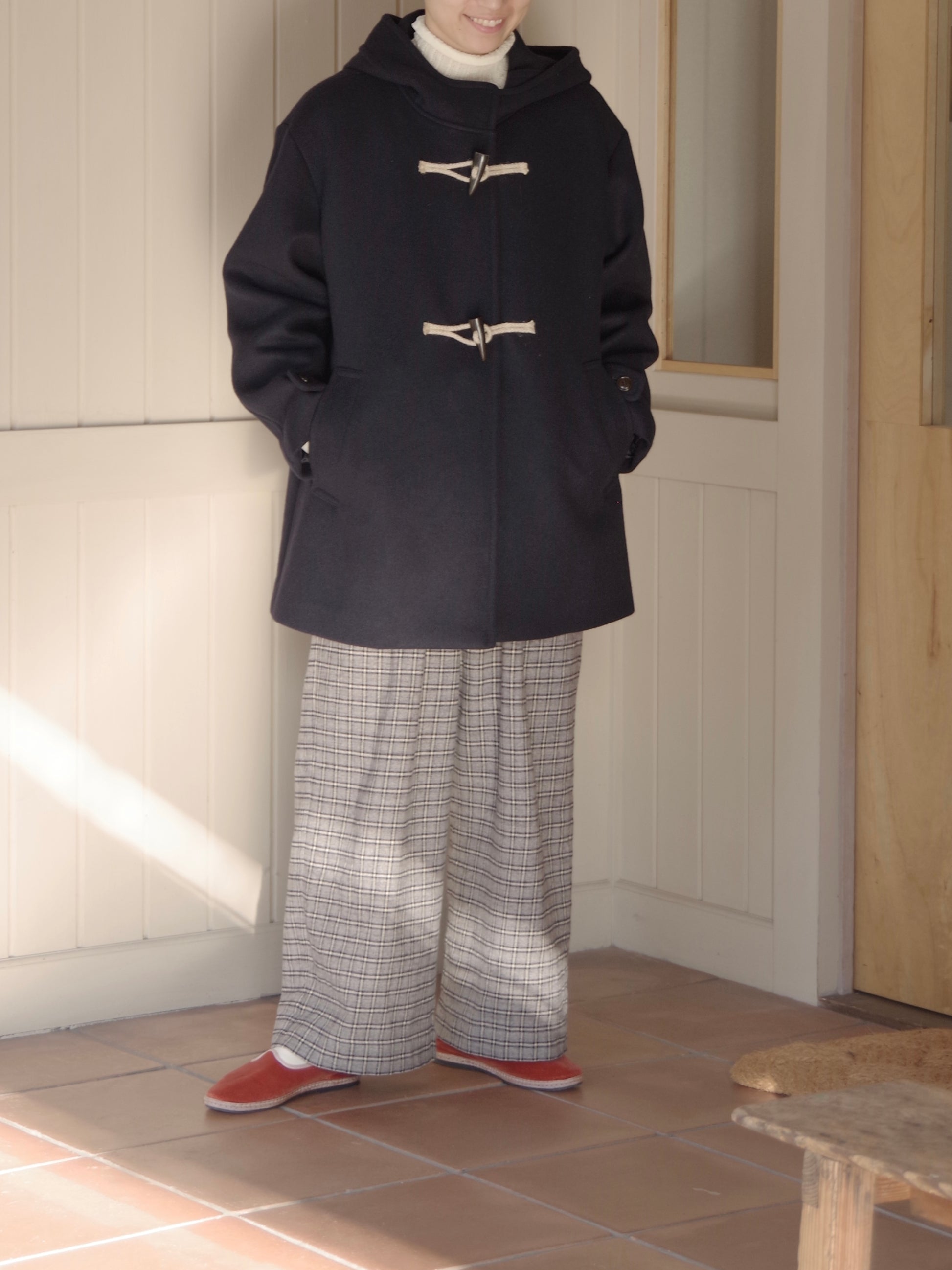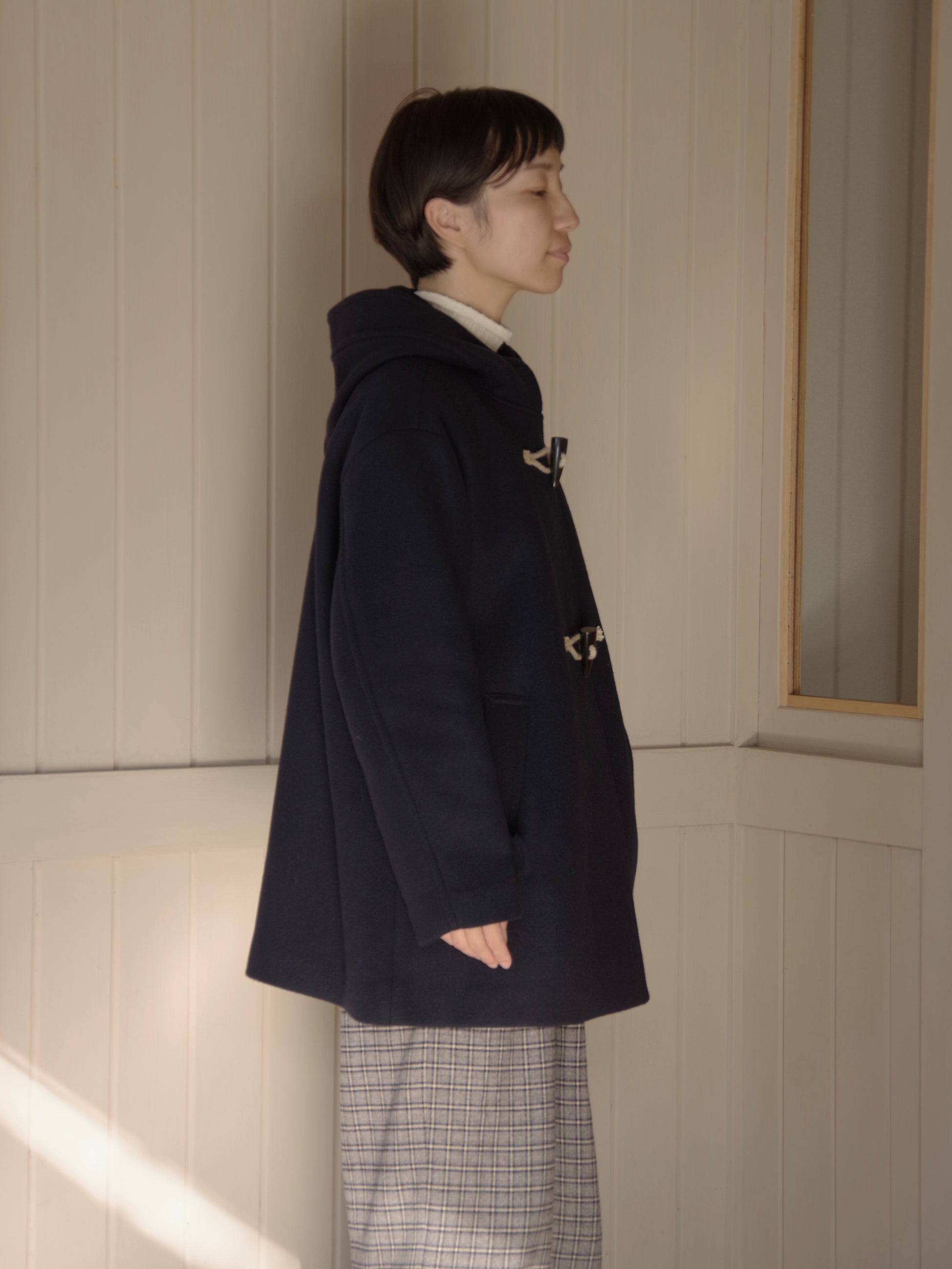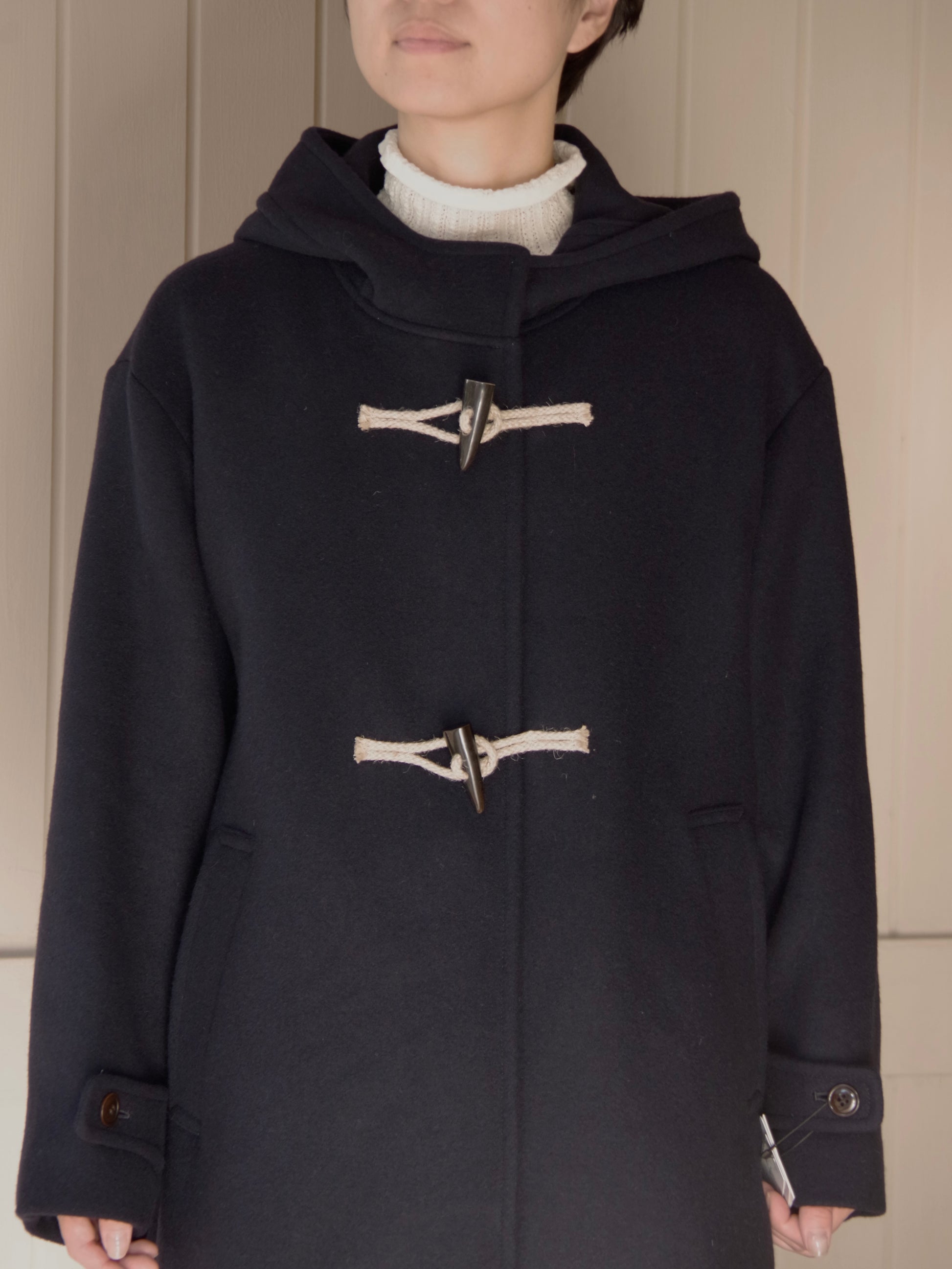 ベーシックな形ですが、わずかに裾に広がるAラインシルエットや、2つのトグルボタンのバランス、ミドル丈など着やすくあたたかく着れてバランスの良いデザインが素敵なコートです。